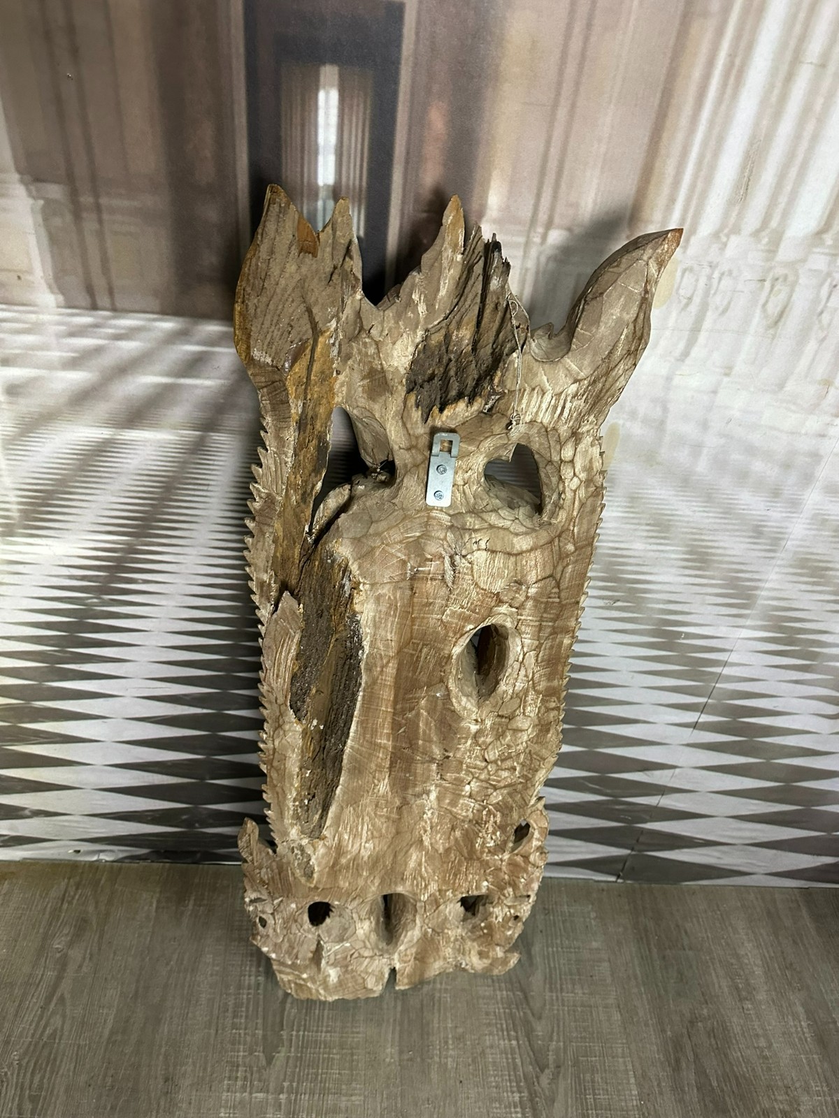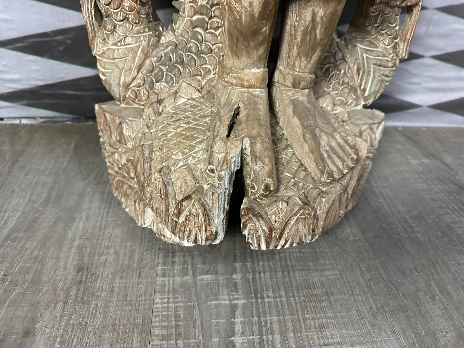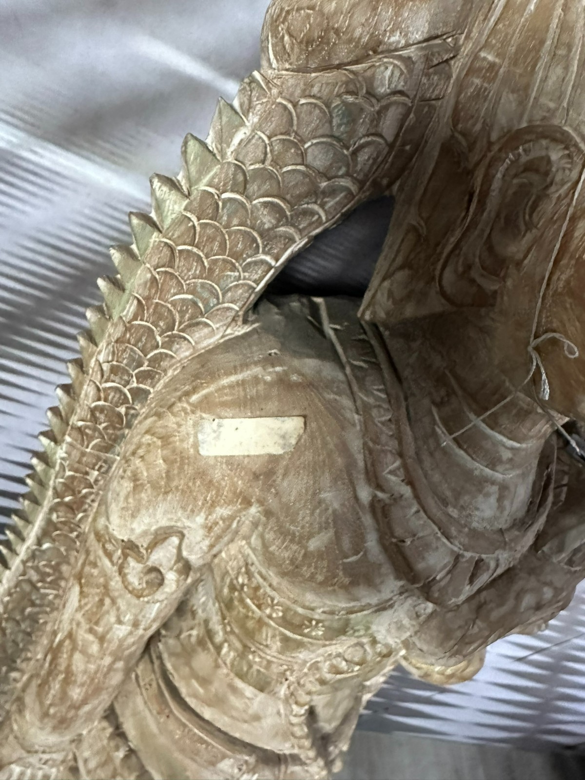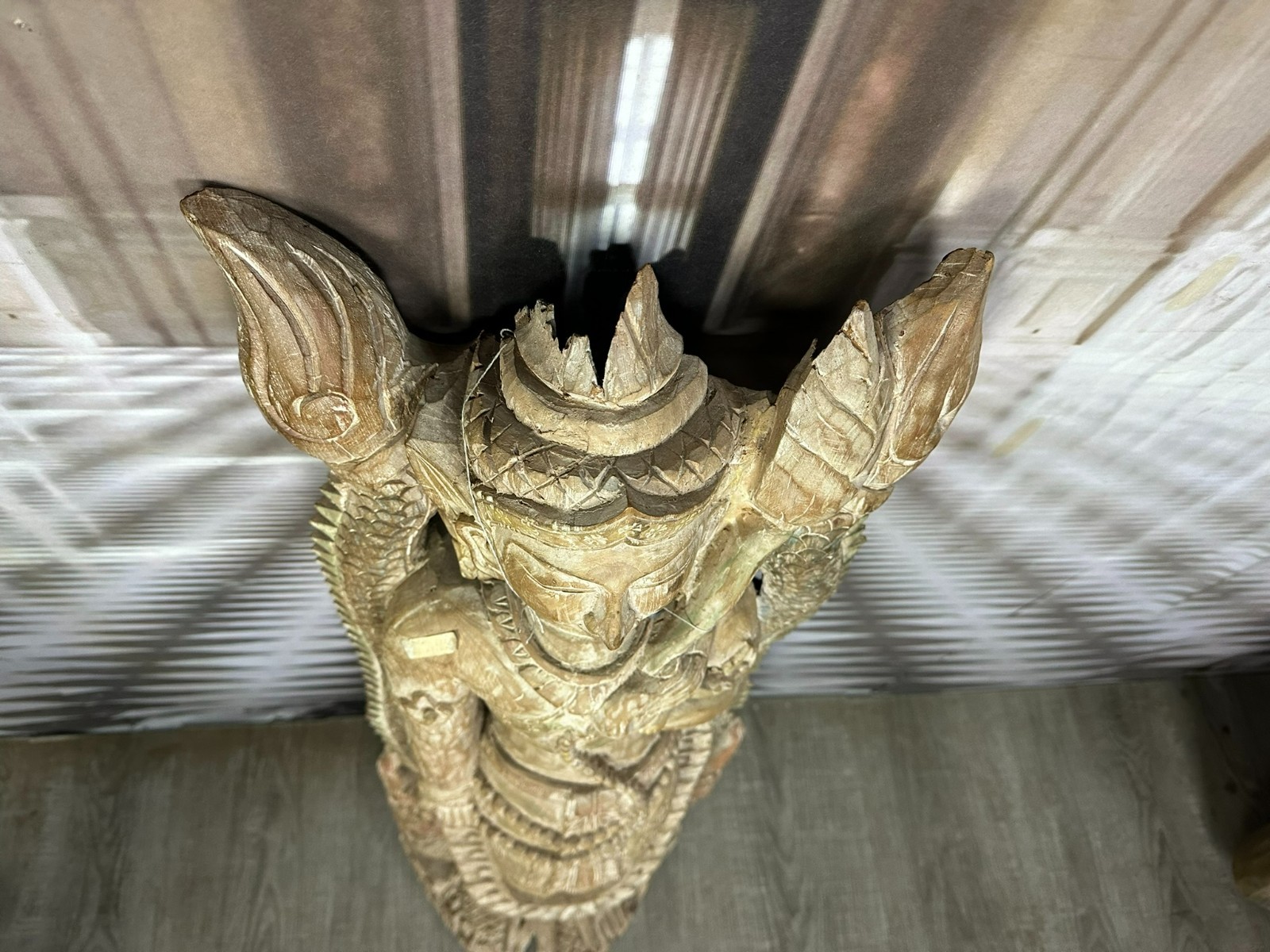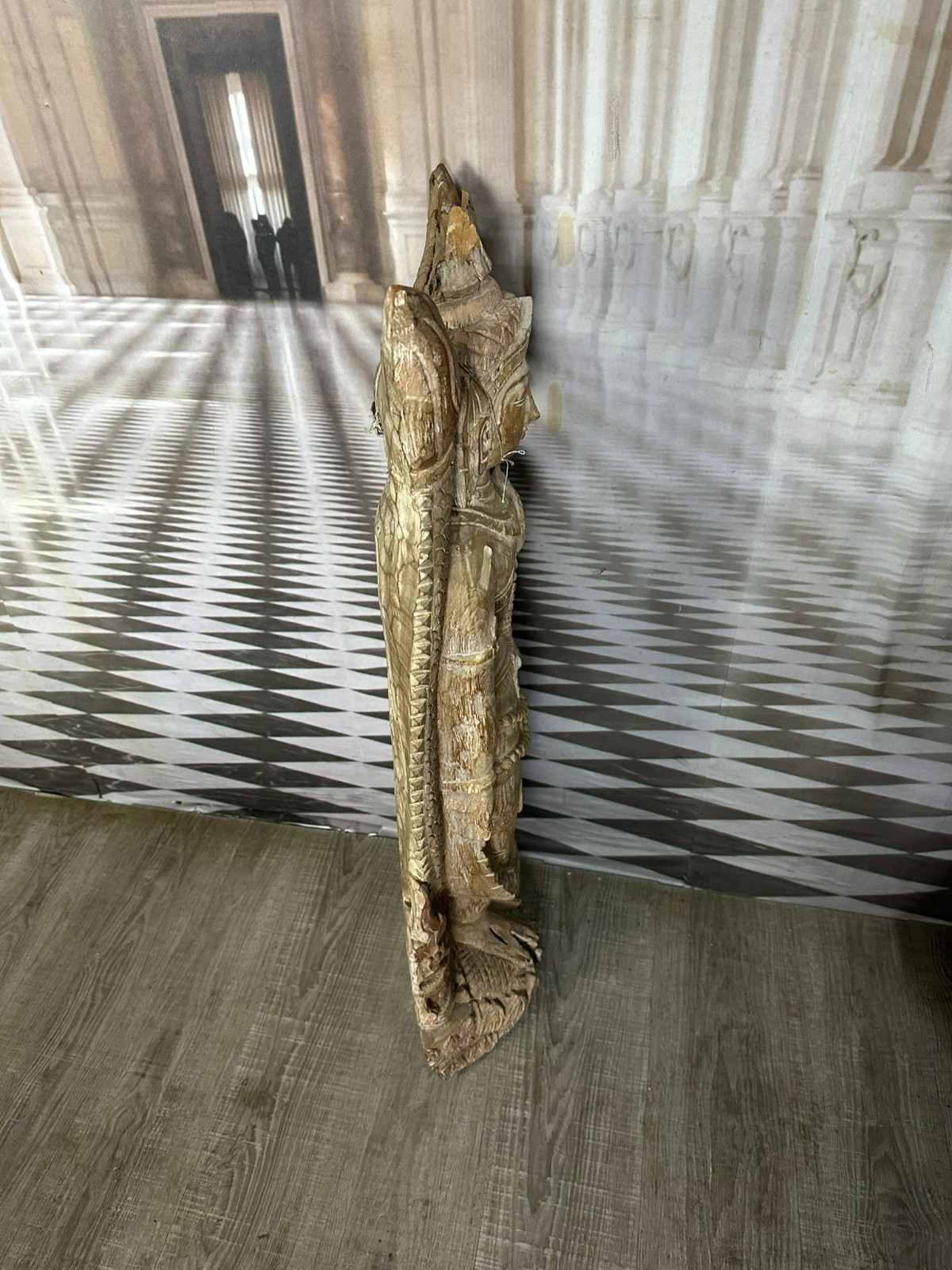 Alte Südostasiatische Heiligenfigur aus massivem Holz, komplett handgeschnitzt. Aus einem Baumstamm gearbeitet, sehr schwer. An der Oberfläche Dehnungsrisse und kleinere unvollständigkeiten. Abmessungen BTH 37/15/103cm.