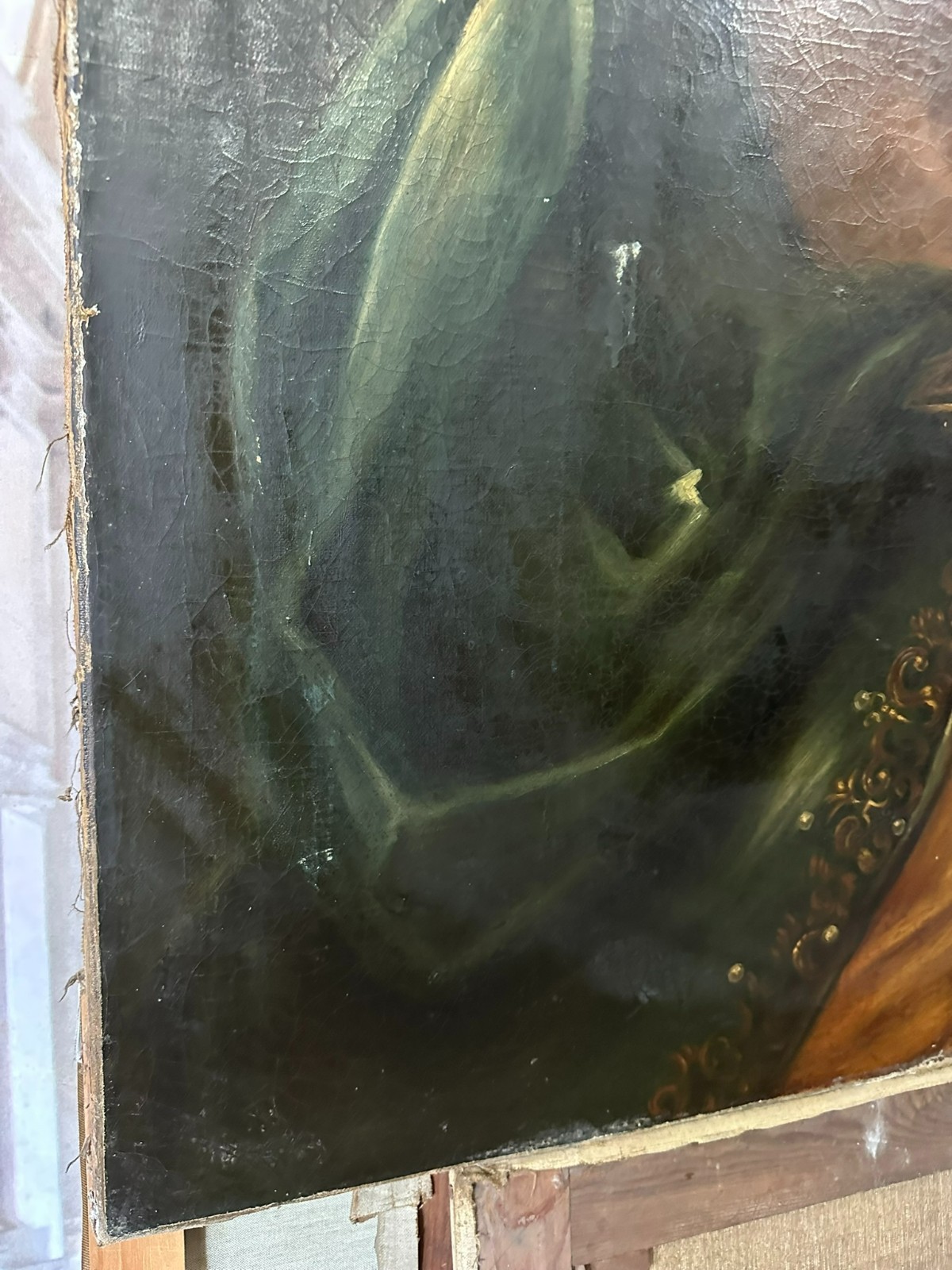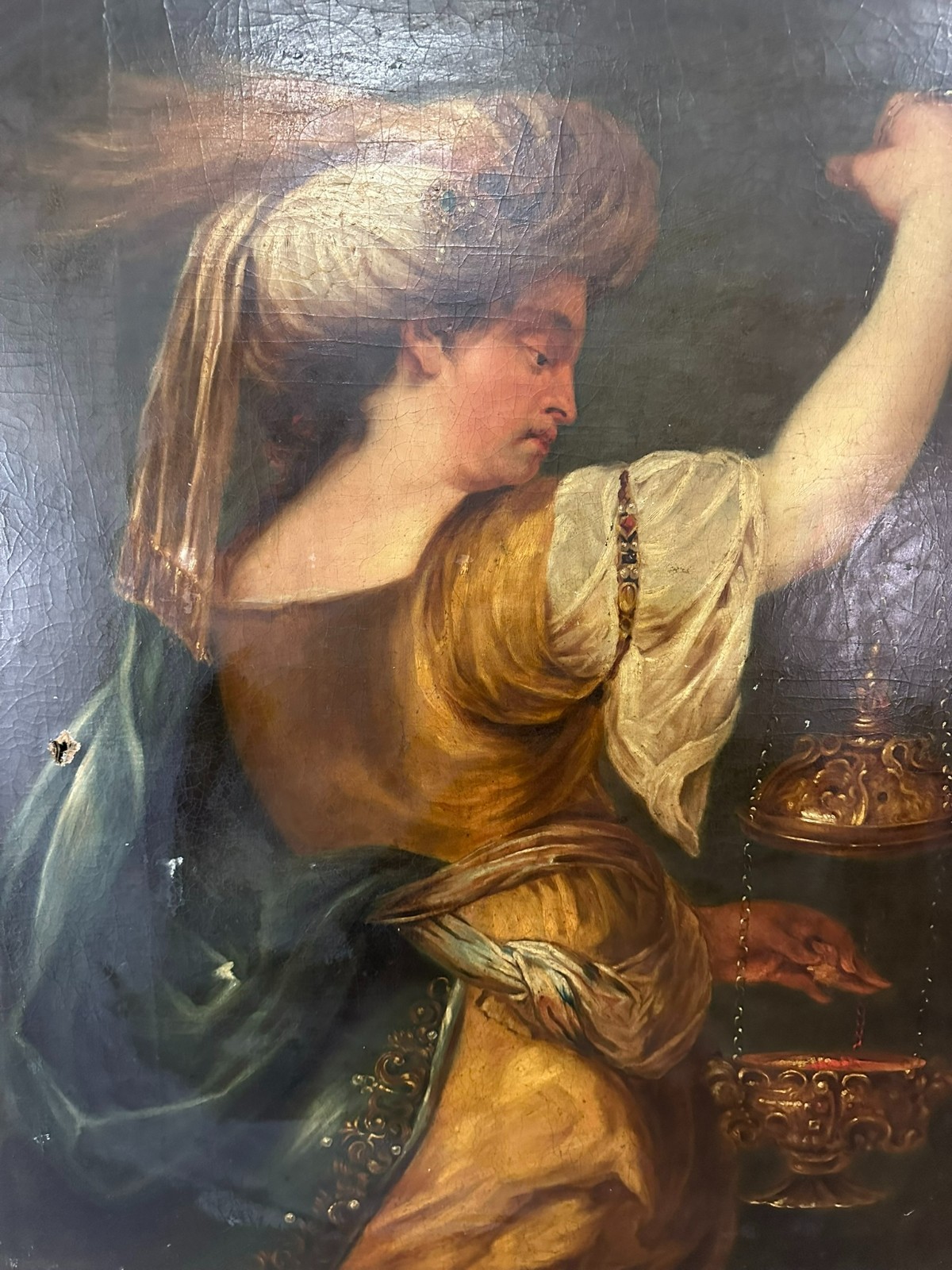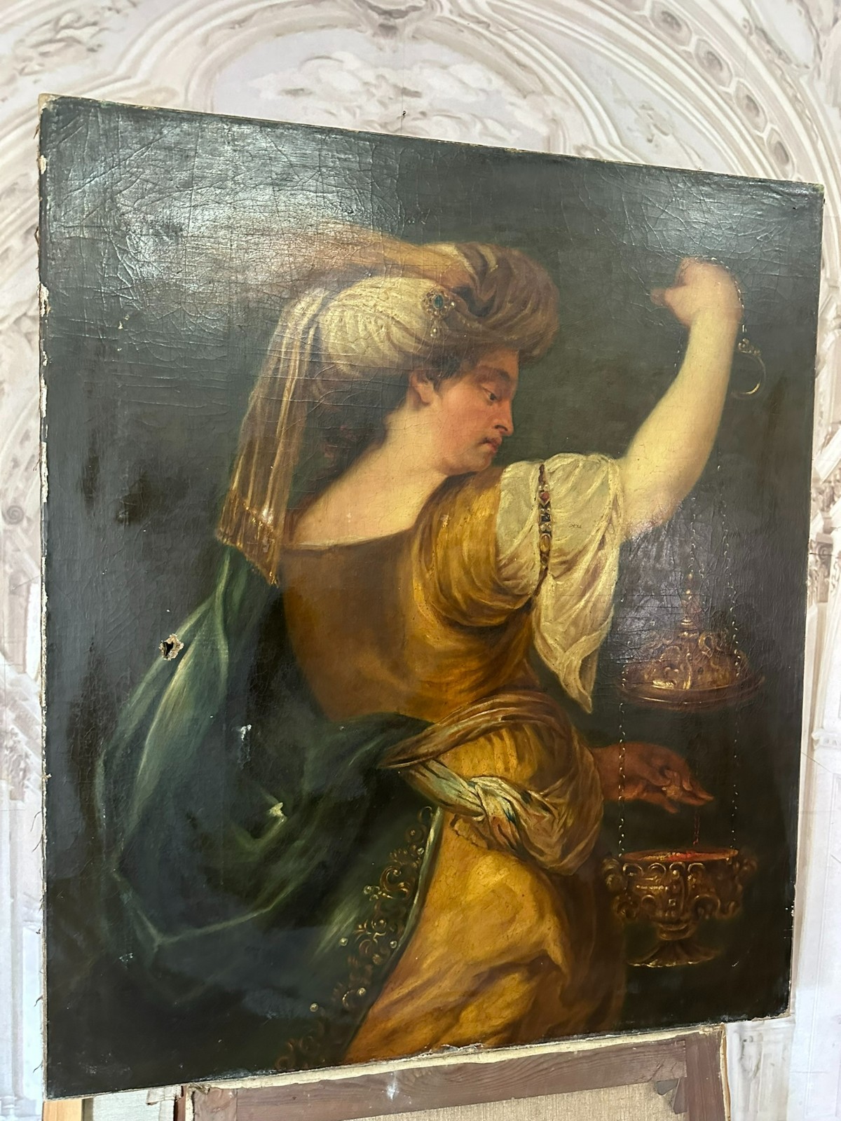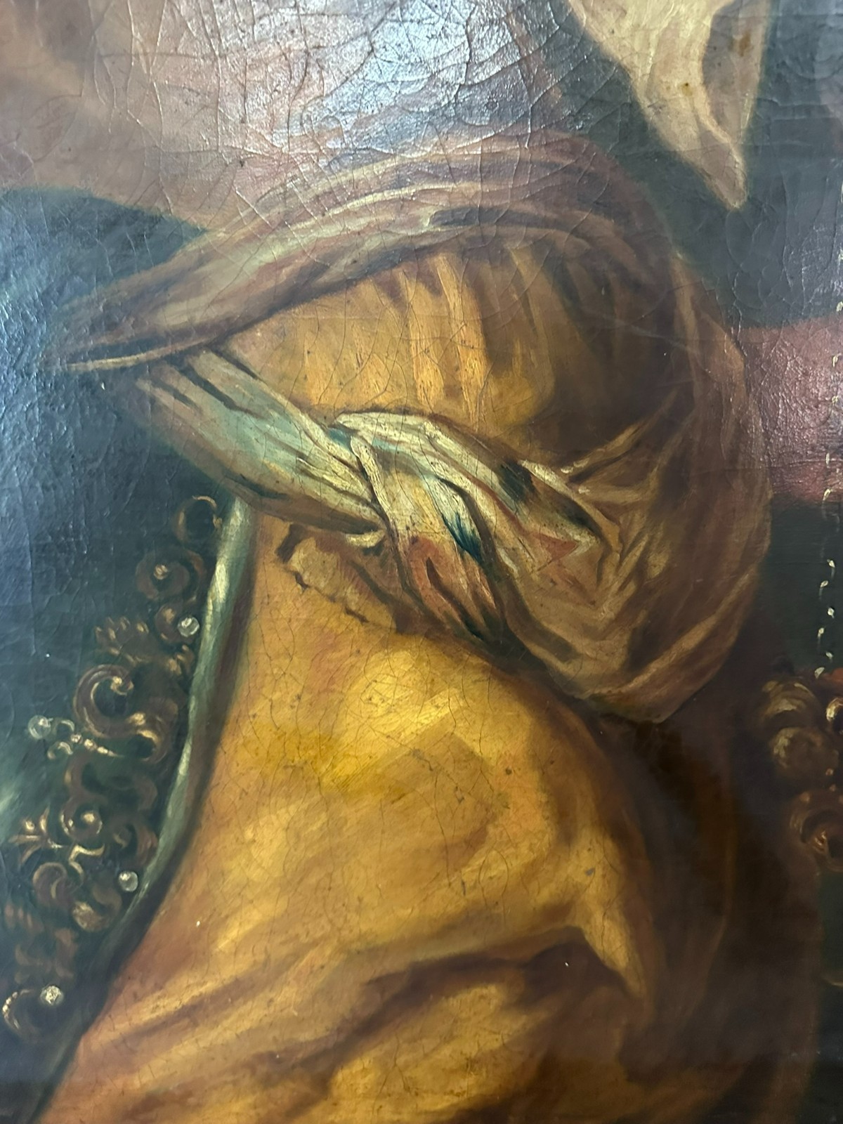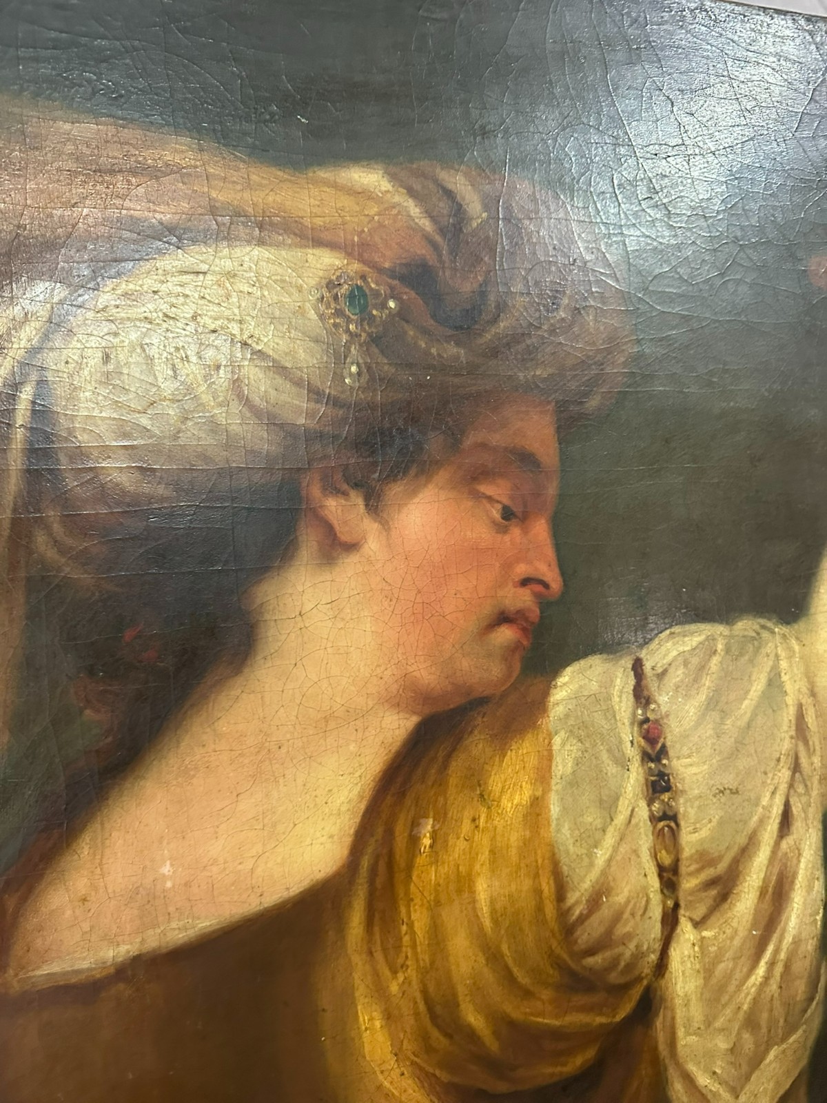 Sehr großes Ölgemälde auf Leinwand, Kopie nach dem Original von Johan BOECKHORST, wohl um 1900 angefertigt. An der gesamten Oberfläche Craquelle, Farbabrieb und Farbabplatzer. Seitlich links Leinwandschaden. Der Firnis ist insgesamt vergilbt und fleckig. Das Gemälde hat wohl auch diverse Übermalungen. Abmessungen 107x127cm.