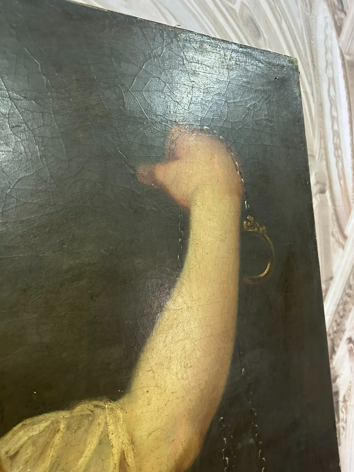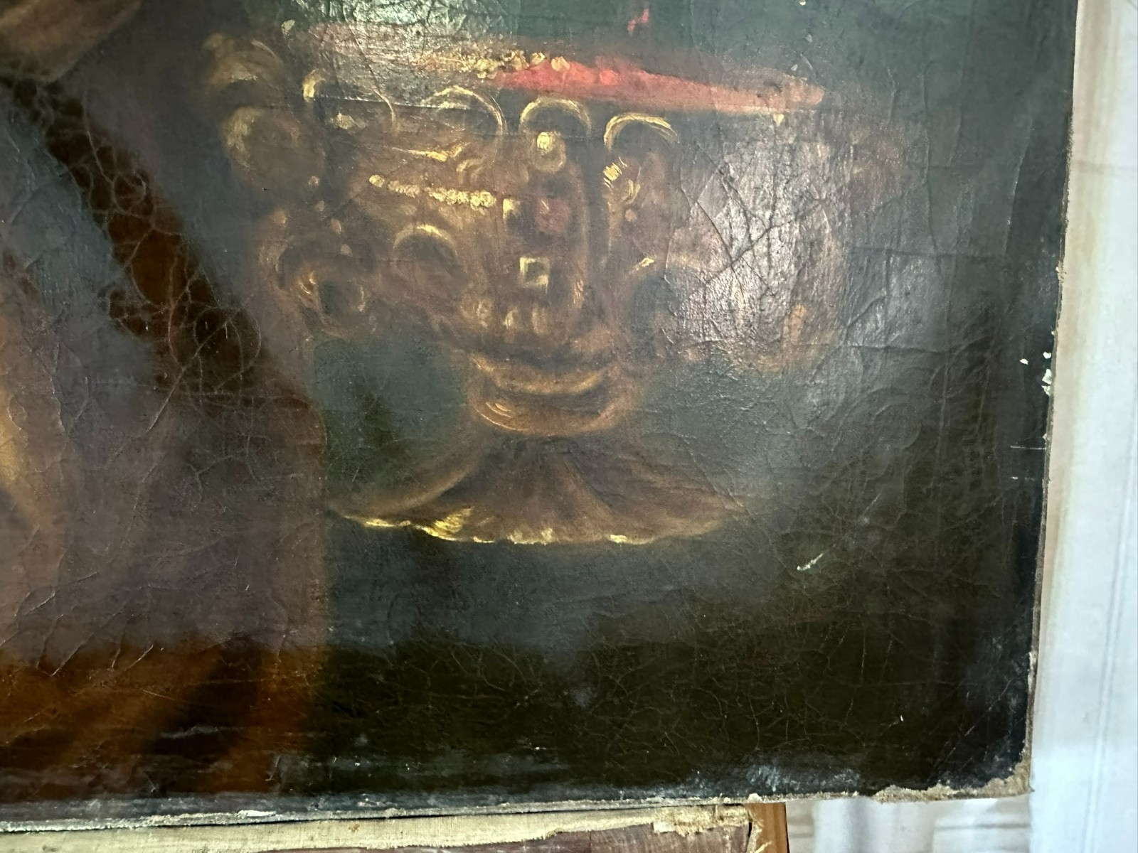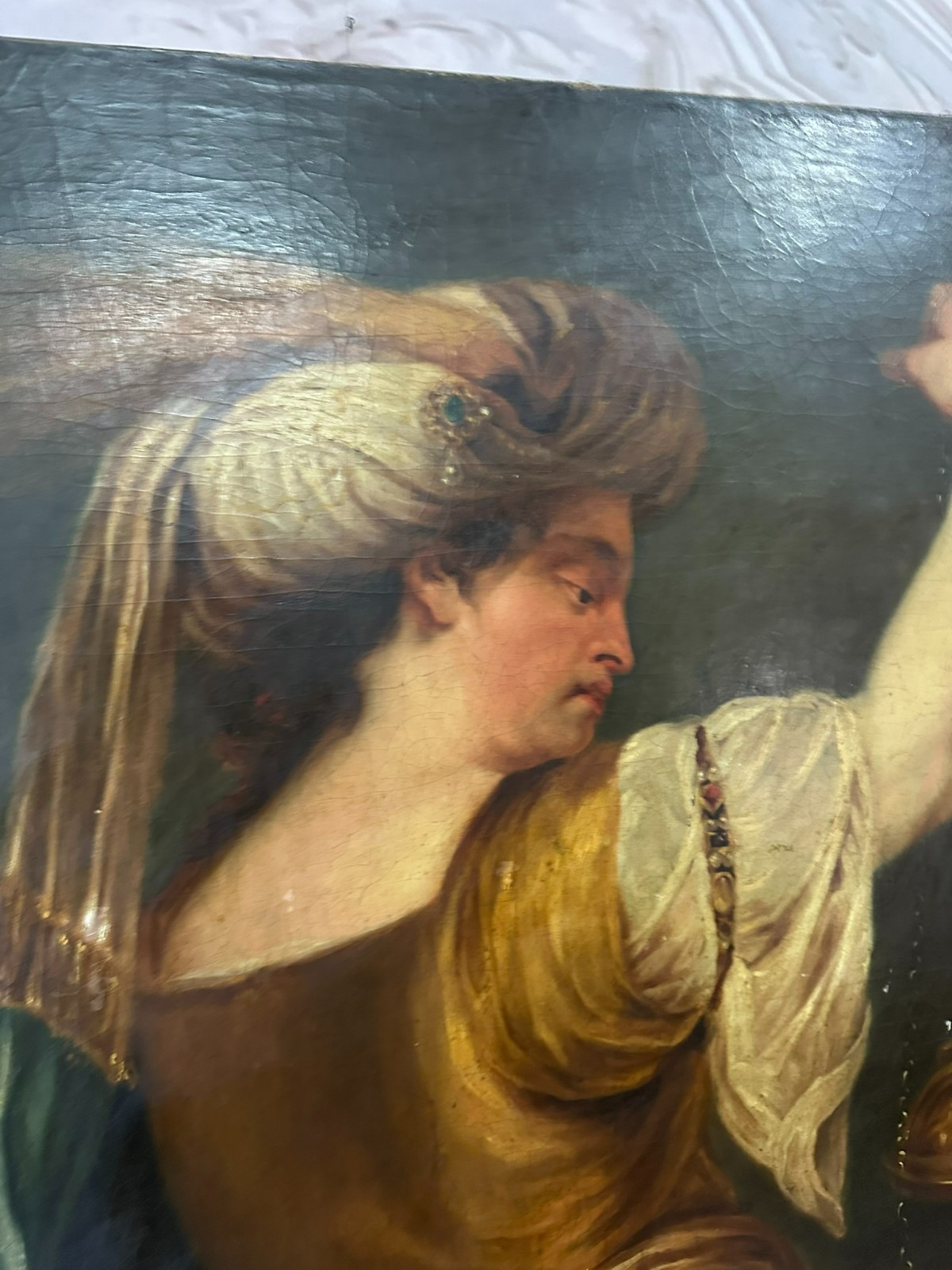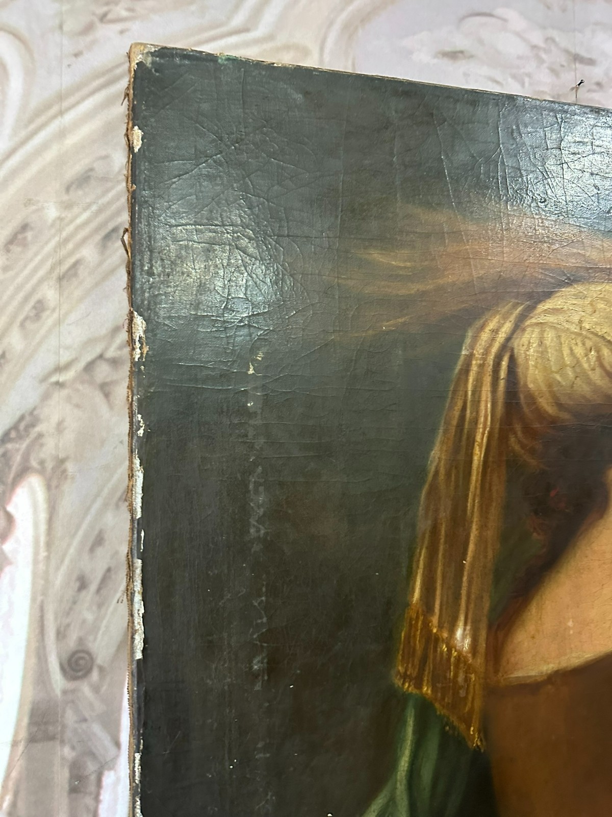 Sehr großes Ölgemälde auf Leinwand, Kopie nach dem Original von Johan BOECKHORST, wohl um 1900 angefertigt. An der gesamten Oberfläche Craquelle, Farbabrieb und Farbabplatzer. Seitlich links Leinwandschaden. Der Firnis ist insgesamt vergilbt und fleckig. Das Gemälde hat wohl auch diverse Übermalungen. Abmessungen 107x127cm.