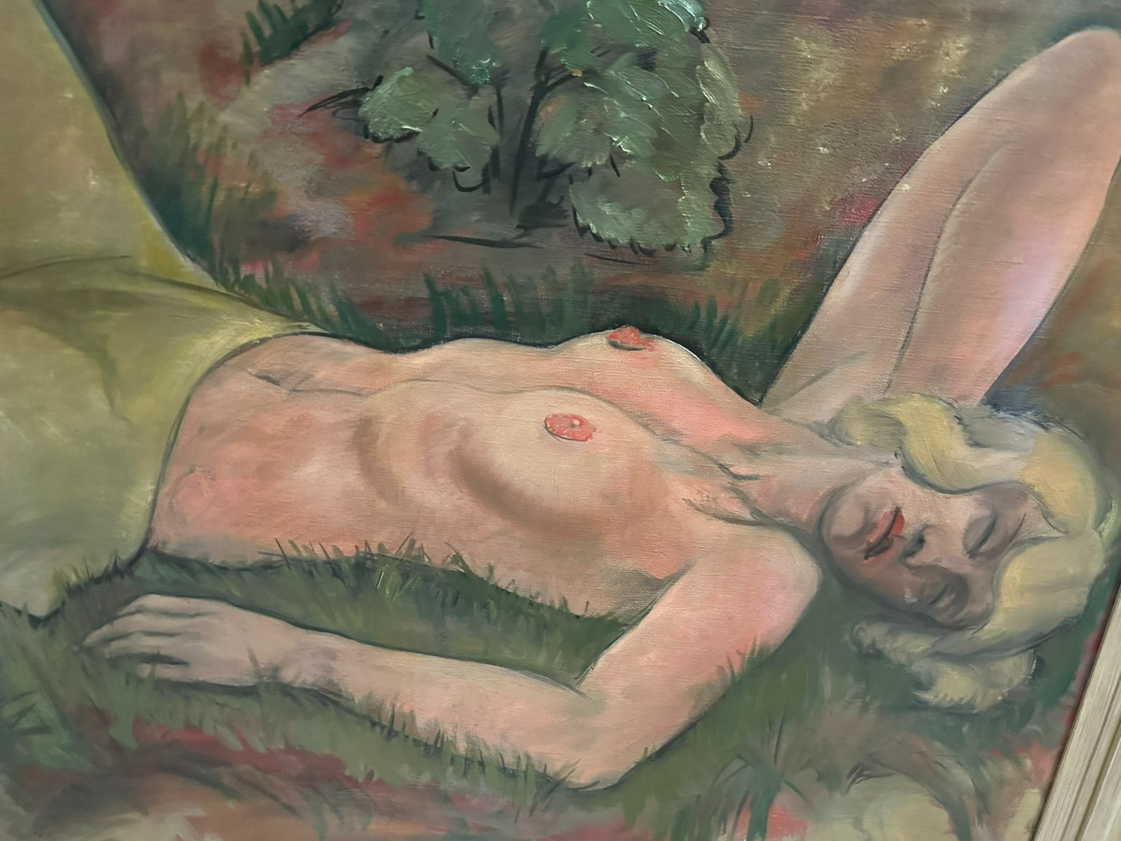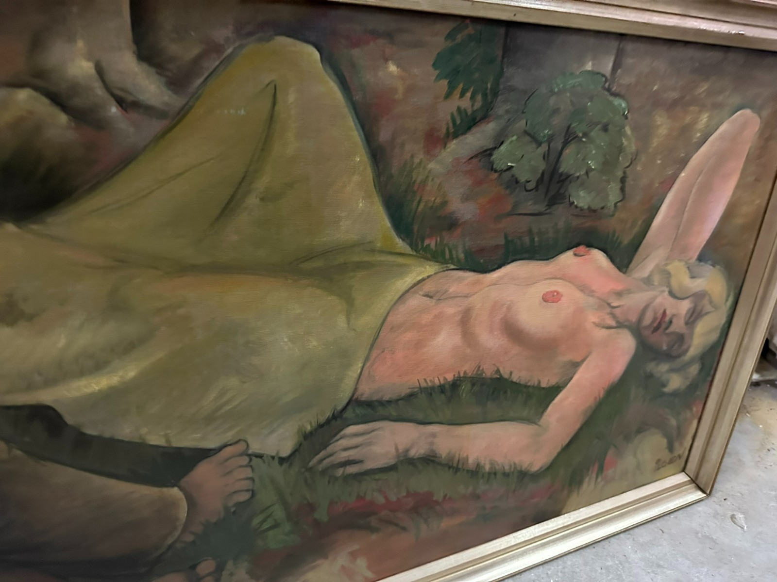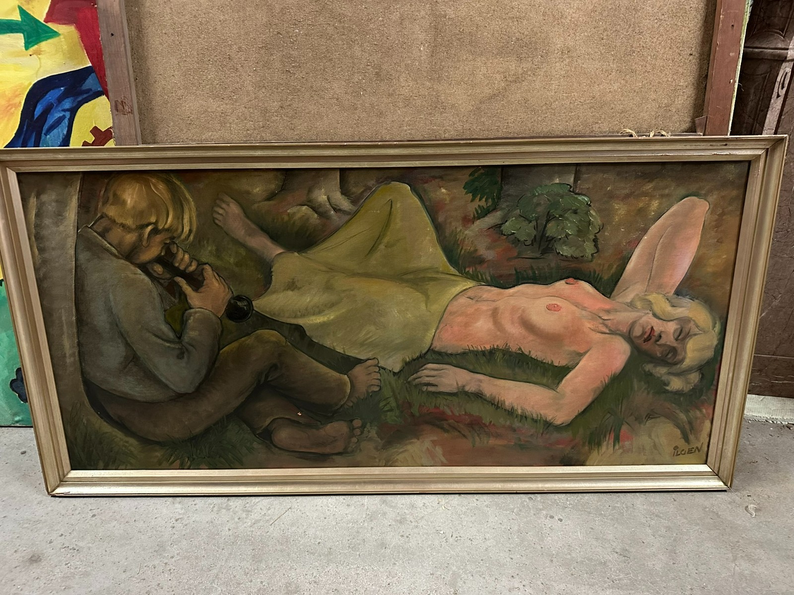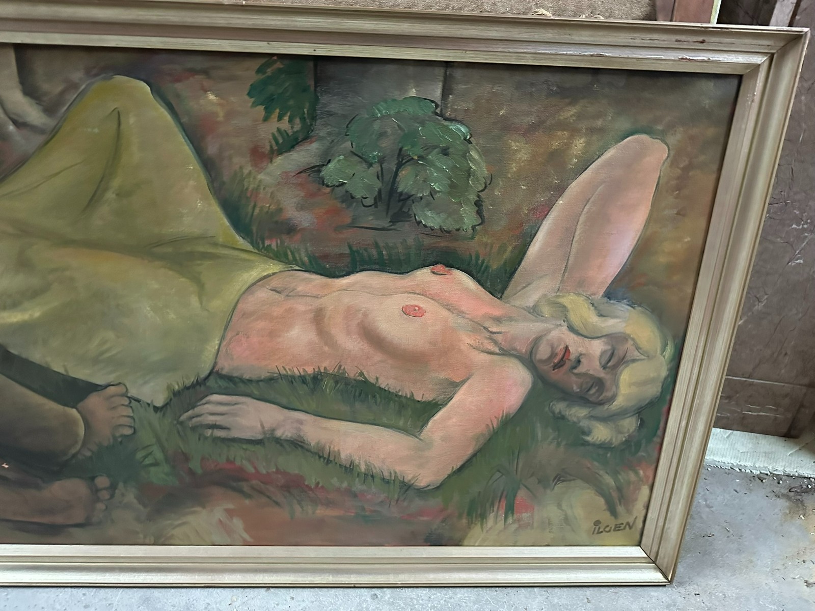 Großes Ölgemälde auf Leinwand, unten rechts signiert Ilgen, schlafender Akt. Mittig kleiner Farbabplatzer, Oberfläche ganz leicht berieben. Der Rahmen ist zum Teil bestossen und berieben. Abmessungen 150x70cm, mit Rahmen 160x80cm.
