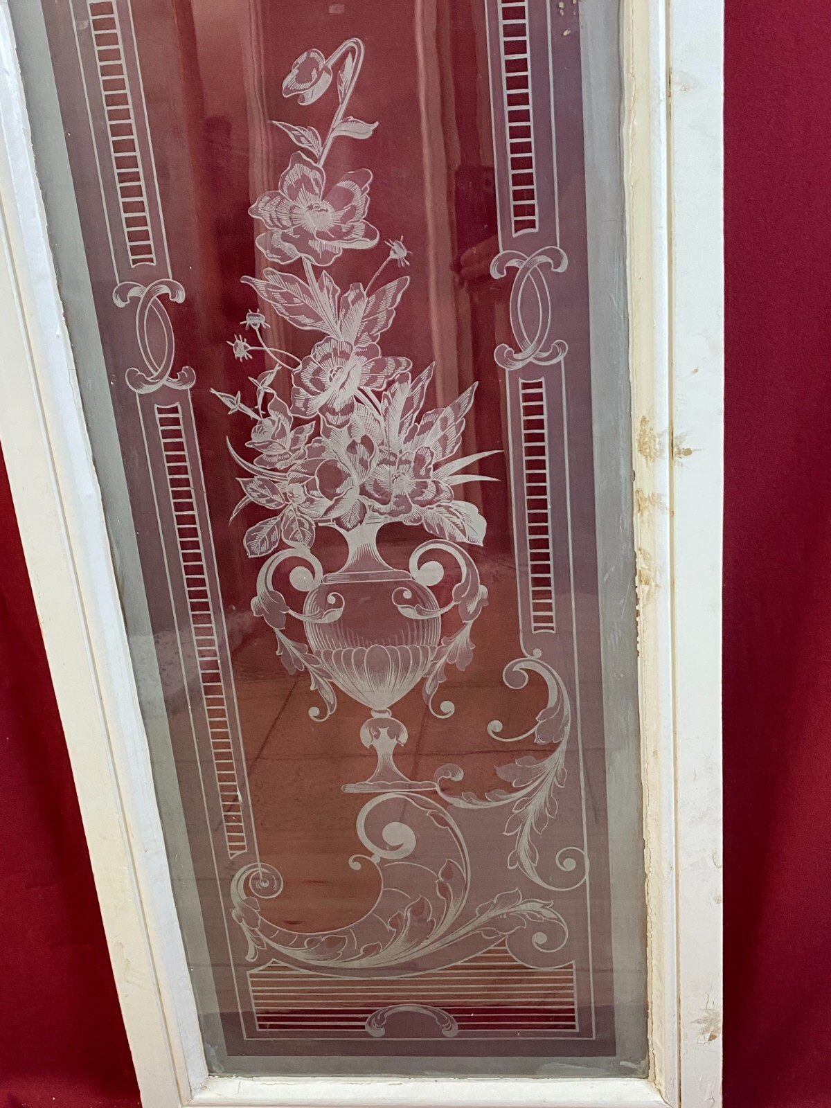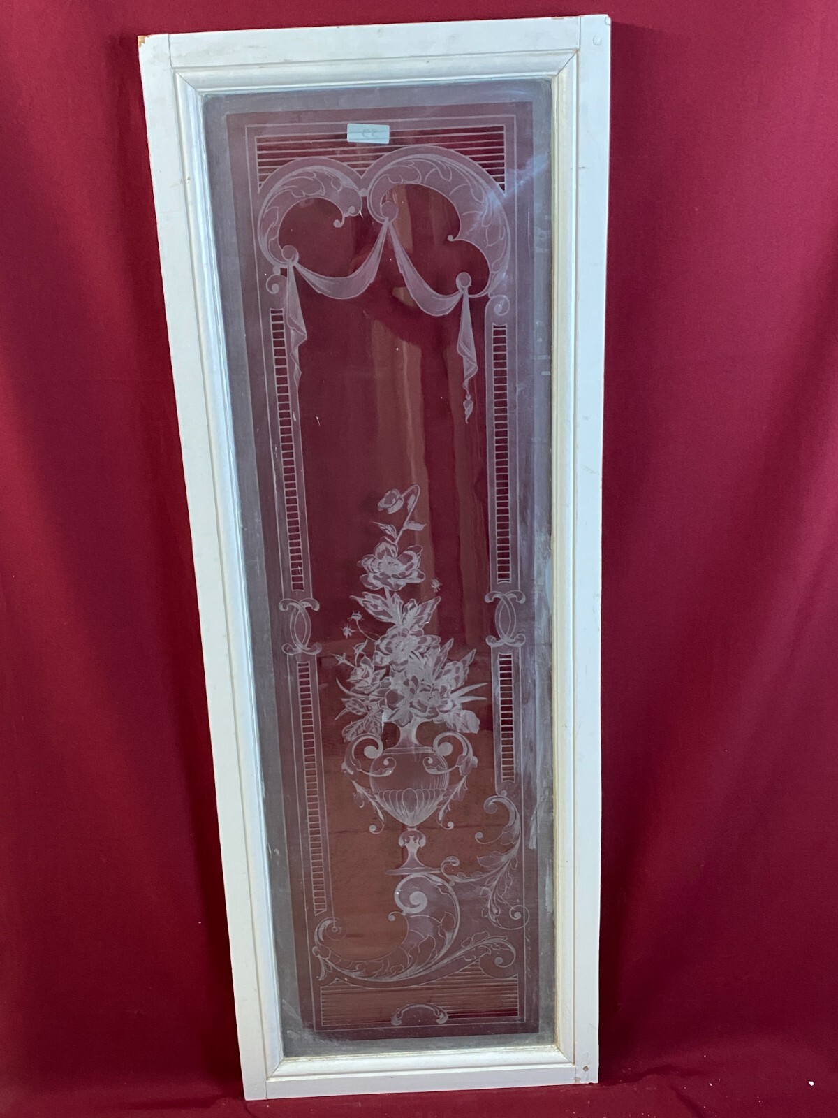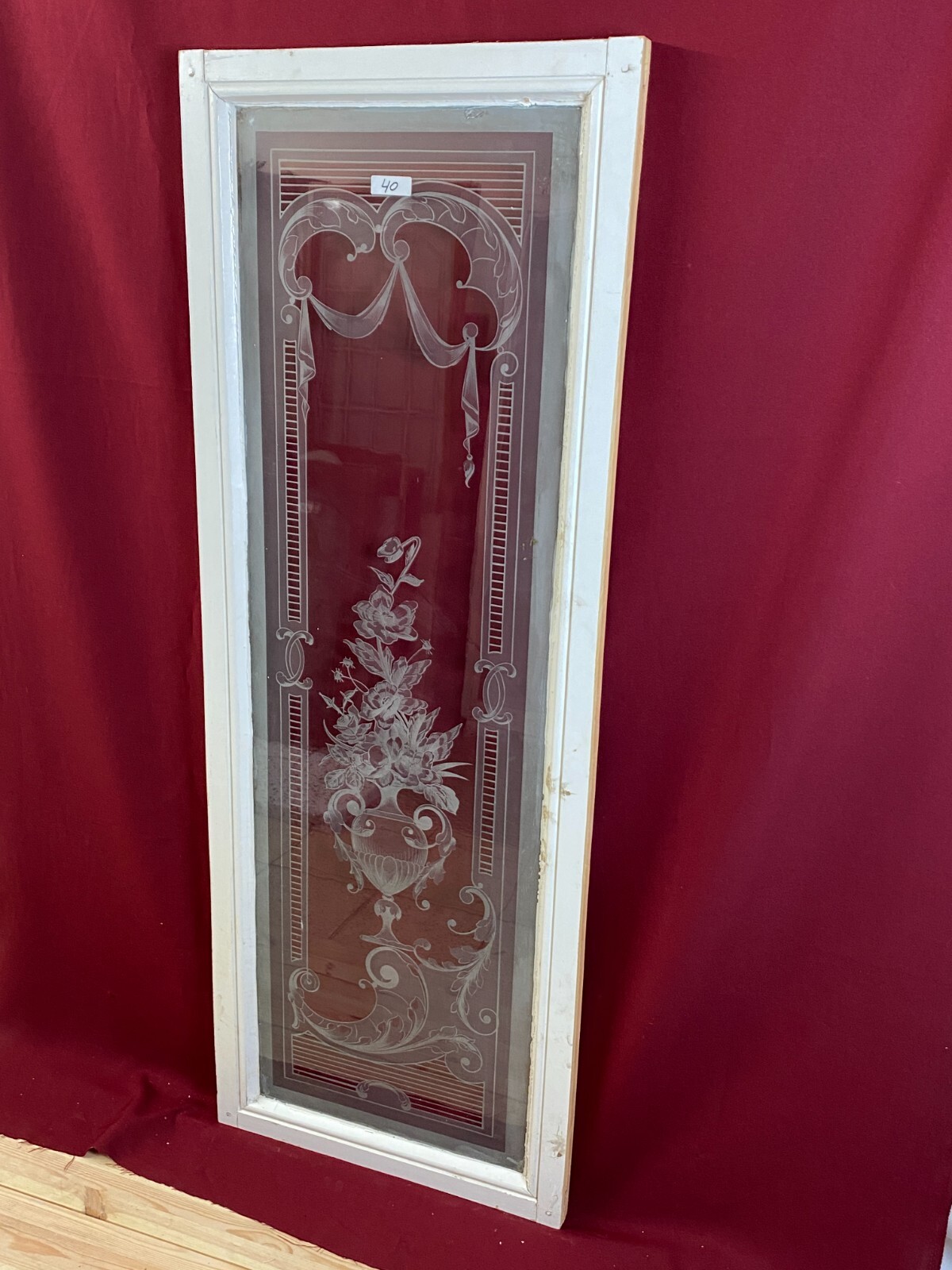 2x Antike Glasscheibe mit Ätzdekor im Holzrahmen. Die Scheibe wurde zum Schutz im Rahmen belassen, das Holz ist hier teils bemalt und berieben. Im Randbereich der Scheibe Farb- und Verkittungsreste, an der Oberfläche Farbspritzer möglich. Abmessungen: 43x141cm, mit Rahmen: 54x150cm. Die Scheibe ist Original aus der Zeit 1880-1920, wie im Titel angegeben. Beachten Sie bitte die Bilder zum genauen Artikelzustand. Der Holzrahmen ist meist ein Ausschnitt des alten Fensters, dieser kann nicht mehr als Baubestandteil genutzt werden und dienst nur zur Transportsicherung des Glases.