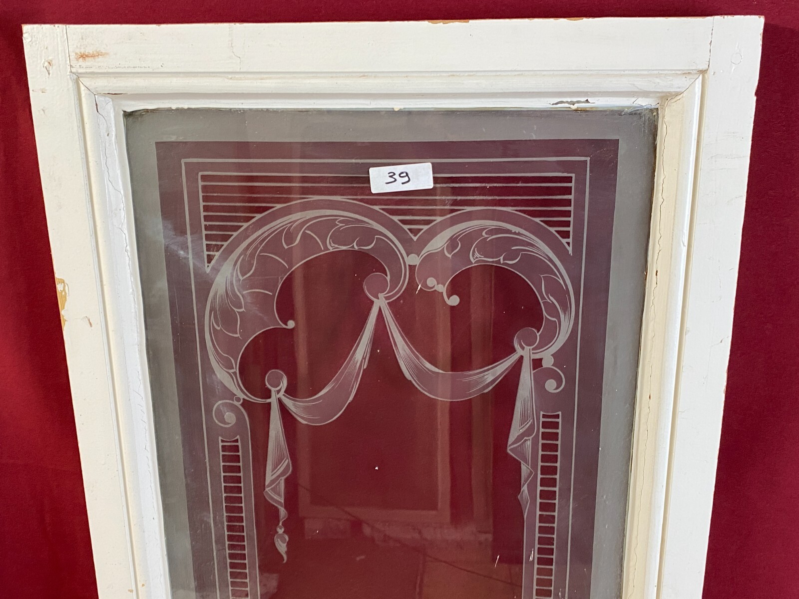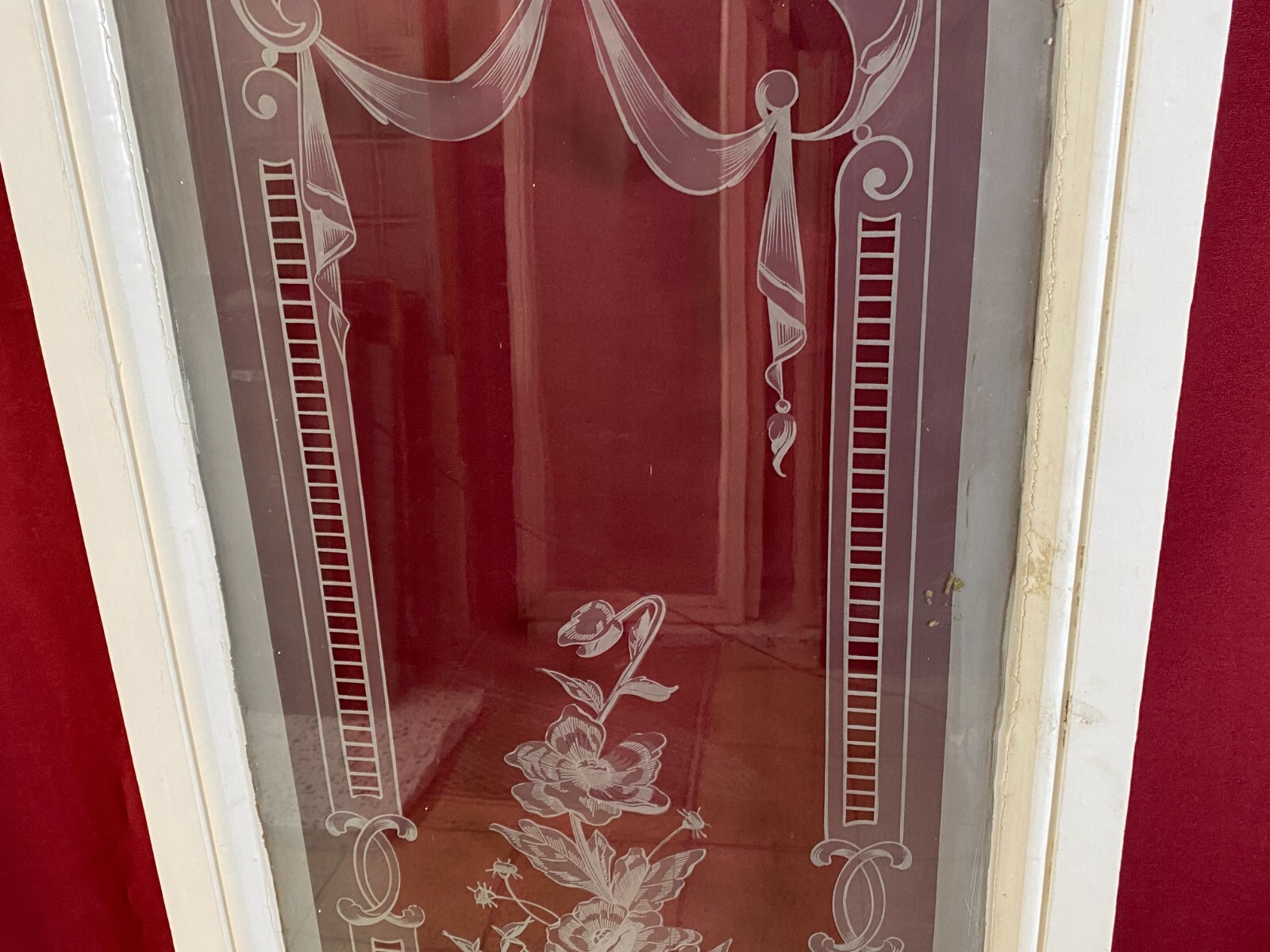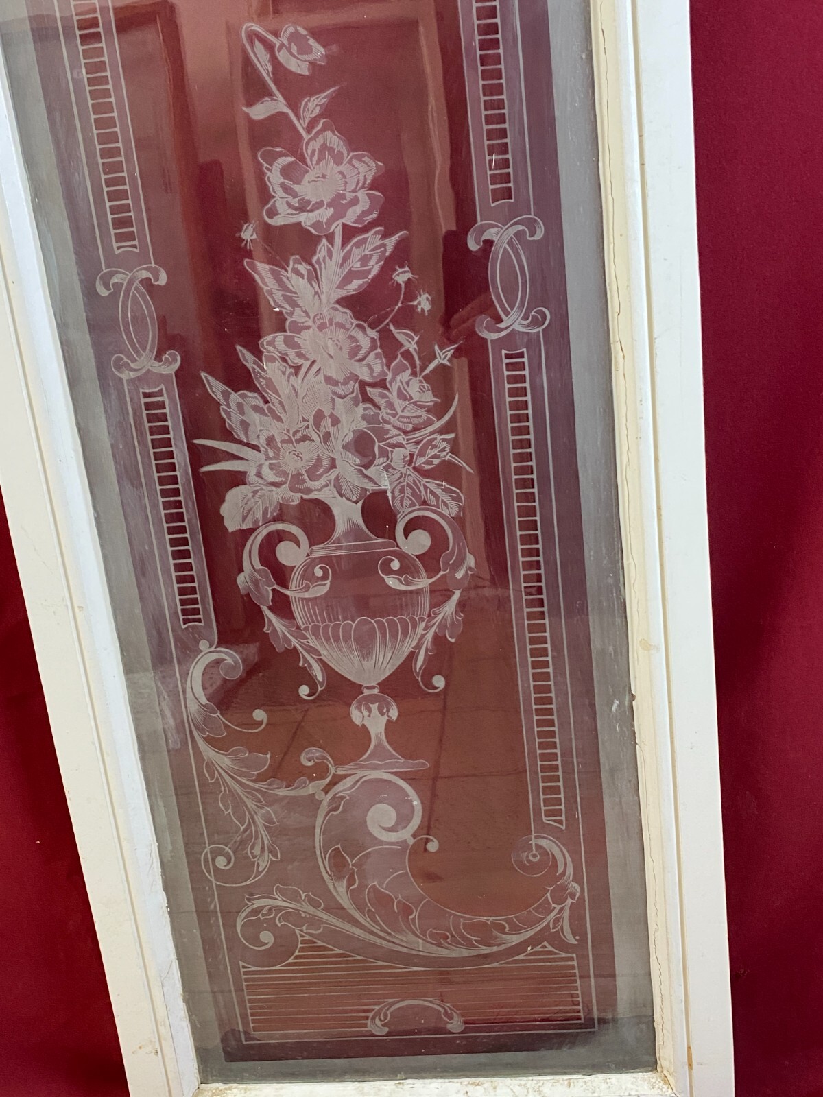 2x Antike Glasscheibe mit Ätzdekor im Holzrahmen. Die Scheibe wurde zum Schutz im Rahmen belassen, das Holz ist hier teils bemalt und berieben. Im Randbereich der Scheibe Farb- und Verkittungsreste, an der Oberfläche Farbspritzer möglich. Abmessungen: 43x141cm, mit Rahmen: 54x150cm. Die Scheibe ist Original aus der Zeit 1880-1920, wie im Titel angegeben. Beachten Sie bitte die Bilder zum genauen Artikelzustand. Der Holzrahmen ist meist ein Ausschnitt des alten Fensters, dieser kann nicht mehr als Baubestandteil genutzt werden und dienst nur zur Transportsicherung des Glases.
