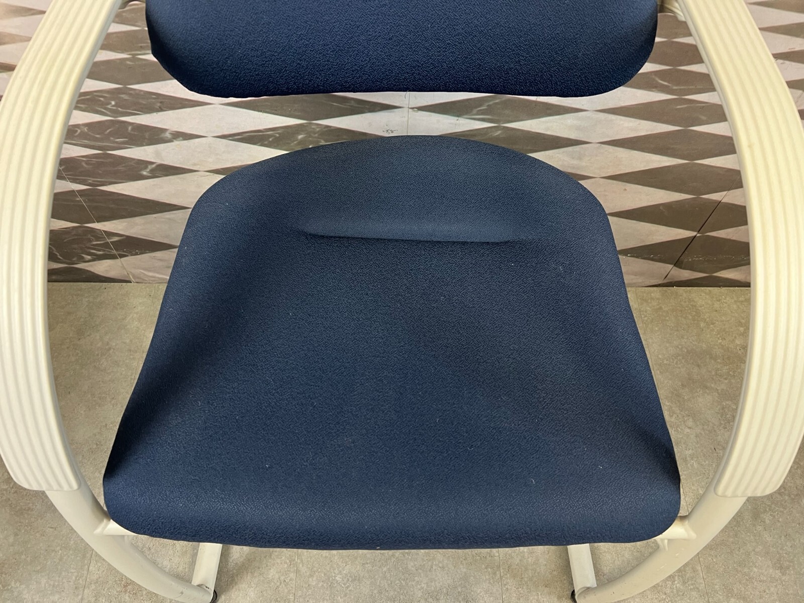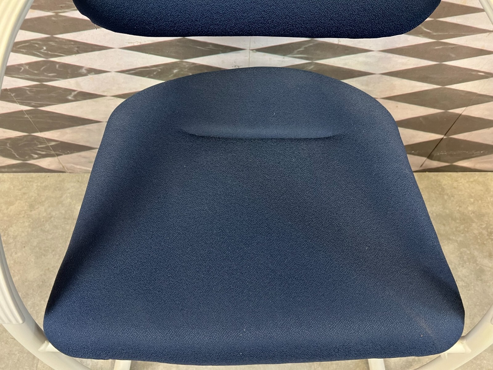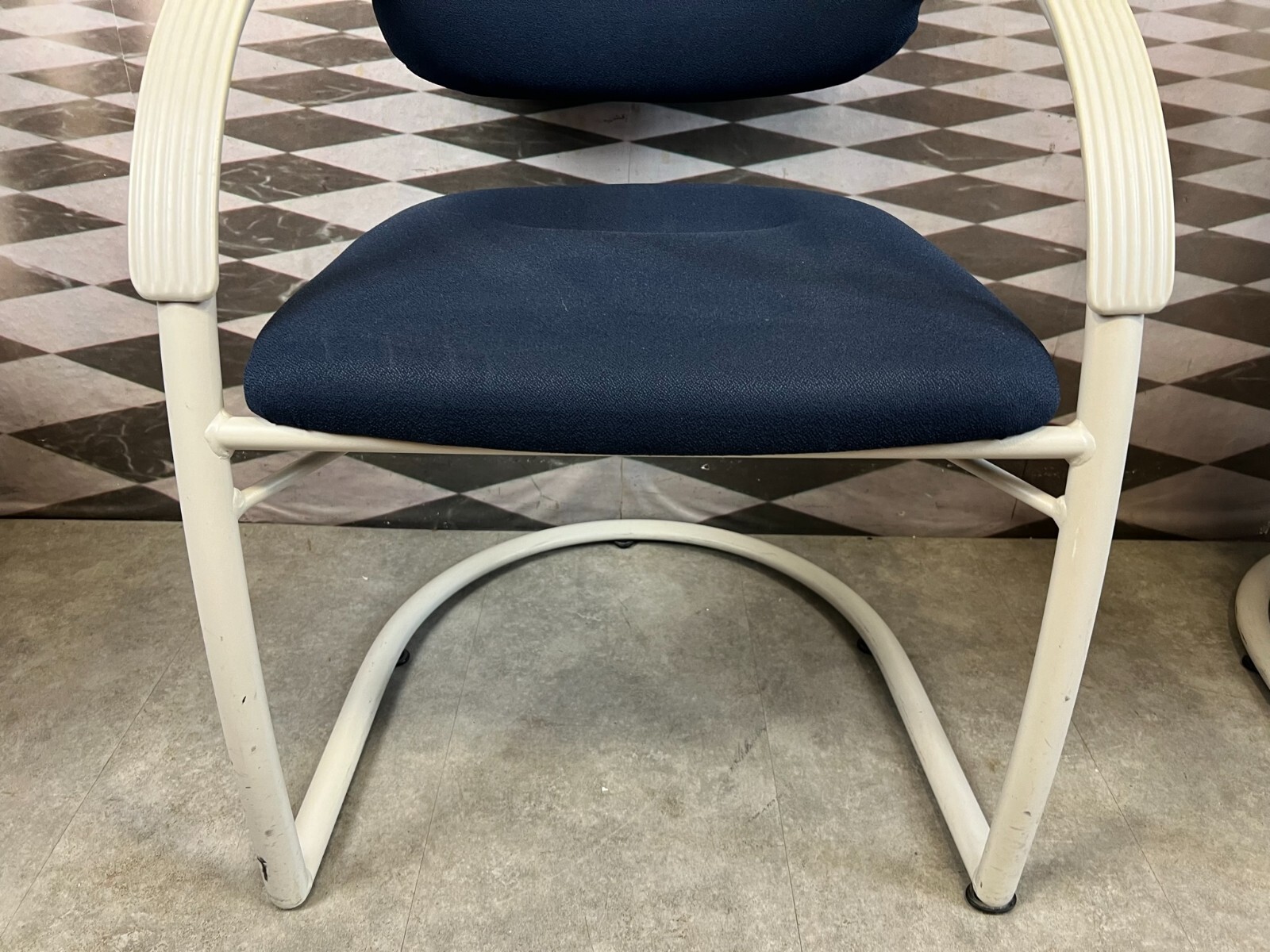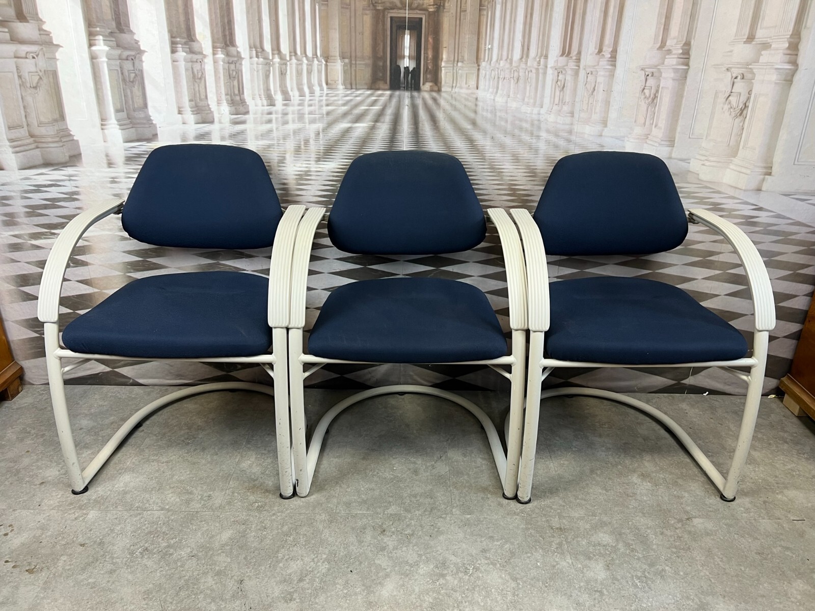 Set bestehend aus drei Vintage Bürostühlen. Gestell aus Kunststoff und Metall, Polster leicht verschmutzt und abgenutzt. Stabiler Zustand, im Fußbereich berieben. Guter Sitzkomfort, Abmessungen BTH: 57x50x84cm, Sitzhöhe: 48cm, Sitzbreite: 49cm.
