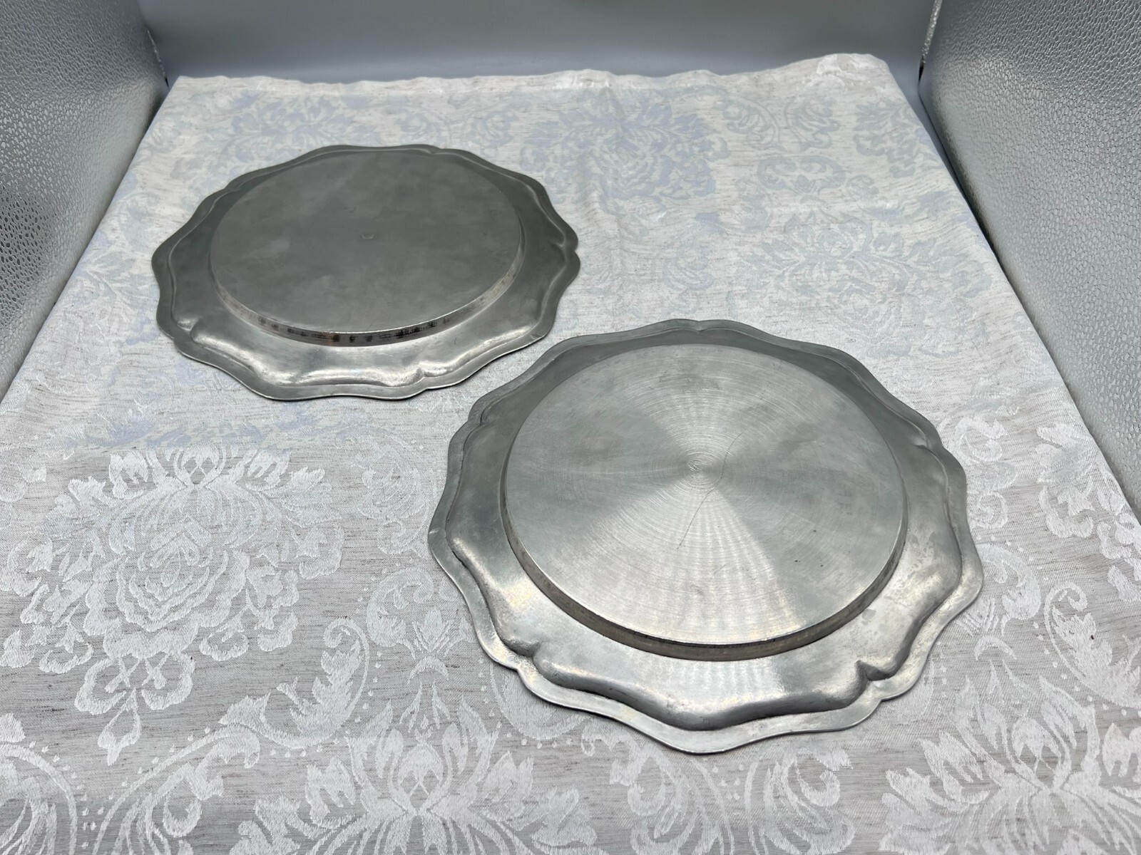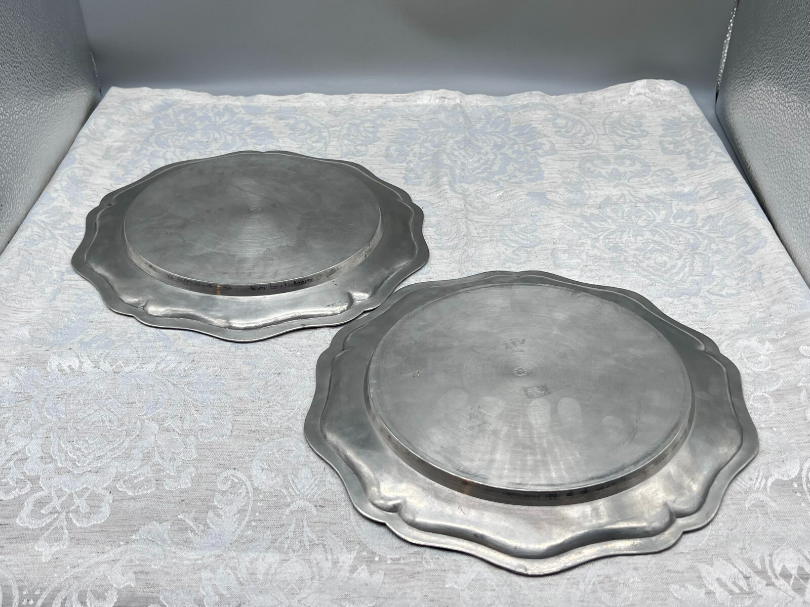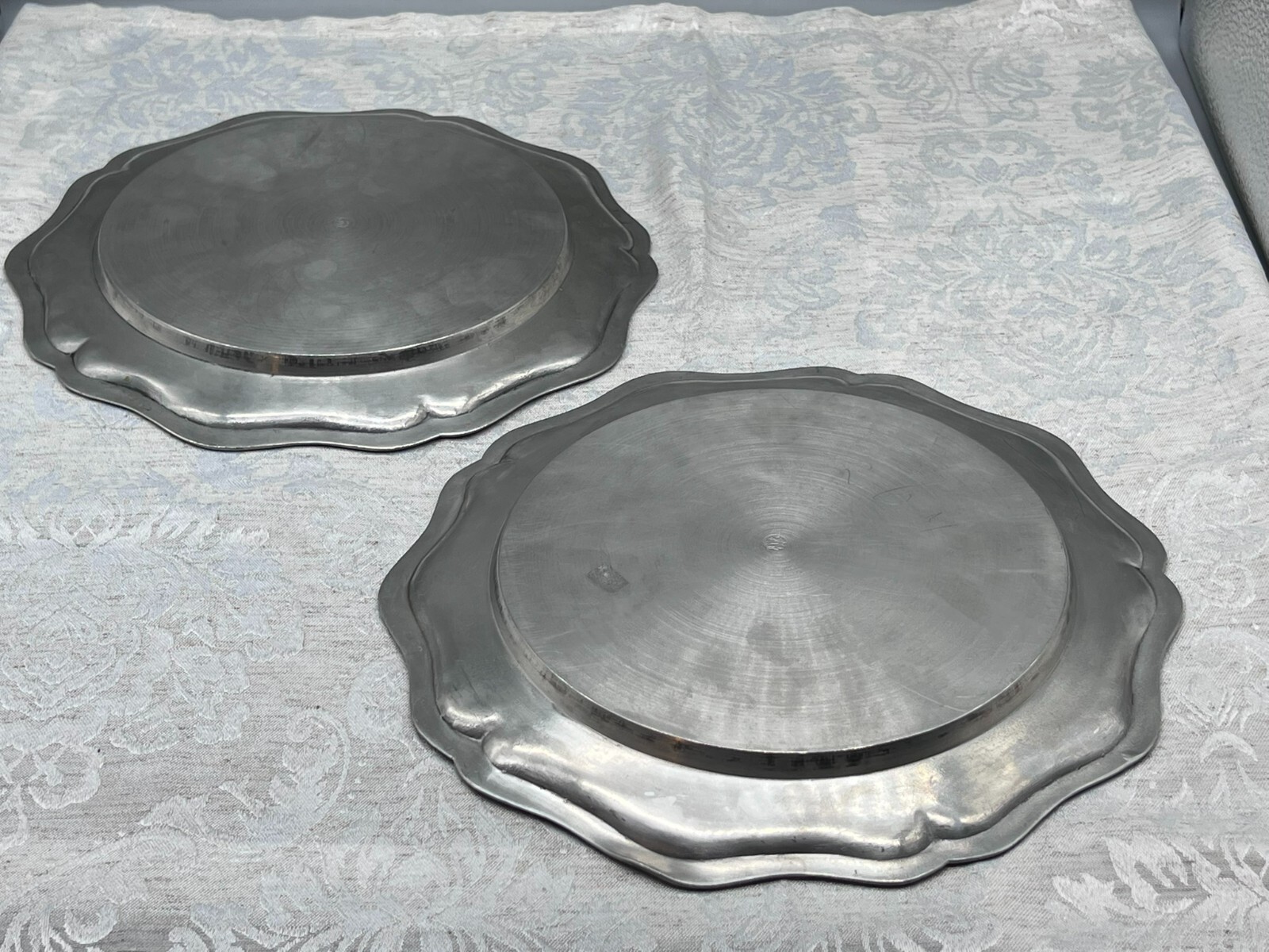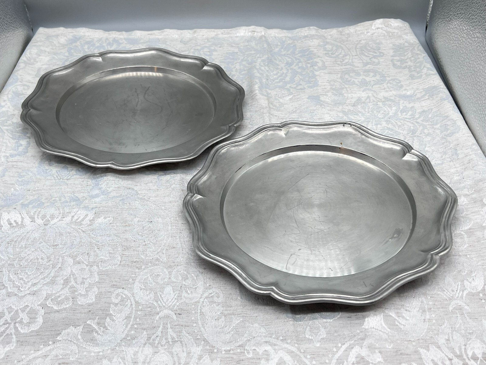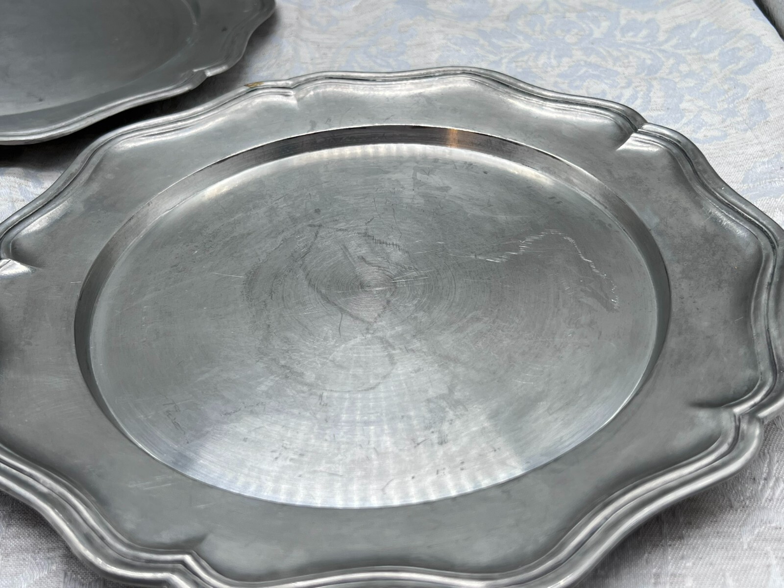 Set bestehend aus acht großen Zinntellern, Gesamtgewicht ca. 5,7kg. Oberflächen berieben, kleinere Dellen möglich, Durchmesser 27cm.