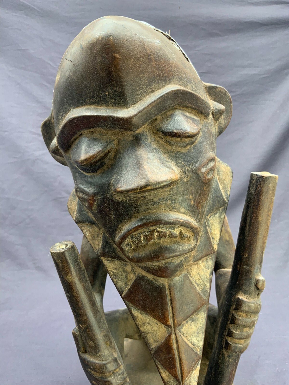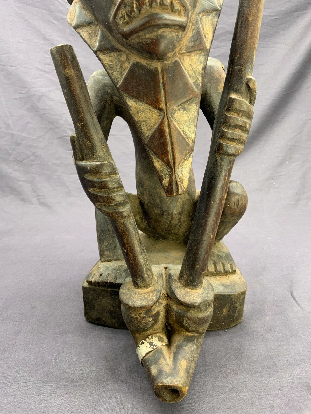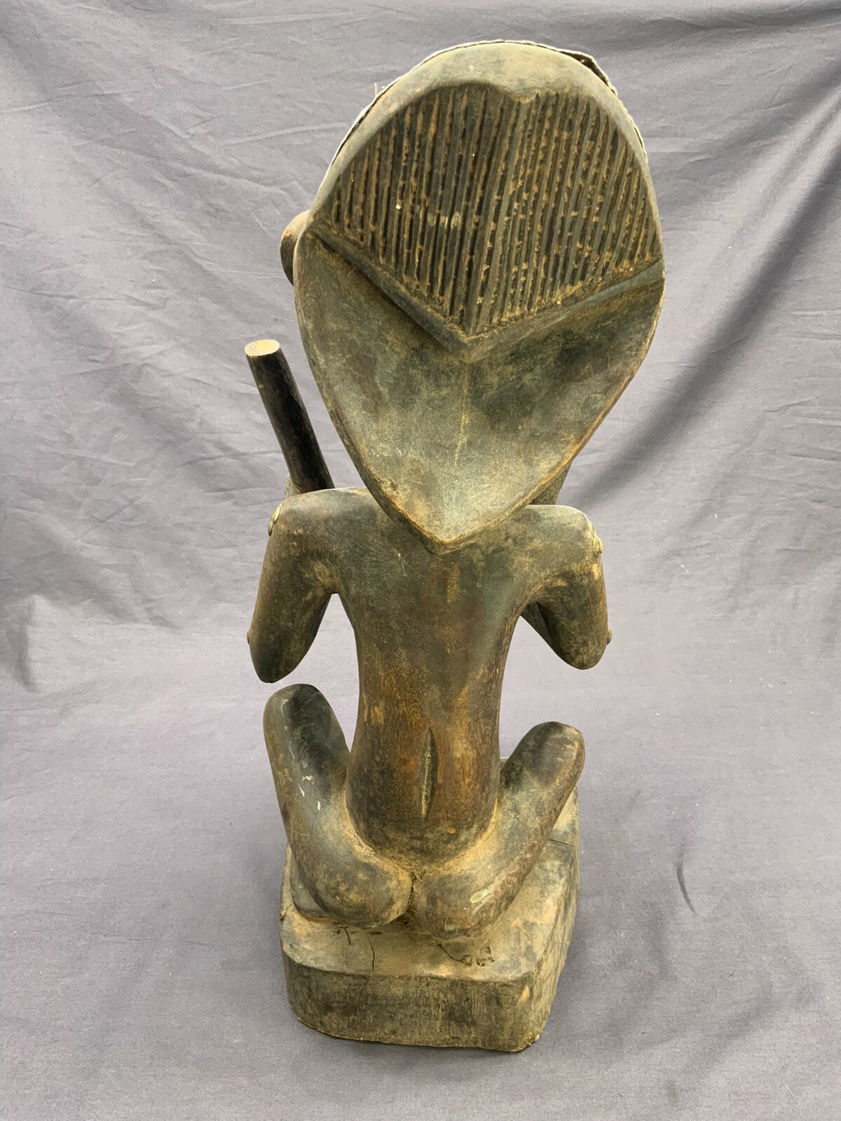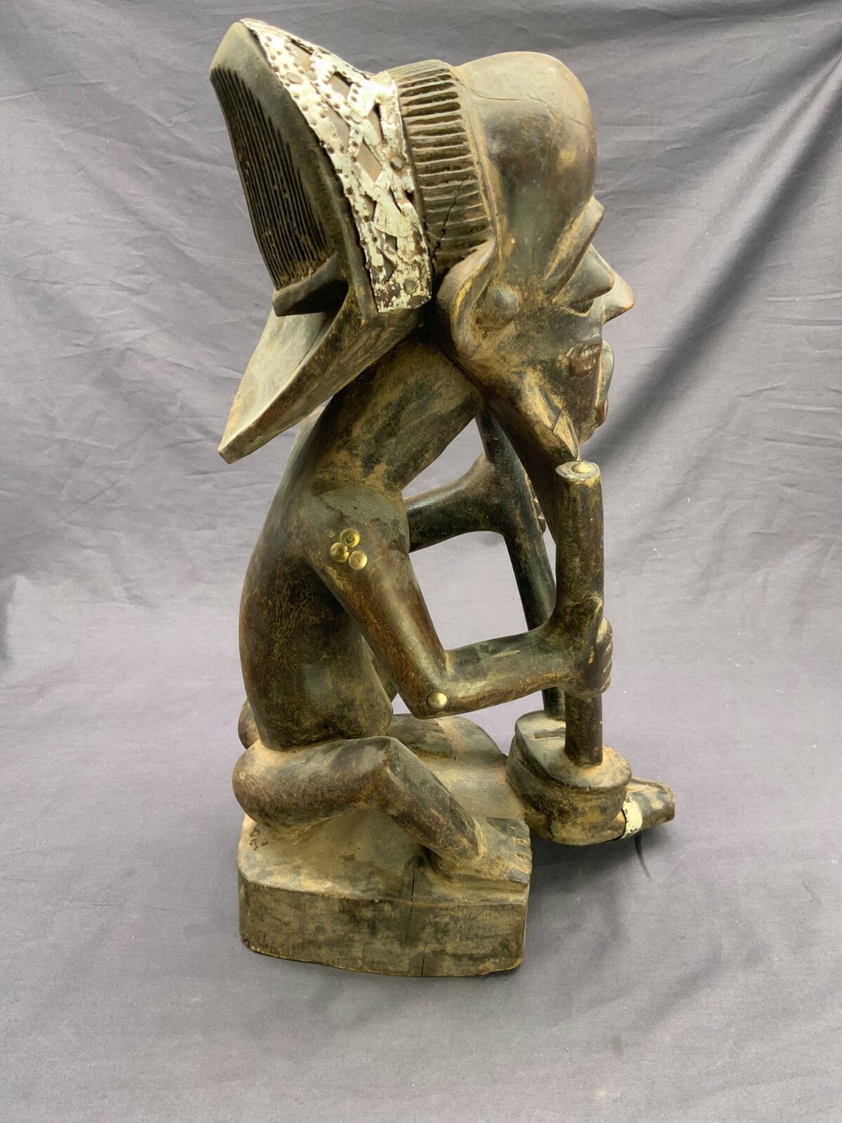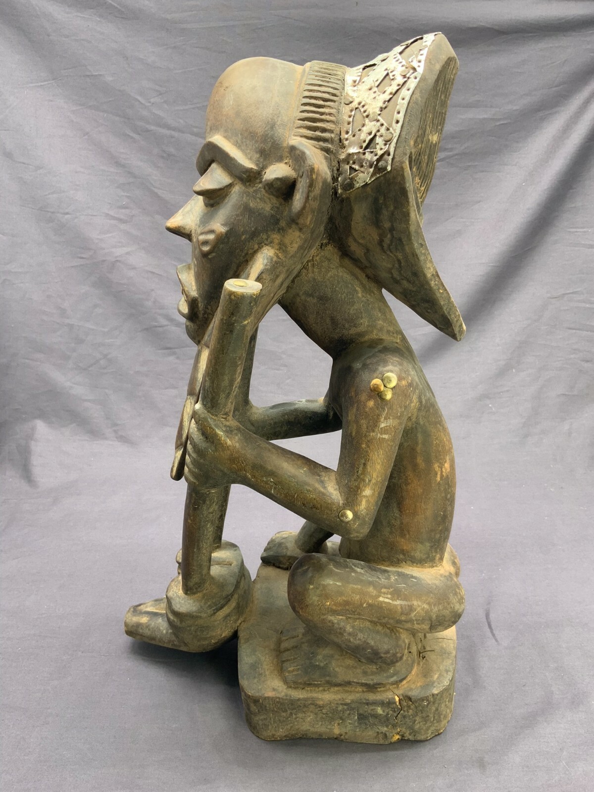 AFRIKA SKULPTUR SITZENDER MANN METALLAPPLIKEN ANTIK HOLZ HANDGESCHNITZT 42cm