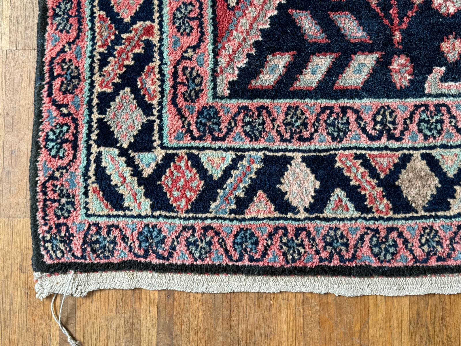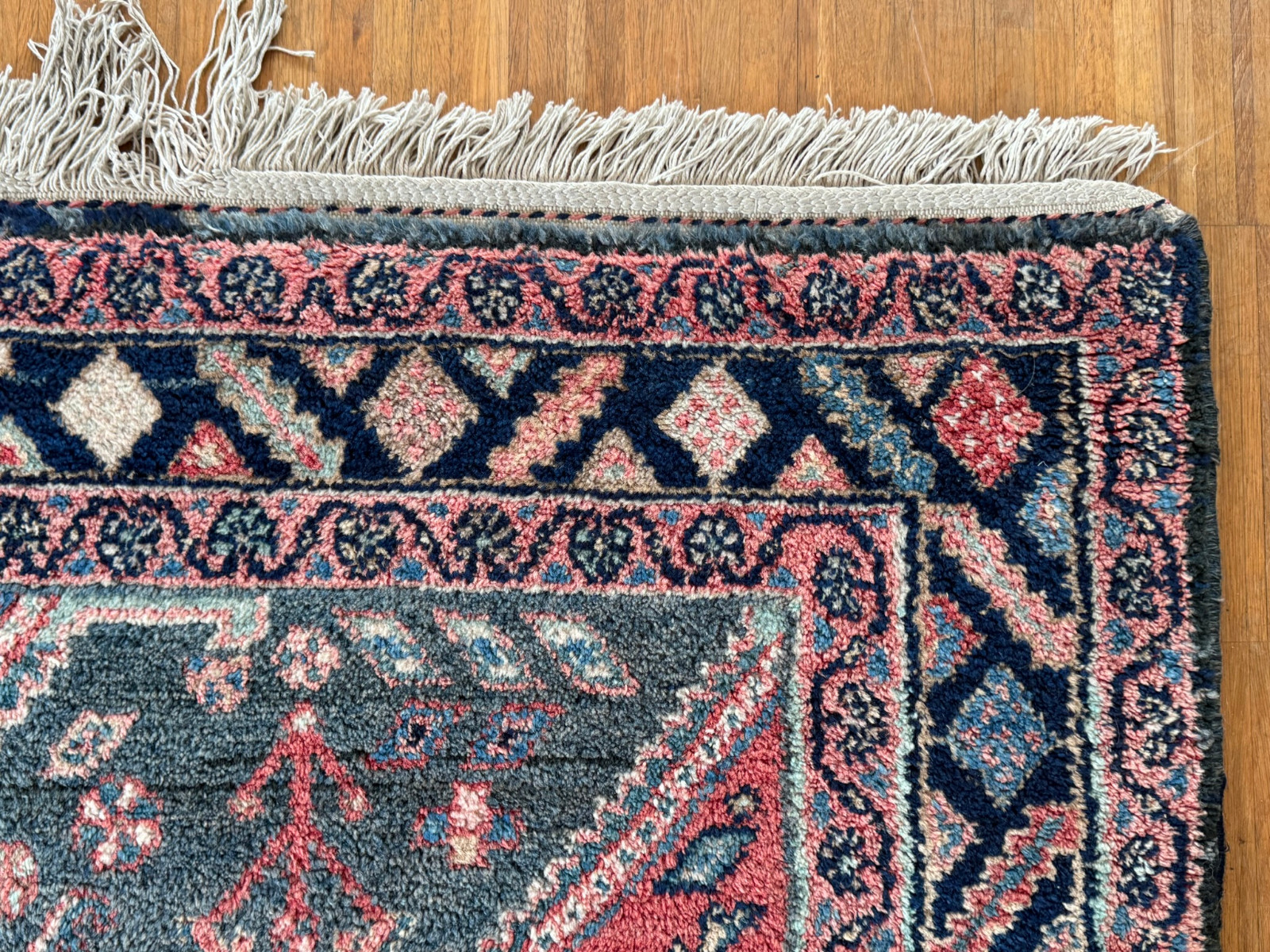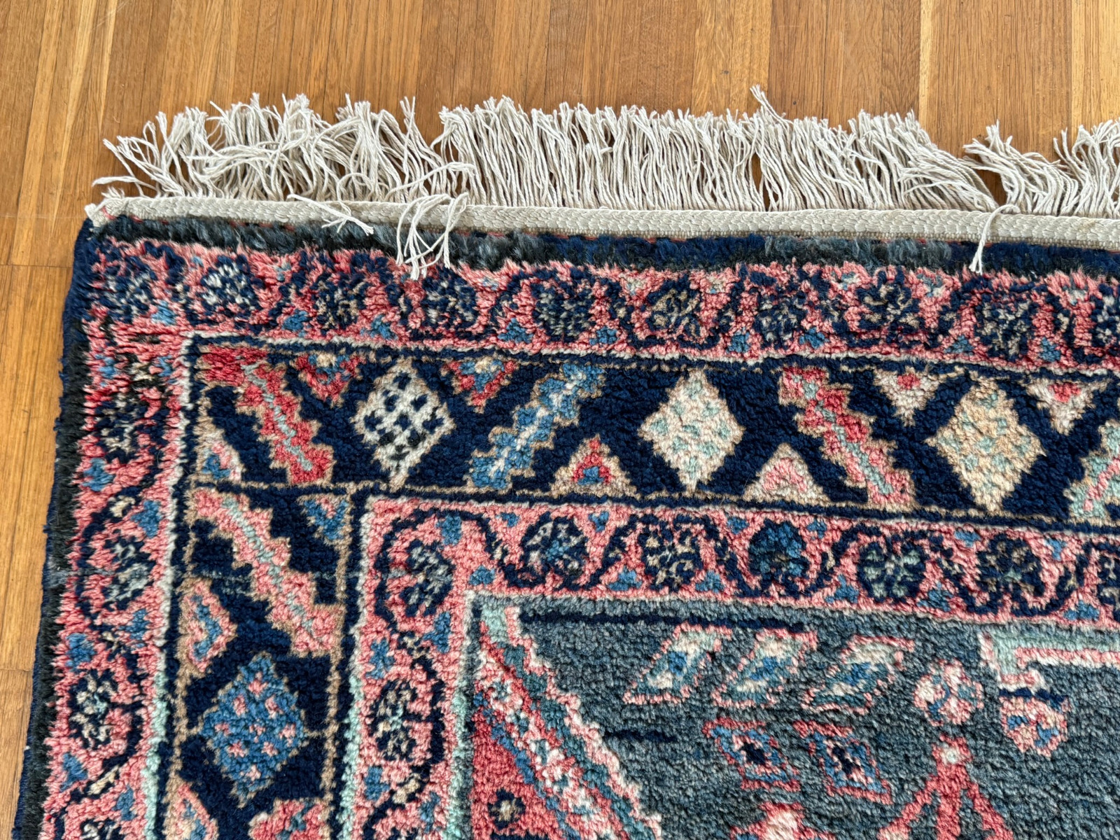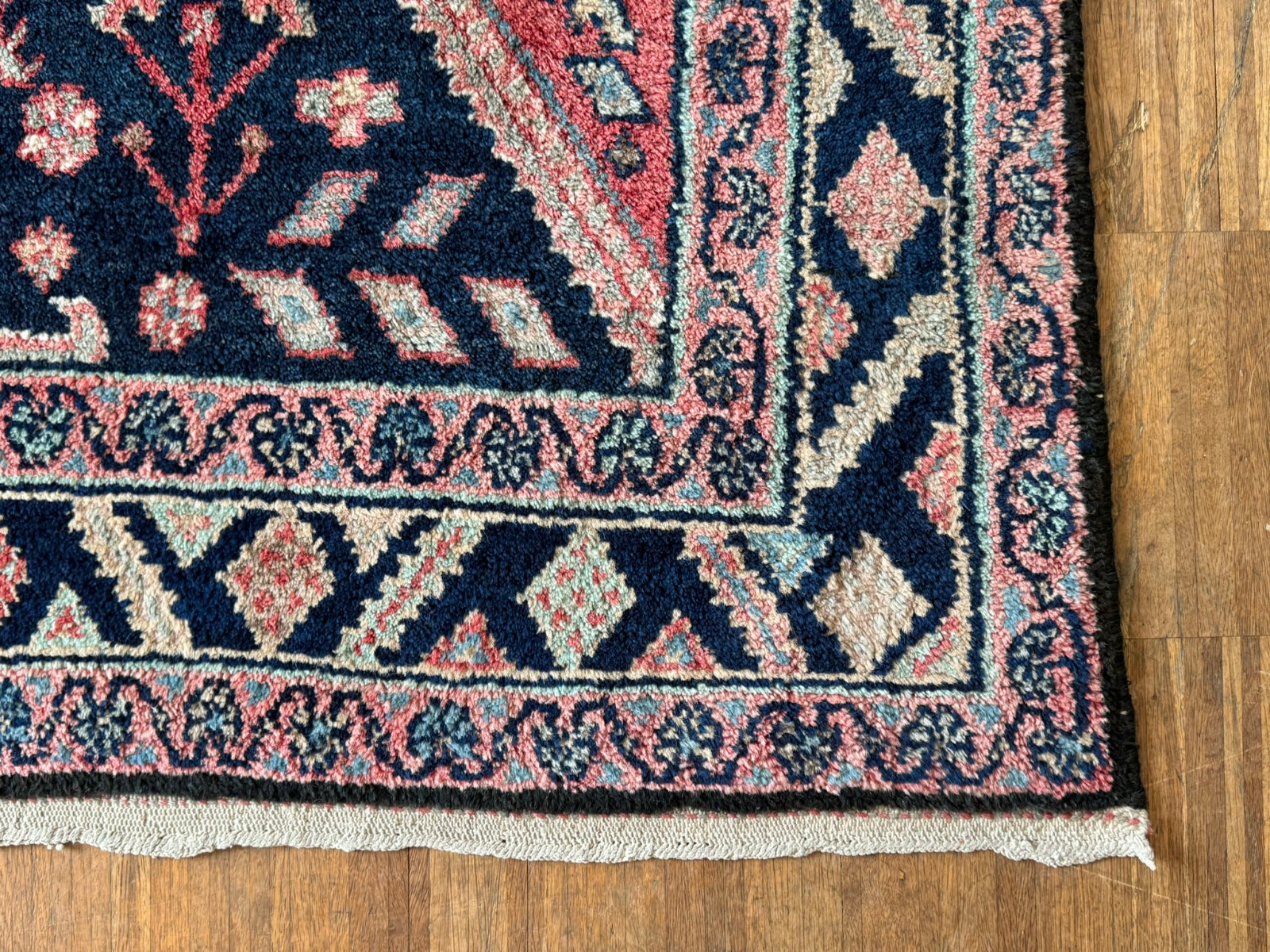 Handgeknüpfter türkischer Teppich aus Wolle. Fransen zum Teil verschlissen und schmutzig, die dunkelblaue Wolle ist an einem Ende heller, hier wurde eine andere Wollfärbung durchgeführt. Ohne Mottenfrass. Abmessungen 270x146cm INKLUSIVE Fransen. Die Teppiche sind nicht gereinigt und riechen weder nach Rauch noch nach Tieren.