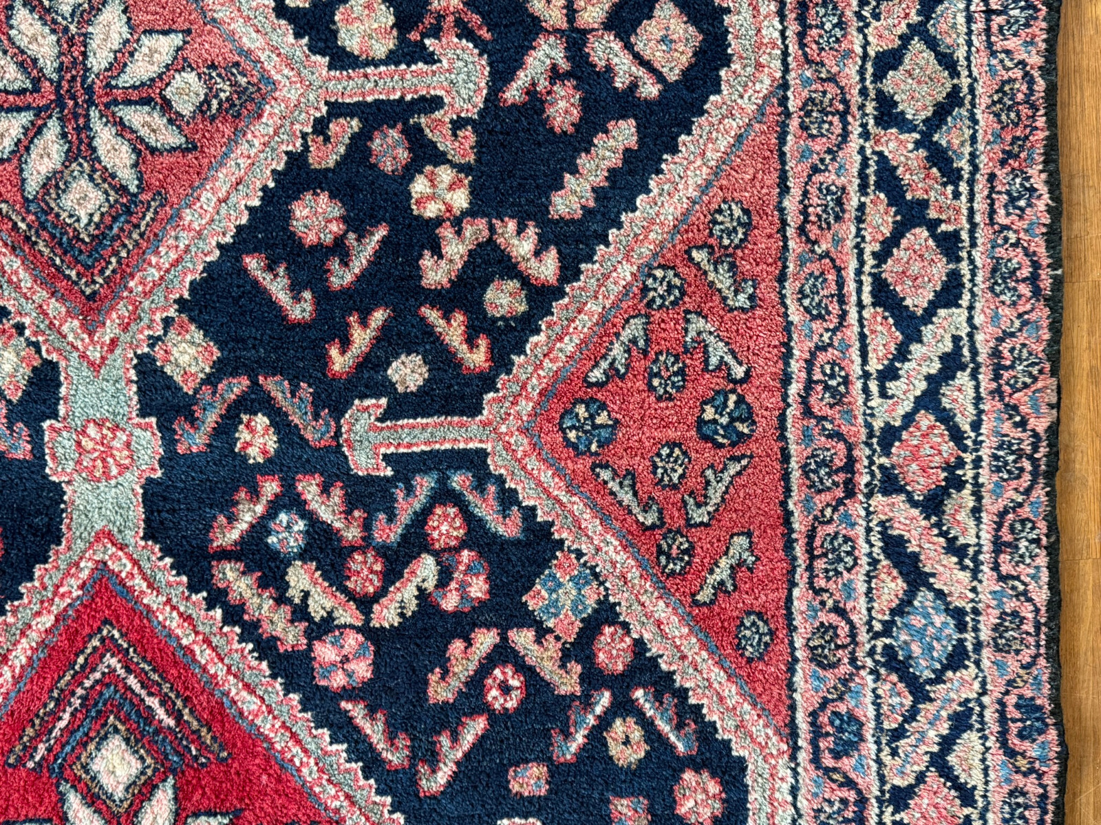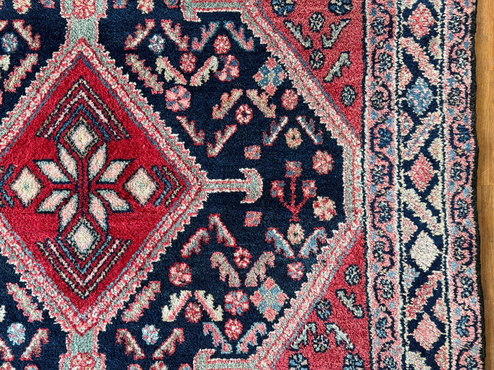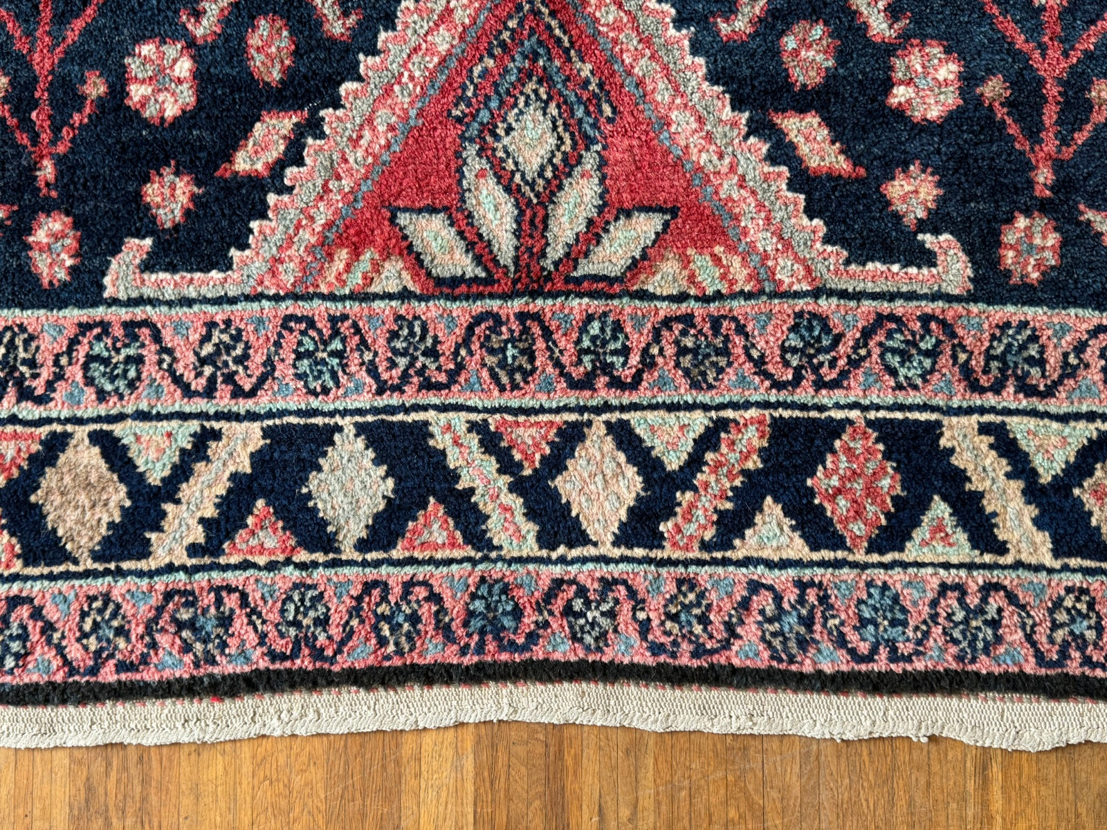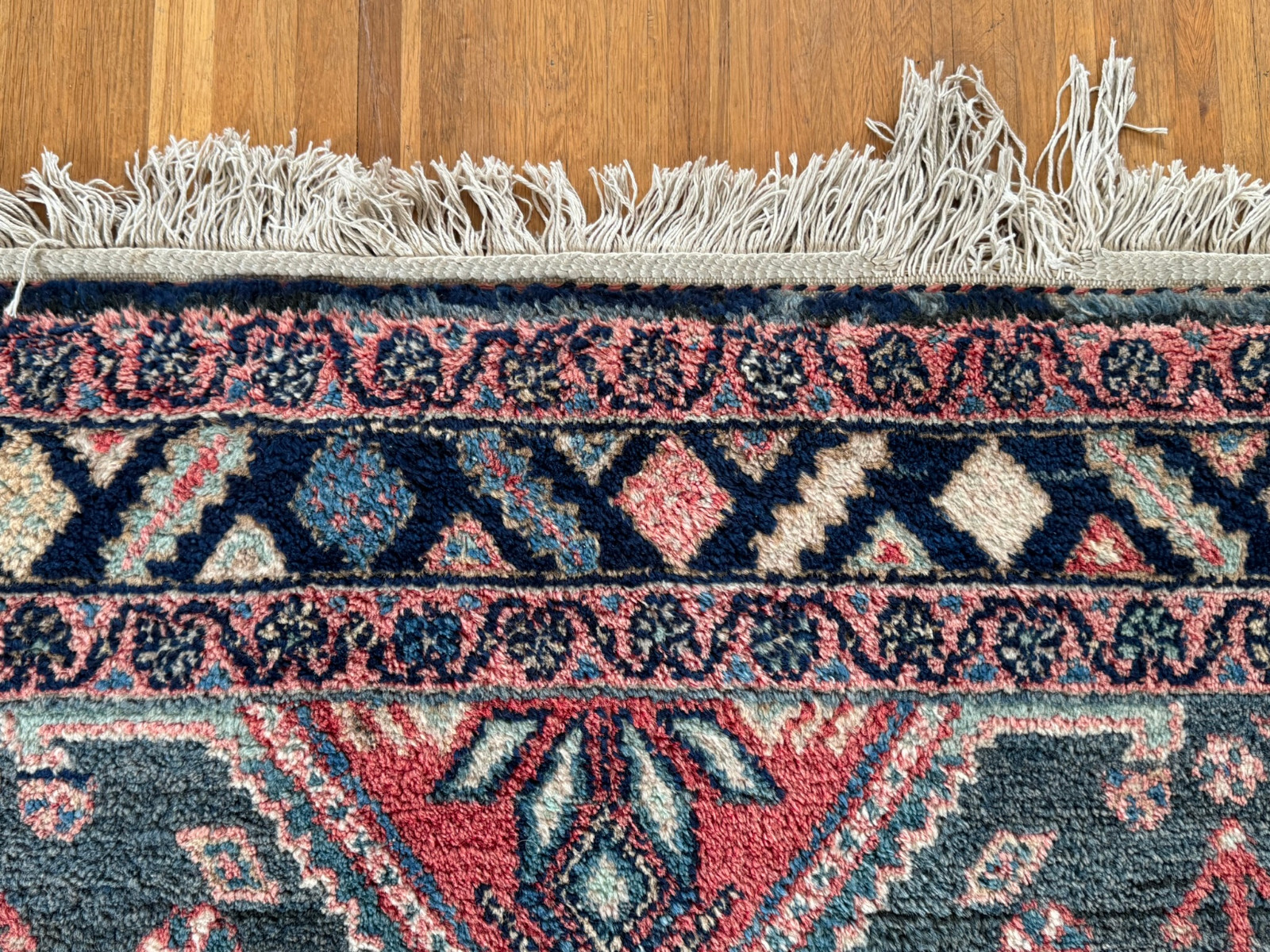 Handgeknüpfter türkischer Teppich aus Wolle. Fransen zum Teil verschlissen und schmutzig, die dunkelblaue Wolle ist an einem Ende heller, hier wurde eine andere Wollfärbung durchgeführt. Ohne Mottenfrass. Abmessungen 270x146cm INKLUSIVE Fransen. Die Teppiche sind nicht gereinigt und riechen weder nach Rauch noch nach Tieren.