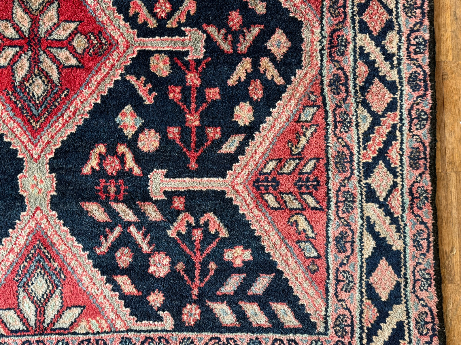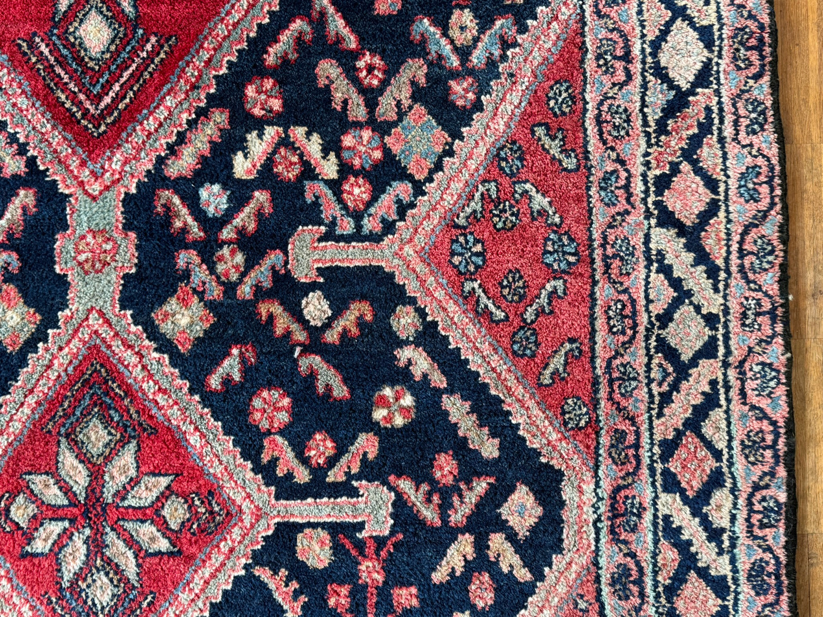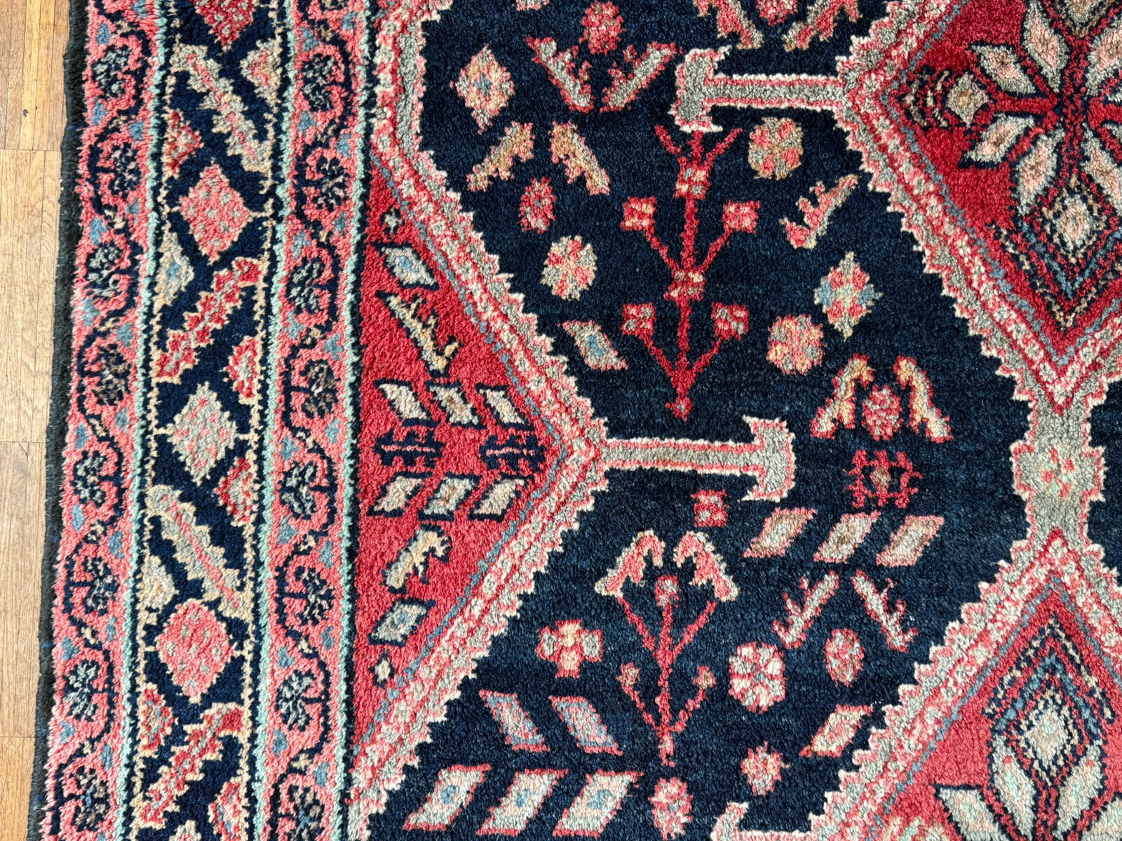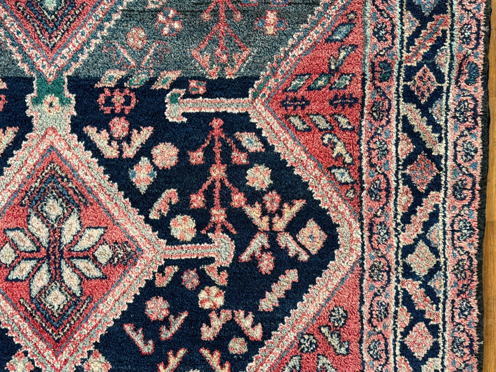 Handgeknüpfter türkischer Teppich aus Wolle. Fransen zum Teil verschlissen und schmutzig, die dunkelblaue Wolle ist an einem Ende heller, hier wurde eine andere Wollfärbung durchgeführt. Ohne Mottenfrass. Abmessungen 270x146cm INKLUSIVE Fransen. Die Teppiche sind nicht gereinigt und riechen weder nach Rauch noch nach Tieren.