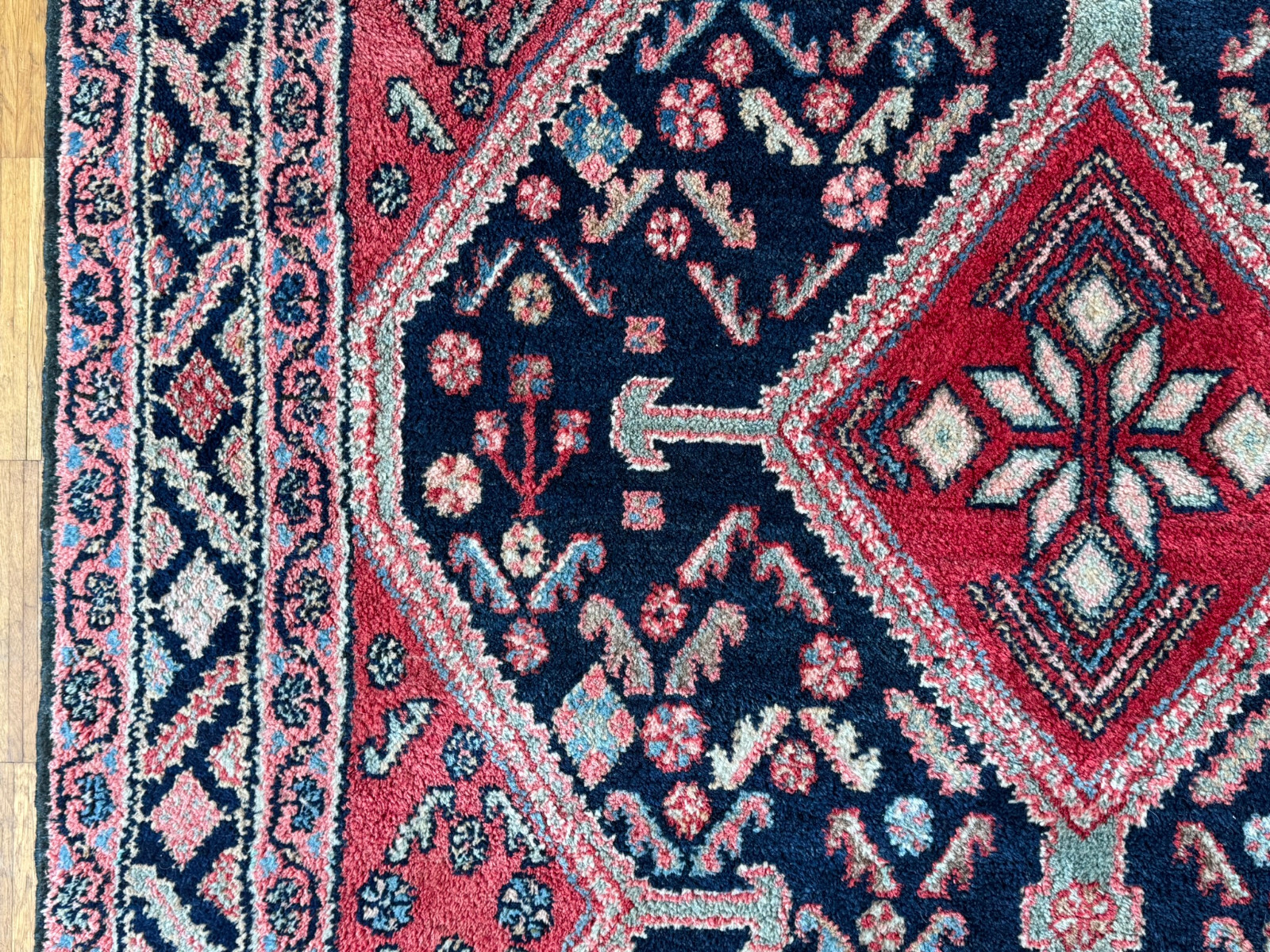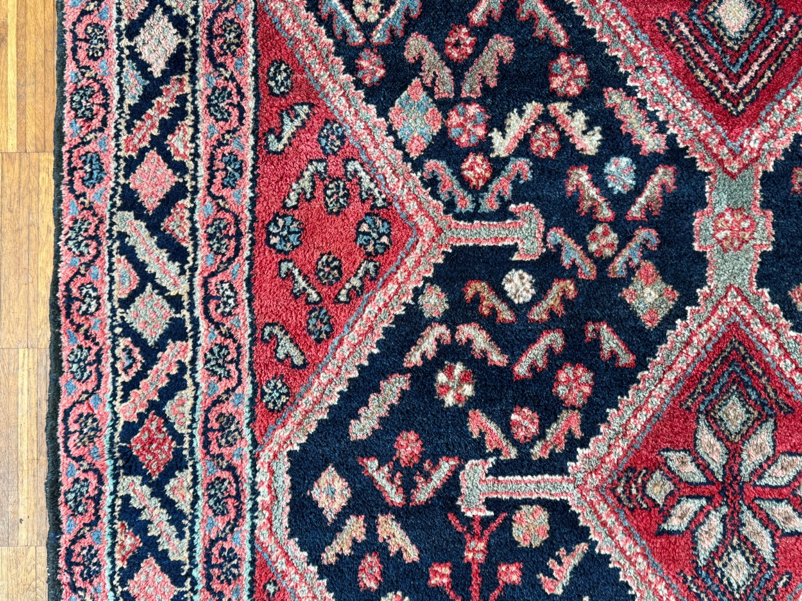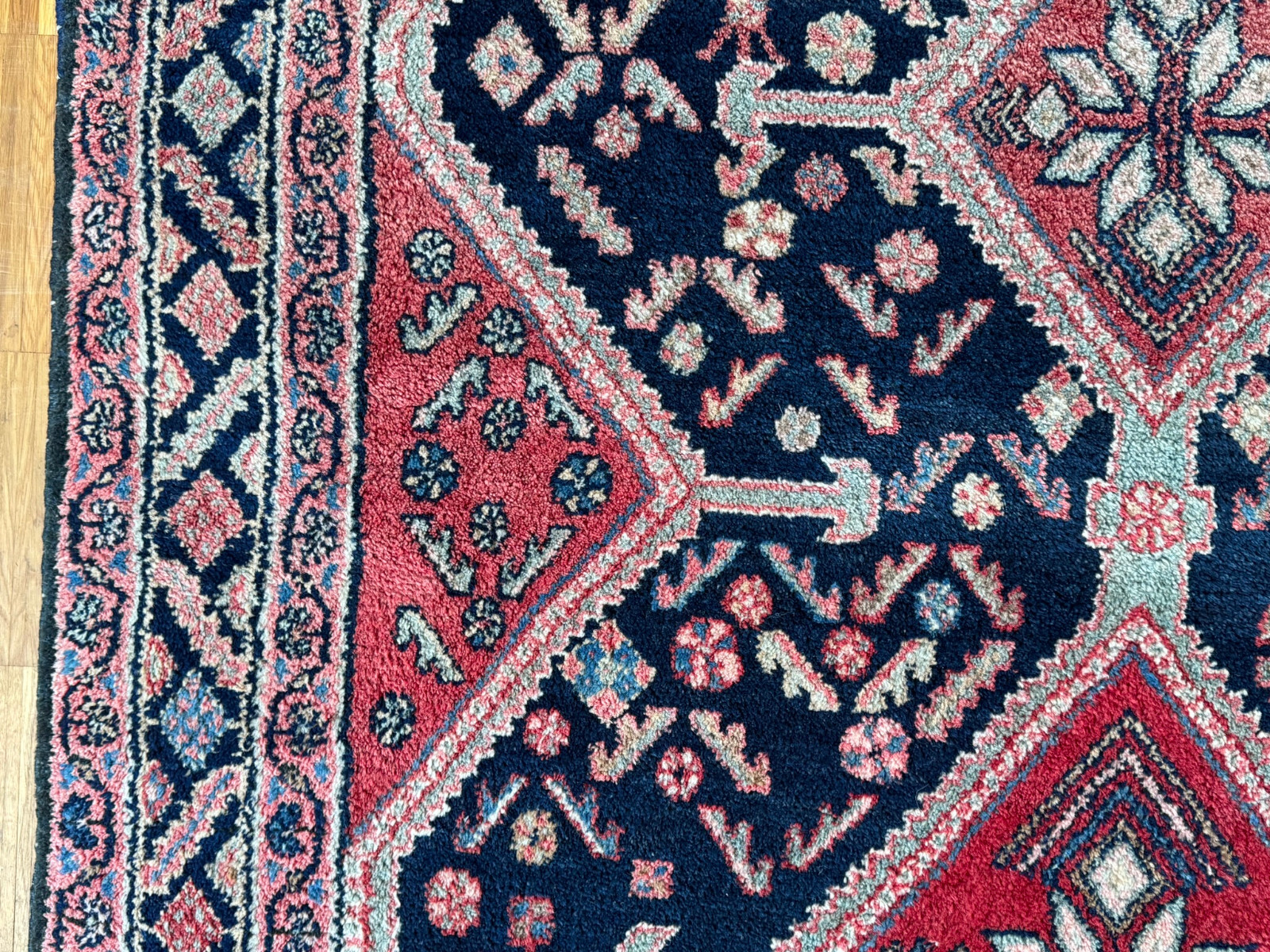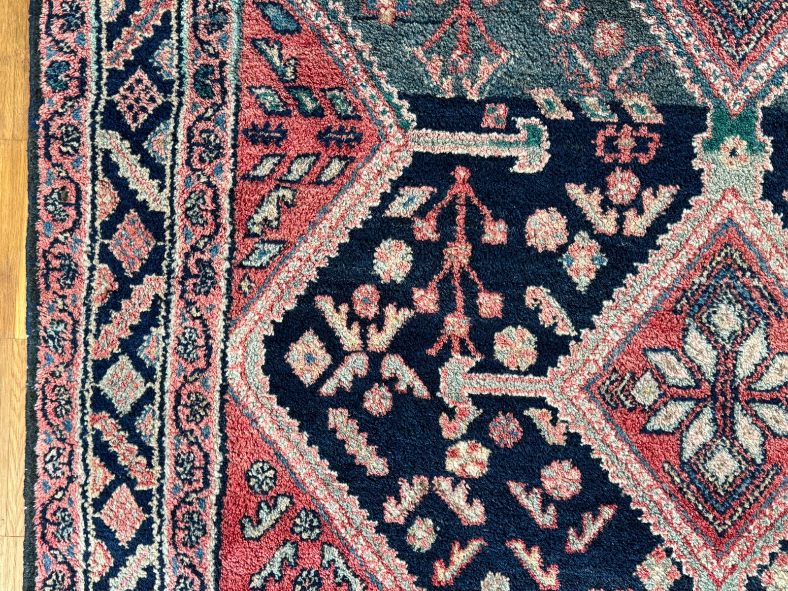 Handgeknüpfter türkischer Teppich aus Wolle. Fransen zum Teil verschlissen und schmutzig, die dunkelblaue Wolle ist an einem Ende heller, hier wurde eine andere Wollfärbung durchgeführt. Ohne Mottenfrass. Abmessungen 270x146cm INKLUSIVE Fransen. Die Teppiche sind nicht gereinigt und riechen weder nach Rauch noch nach Tieren.