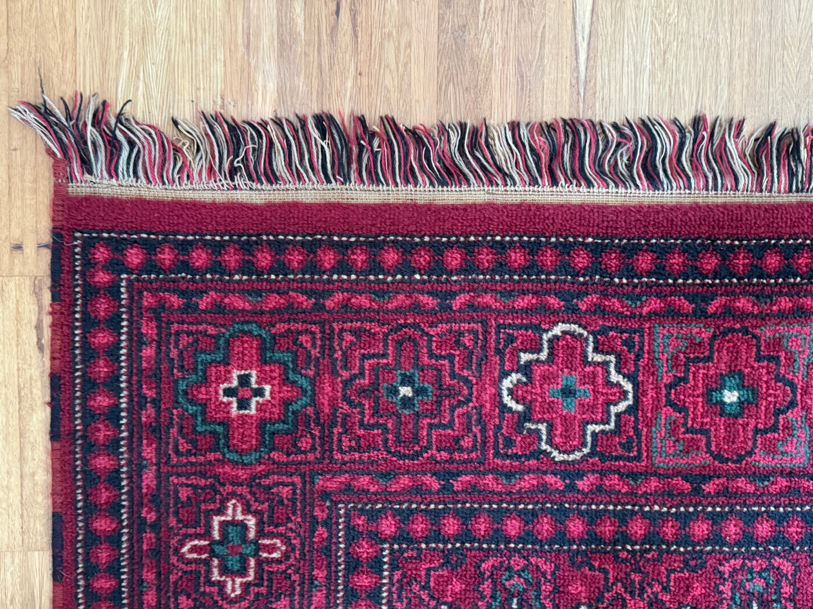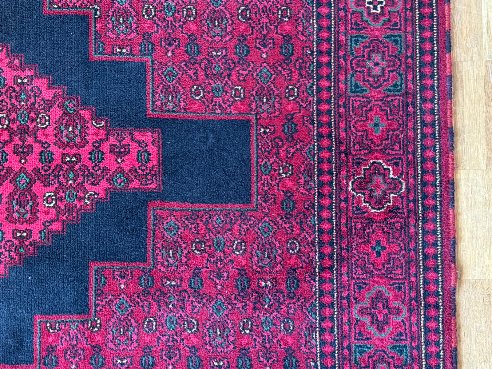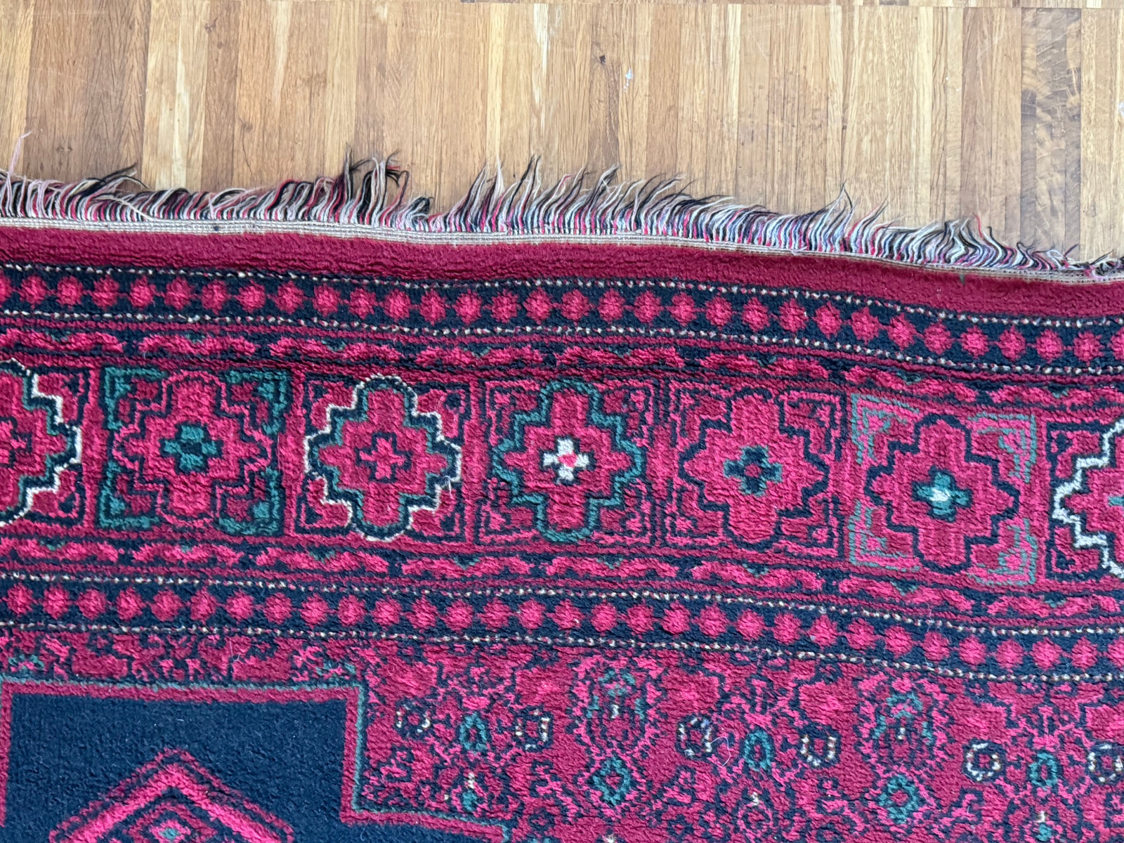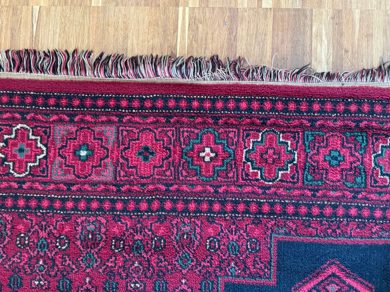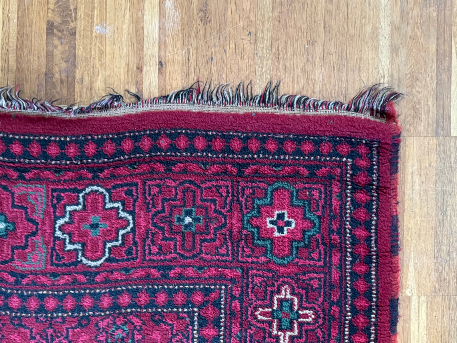 Sehr schöner Teppich aus Wolle, handgeknüpft mit turmenischen Mustern. Fransen leicht verschlissen, und der Fransenrand leicht lose, am oberen Rand Fransen leicht verkürzt. Ohne Flecken oder Mottenfrass. Abmessungen 300xx201cm INKLUSIVE FRANSEN. Die Teppiche sind nicht gewaschen, riechen weder nach Rauch noch nach Tieren.