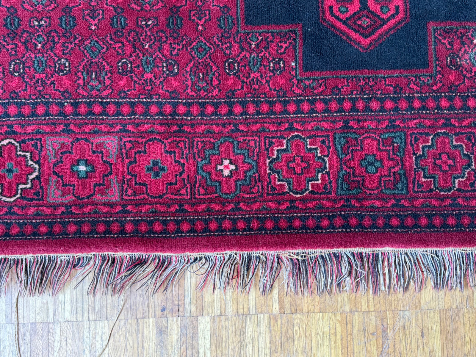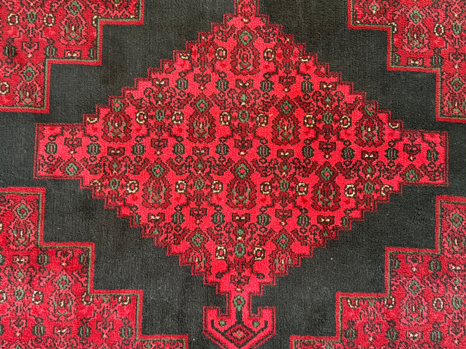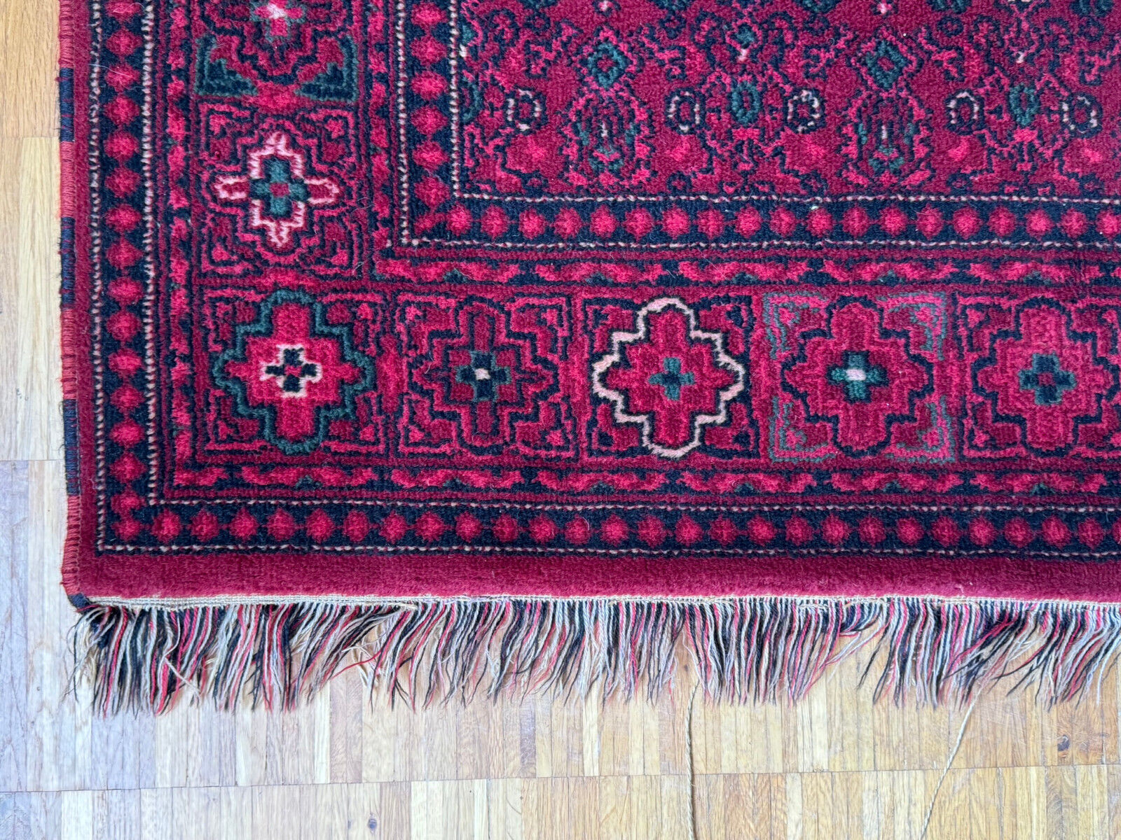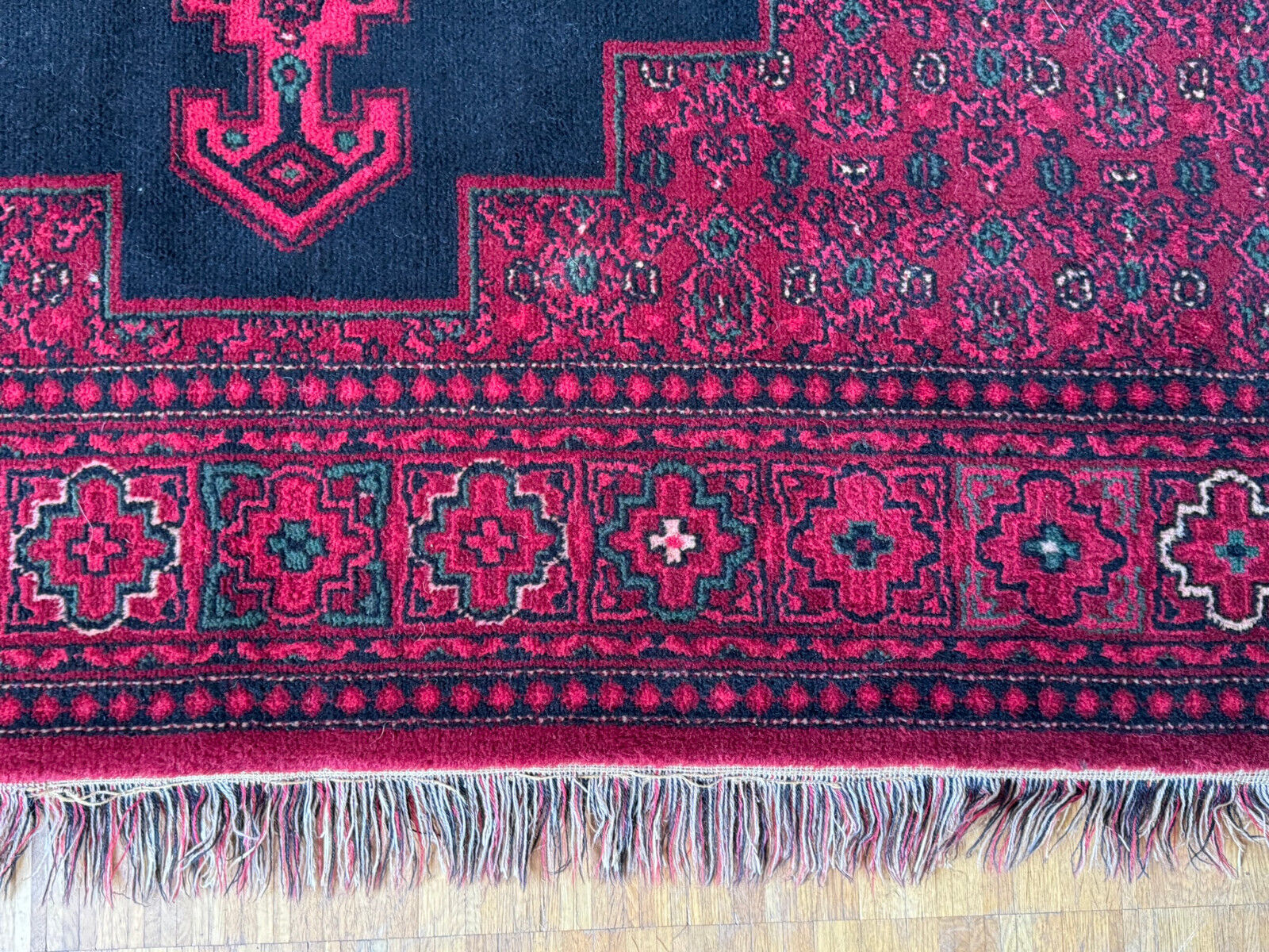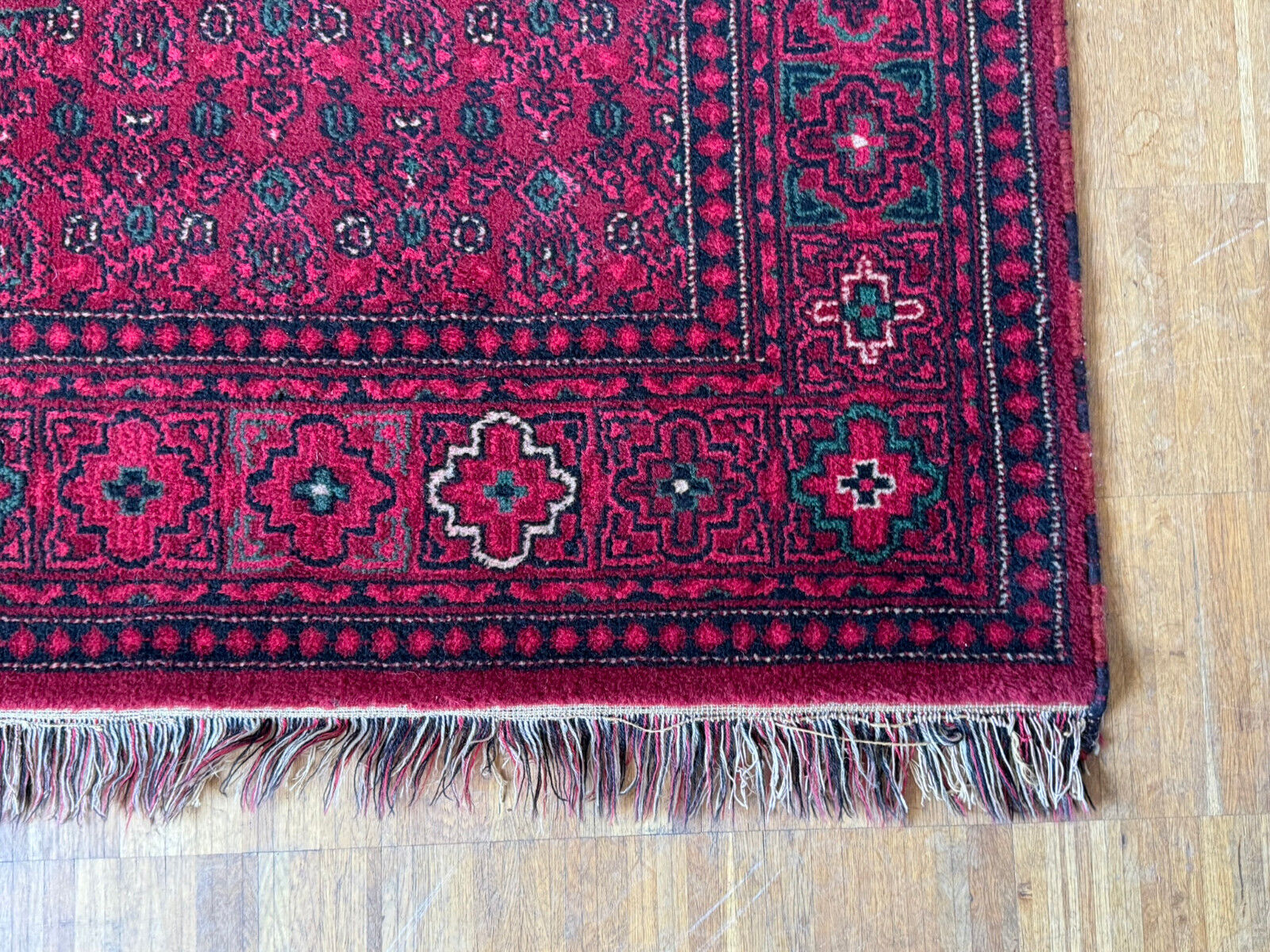 Sehr schöner Teppich aus Wolle, handgeknüpft mit turmenischen Mustern. Fransen leicht verschlissen, und der Fransenrand leicht lose, am oberen Rand Fransen leicht verkürzt. Ohne Flecken oder Mottenfrass. Abmessungen 300xx201cm INKLUSIVE FRANSEN. Die Teppiche sind nicht gewaschen, riechen weder nach Rauch noch nach Tieren.
