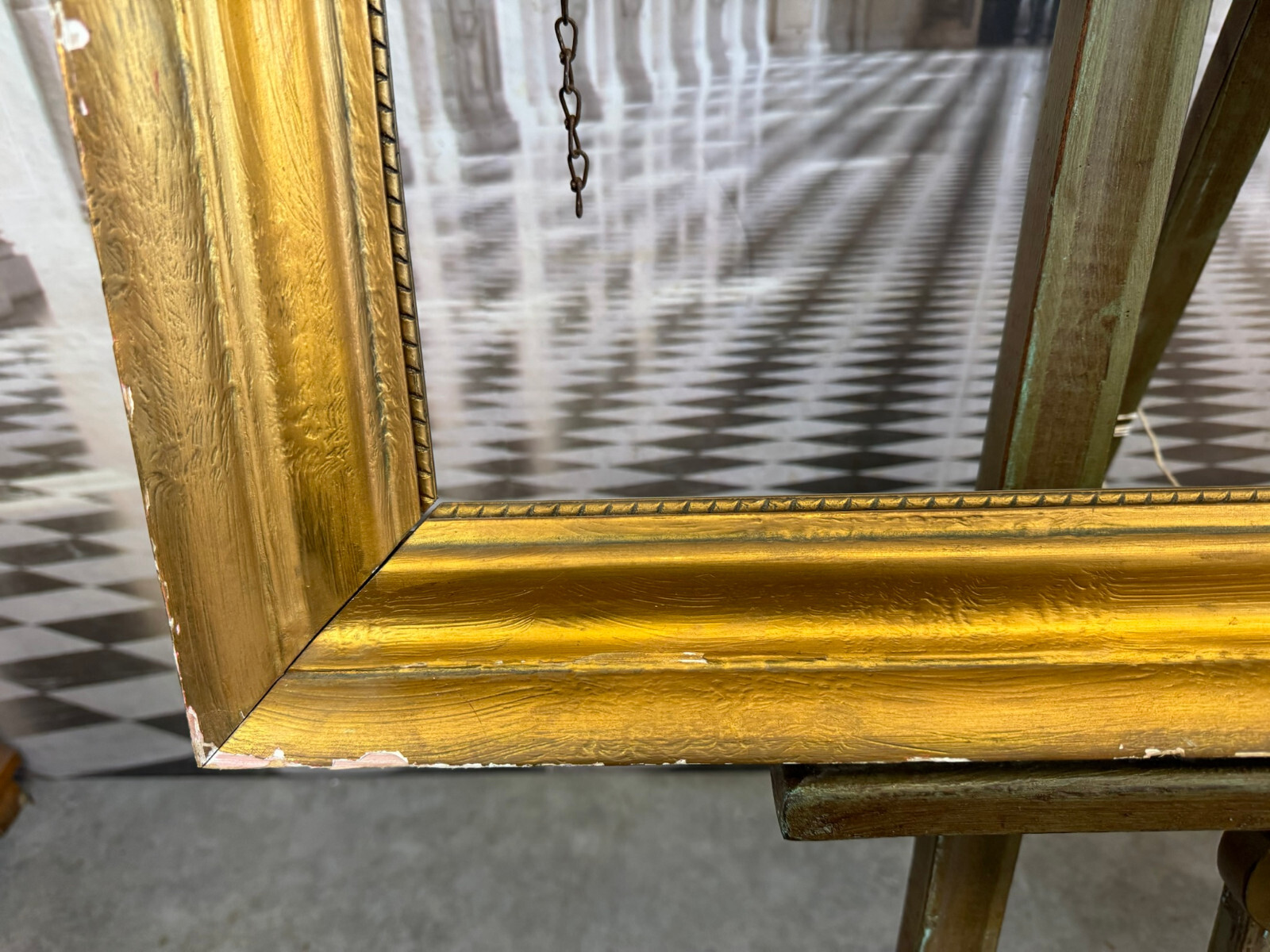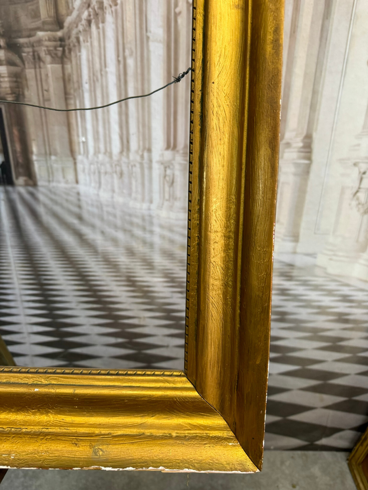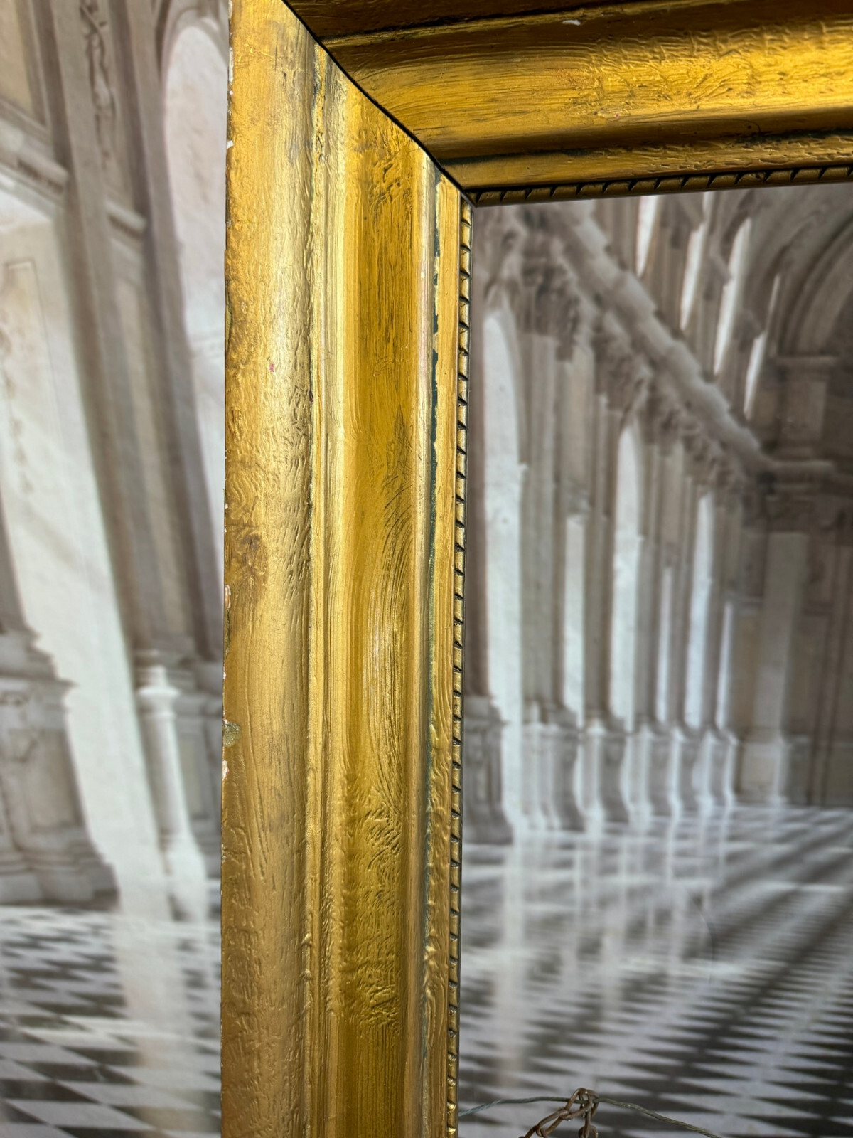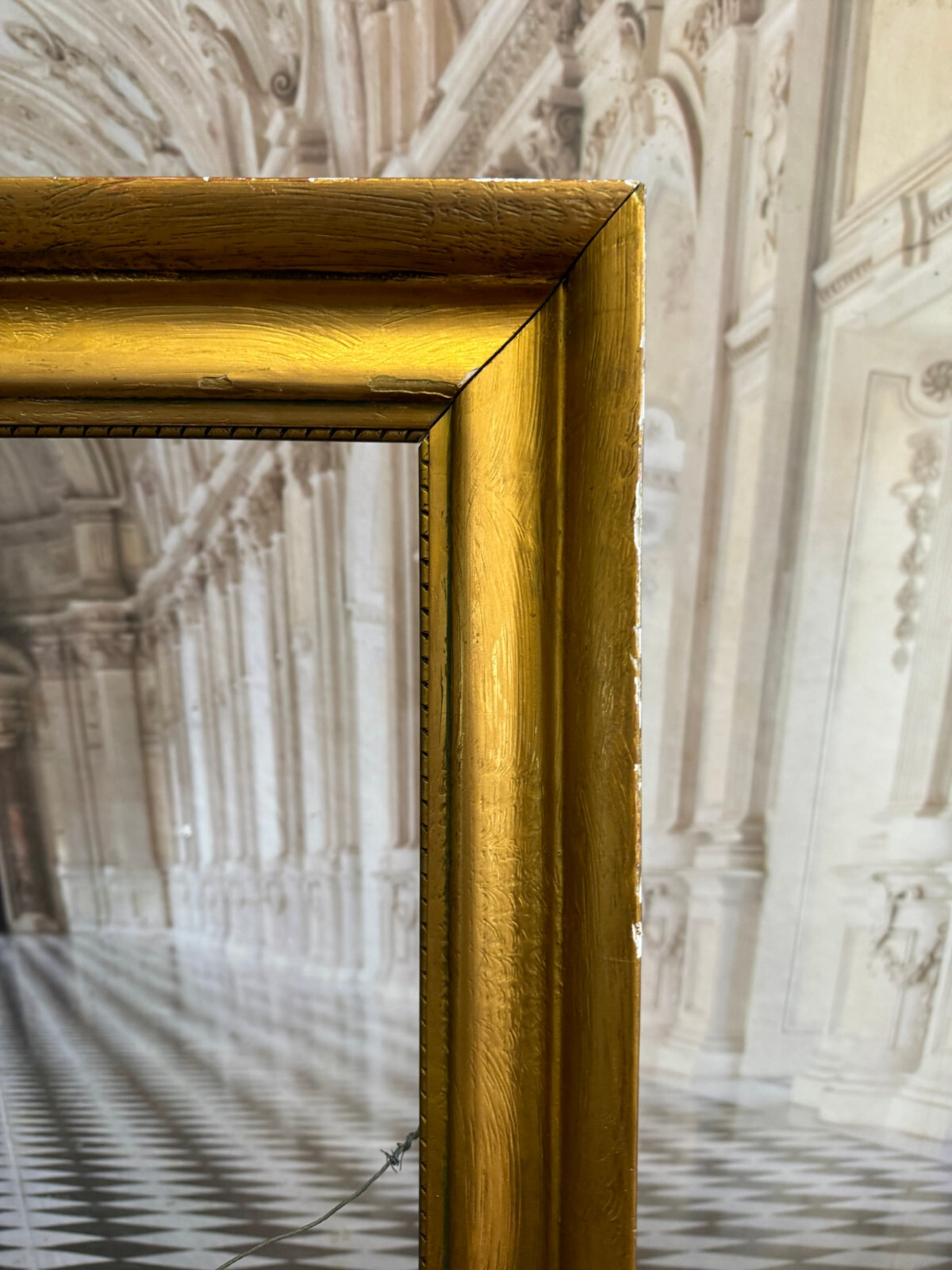 Alter klassizistischer Bilderrahmen aus Holz mit feinem Gipsaufbau, gold gefasst um 1950. Oberfläche mit Abrieb, Bestossungen und diversen Unvollständigkeiten, wurde auch übermalt. Instabiler Zustand, müsste erneut befestigt werden. Abmessungen 72x103cm, Falzmass 60,8x91cm, Falzbreite/-tiefe 1,5/1,5cm.