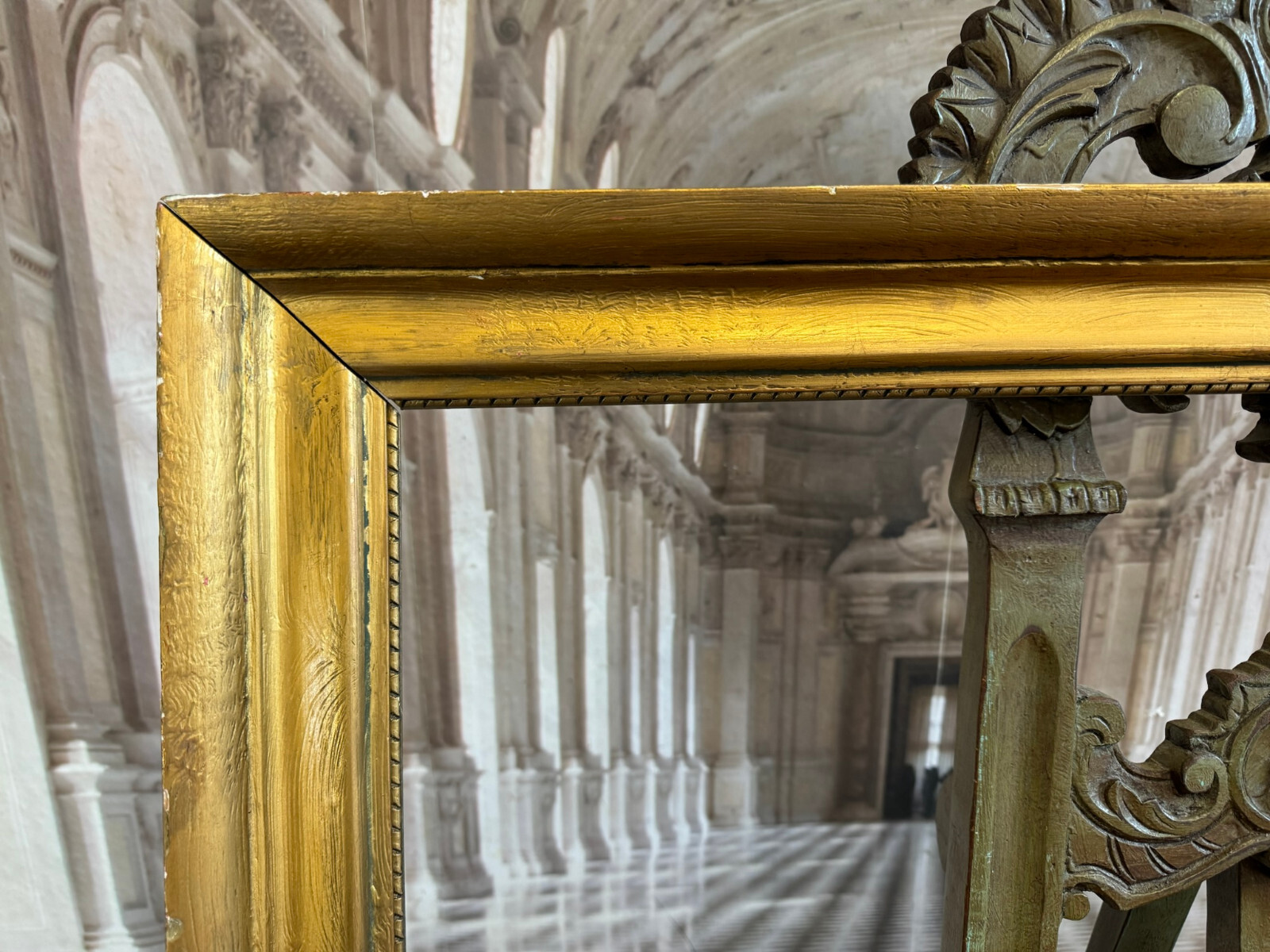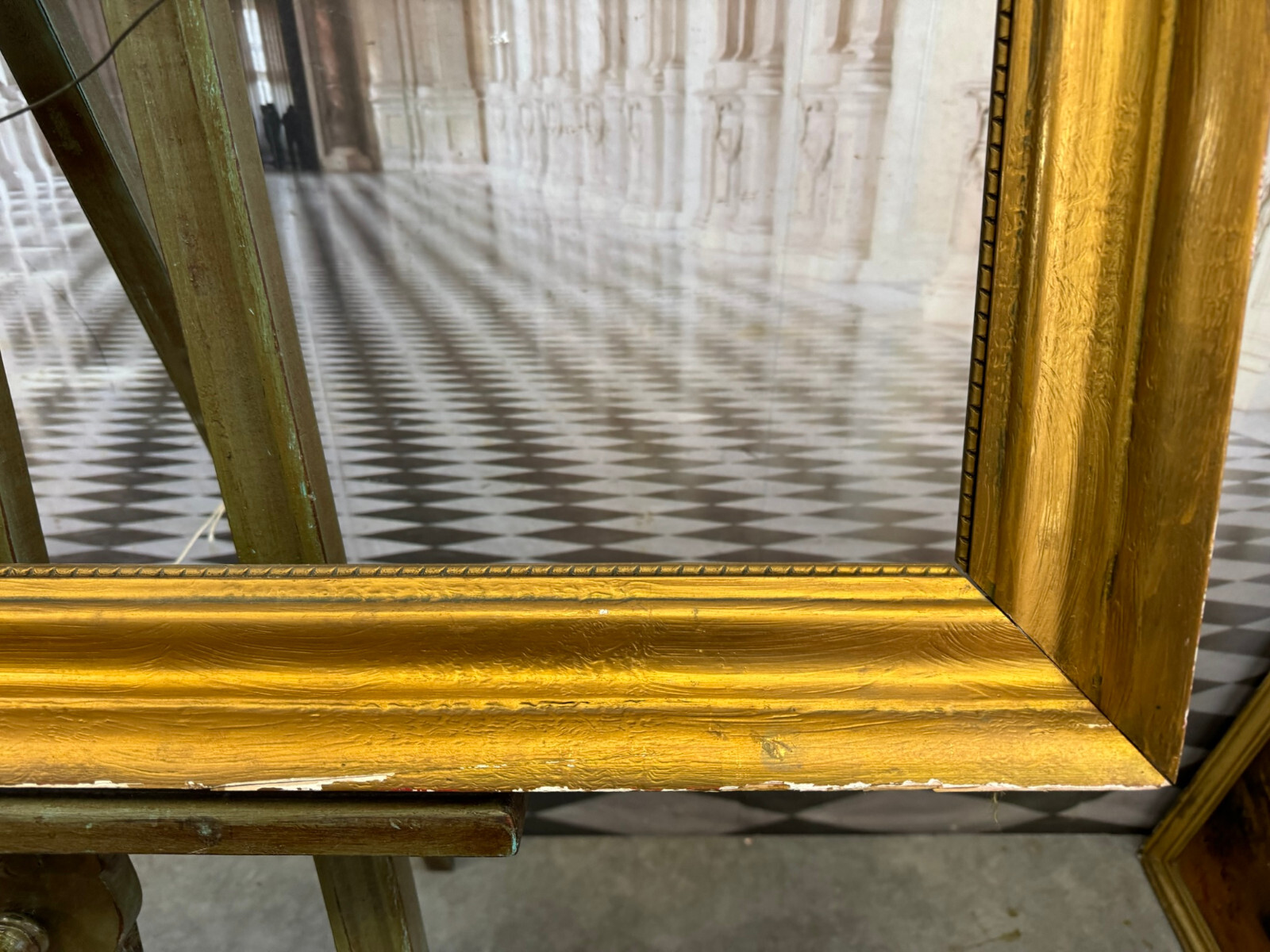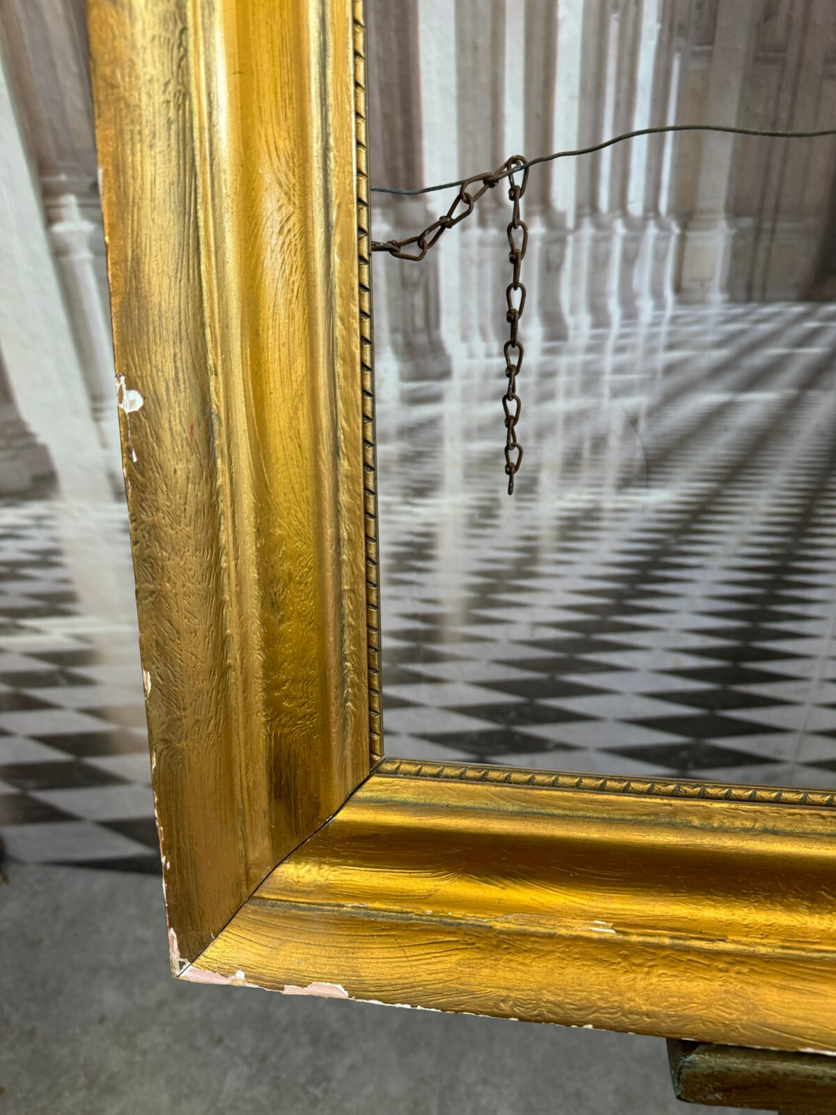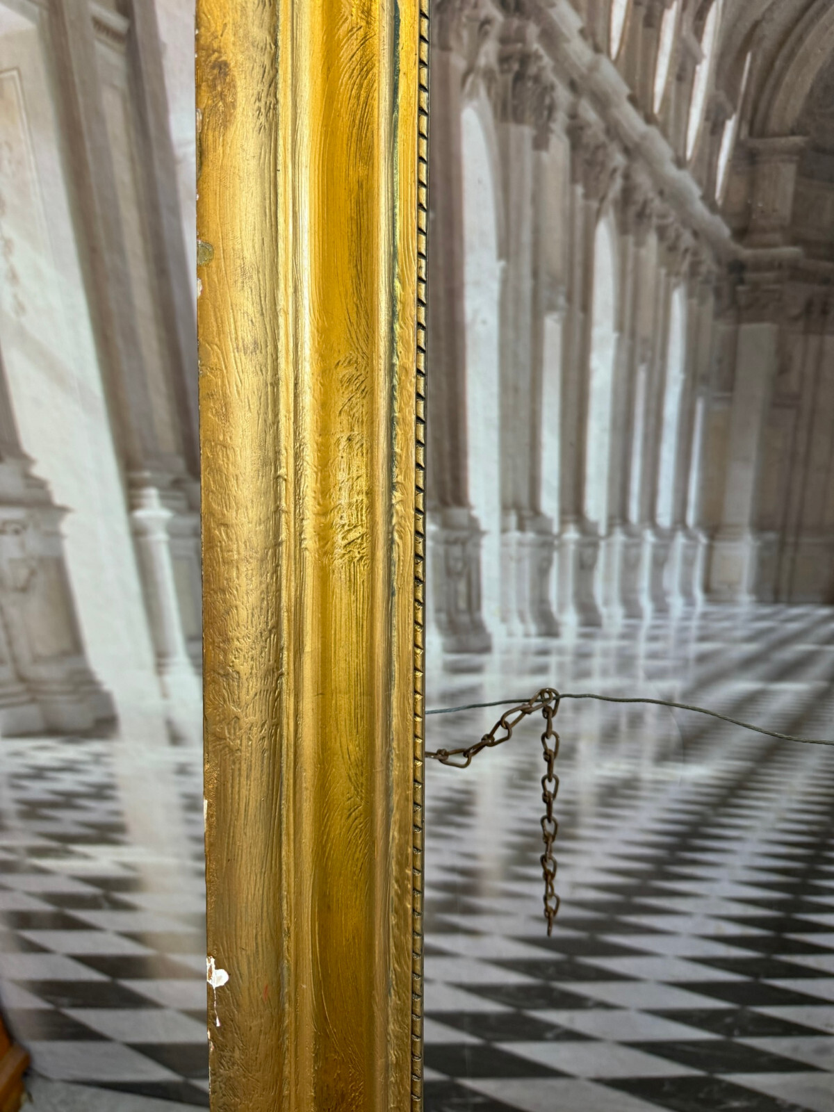 Alter klassizistischer Bilderrahmen aus Holz mit feinem Gipsaufbau, gold gefasst um 1950. Oberfläche mit Abrieb, Bestossungen und diversen Unvollständigkeiten, wurde auch übermalt. Instabiler Zustand, müsste erneut befestigt werden. Abmessungen 72x103cm, Falzmass 60,8x91cm, Falzbreite/-tiefe 1,5/1,5cm.
