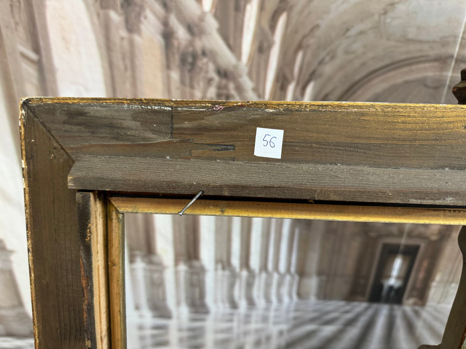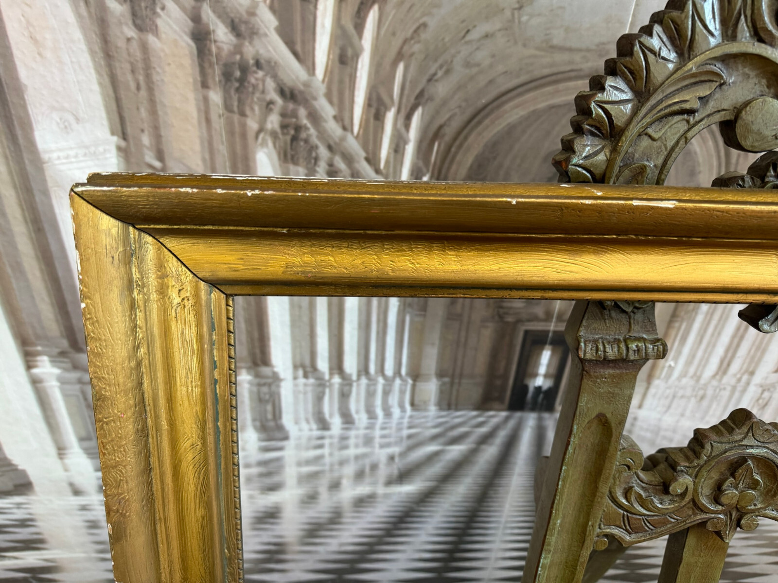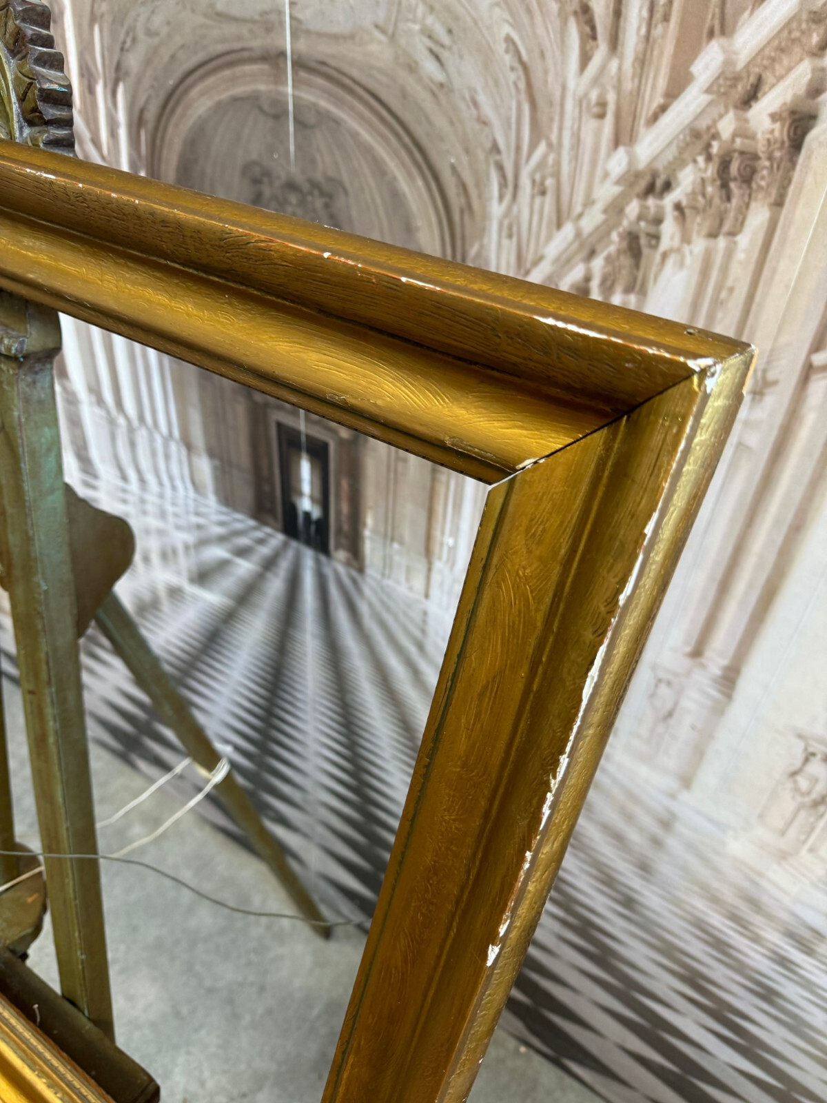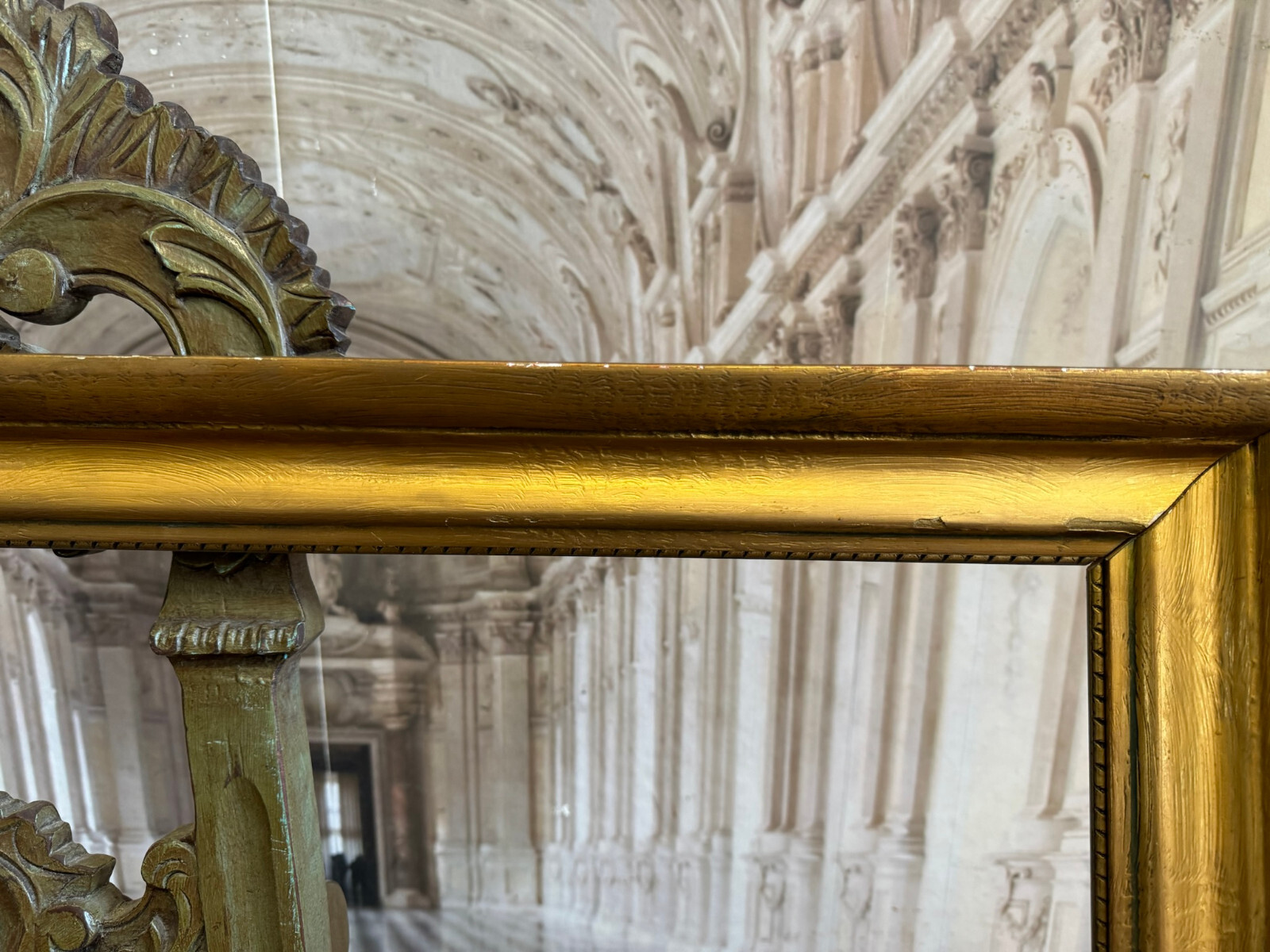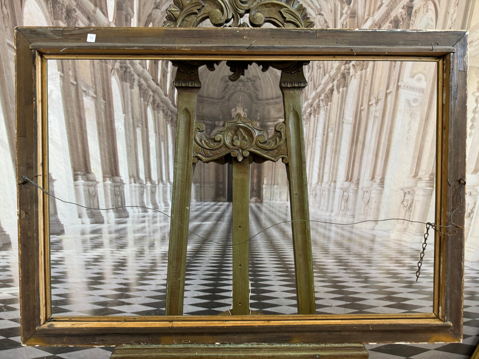 Alter klassizistischer Bilderrahmen aus Holz mit feinem Gipsaufbau, gold gefasst um 1950. Oberfläche mit Abrieb, Bestossungen und diversen Unvollständigkeiten, wurde auch übermalt. Instabiler Zustand, müsste erneut befestigt werden. Abmessungen 72x103cm, Falzmass 60,8x91cm, Falzbreite/-tiefe 1,5/1,5cm.