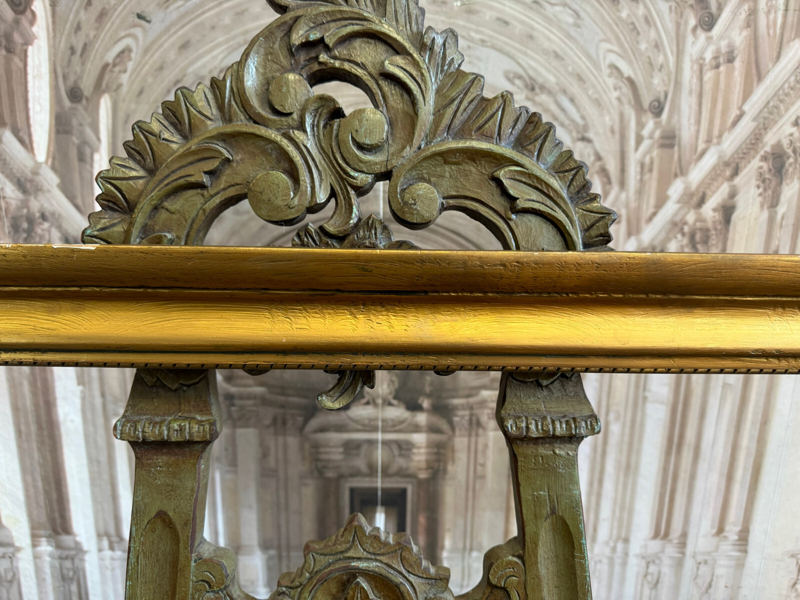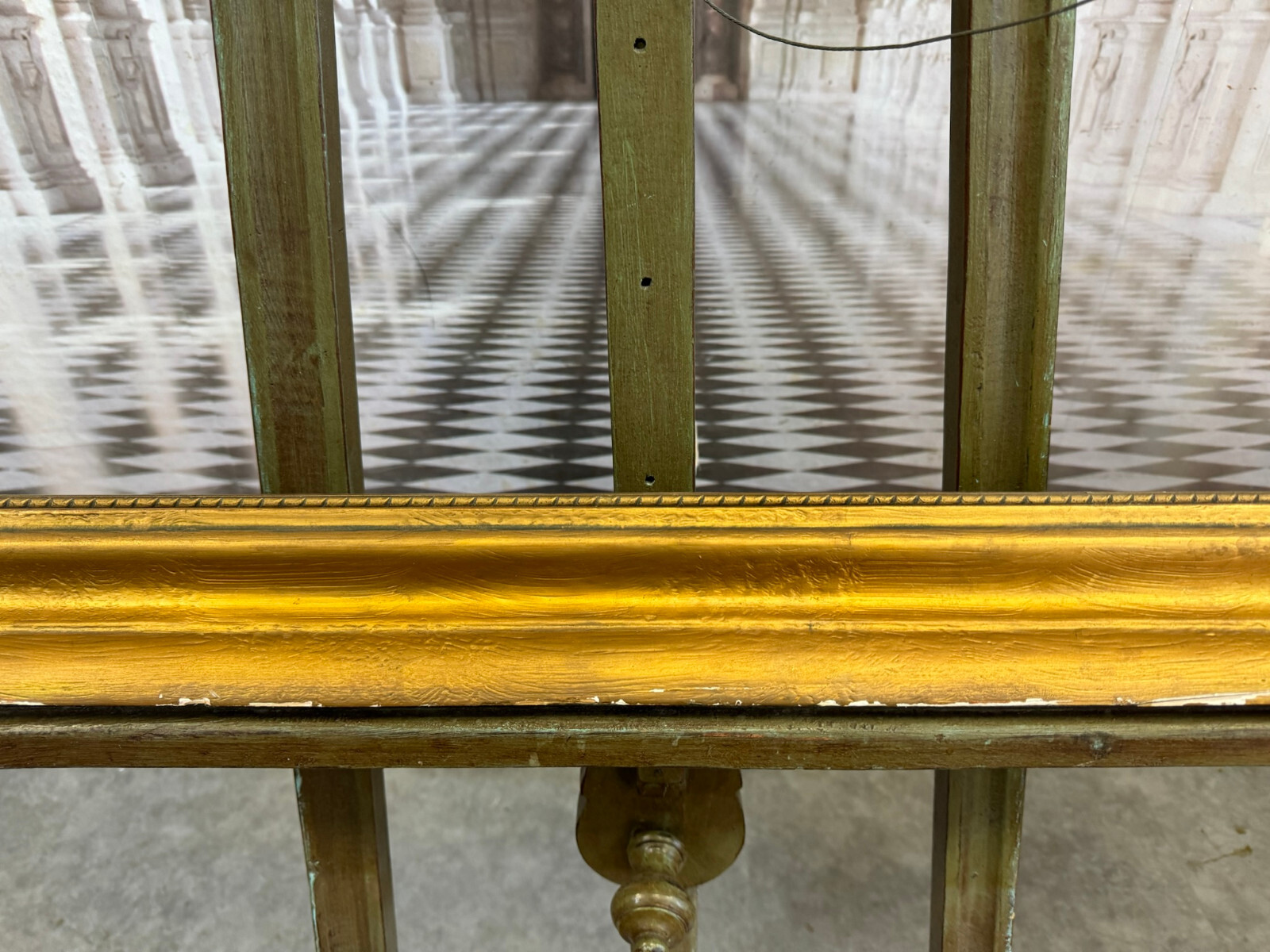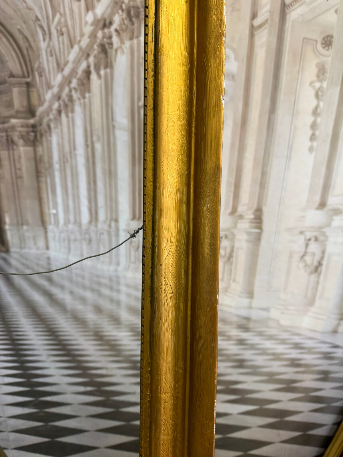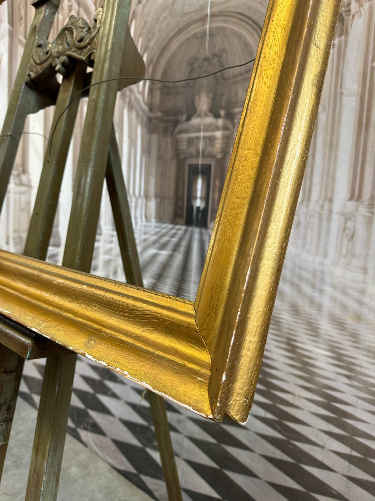 Alter klassizistischer Bilderrahmen aus Holz mit feinem Gipsaufbau, gold gefasst um 1950. Oberfläche mit Abrieb, Bestossungen und diversen Unvollständigkeiten, wurde auch übermalt. Instabiler Zustand, müsste erneut befestigt werden. Abmessungen 72x103cm, Falzmass 60,8x91cm, Falzbreite/-tiefe 1,5/1,5cm.