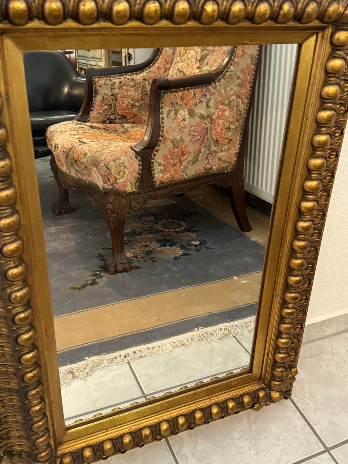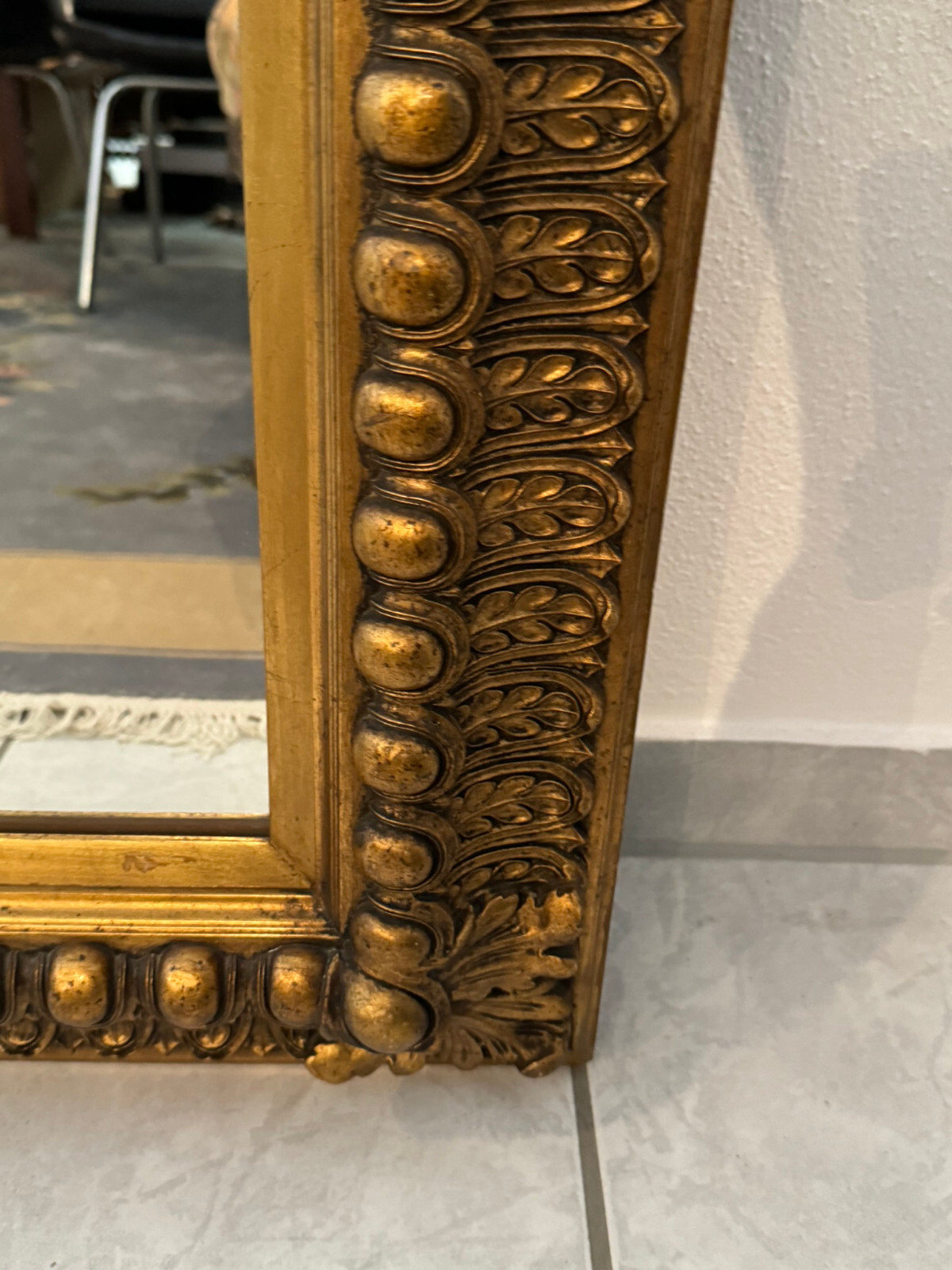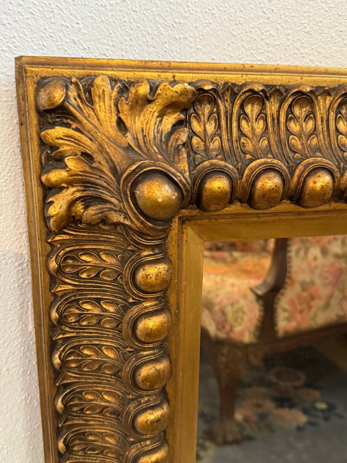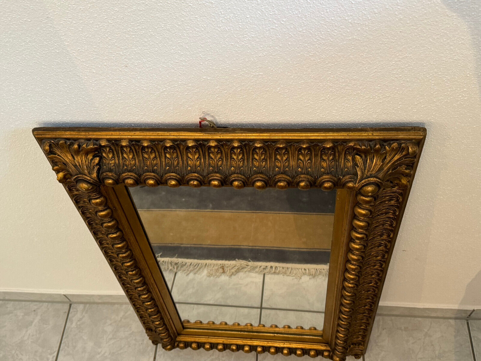 Spiegel mit massivem Holzrahmen und schönen Dekorleisten um 1950. Die Oberfläche ist teils berieben, bestoßen und an im Randbereich leicht unvollständig HxB: 90x65cm.