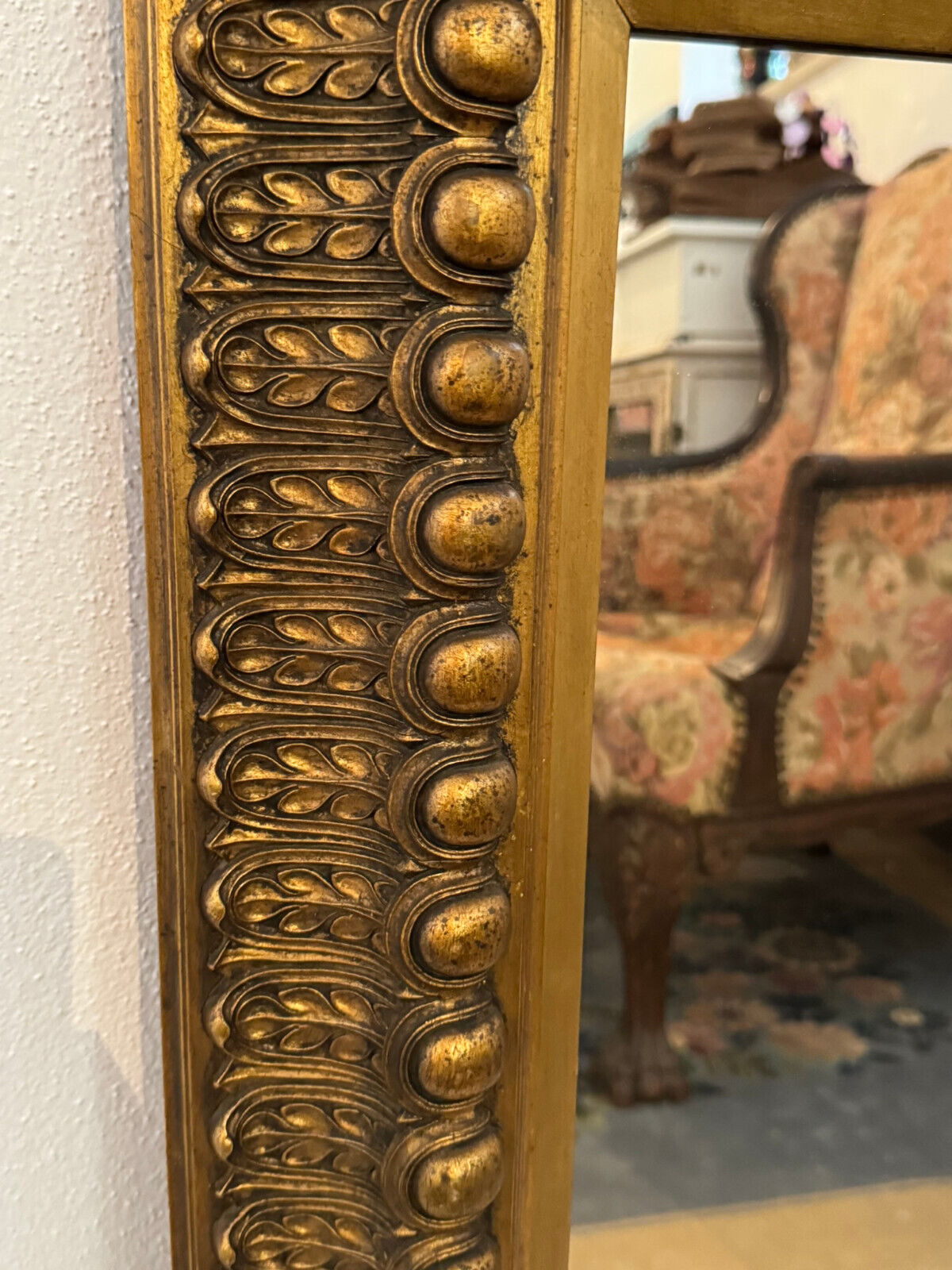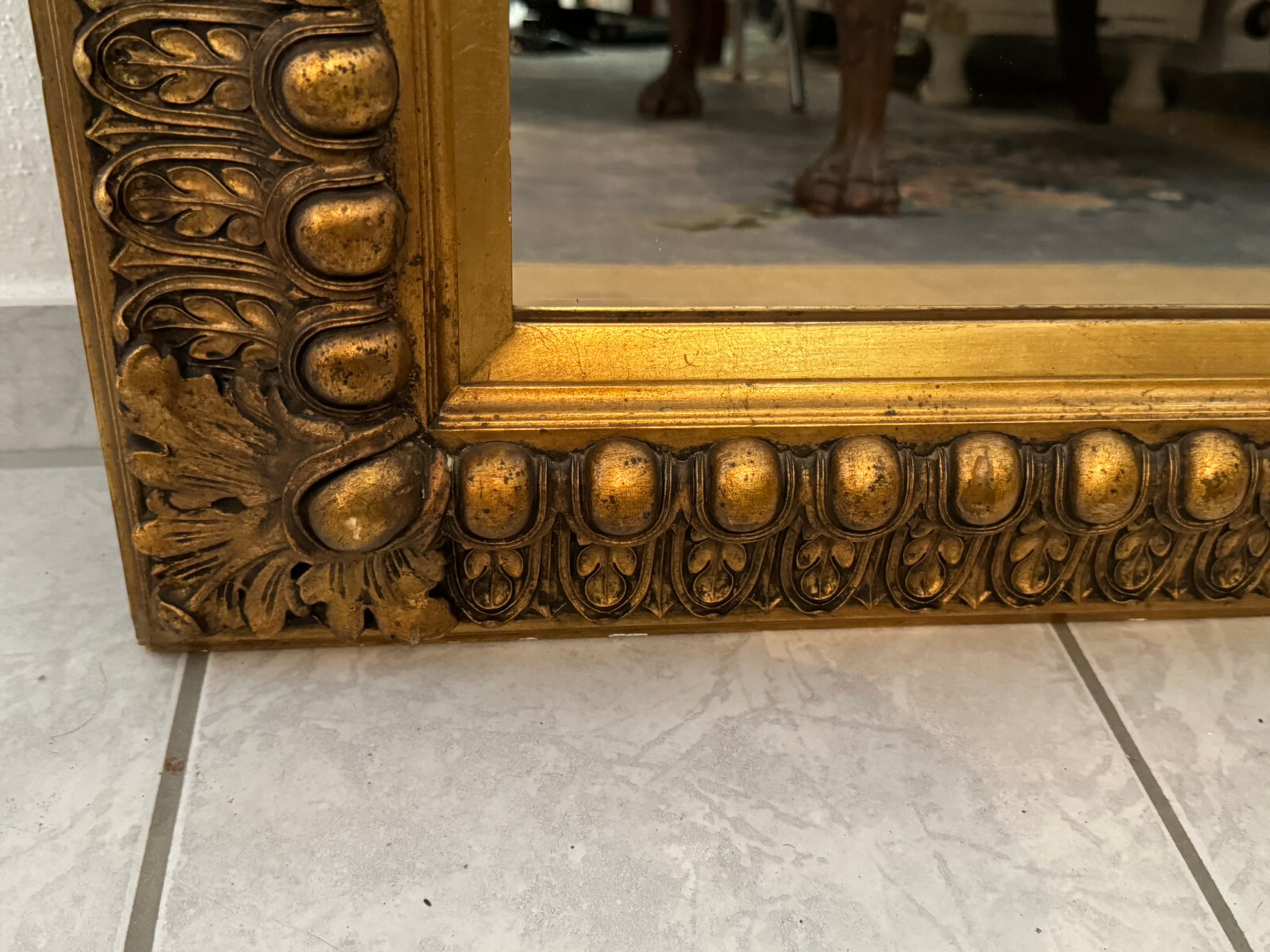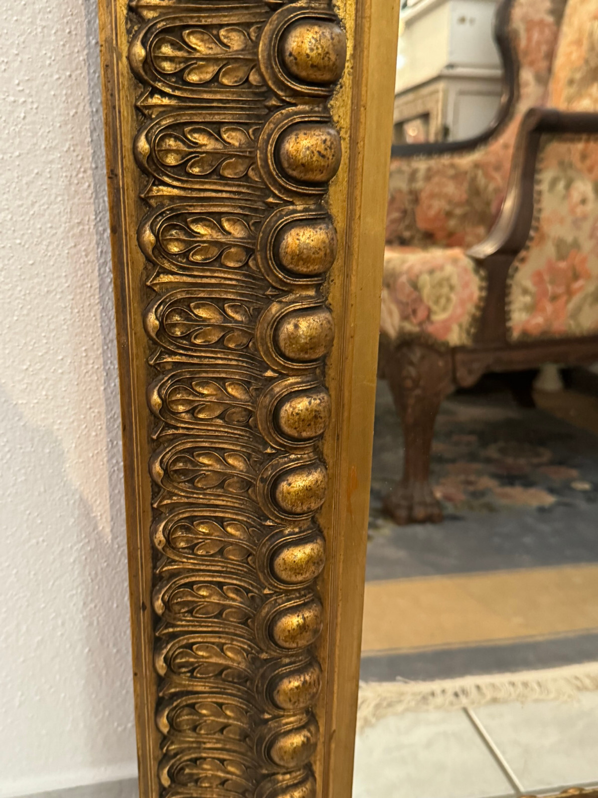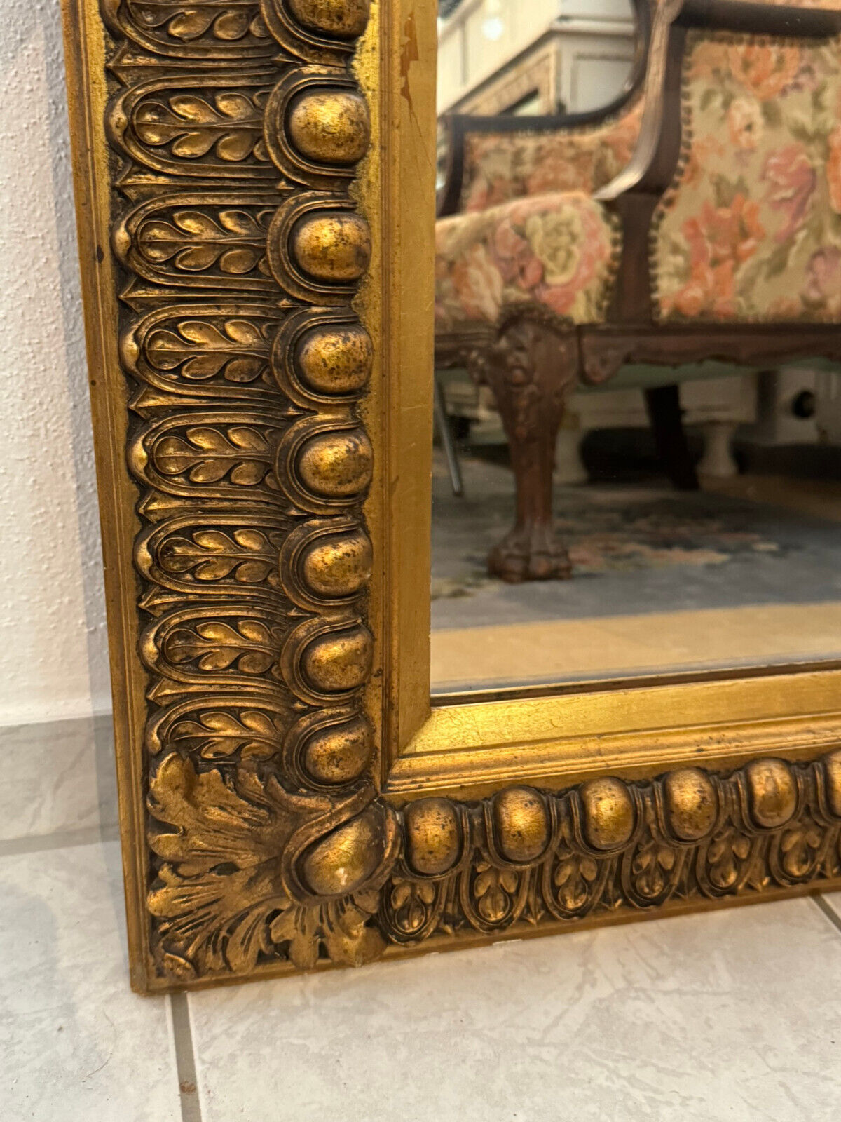 Spiegel mit massivem Holzrahmen und schönen Dekorleisten um 1950. Die Oberfläche ist teils berieben, bestoßen und an im Randbereich leicht unvollständig HxB: 90x65cm.