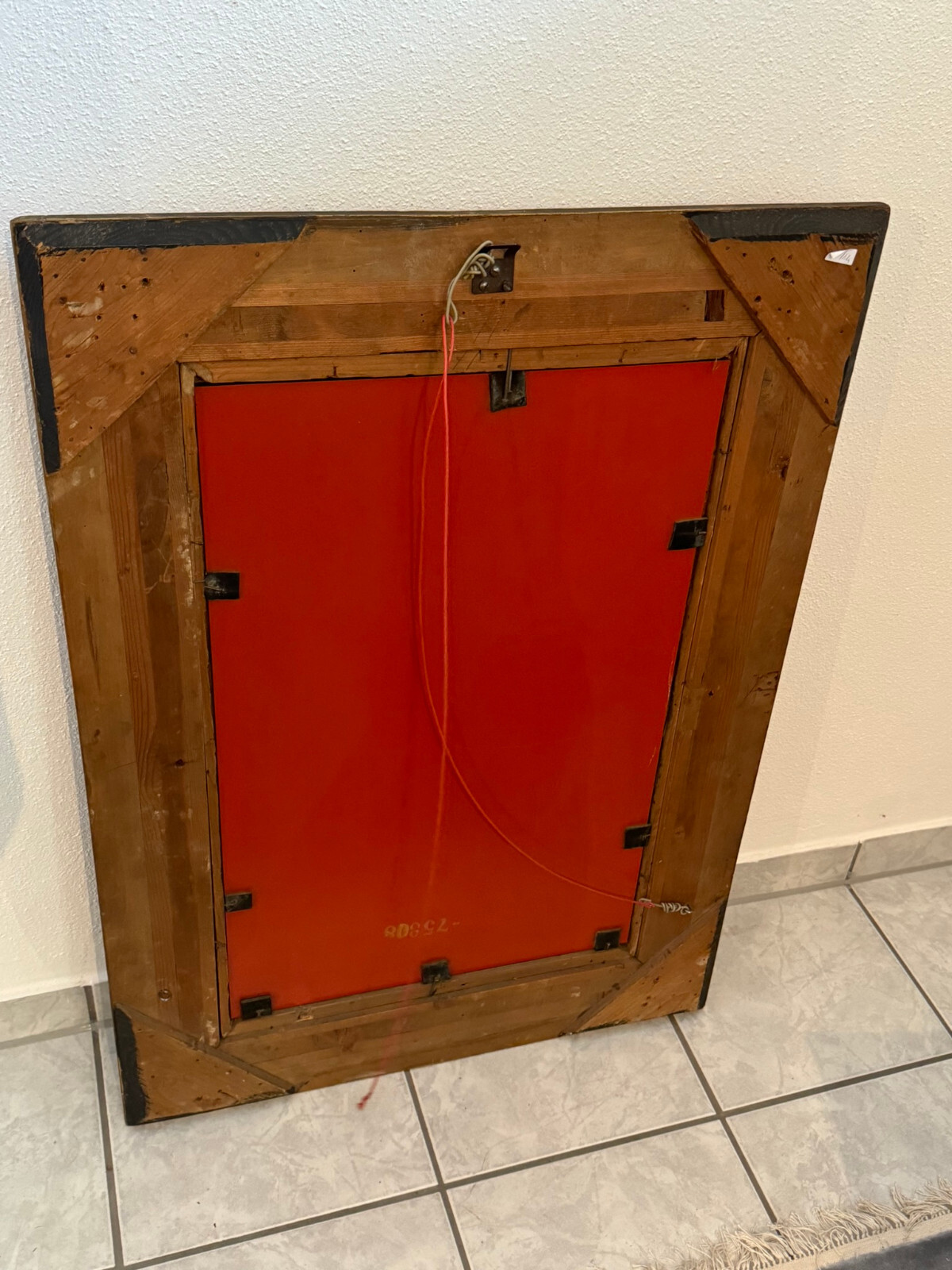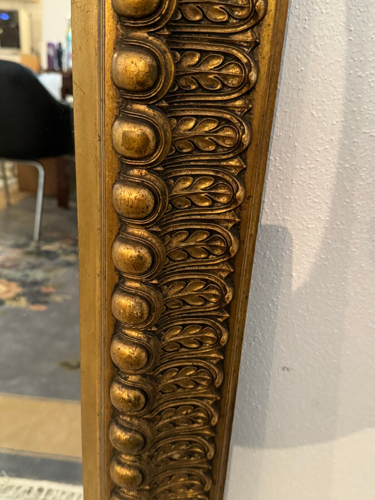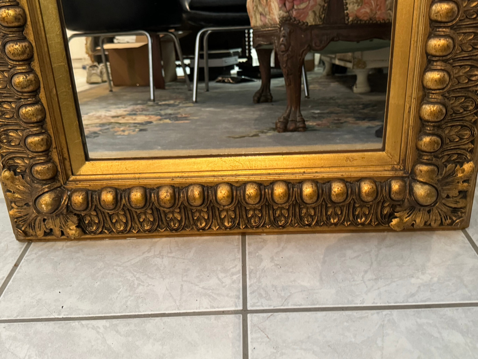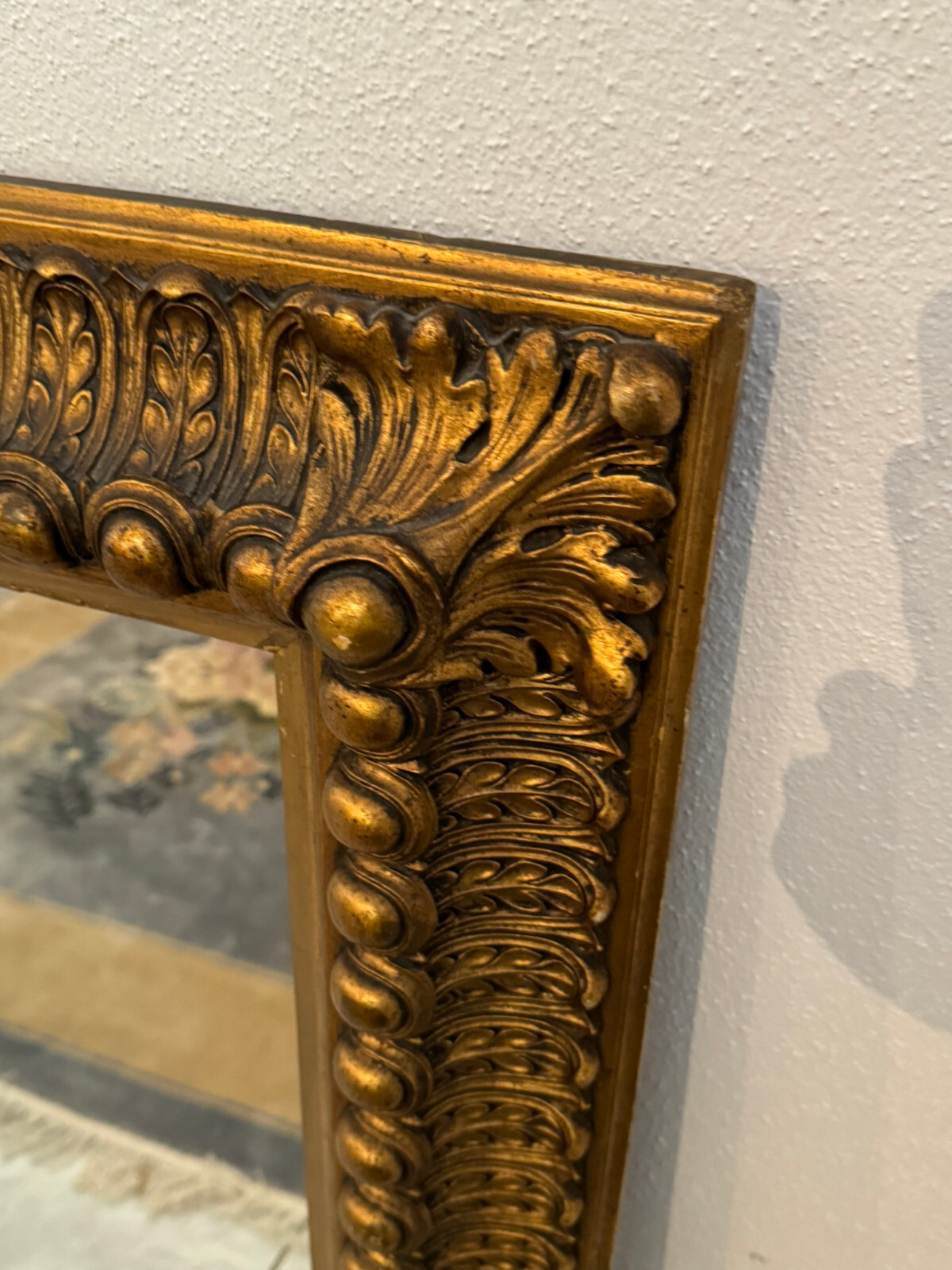 Spiegel mit massivem Holzrahmen und schönen Dekorleisten um 1950. Die Oberfläche ist teils berieben, bestoßen und an im Randbereich leicht unvollständig HxB: 90x65cm.