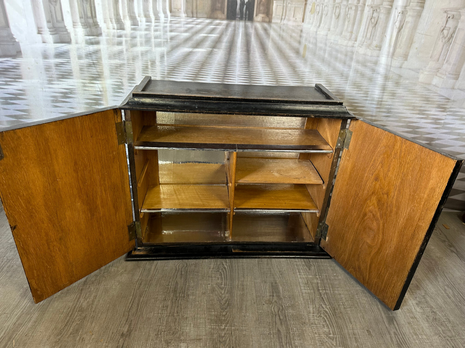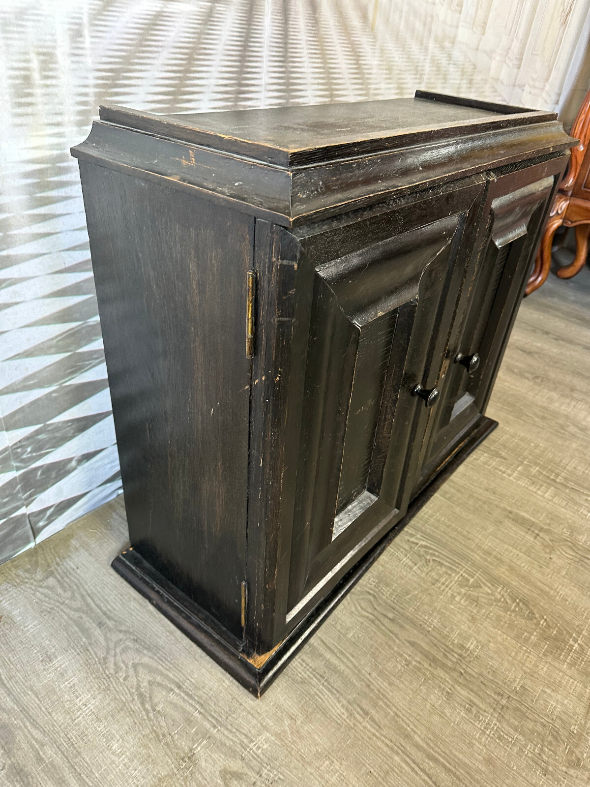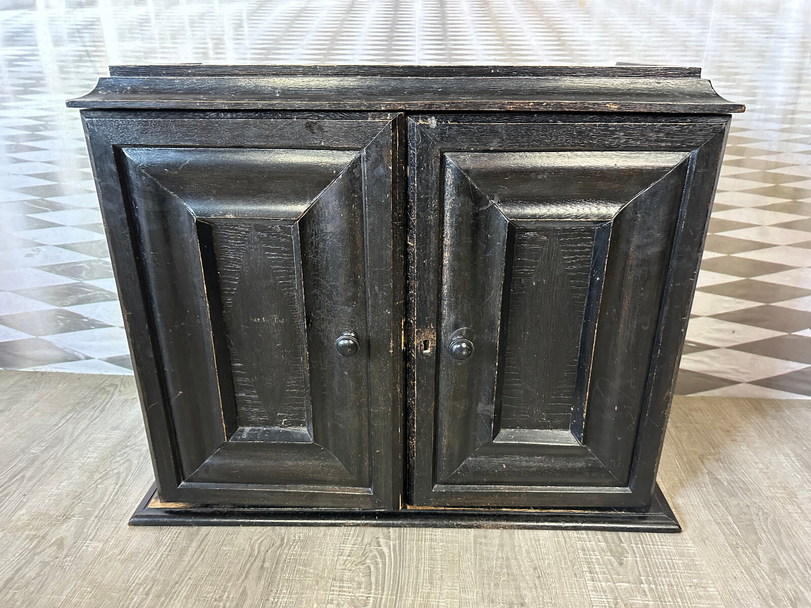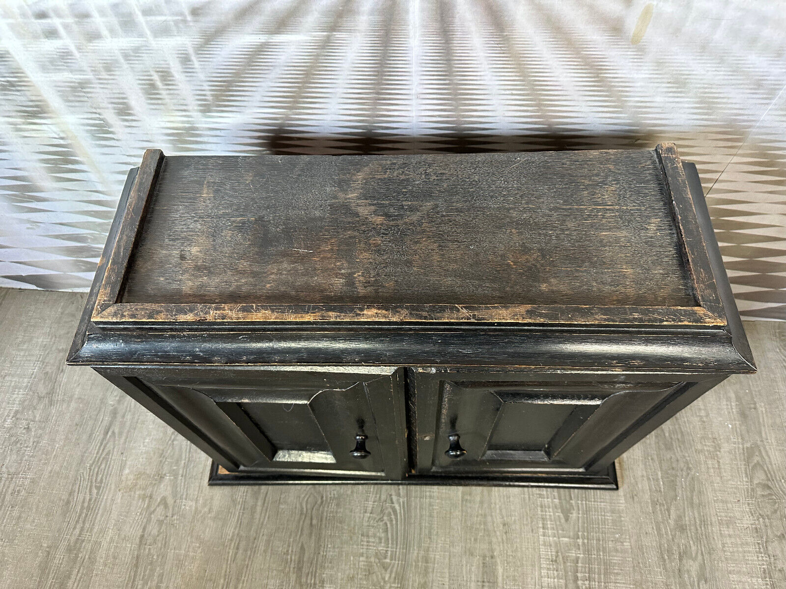 Altes Schränkchen aus massivem Holz, schwarz gefasst und im Inneren mit Alufolie beklebt. Ein Ablagebrett und der Schlüssel fehlend. Oberfläche leicht berieben. Abmessungen BTH 87/31/70cm.
