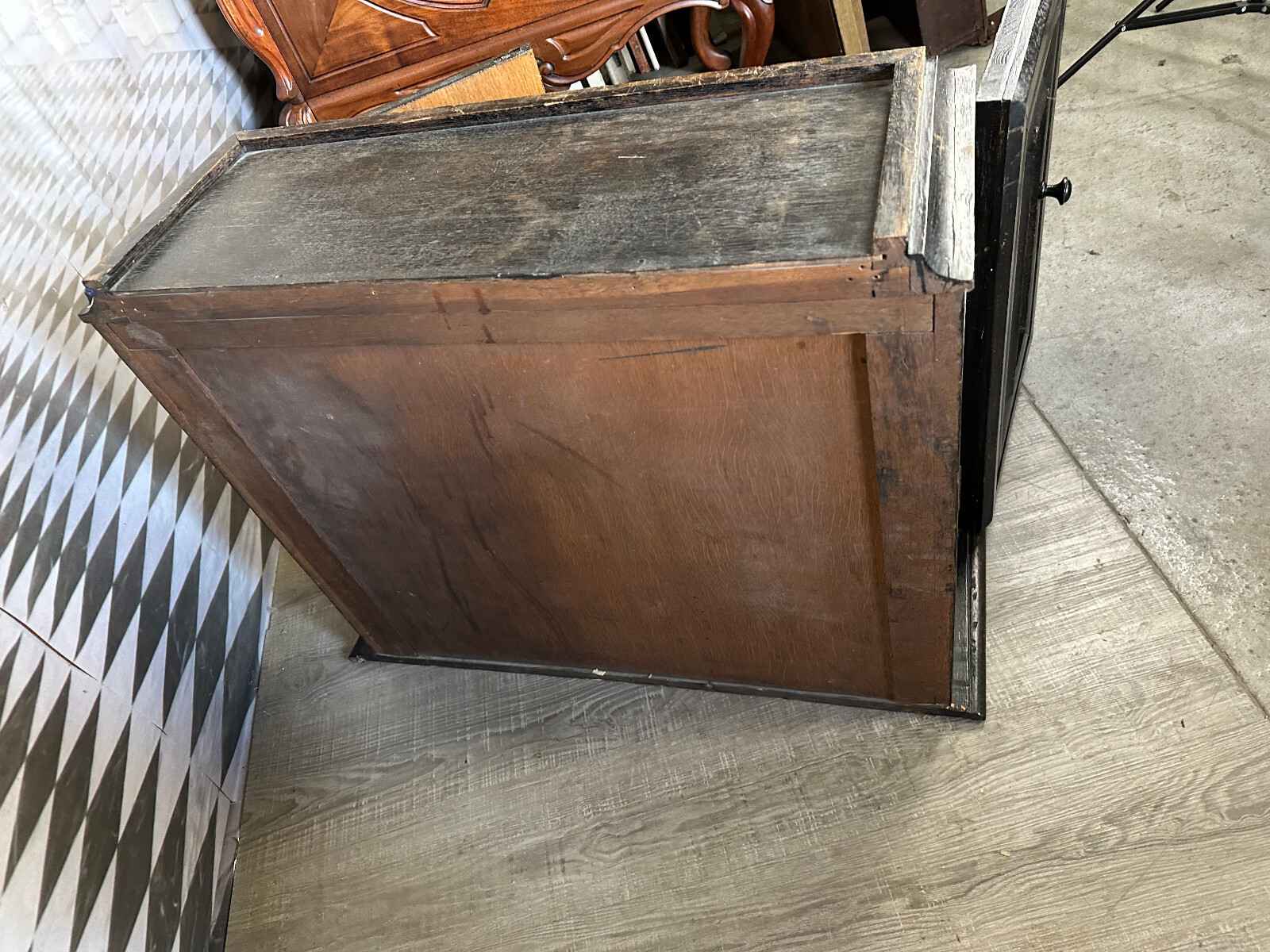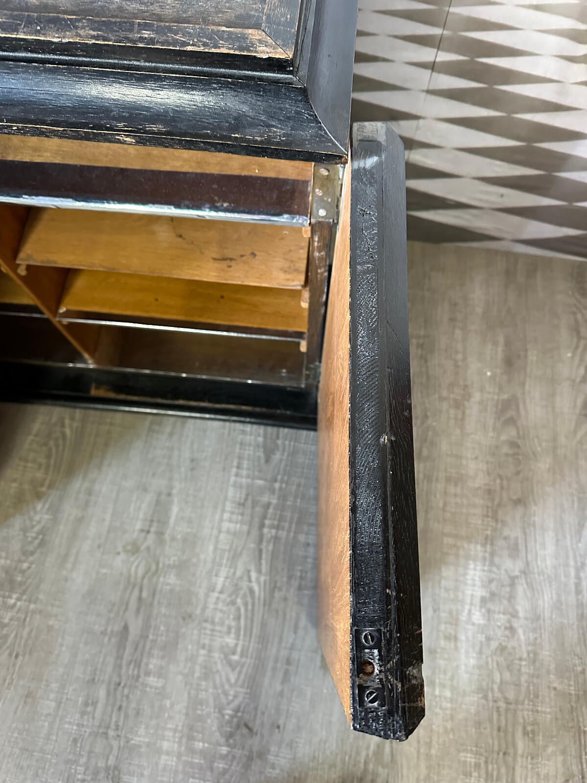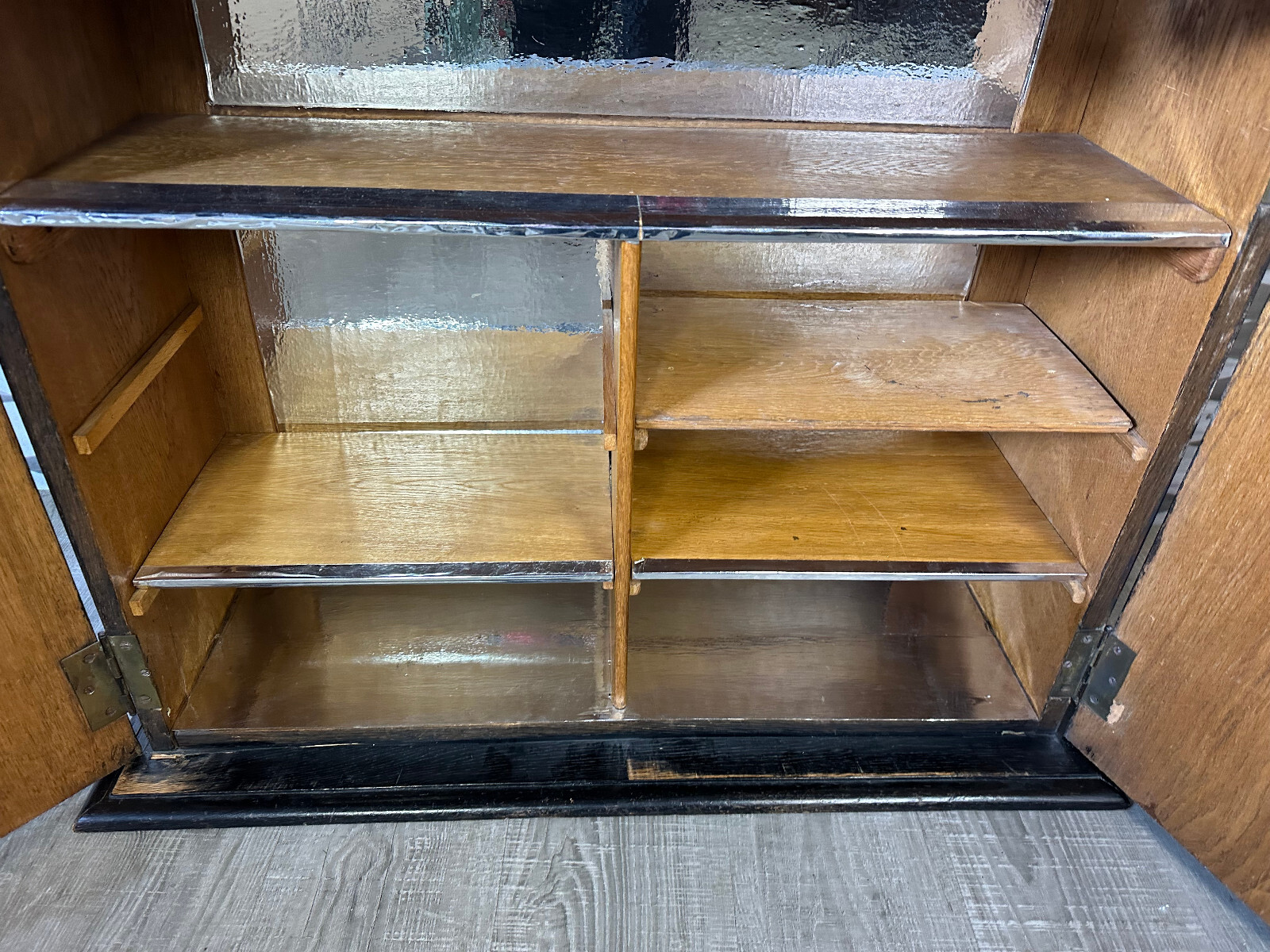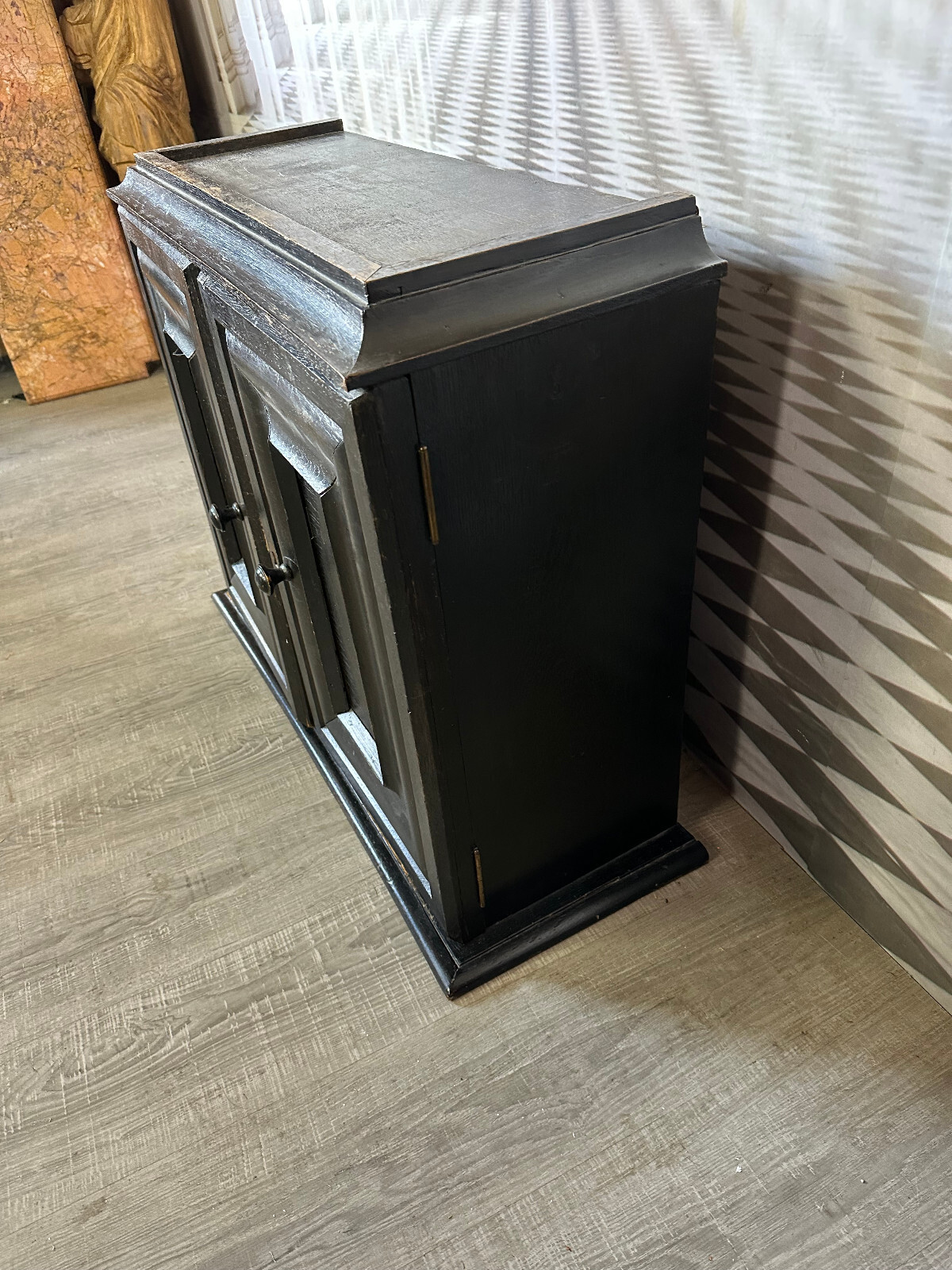 Altes Schränkchen aus massivem Holz, schwarz gefasst und im Inneren mit Alufolie beklebt. Ein Ablagebrett und der Schlüssel fehlend. Oberfläche leicht berieben. Abmessungen BTH 87/31/70cm.