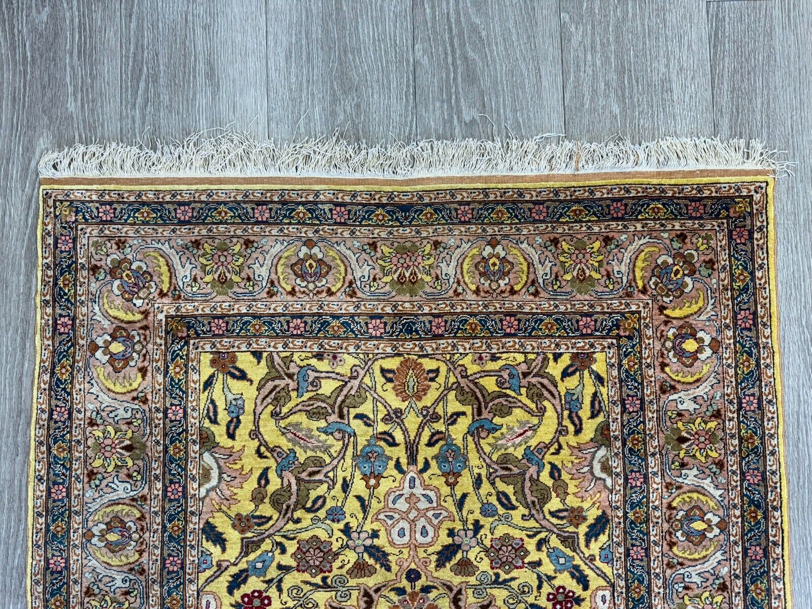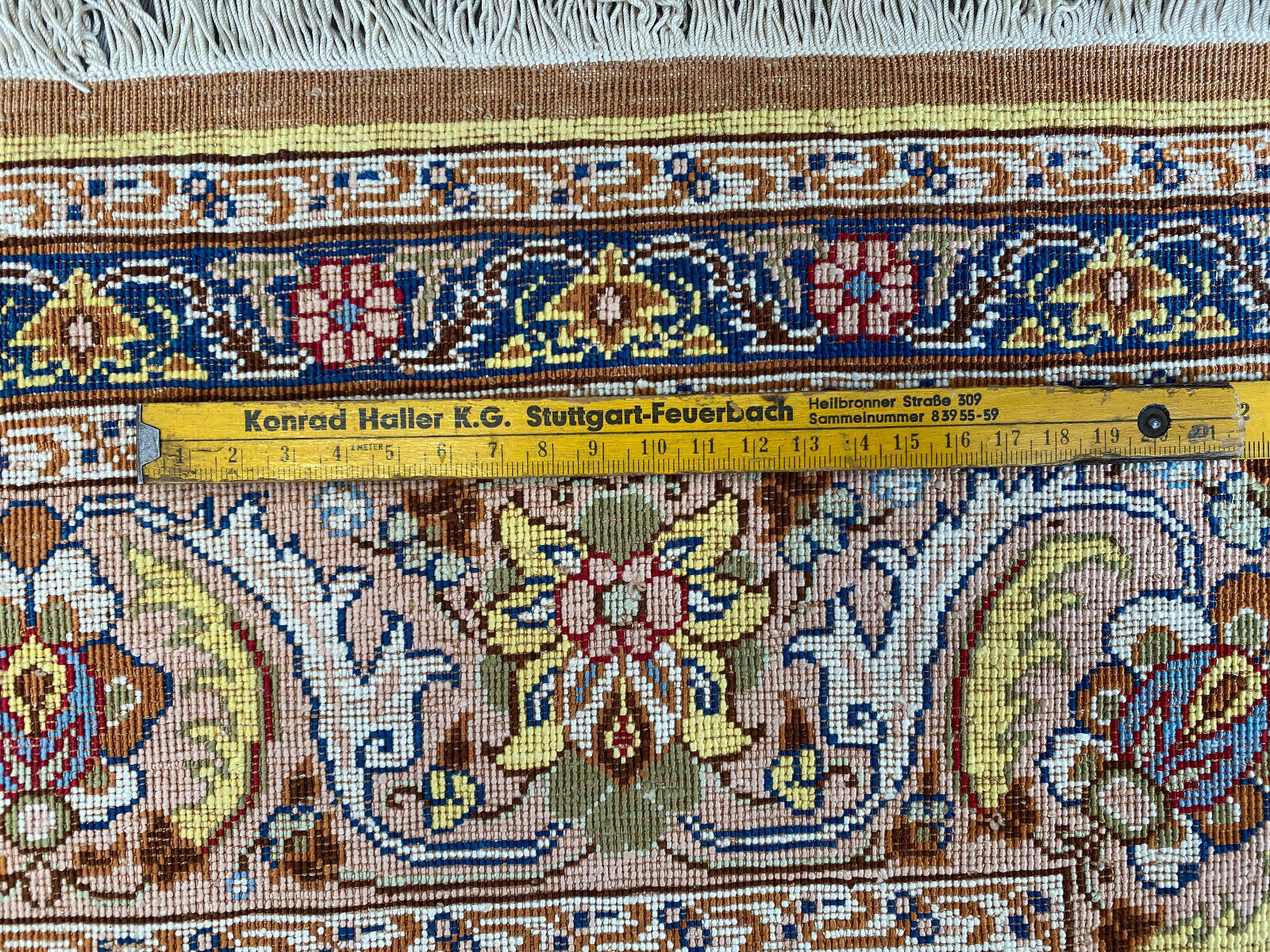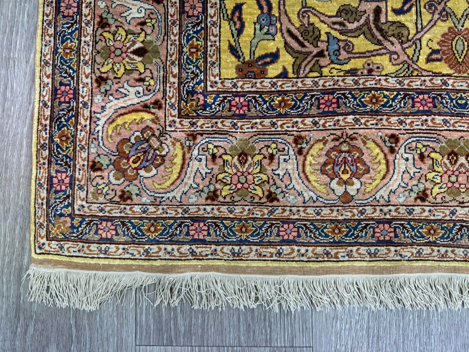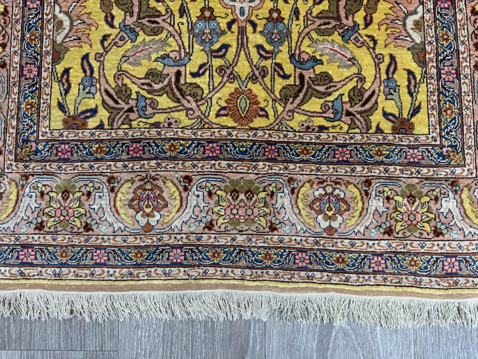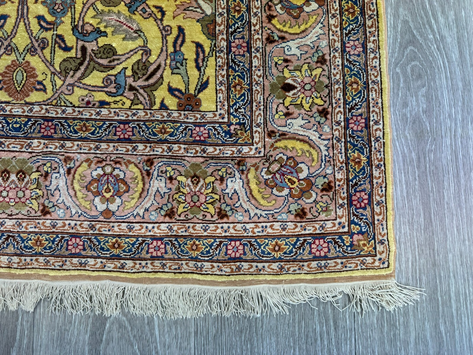 Sehr schöner Seideteppich mit Silberfaden bearbeitet. Oberfläche ganz leicht abgenutzt. Abmessungen inklusive Fransen: 100x160cm. Der Teppich ist nicht frisch gewaschen.