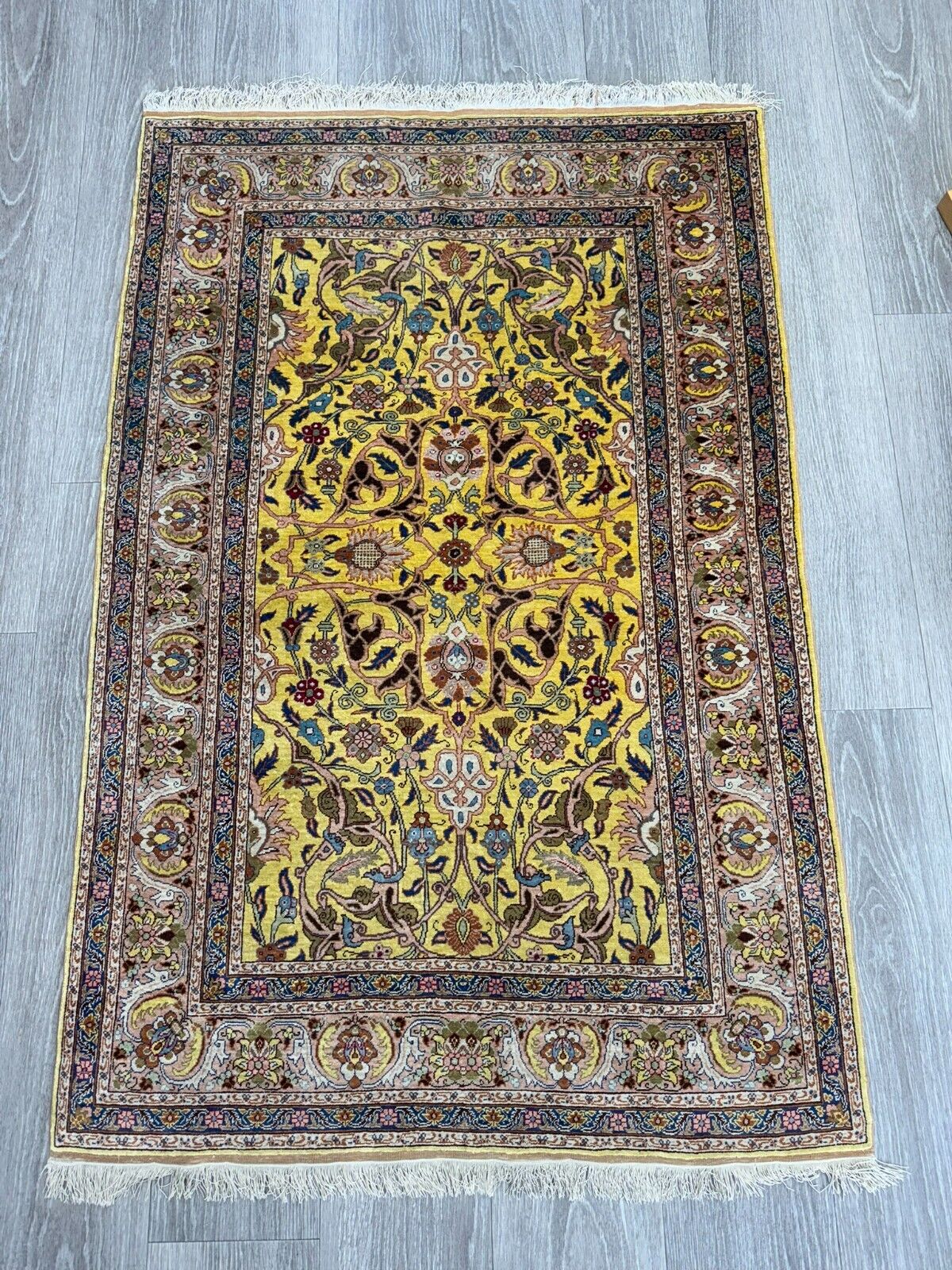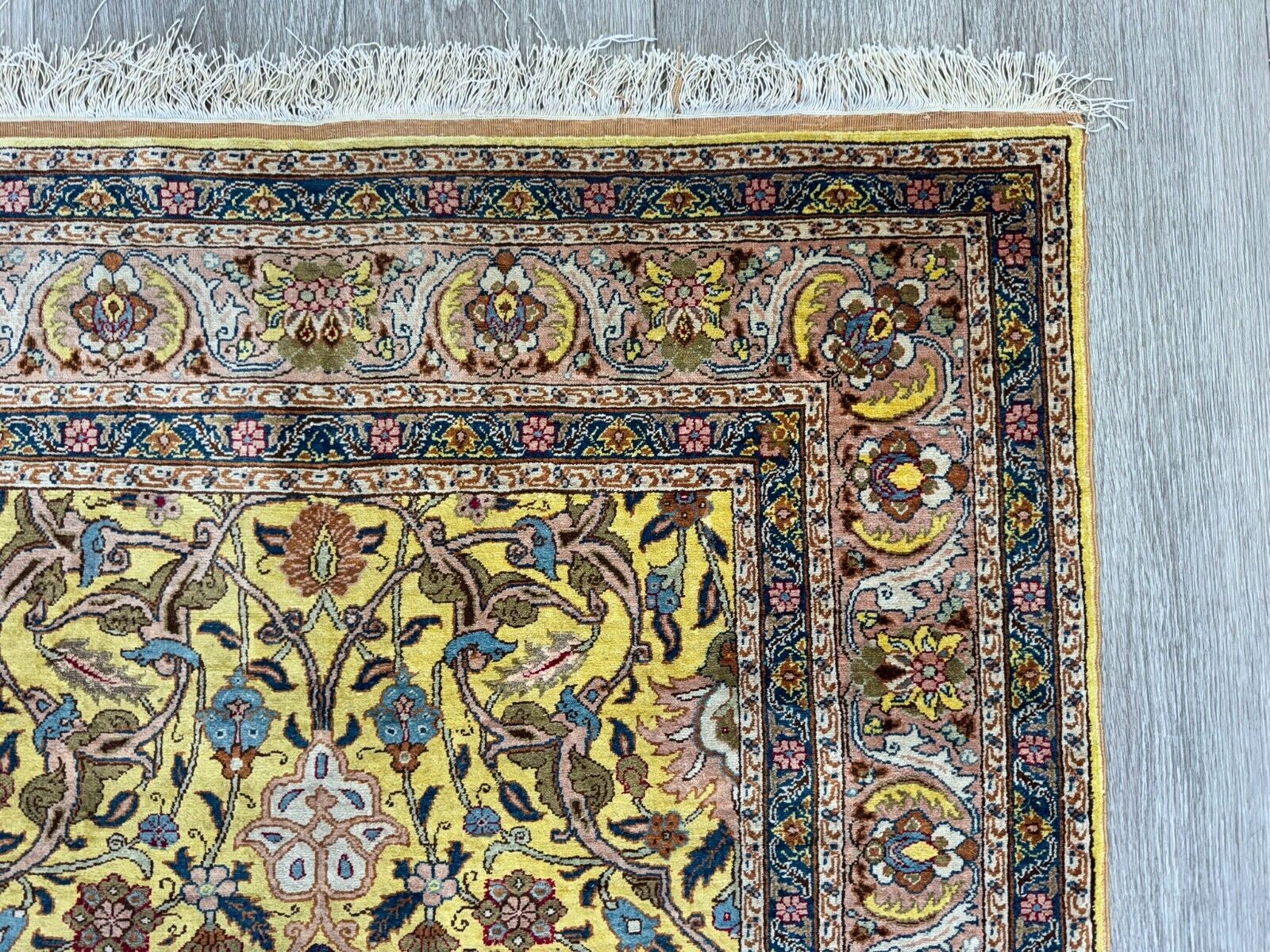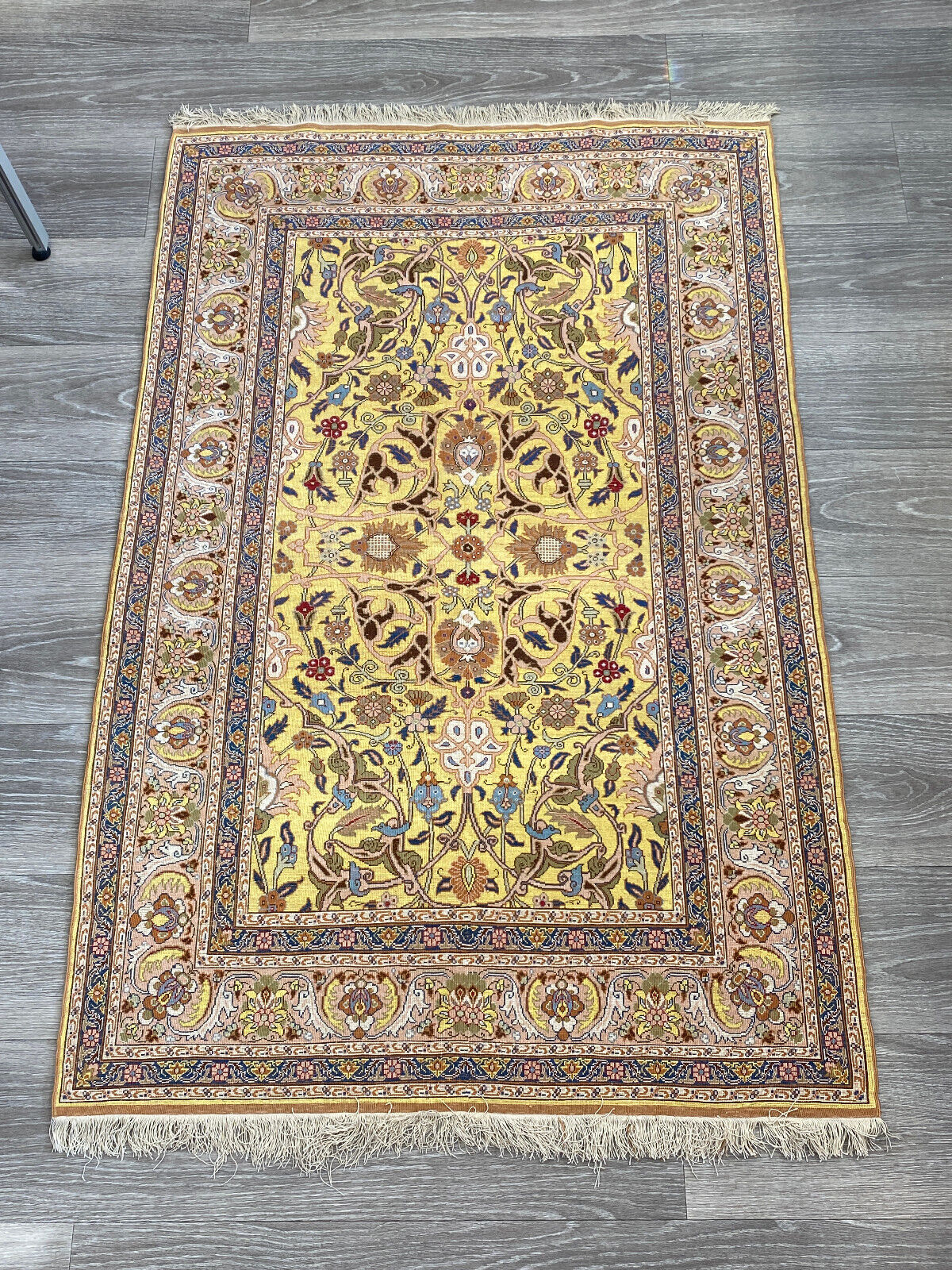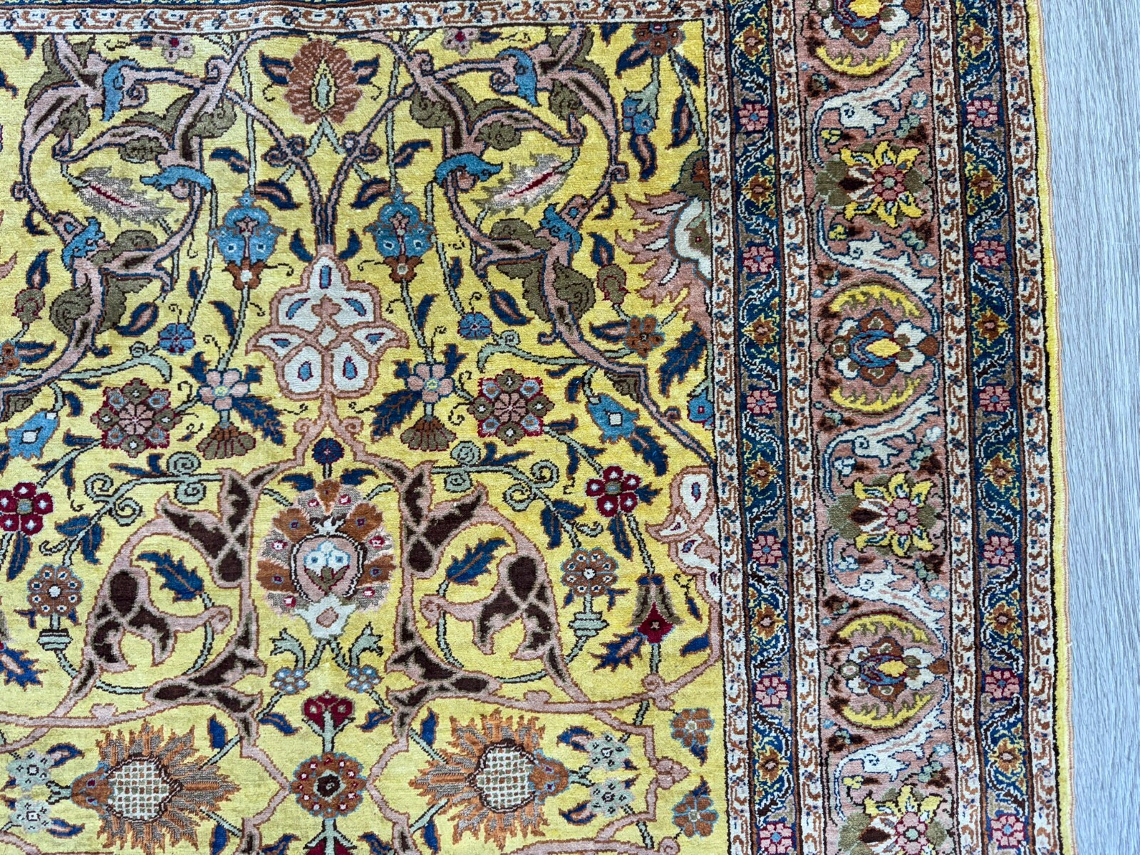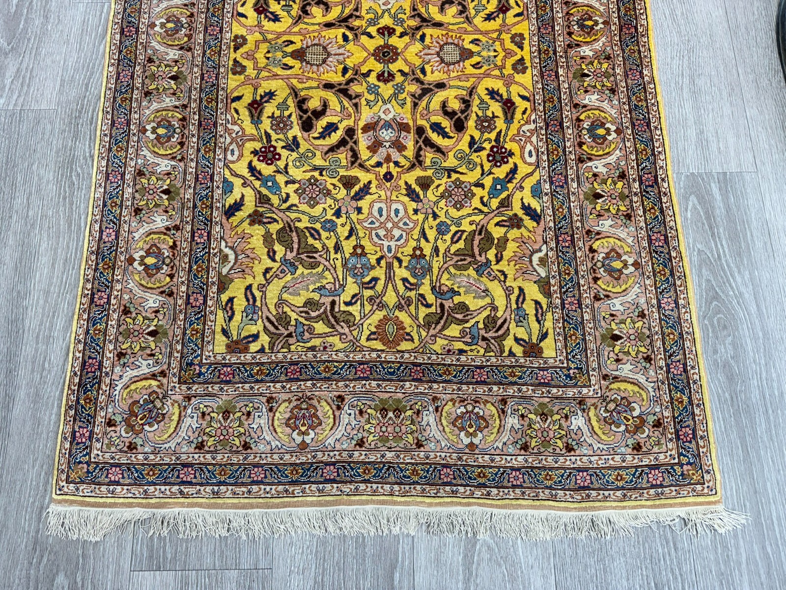 Sehr schöner Seideteppich mit Silberfaden bearbeitet. Oberfläche ganz leicht abgenutzt. Abmessungen inklusive Fransen: 100x160cm. Der Teppich ist nicht frisch gewaschen.