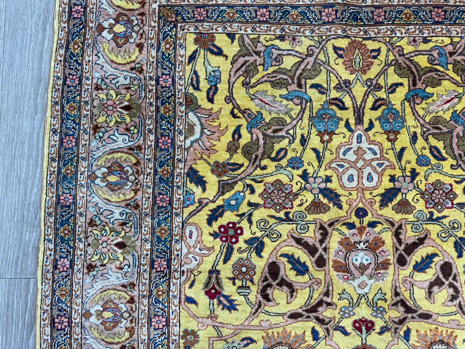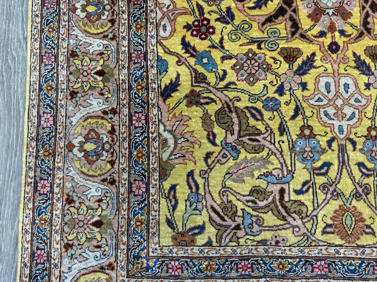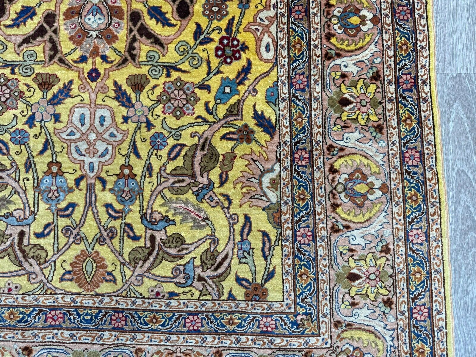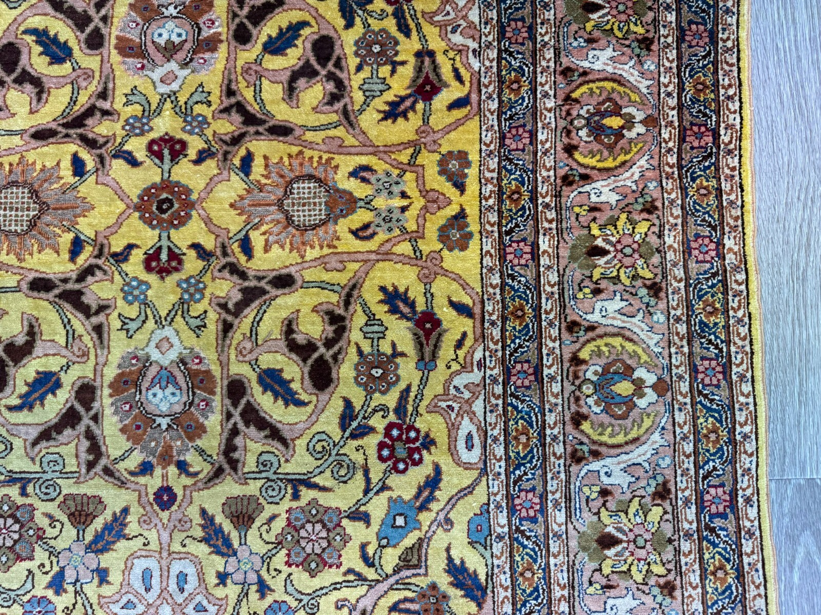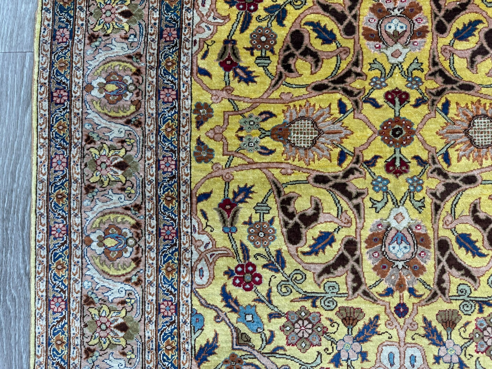 Sehr schöner Seideteppich mit Silberfaden bearbeitet. Oberfläche ganz leicht abgenutzt. Abmessungen inklusive Fransen: 100x160cm. Der Teppich ist nicht frisch gewaschen.