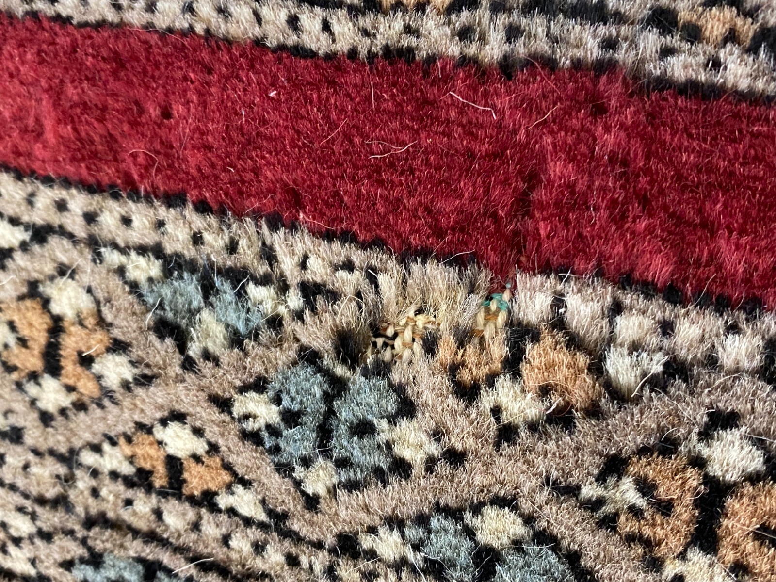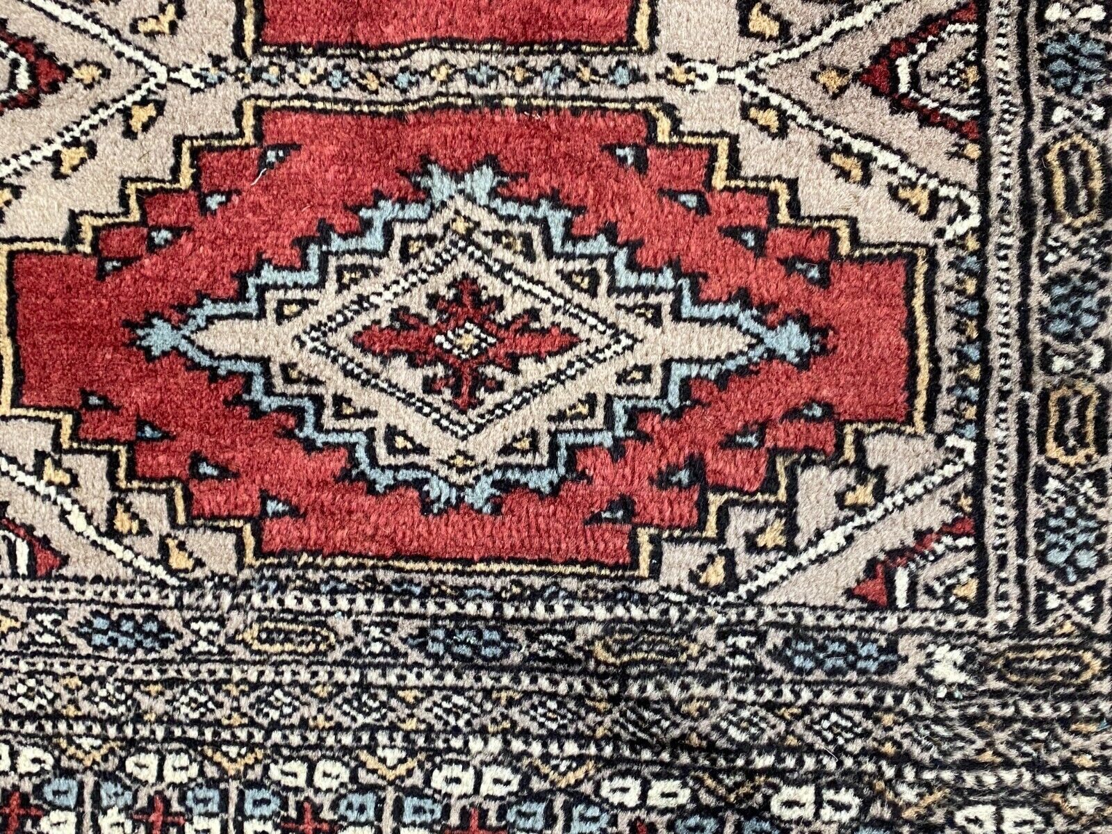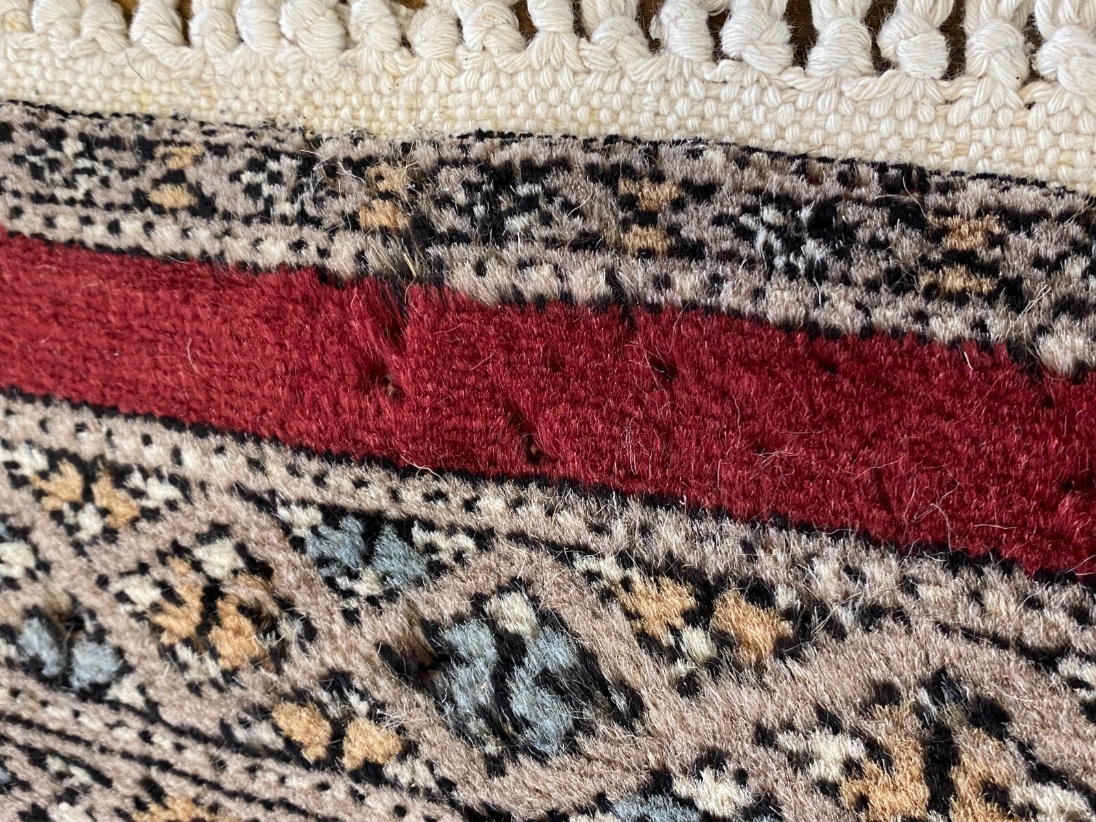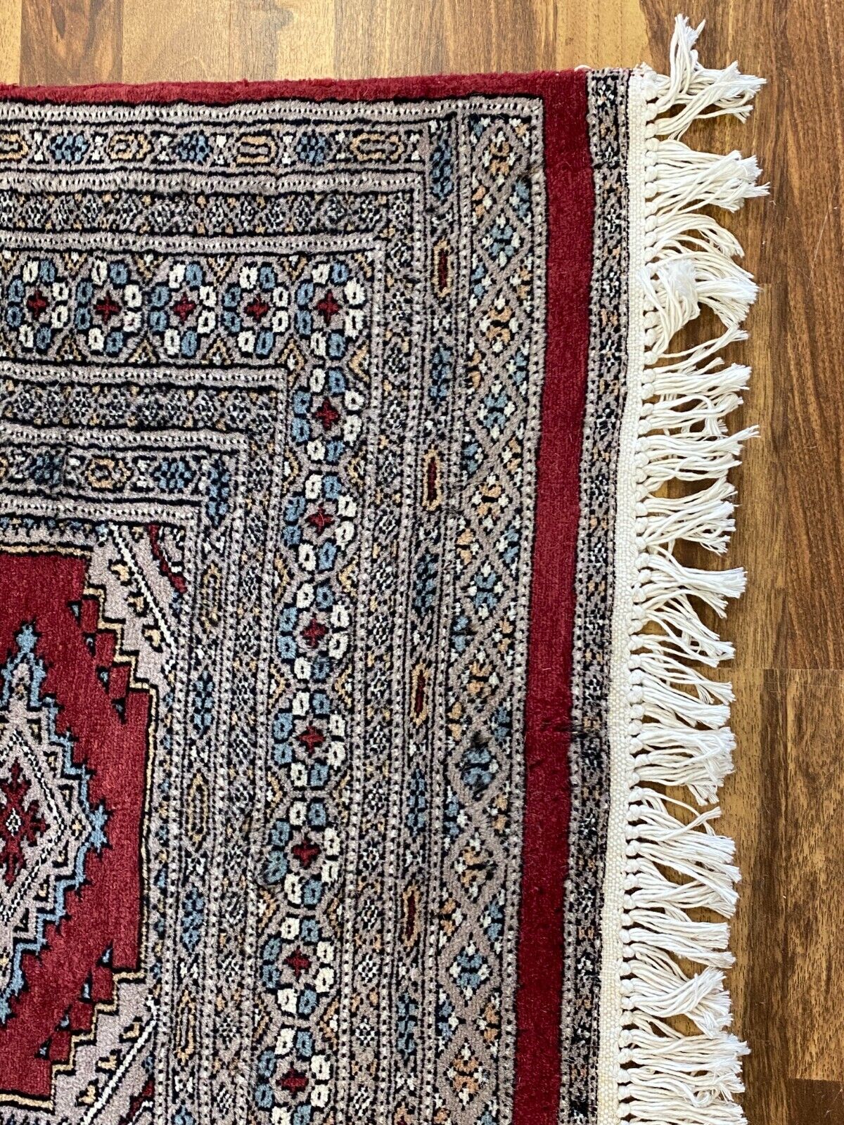 Schöner, handgeknüpfter Teppich aus Wolle. Im oberen Viertel ist die Grundwolle heller, zudem sind an der obere Kante Löcher von Mottenfraß. LxB: 180x125cm INKLUSIVE FRANSEN. Die Teppiche sind nicht gewaschen, riechen weder nach Rauch noch nach Tieren.