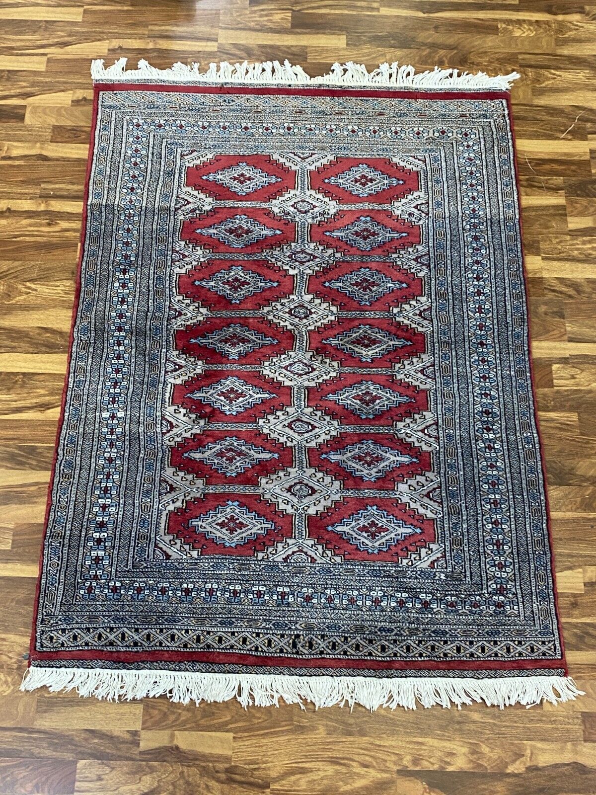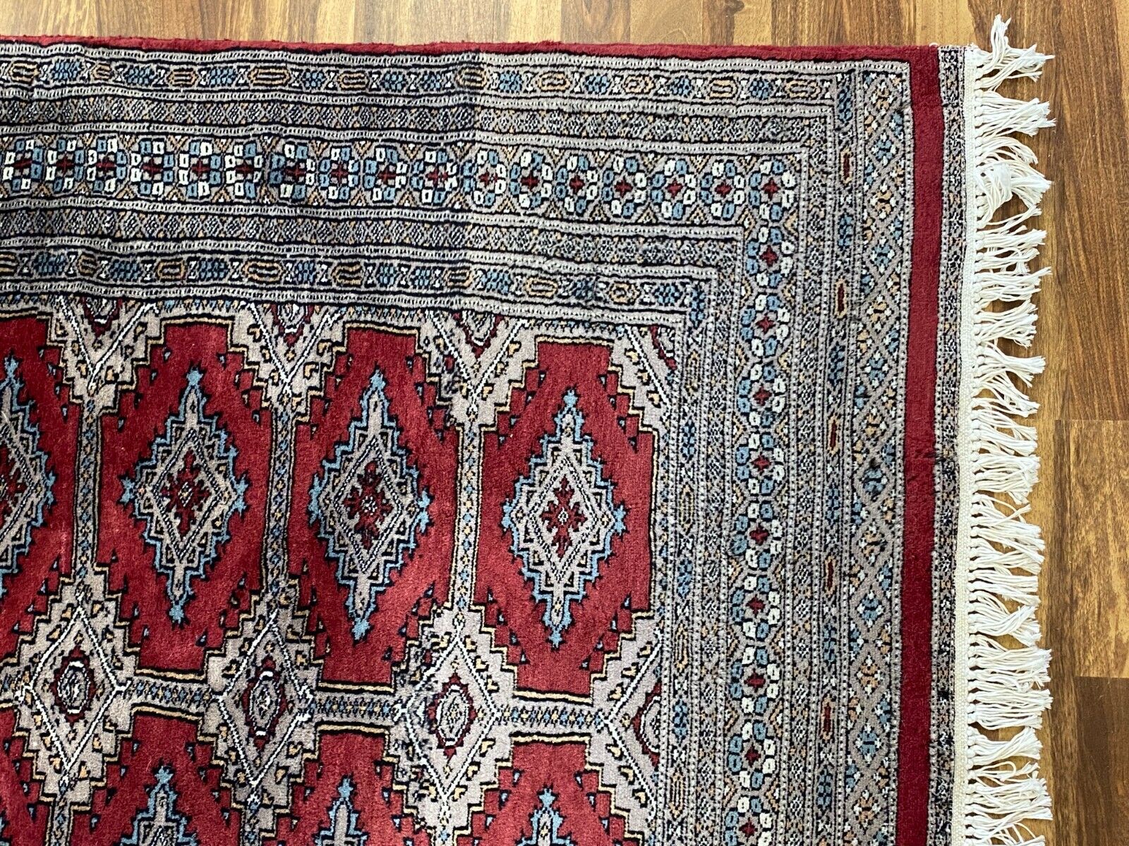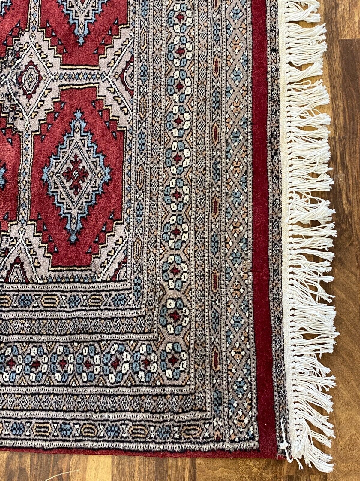 Schöner, handgeknüpfter Teppich aus Wolle. Im oberen Viertel ist die Grundwolle heller, zudem sind an der obere Kante Löcher von Mottenfraß. LxB: 180x125cm INKLUSIVE FRANSEN. Die Teppiche sind nicht gewaschen, riechen weder nach Rauch noch nach Tieren.