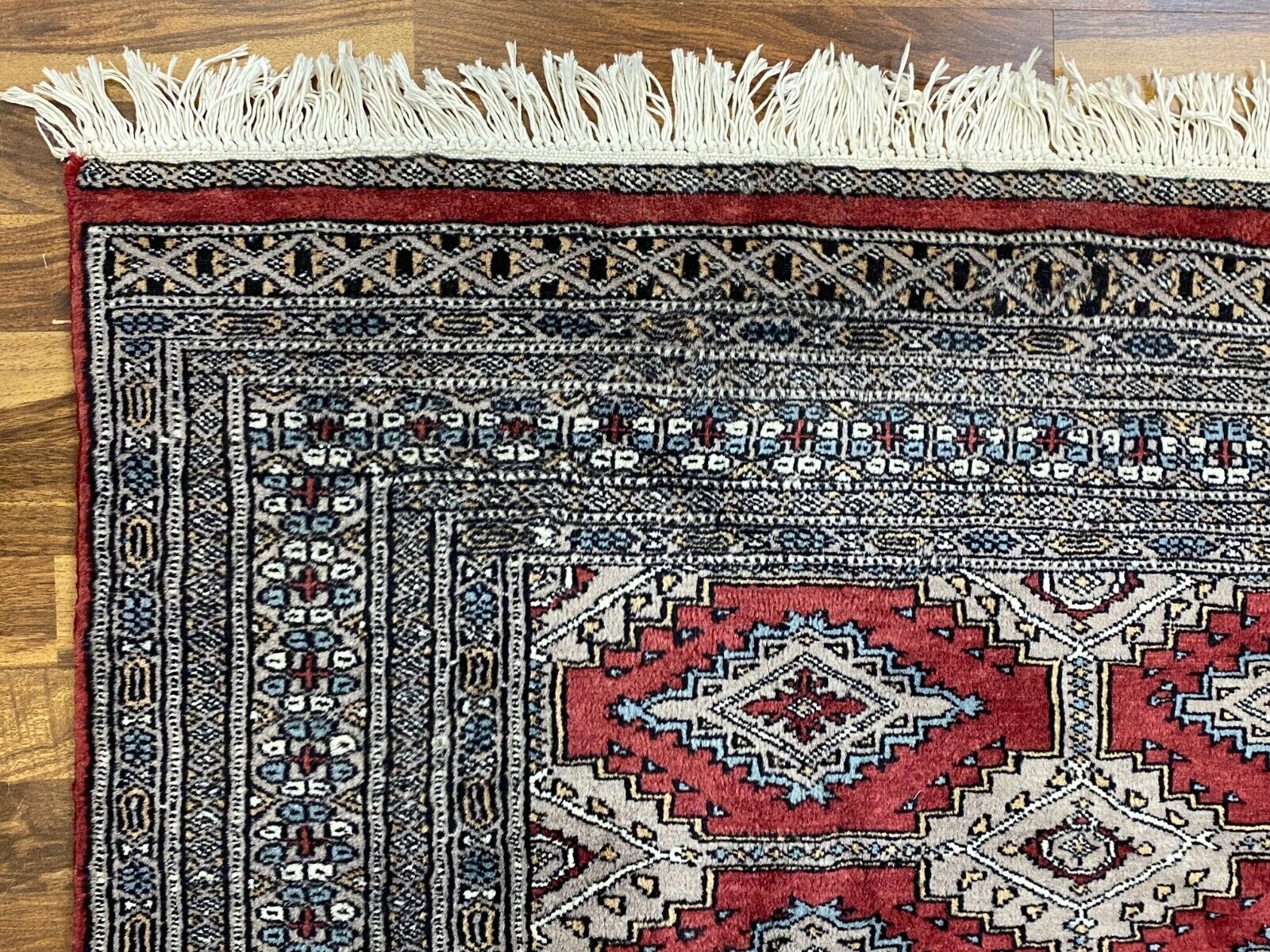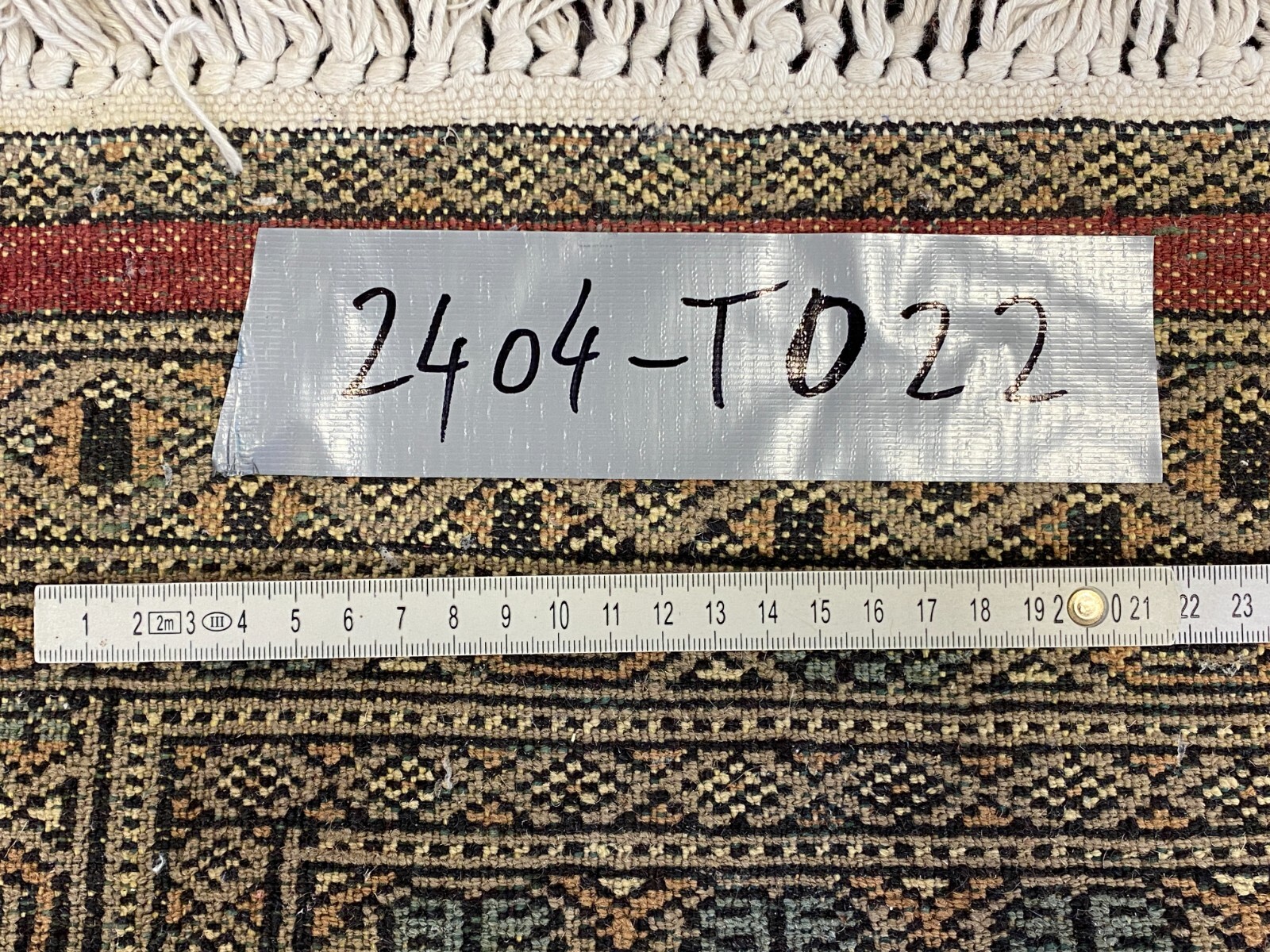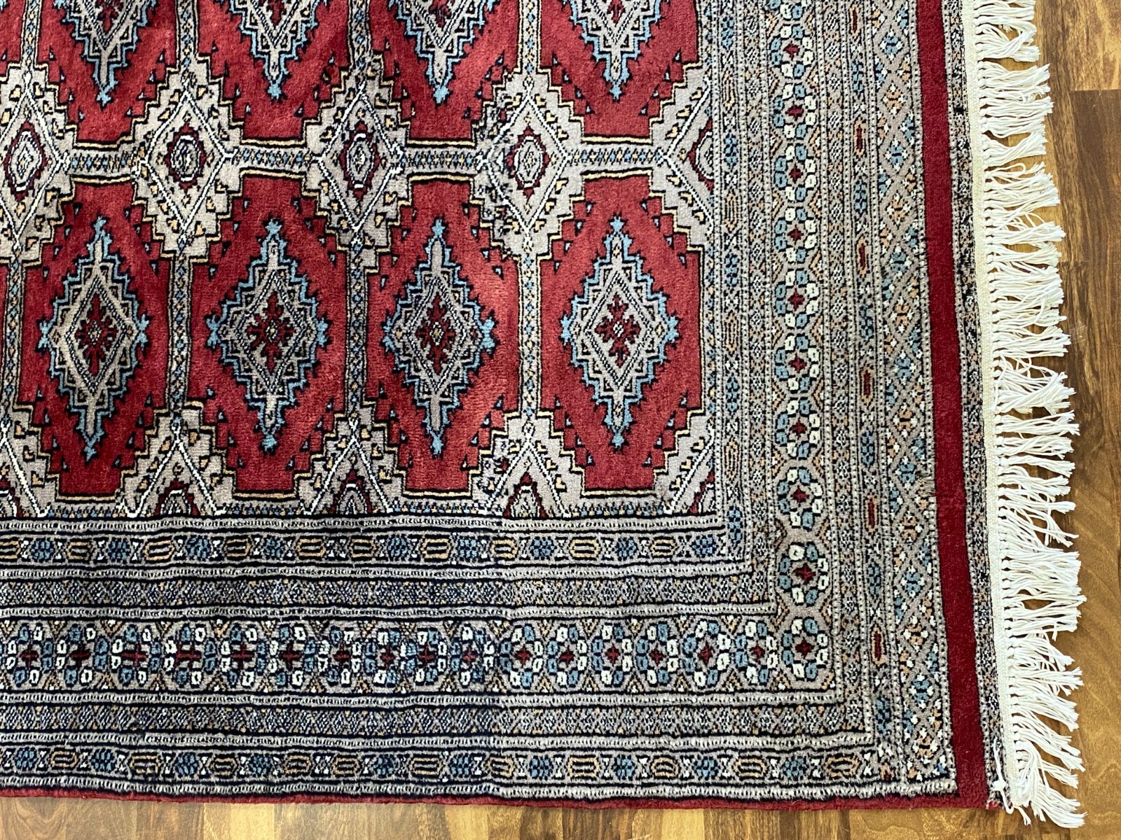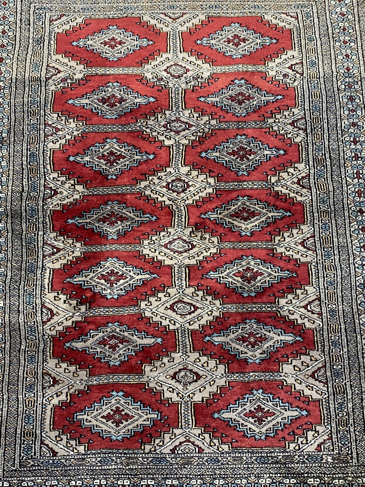 Schöner, handgeknüpfter Teppich aus Wolle. Im oberen Viertel ist die Grundwolle heller, zudem sind an der obere Kante Löcher von Mottenfraß. LxB: 180x125cm INKLUSIVE FRANSEN. Die Teppiche sind nicht gewaschen, riechen weder nach Rauch noch nach Tieren.