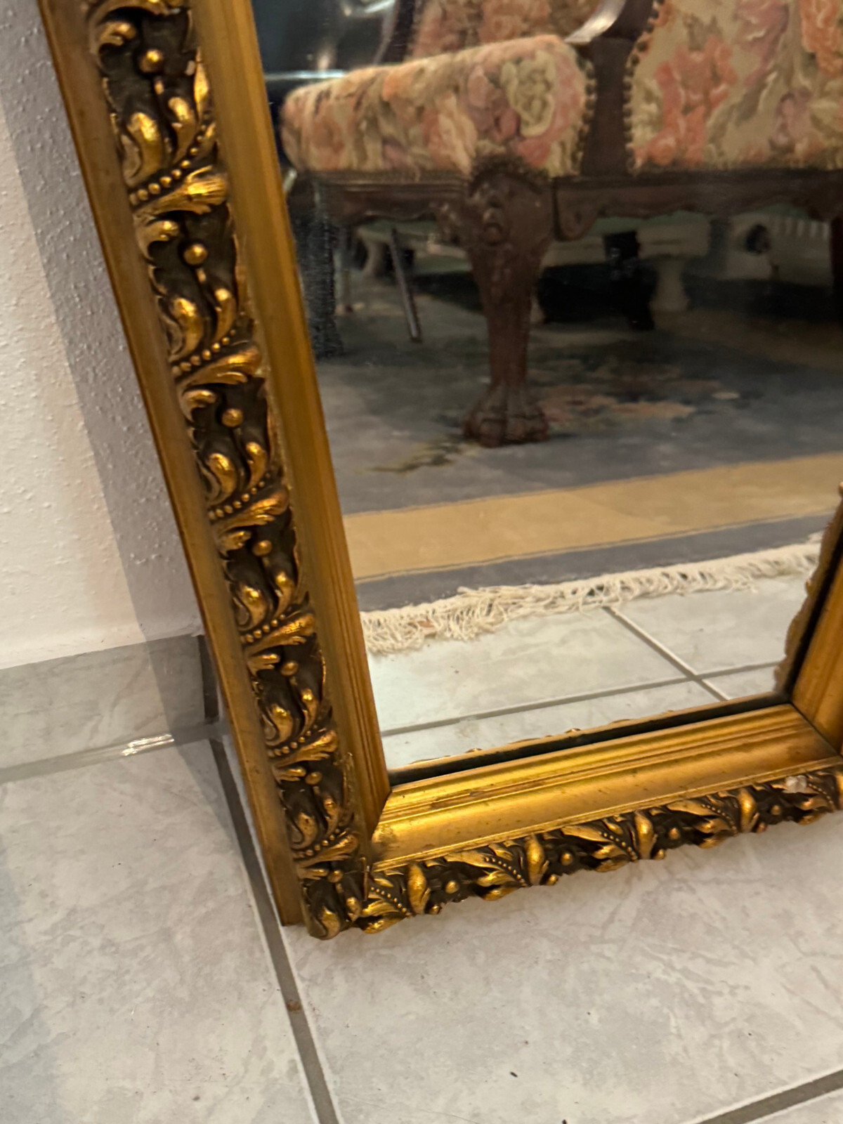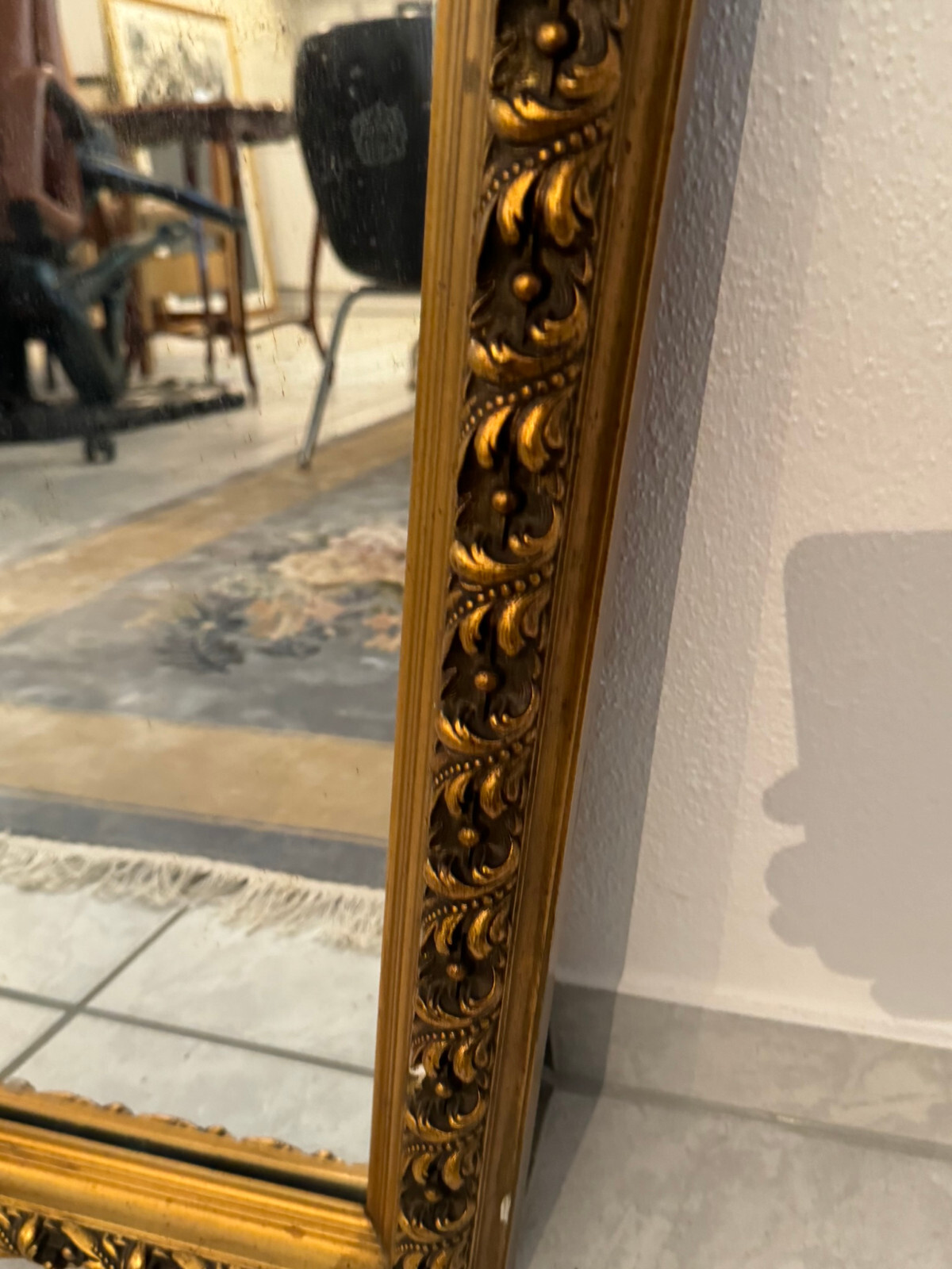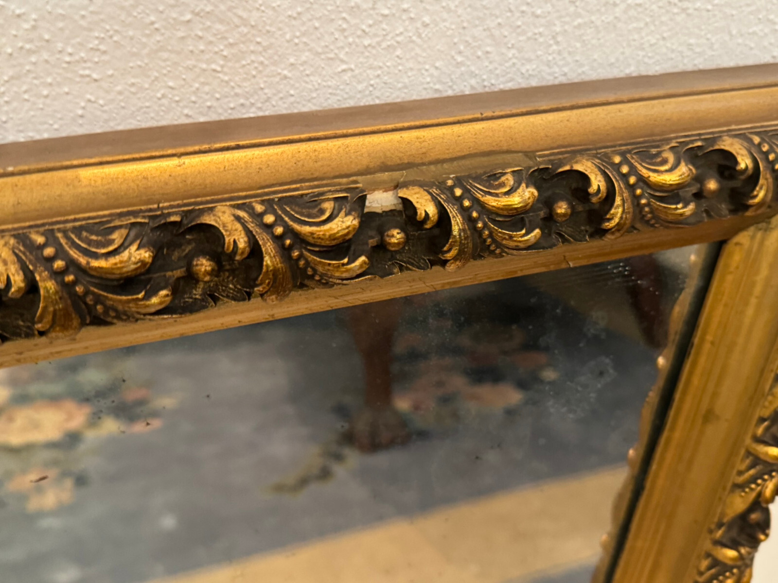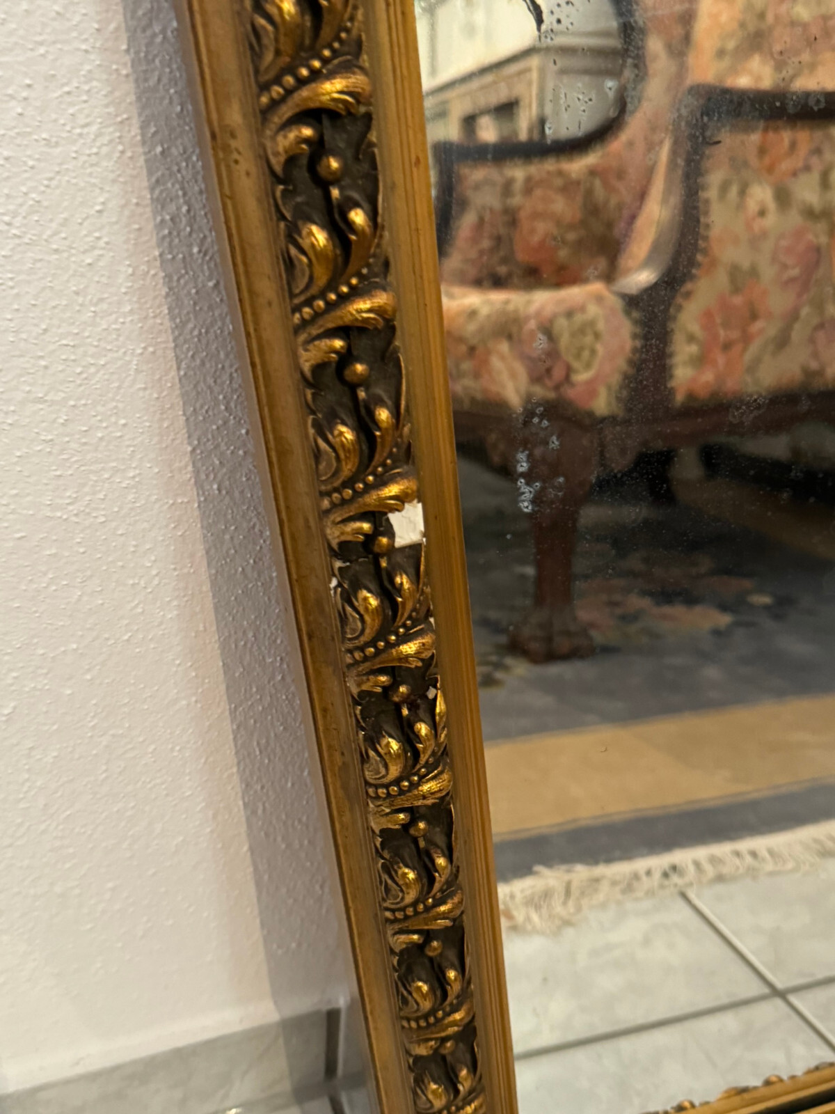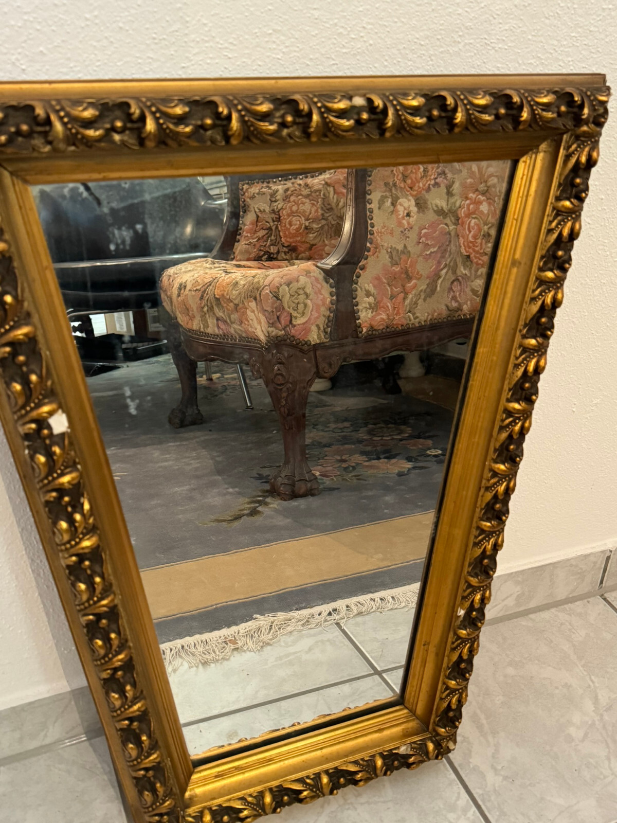 Sehr schöner trapezförmiger Spiegel. Rahmen aus massivem Holz, Stuckaufbau im Randbereich teils unvollständig, berieben und bestoßen. HxB: 64x50cm.