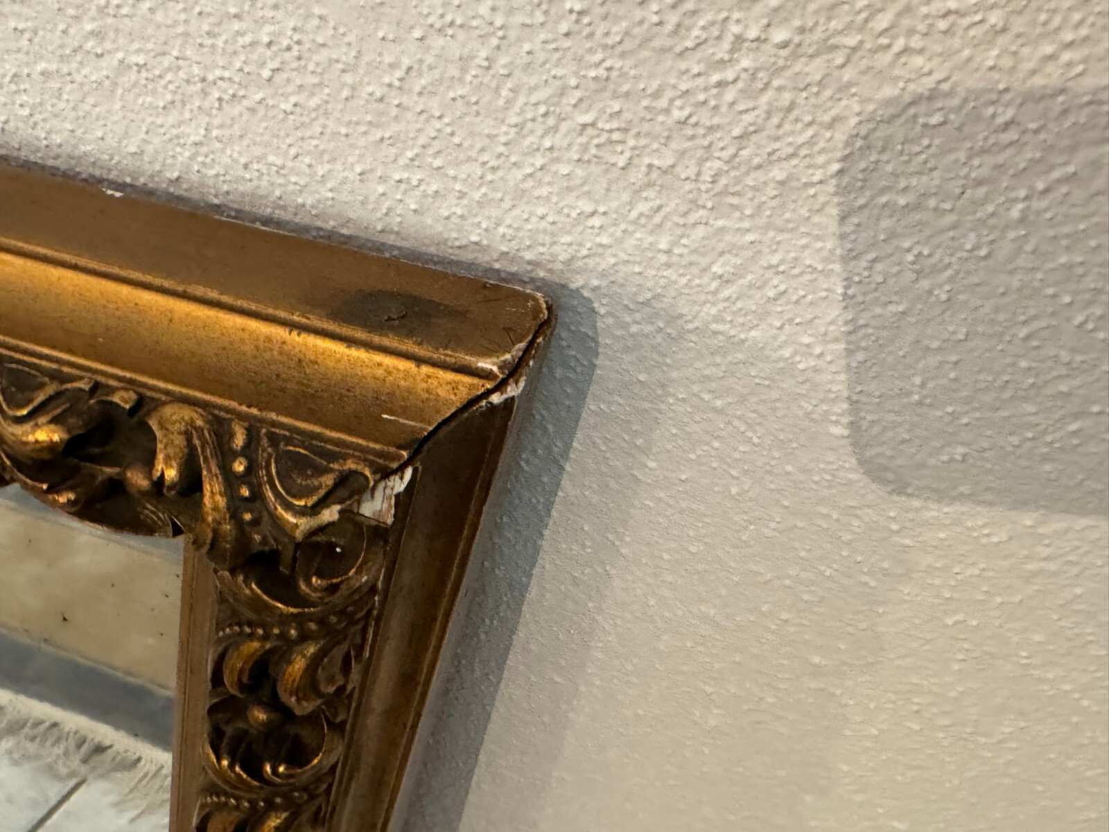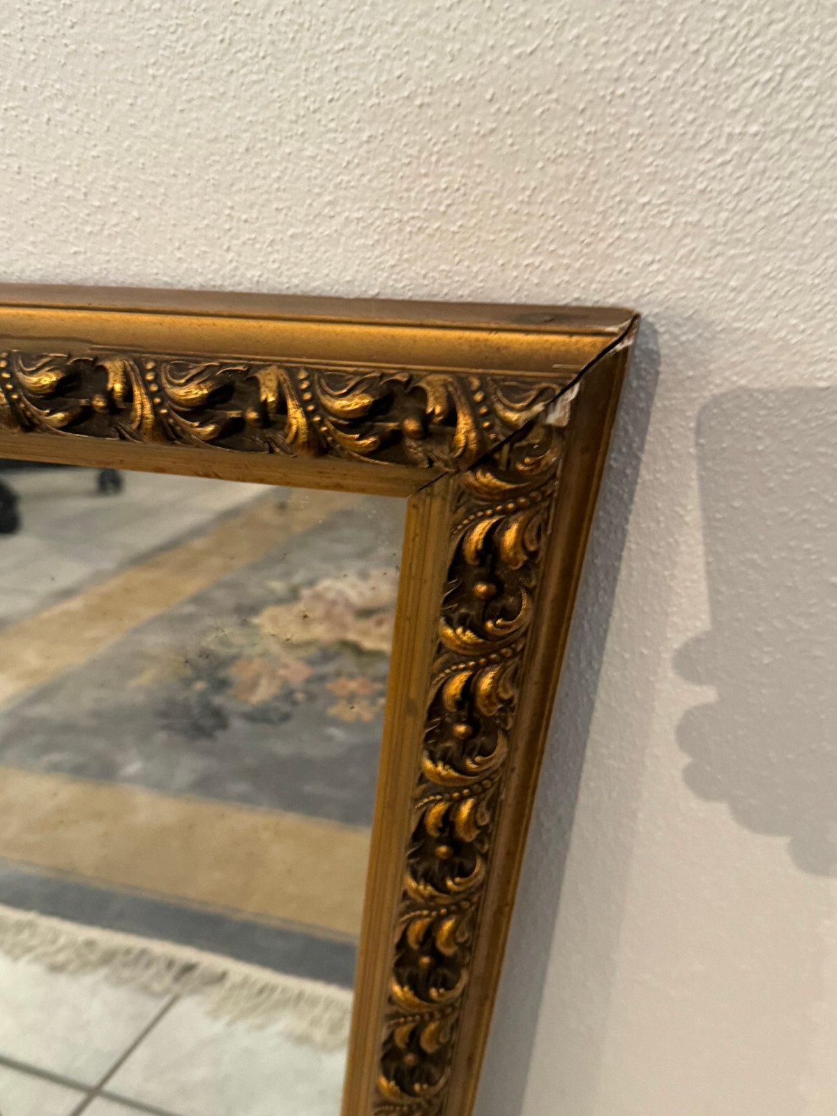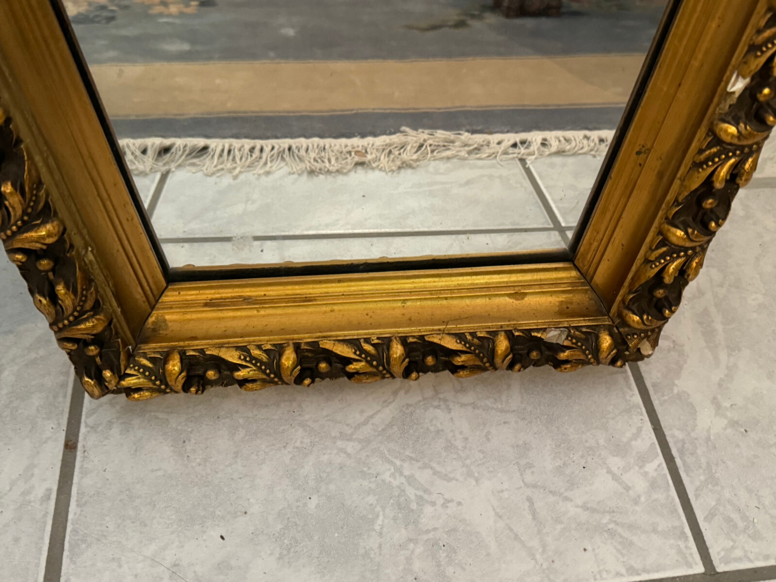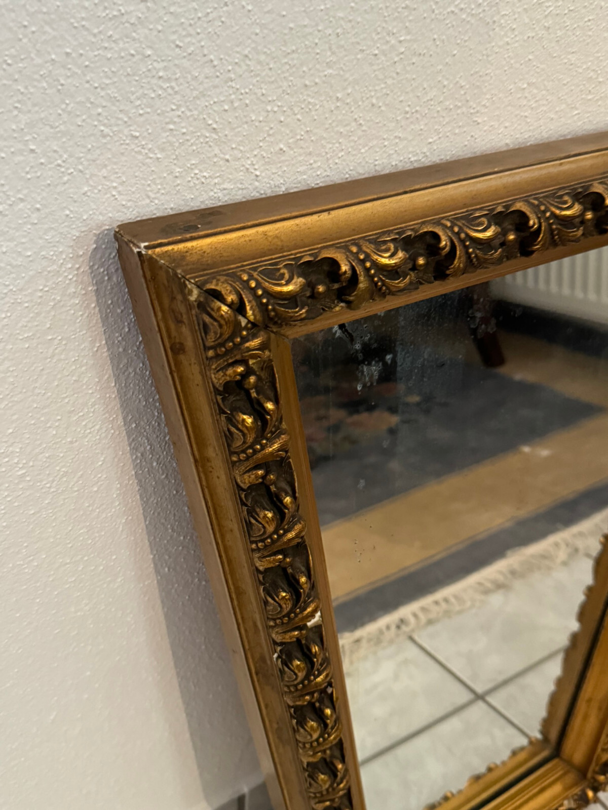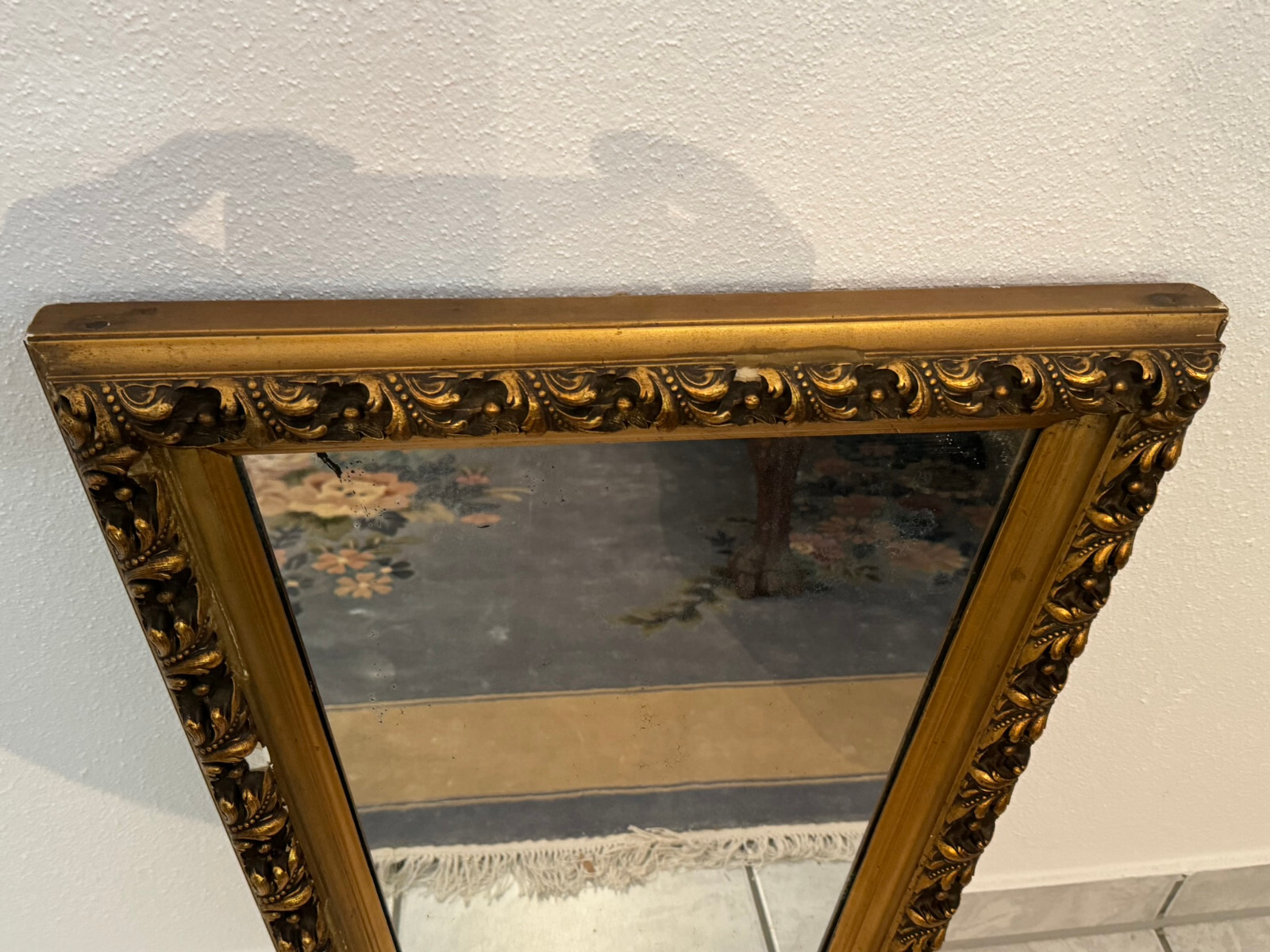 Sehr schöner trapezförmiger Spiegel. Rahmen aus massivem Holz, Stuckaufbau im Randbereich teils unvollständig, berieben und bestoßen. HxB: 64x50cm.