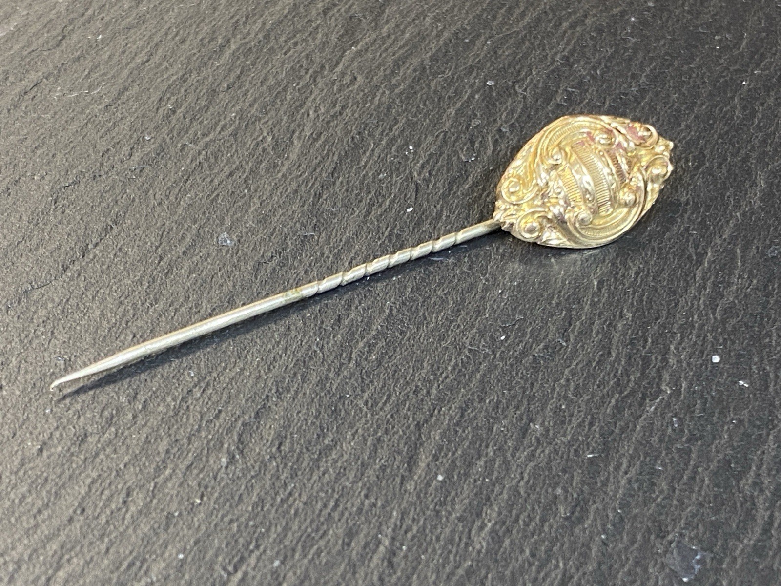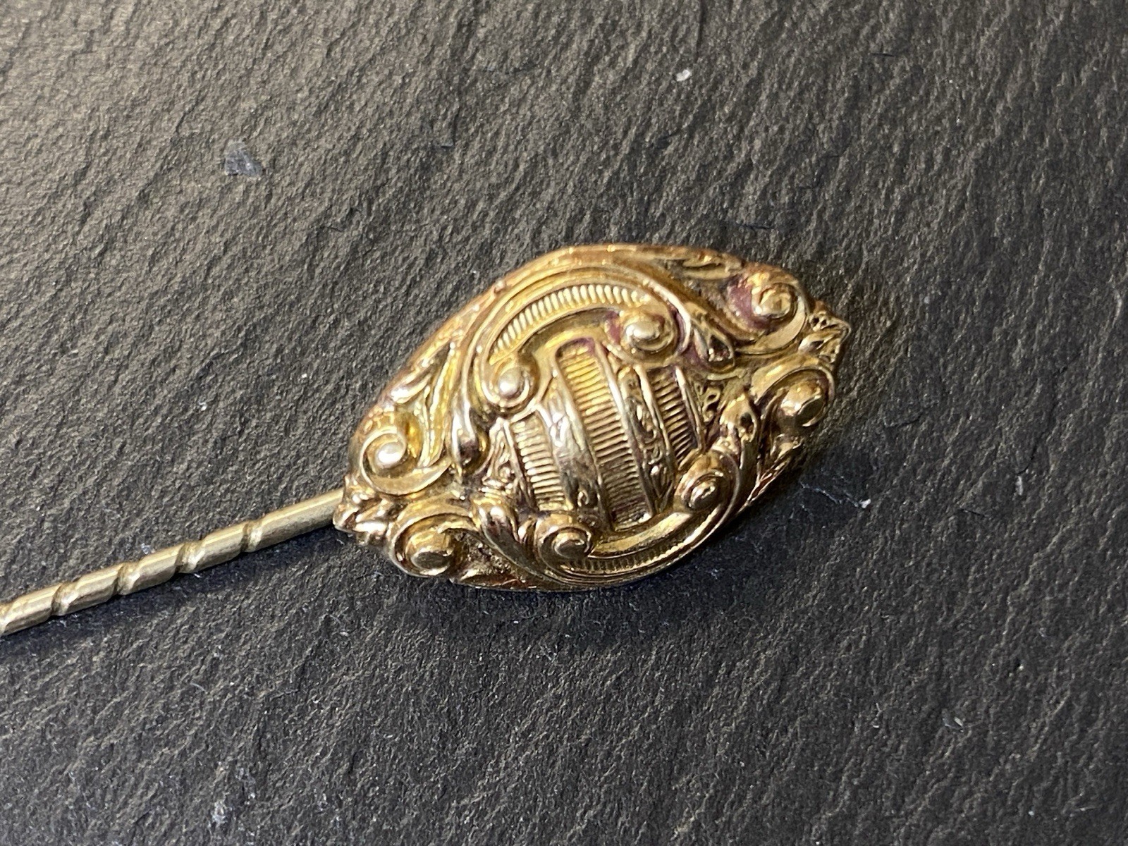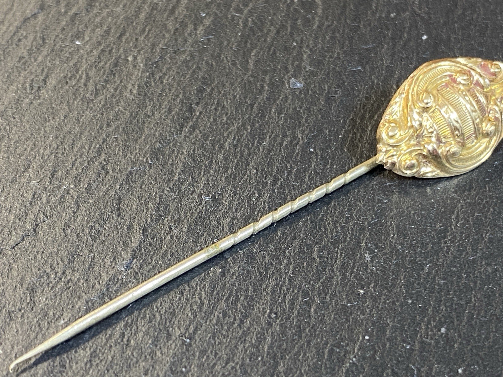 Antike Biedermeier Anstecknadel, ungestempelt, mit filigranem Dekor. Das Hauptstück ist mit 13,5K Gelbgold vergoldet, die Nadel selbst aus Kupfer und Zinn. Die Nadel ist mit ein Paar Kerben verziert und nicht 100% gerade. Die Oberfläche ist angelaufen und berieben, guter altersentsprechender Zustand. BTH  des Aufsatzes 2,08/0,7/1,3cm, Gesamtlänger der Anstecknadel 6,57cm, Gesamtgewicht ca. 1,52g.
