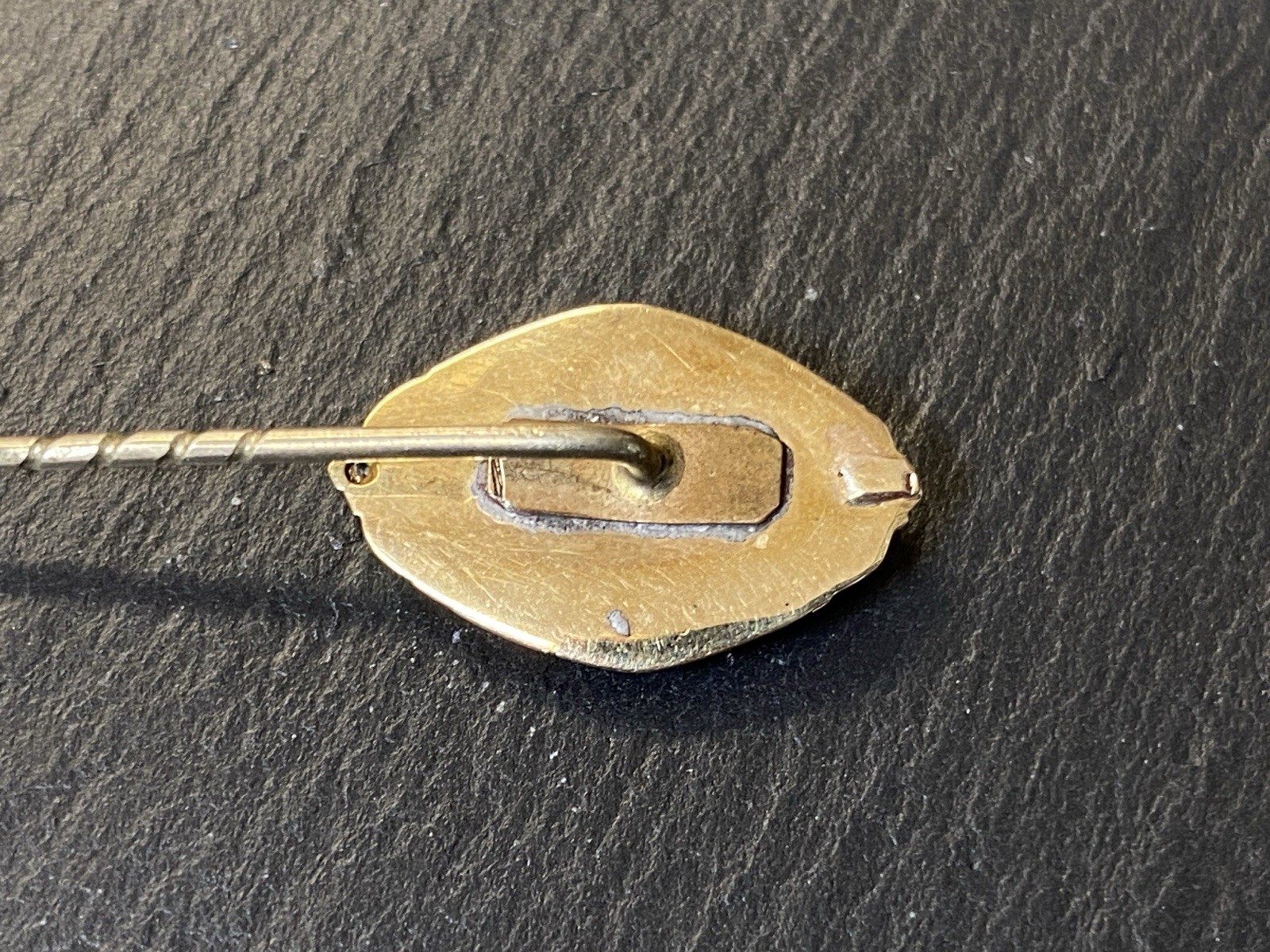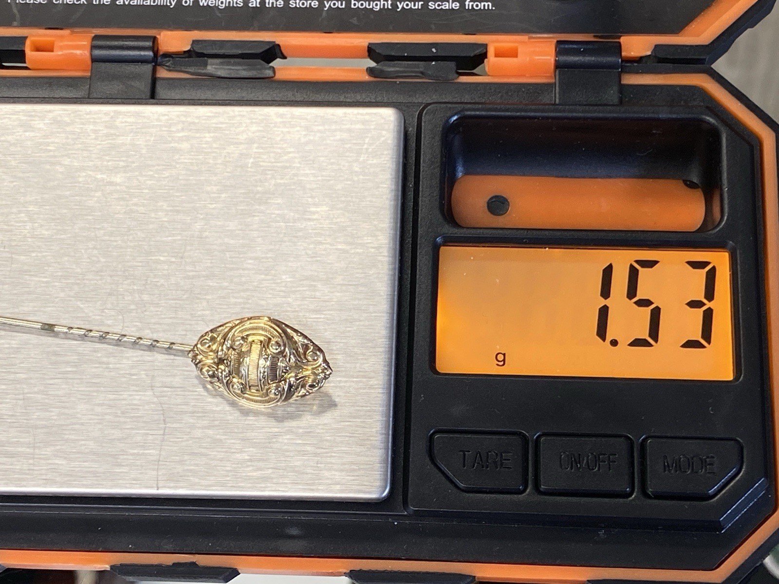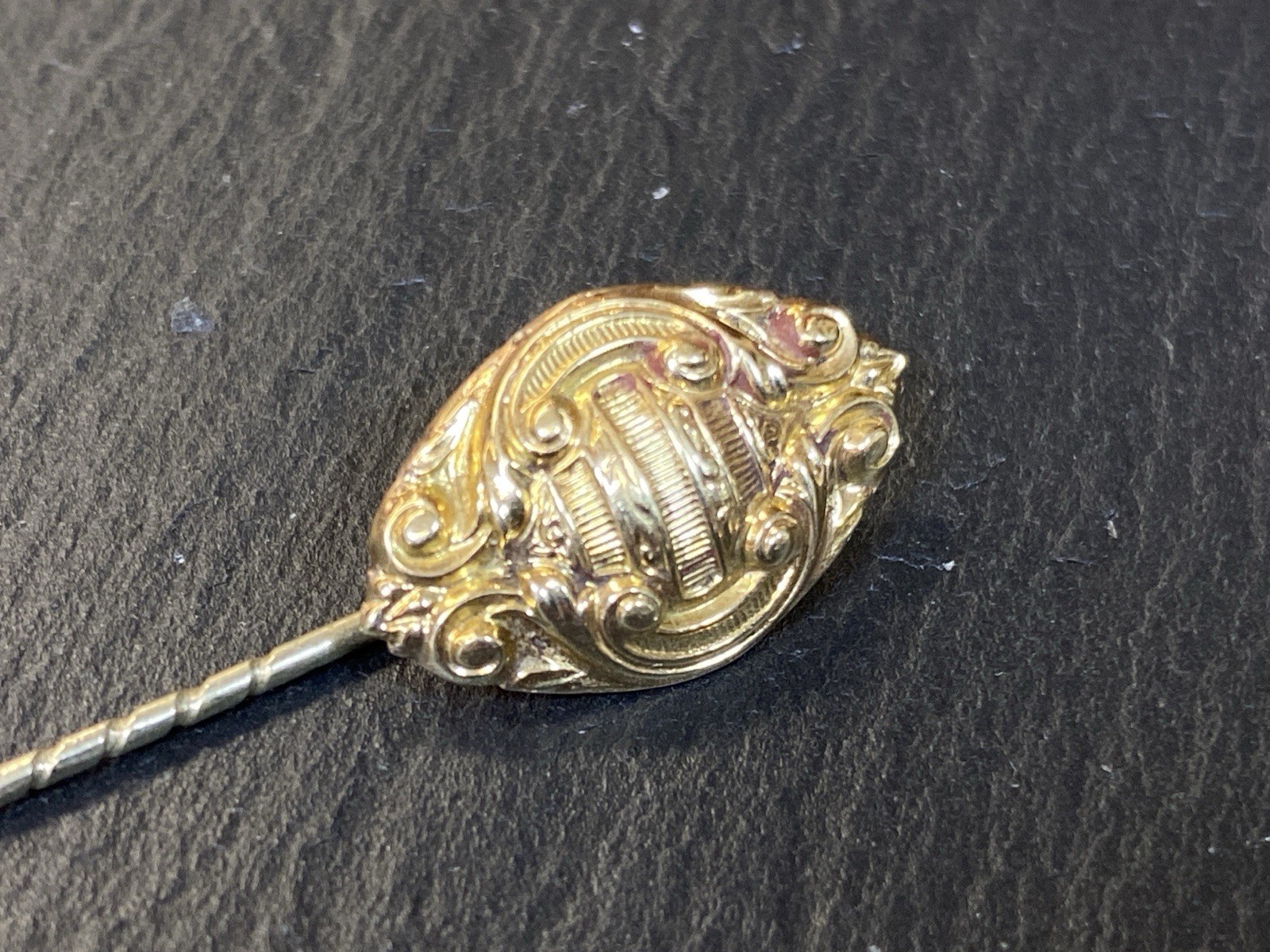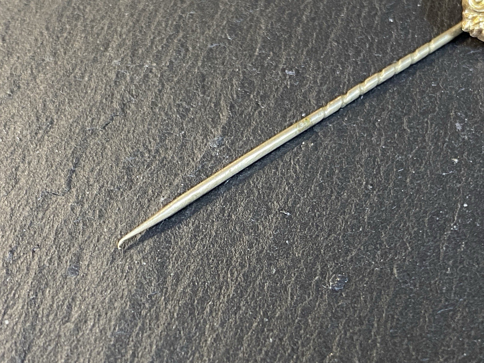 Antike Biedermeier Anstecknadel, ungestempelt, mit filigranem Dekor. Das Hauptstück ist mit 13,5K Gelbgold vergoldet, die Nadel selbst aus Kupfer und Zinn. Die Nadel ist mit ein Paar Kerben verziert und nicht 100% gerade. Die Oberfläche ist angelaufen und berieben, guter altersentsprechender Zustand. BTH  des Aufsatzes 2,08/0,7/1,3cm, Gesamtlänger der Anstecknadel 6,57cm, Gesamtgewicht ca. 1,52g.
