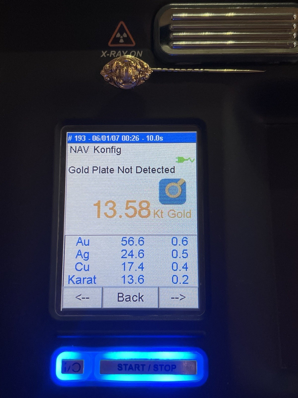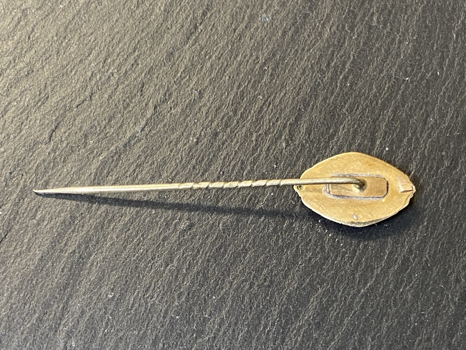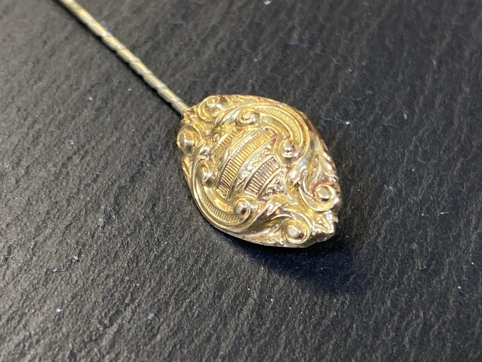 Antike Biedermeier Anstecknadel, ungestempelt, mit filigranem Dekor. Das Hauptstück ist mit 13,5K Gelbgold vergoldet, die Nadel selbst aus Kupfer und Zinn. Die Nadel ist mit ein Paar Kerben verziert und nicht 100% gerade. Die Oberfläche ist angelaufen und berieben, guter altersentsprechender Zustand. BTH des Aufsatzes 2,08/0,7/1,3cm, Gesamtlänger der Anstecknadel 6,57cm, Gesamtgewicht ca. 1,52g.