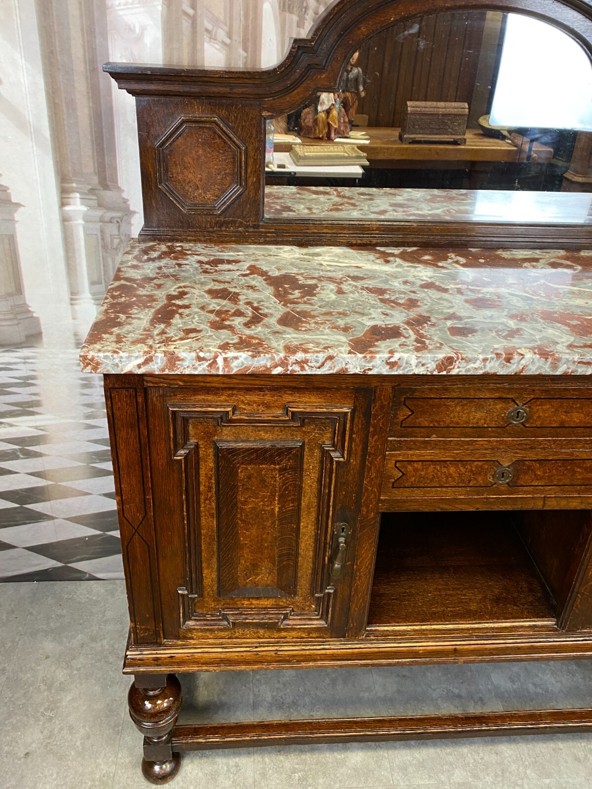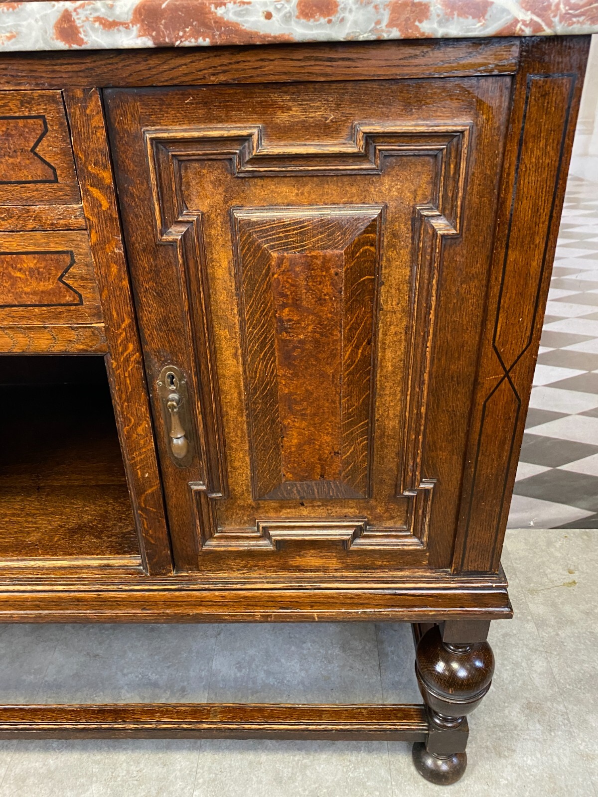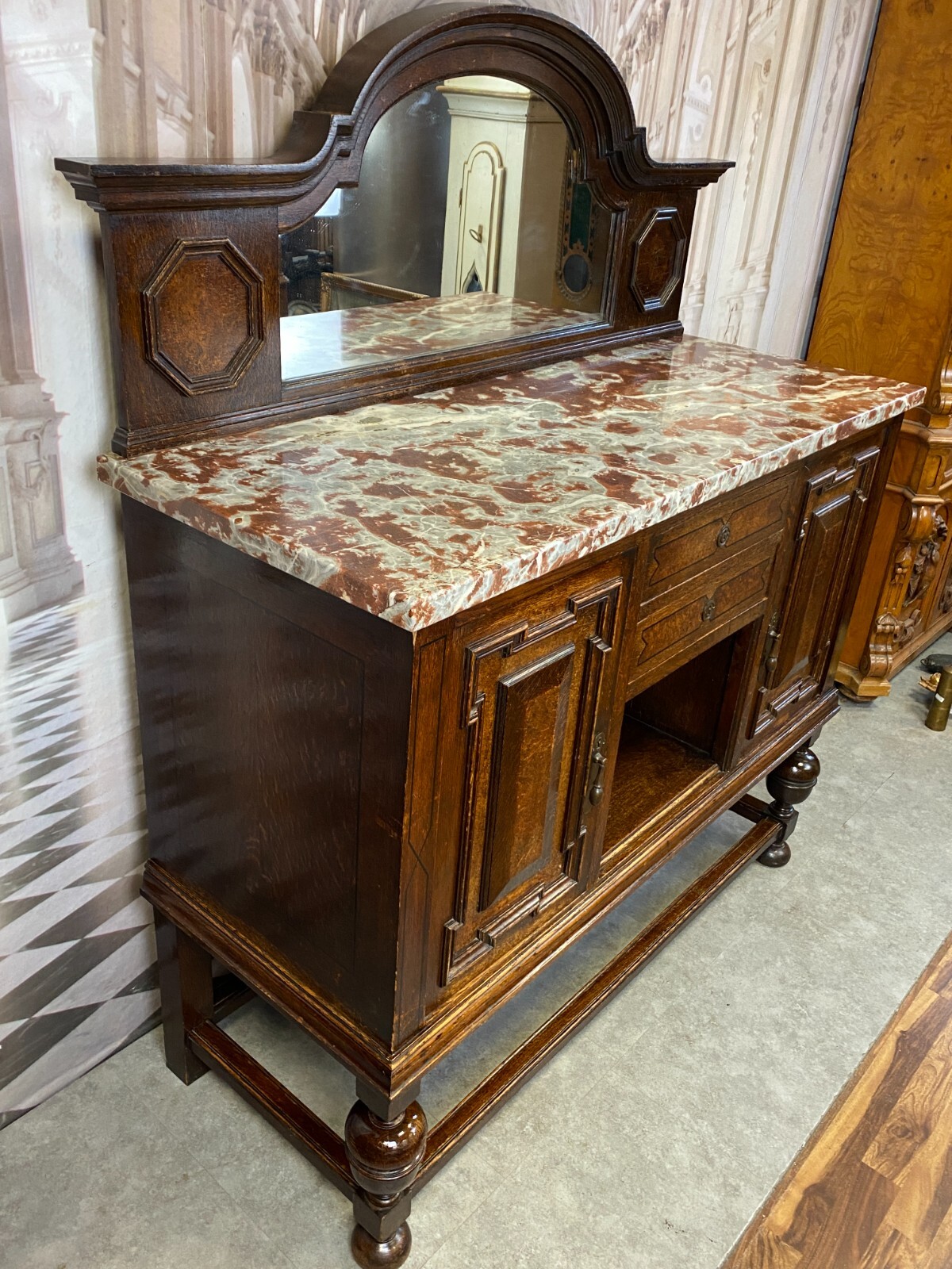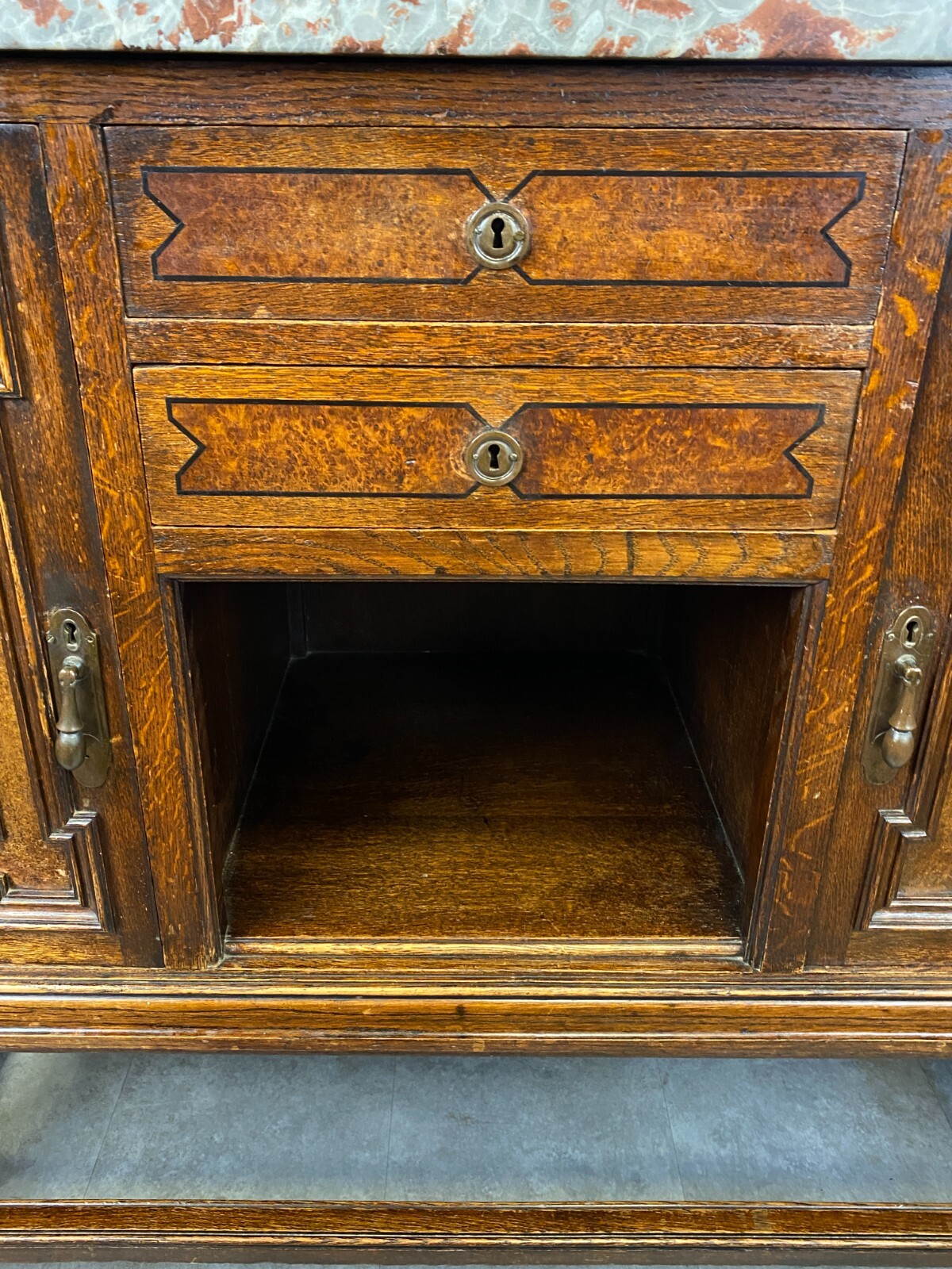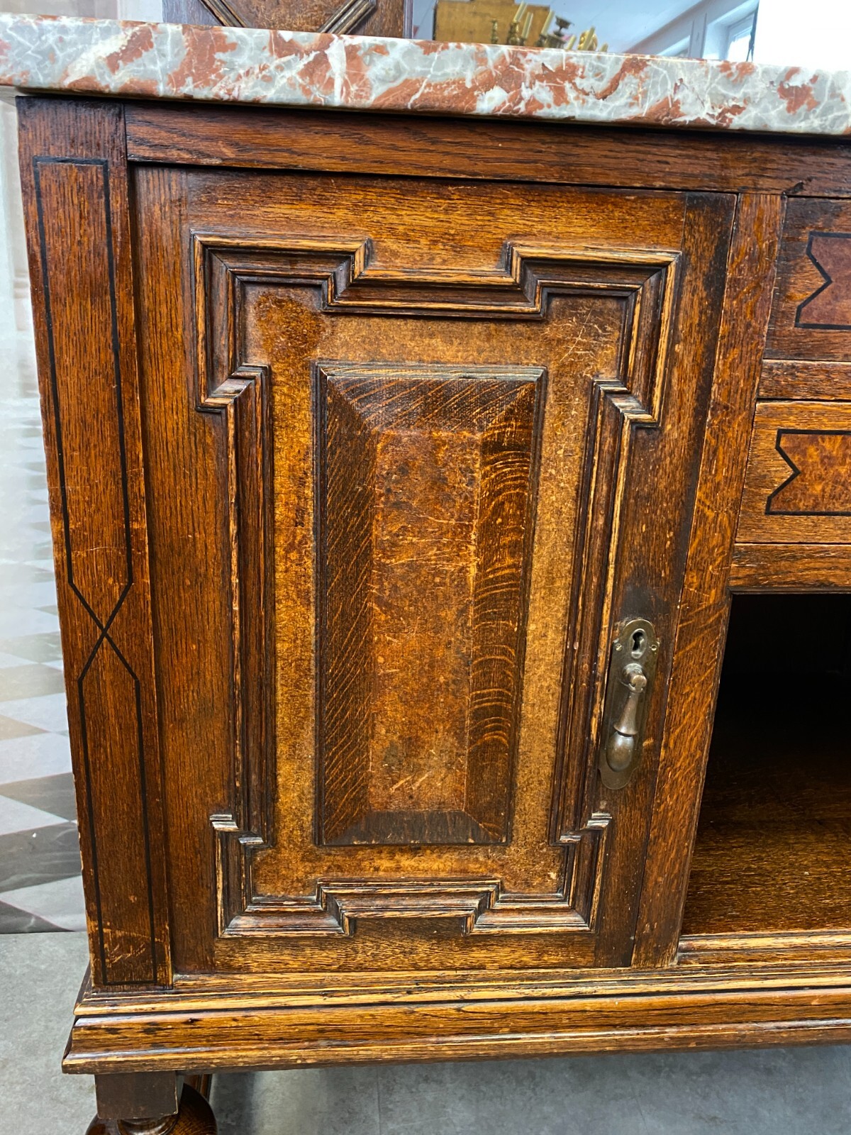 Sehr schönes Buffet, um 1880 aus massiver Eiche mit Marmorplatte und Spiegelaufsatz. An der Front schmale Bandintarsien. Zwei Schlüssel vorhanden, einer davon verbogen. Die Schlösser der Schubladen funktionsfähig, diese greifen jedoch nicht mehr in die Schließer. Die seitlichen Schlösser nicht mehr funktionsfähig. Innenräume zum Teil fleckig. Oberfläche leicht berieben, im Kantenbereich kleinere Bestoßungen. Stabiler Zustand, der Spiegelaufsatz lässt sich einzeln abnehmen. An der Marmorplatte zum Teil Kratzer und Flecken, Kantenberiech mit kleinen Chips. Abmessungen BTH: 130x52x157cm, Höhe der Arbeitsplatte: 106cm.