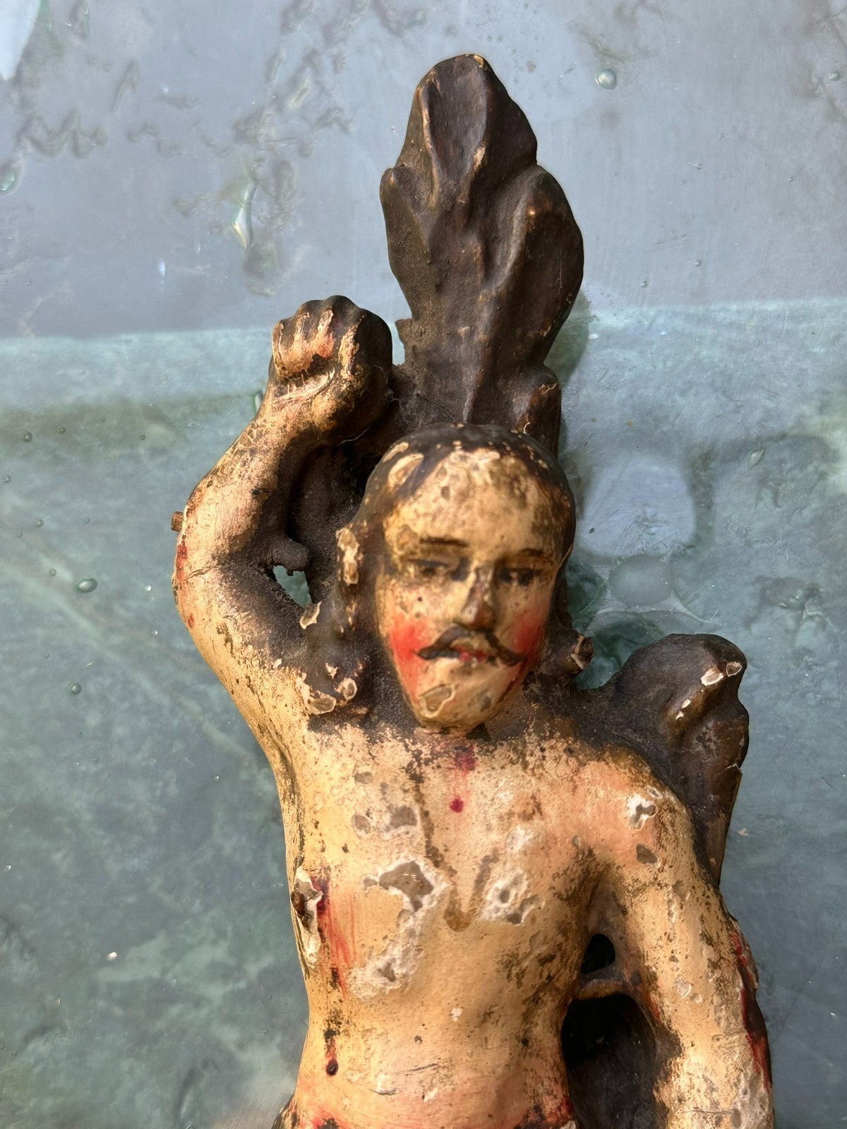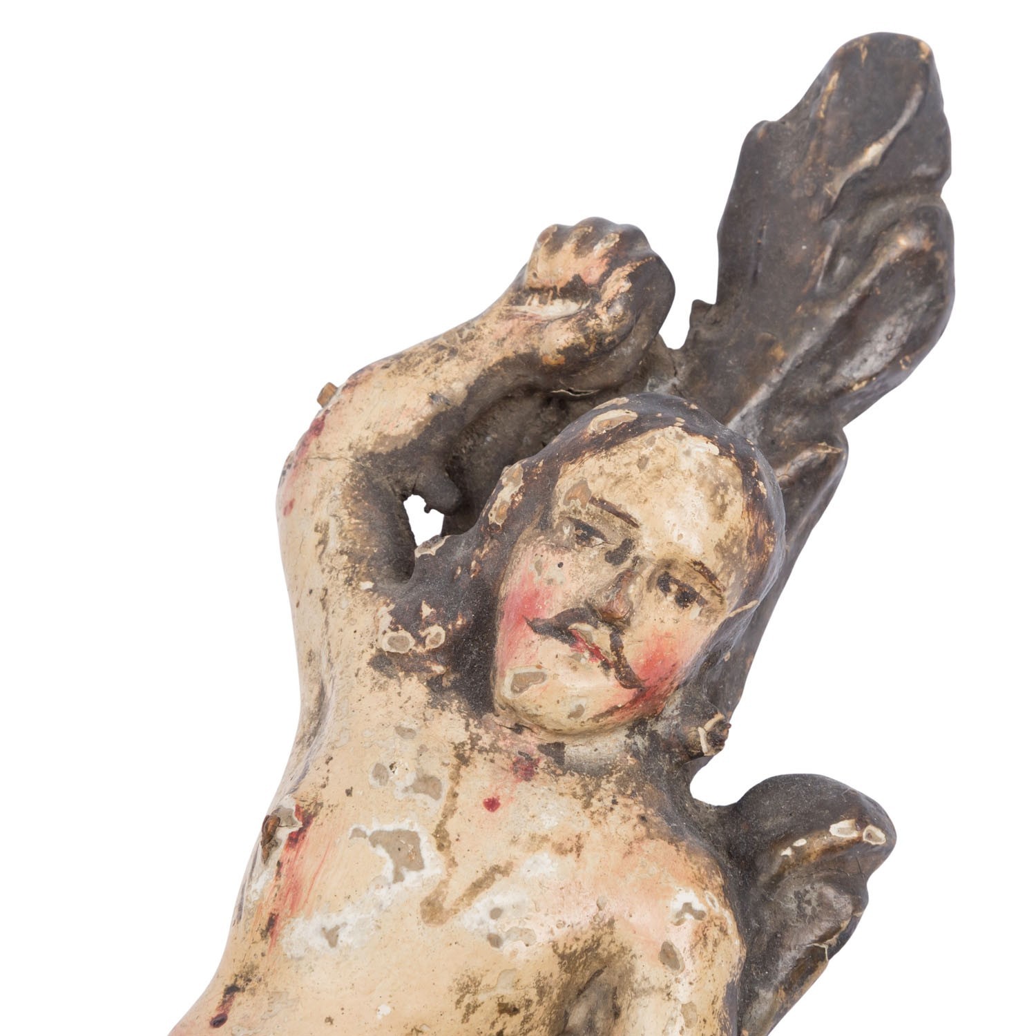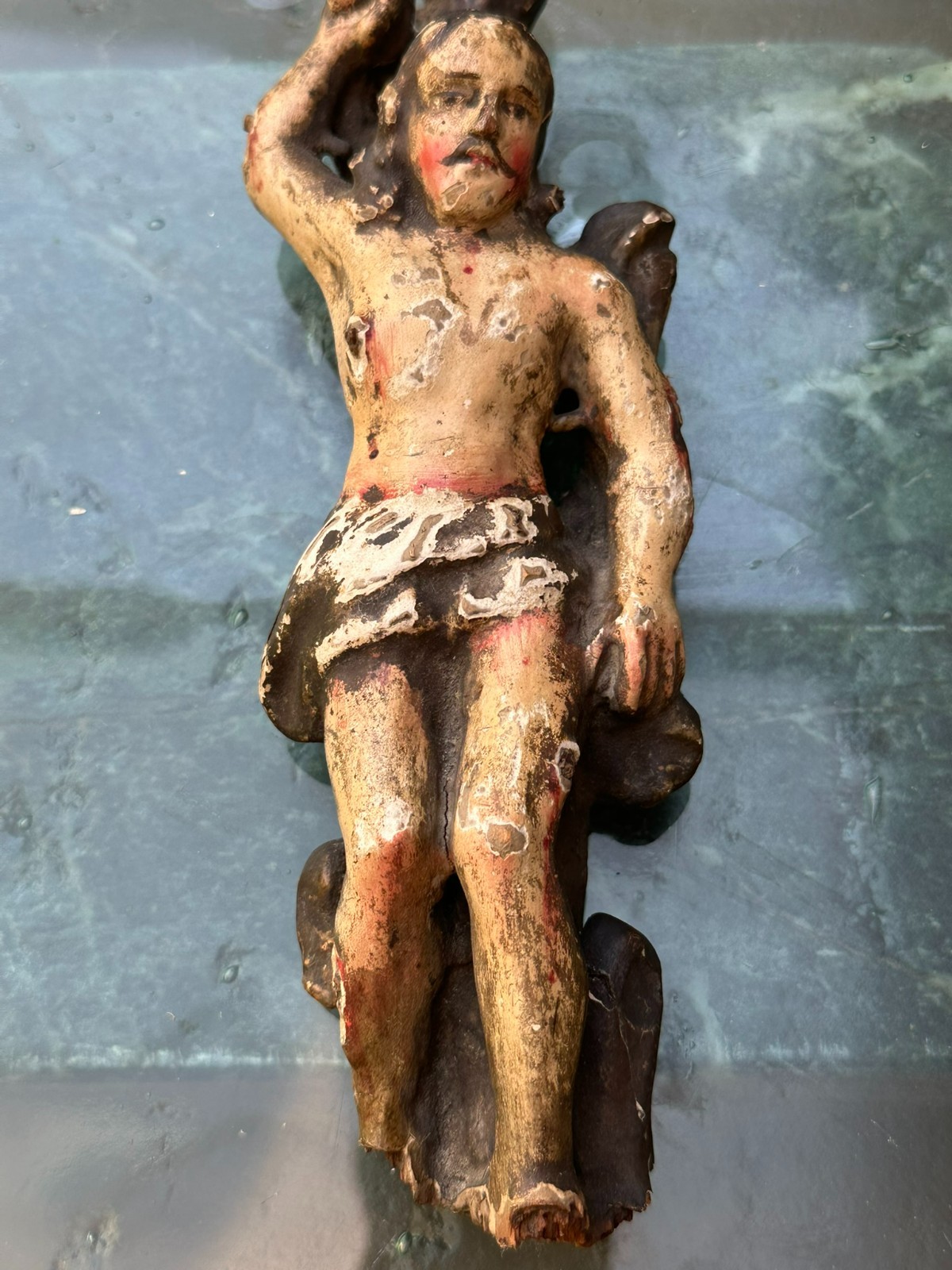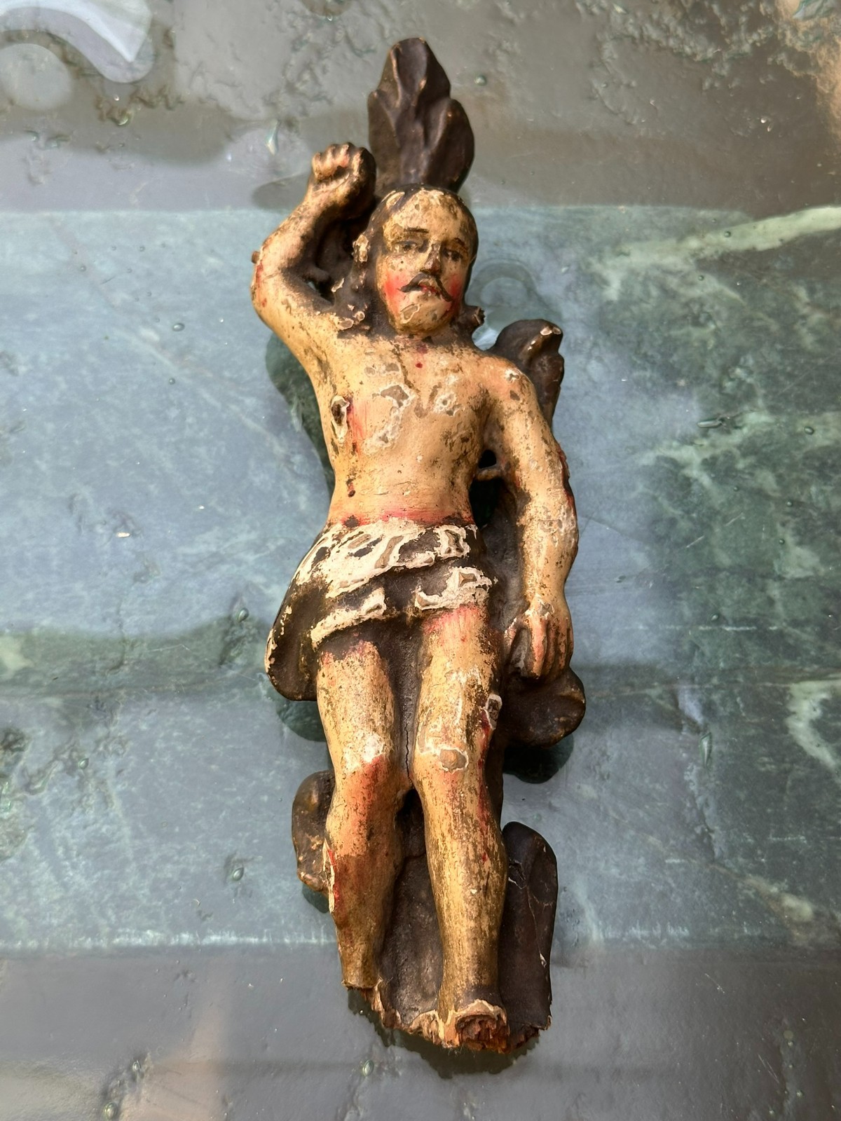 Antike Heiligenfigur aus dem 17/18-ten Jhdt, Darstellung des Heiligen Sebastian. Lindenholz, handgeschnitzt und gefasst. Fassung berieben, überwiegend original. An der gesamten Figur Fehlteile, Bestossungen und Abrieb. Höhe 23cm. Die Figur steht nicht von alleine. Alter inaktiver Wurmfrass.