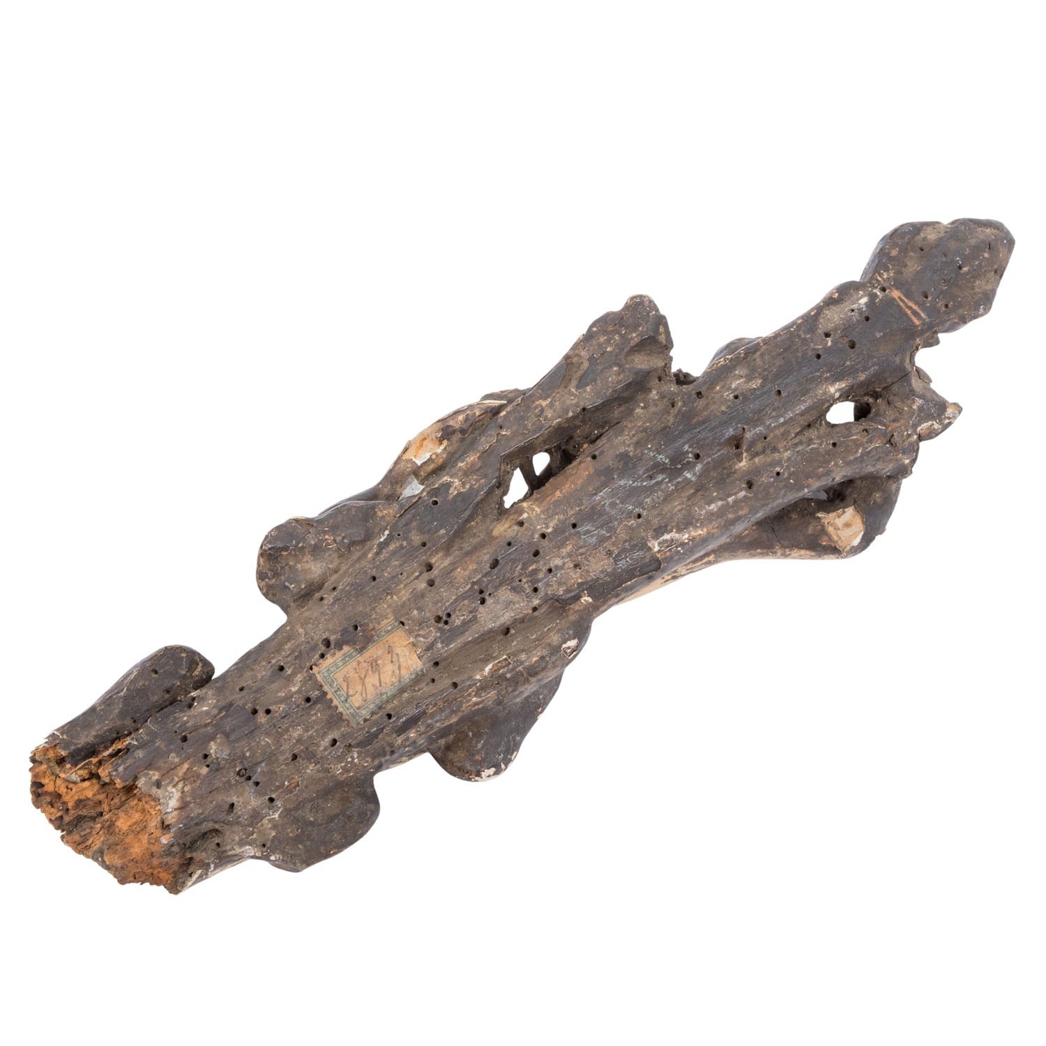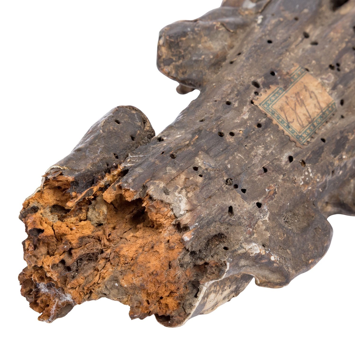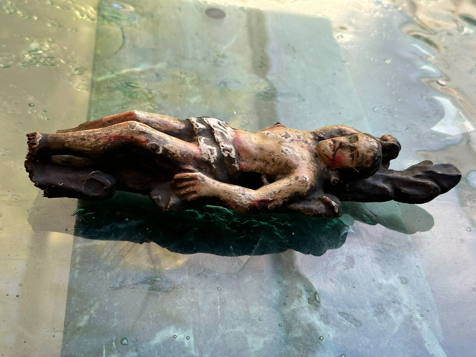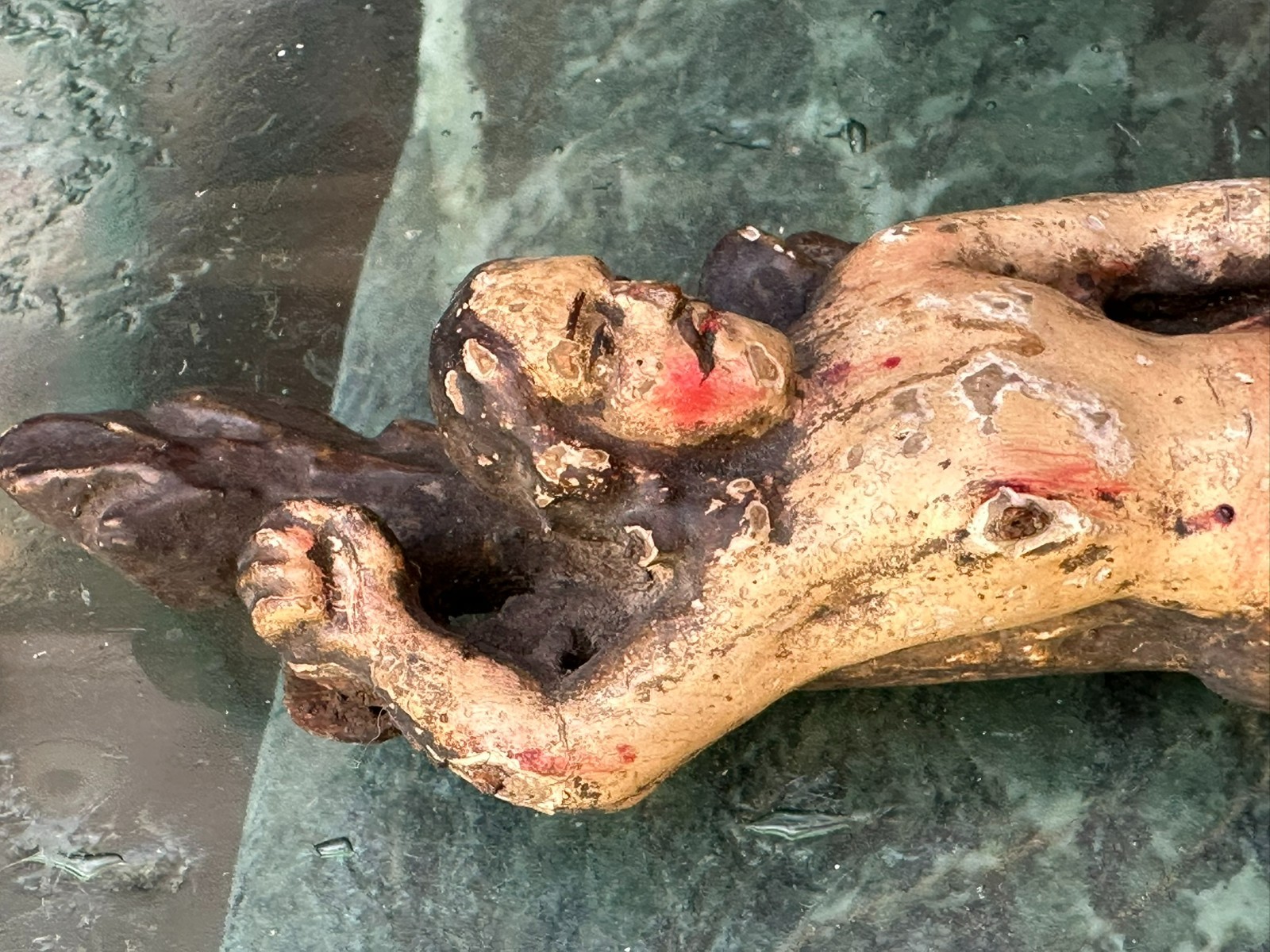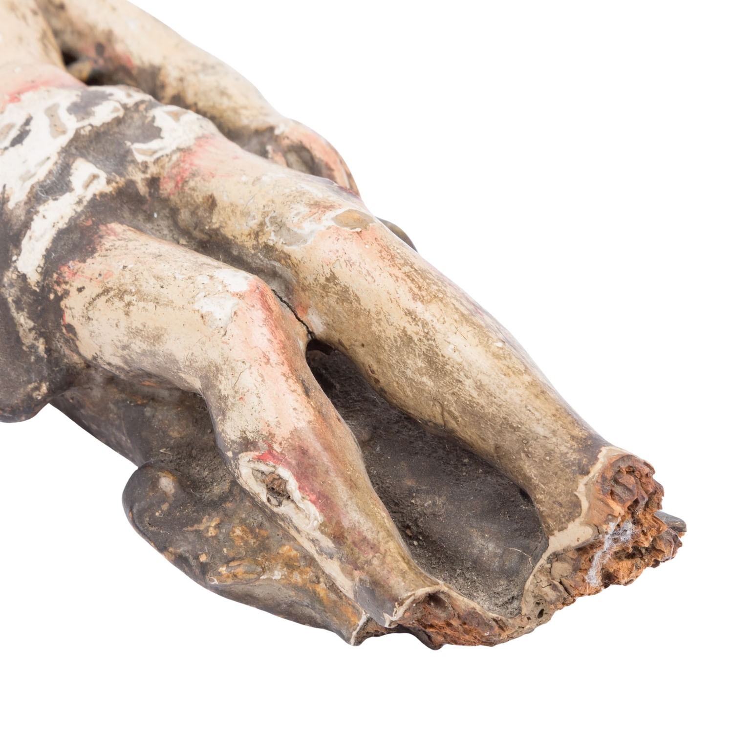 Antike Heiligenfigur aus dem 17/18-ten Jhdt, Darstellung des Heiligen Sebastian. Lindenholz, handgeschnitzt und gefasst. Fassung berieben, überwiegend original. An der gesamten Figur Fehlteile, Bestossungen und Abrieb. Höhe 23cm. Die Figur steht nicht von alleine. Alter inaktiver Wurmfrass.