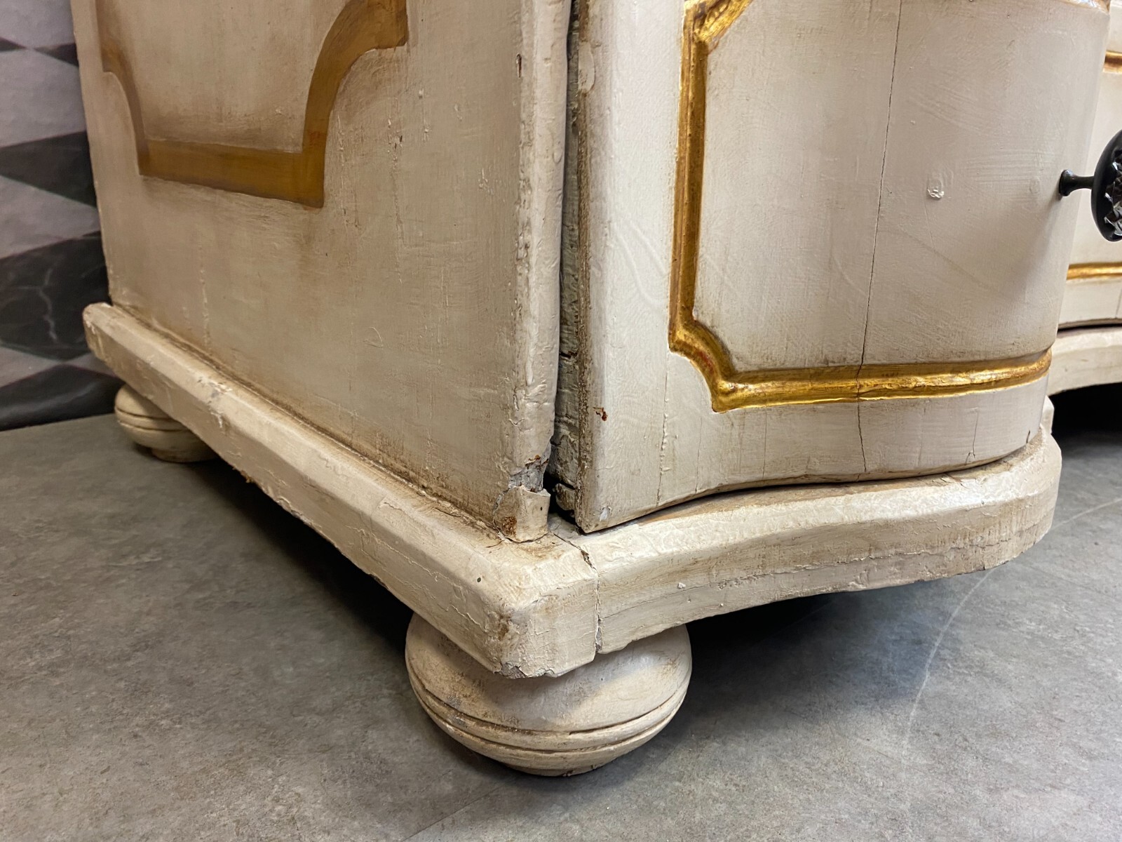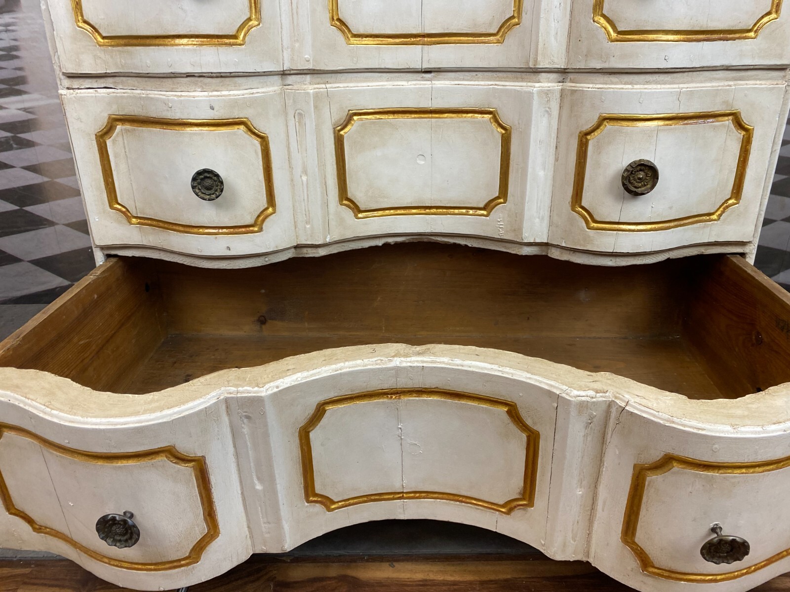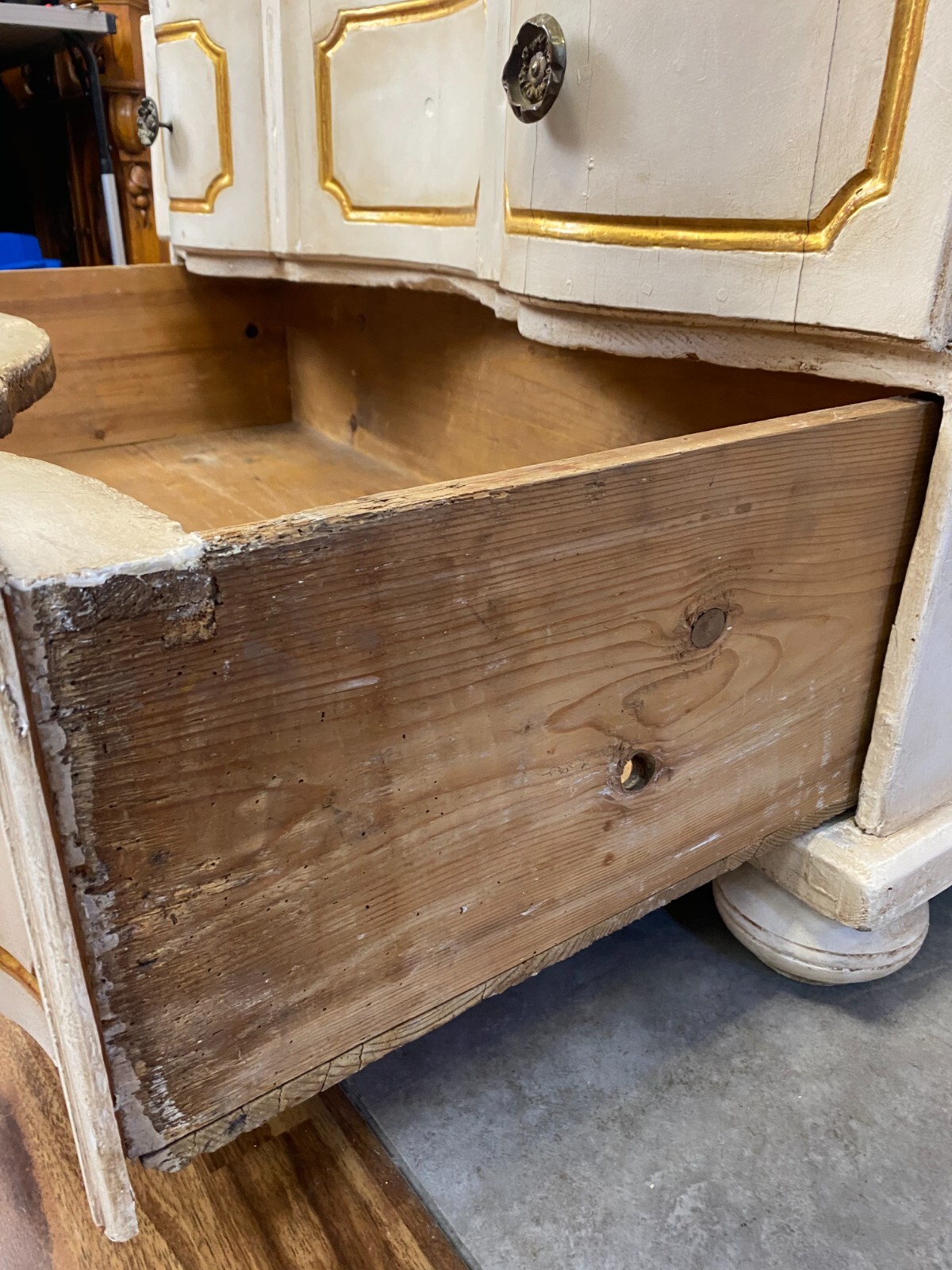 Sehr schöne antike Barockkommode um 1760/1780, aus massivem Holz, die Kommode wurde mal umgebaut, Schlösser ausgebaut. Oberfläche komplett überfasst, zum Teil berieben und leicht bestoßen, an wenigen Stellen Fasssungsabplatzer. Schubladeninnenraum mit altem, inaktivem Wurmfraß und Dehnungsrissen. An den Schubladenfronten ebenfalls Dehnungsrisse. An der Rückwand leichter, inaktiver Wurmfraß und teilweise Farbspritzer. Abmessungen BTH: 115x62x97cm.