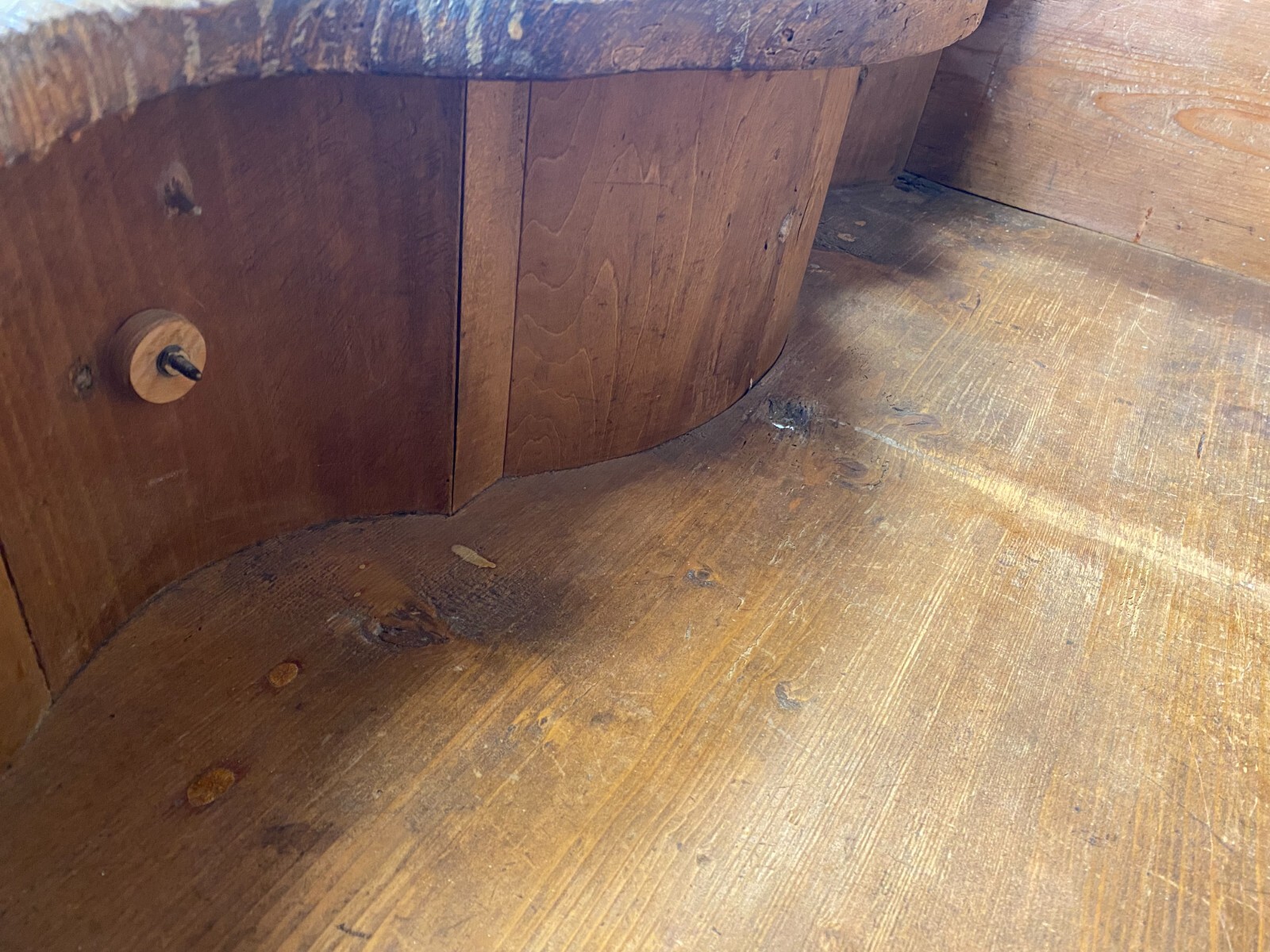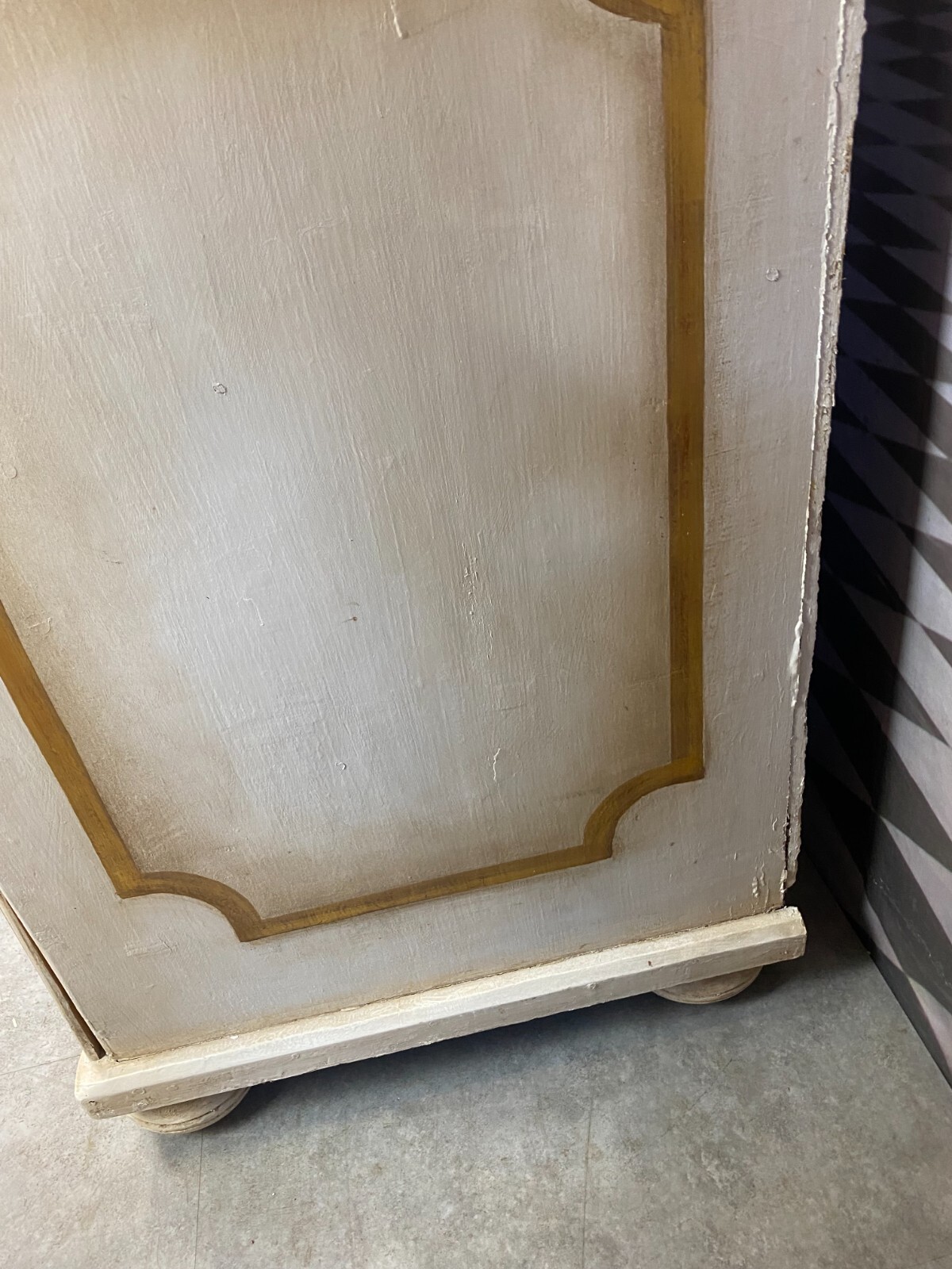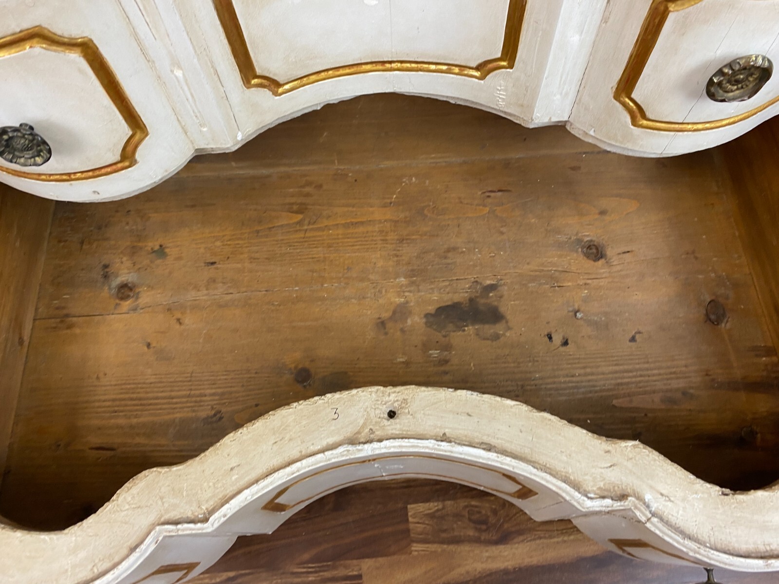 Sehr schöne antike Barockkommode um 1760/1780, aus massivem Holz, die Kommode wurde mal umgebaut, Schlösser ausgebaut. Oberfläche komplett überfasst, zum Teil berieben und leicht bestoßen, an wenigen Stellen Fasssungsabplatzer. Schubladeninnenraum mit altem, inaktivem Wurmfraß und Dehnungsrissen. An den Schubladenfronten ebenfalls Dehnungsrisse. An der Rückwand leichter, inaktiver Wurmfraß und teilweise Farbspritzer. Abmessungen BTH: 115x62x97cm.