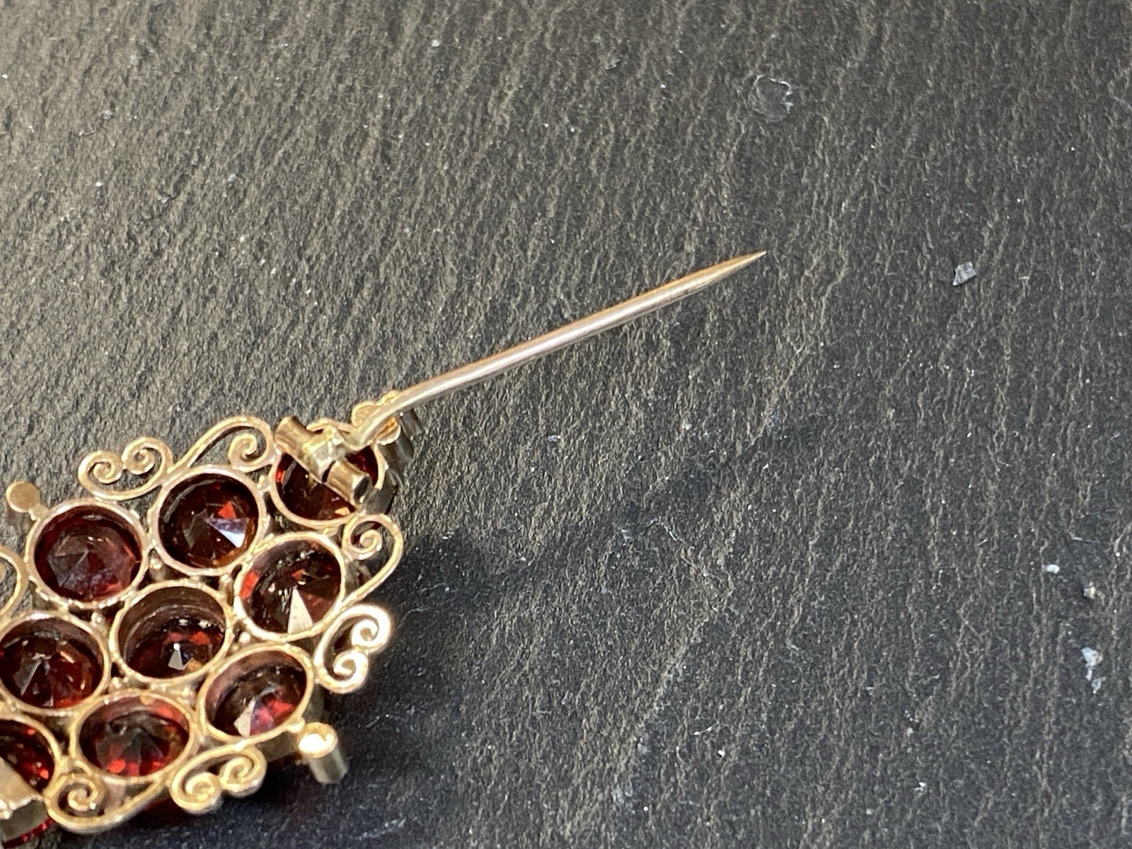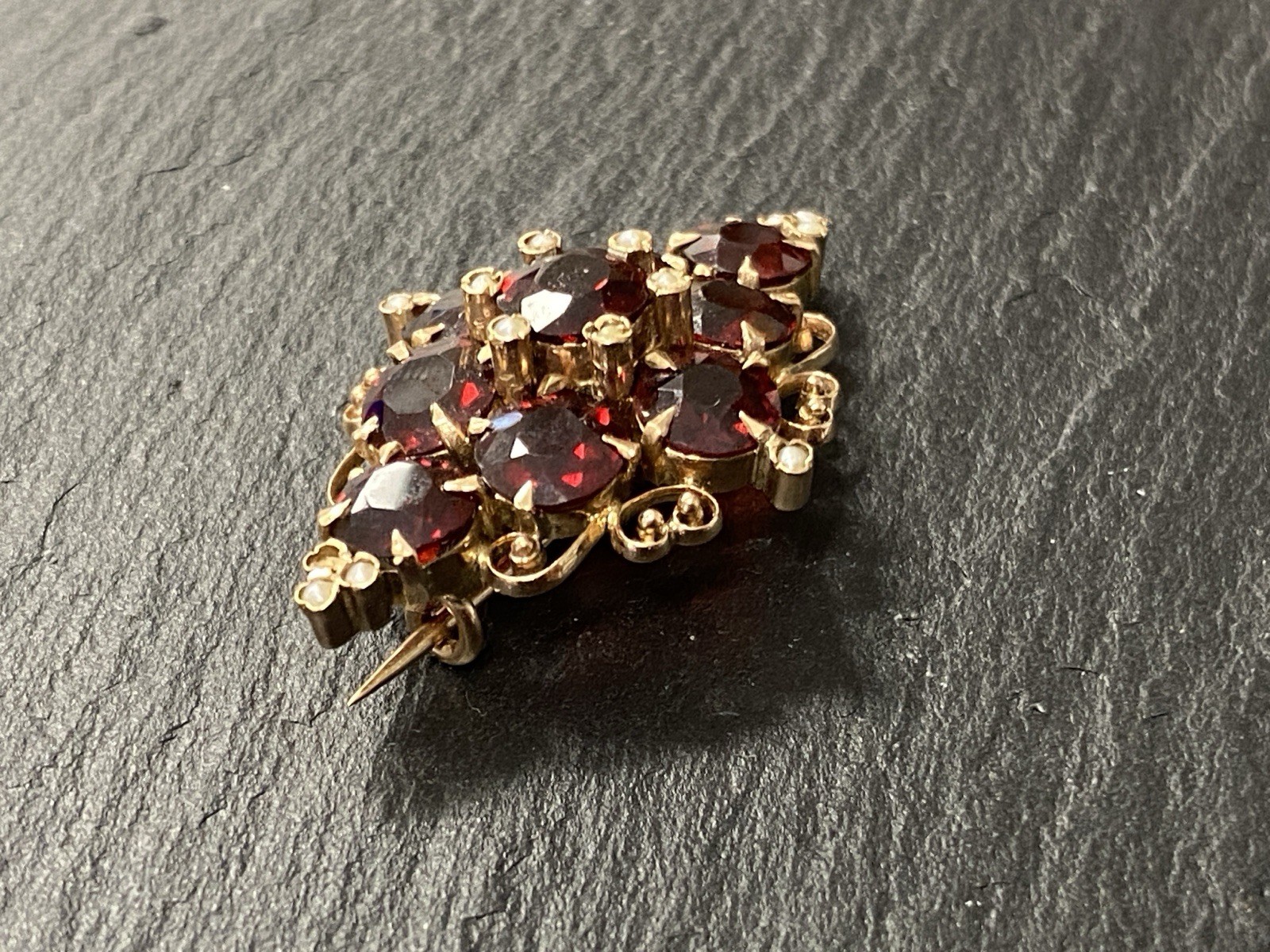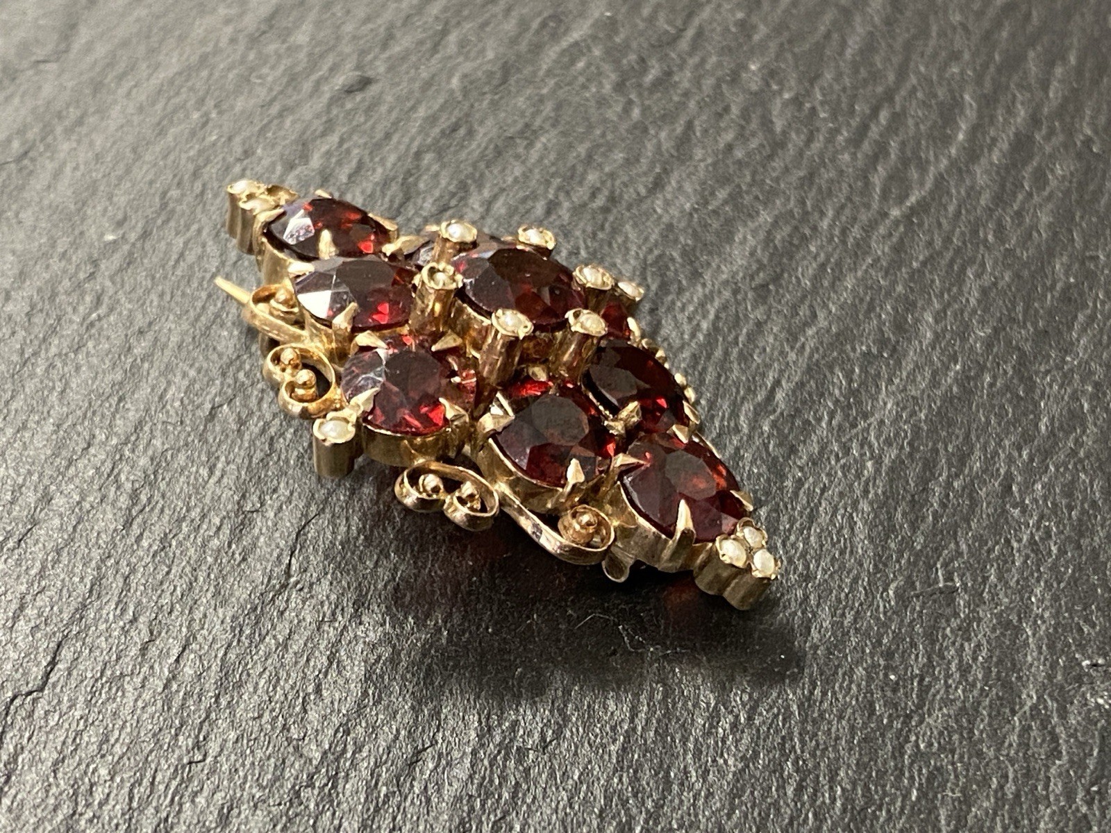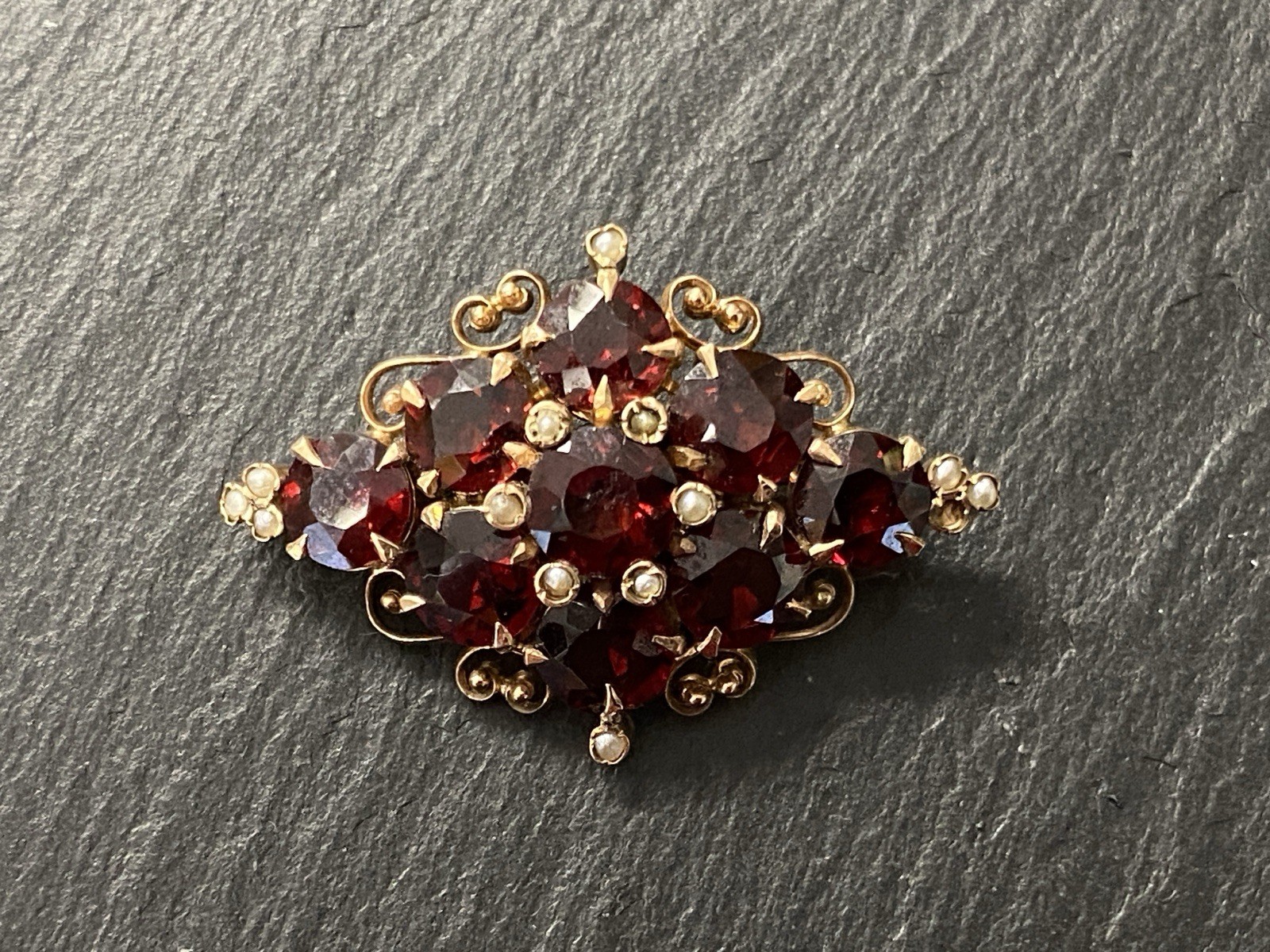 Dekorative Brosche aus 8K Gelbgold, mit Niton DXL getestet, mit Besatz aus 9 Almandinen und minimalistischen Perlen. Der Stein in der Mitte hat einen Durchmesser von ca. 6,5mm, die anderen 8 Almandine haben einen Durchmesser von ca. 6mm. Wohl Böhmen um 1880, eine der Perlen fehlt. Insgesamt sehr schöner erhaltener Zustand. BTH 3,45/1/2,38cm, Gesamtgewicht ca. 5,76g. Die Begutachtung der Stücke wird vorgenommen von einem Fachmitglied der deutschen gemmologischen Gesellschaft E.V.