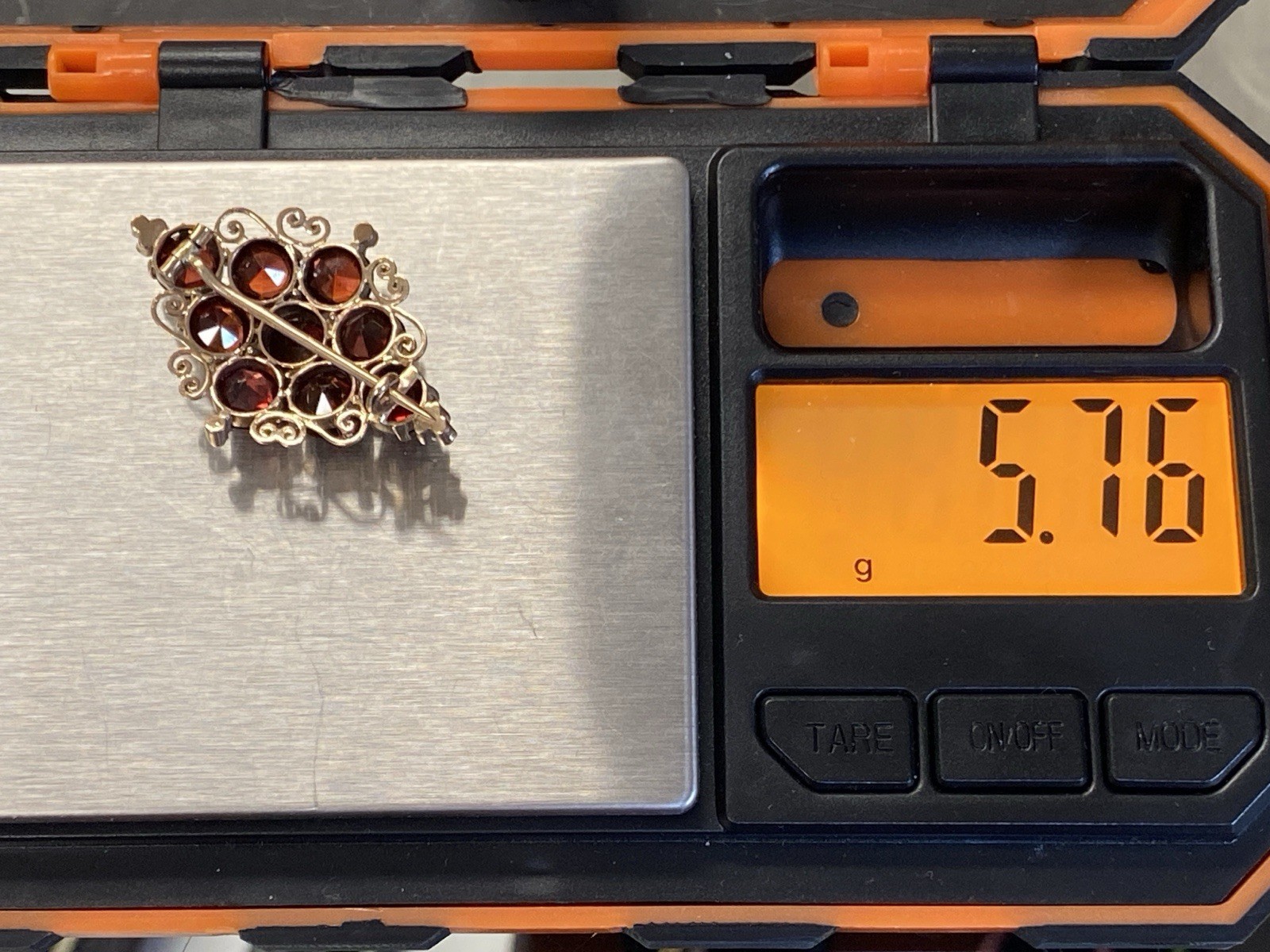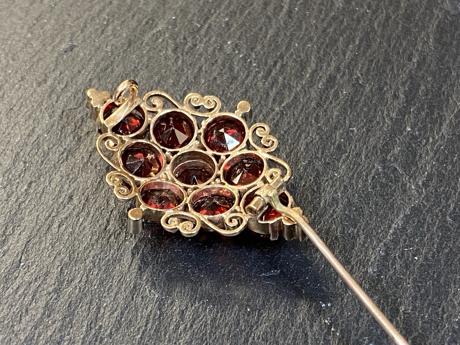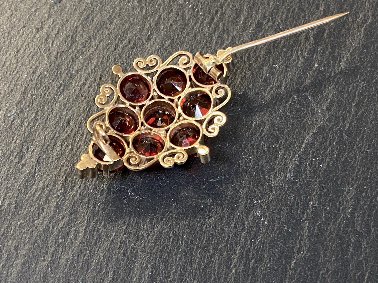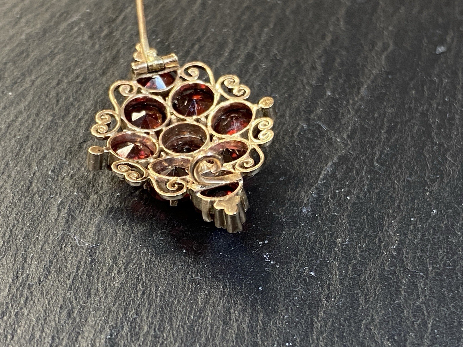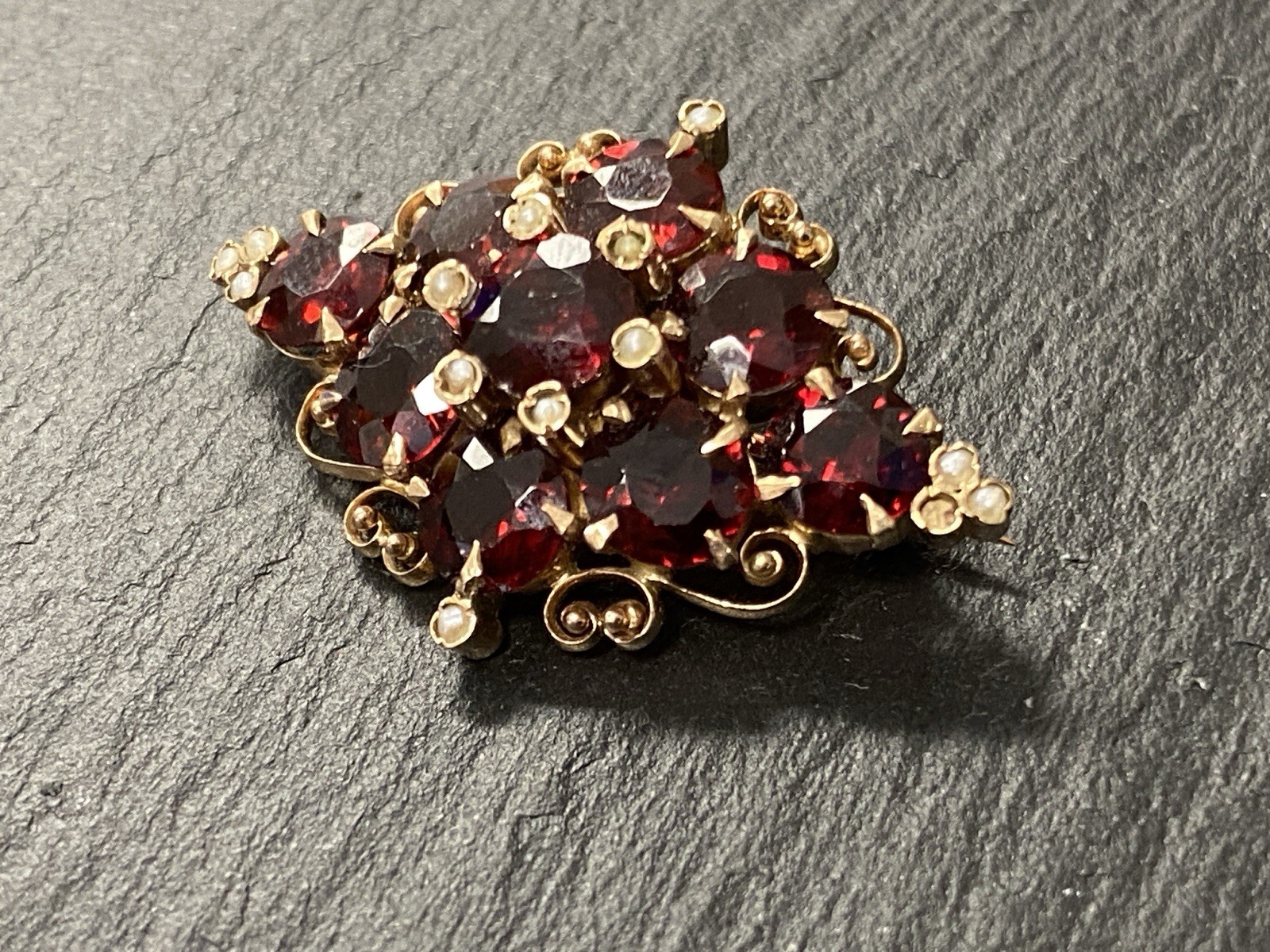 Dekorative Brosche aus 8K Gelbgold, mit Niton DXL getestet, mit Besatz aus 9 Almandinen und minimalistischen Perlen. Der Stein in der Mitte hat einen Durchmesser von ca. 6,5mm, die anderen 8 Almandine haben einen Durchmesser von ca. 6mm. Wohl Böhmen um 1880, eine der Perlen fehlt. Insgesamt sehr schöner erhaltener Zustand. BTH 3,45/1/2,38cm, Gesamtgewicht ca. 5,76g. Die Begutachtung der Stücke wird vorgenommen von einem Fachmitglied der deutschen gemmologischen Gesellschaft E.V.