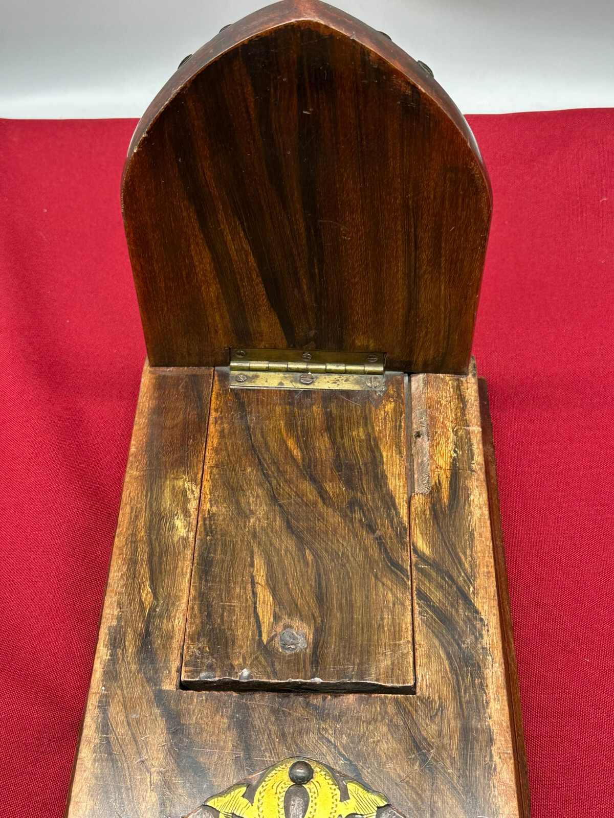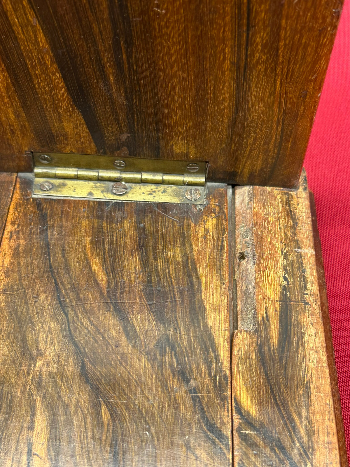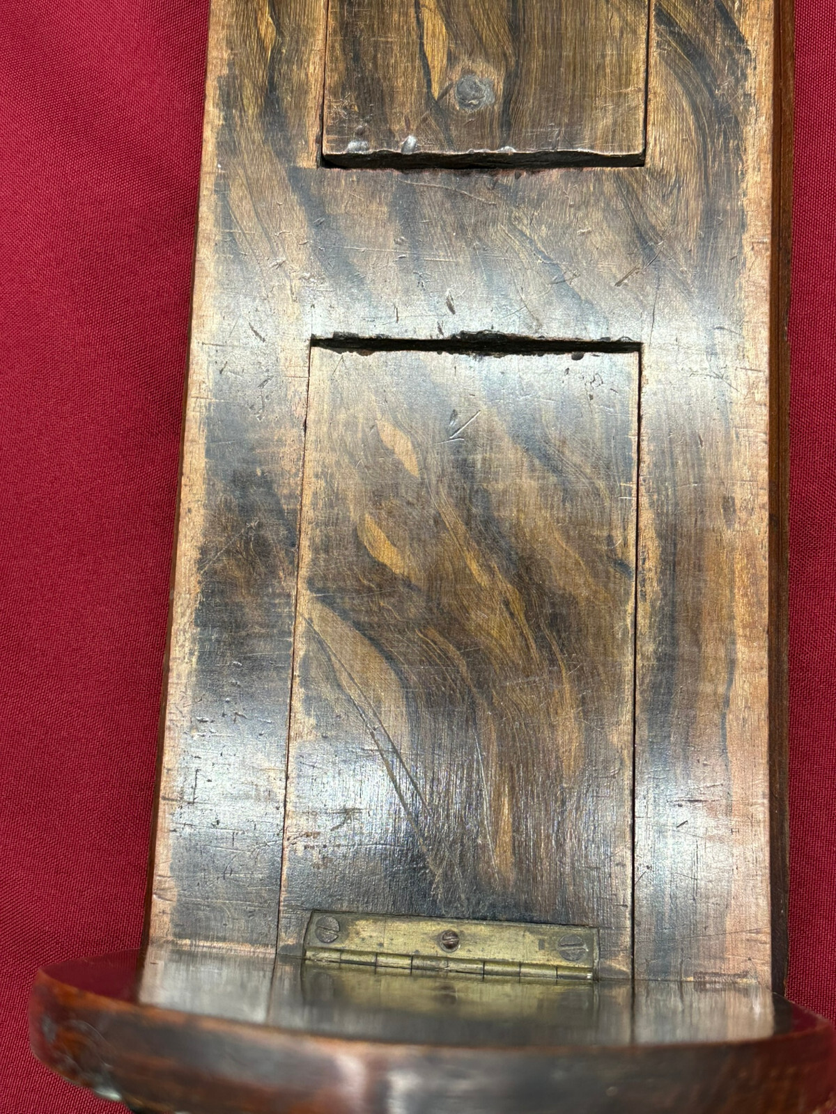 Antike Buchablage mit integrierten Buchstützen. Diese seitlich verstellbar. Eins der beiden Enden an der Schiene unvollständig, stoppt deswegen nicht mehr beim Herausziehen. An der gesamten Oberfläche Abrieb und kleinere Bestossungen. Abmessungen BTH 36/15/18cm.