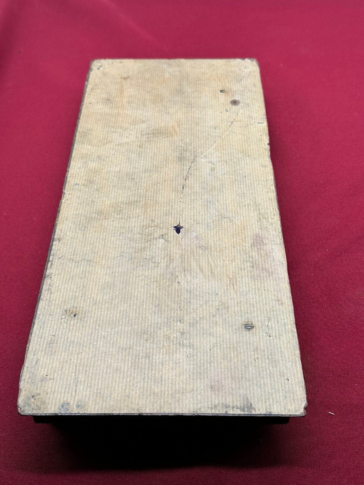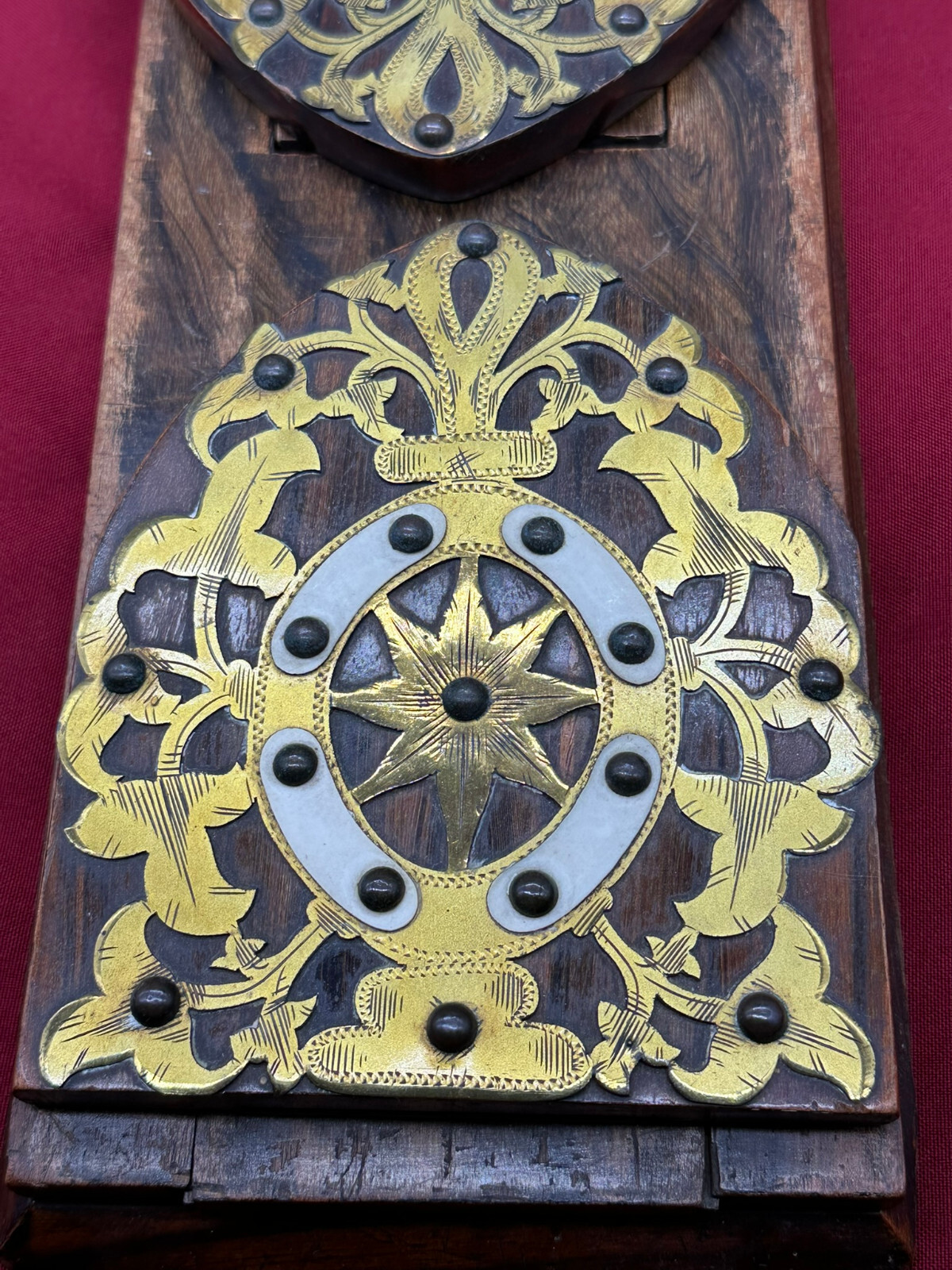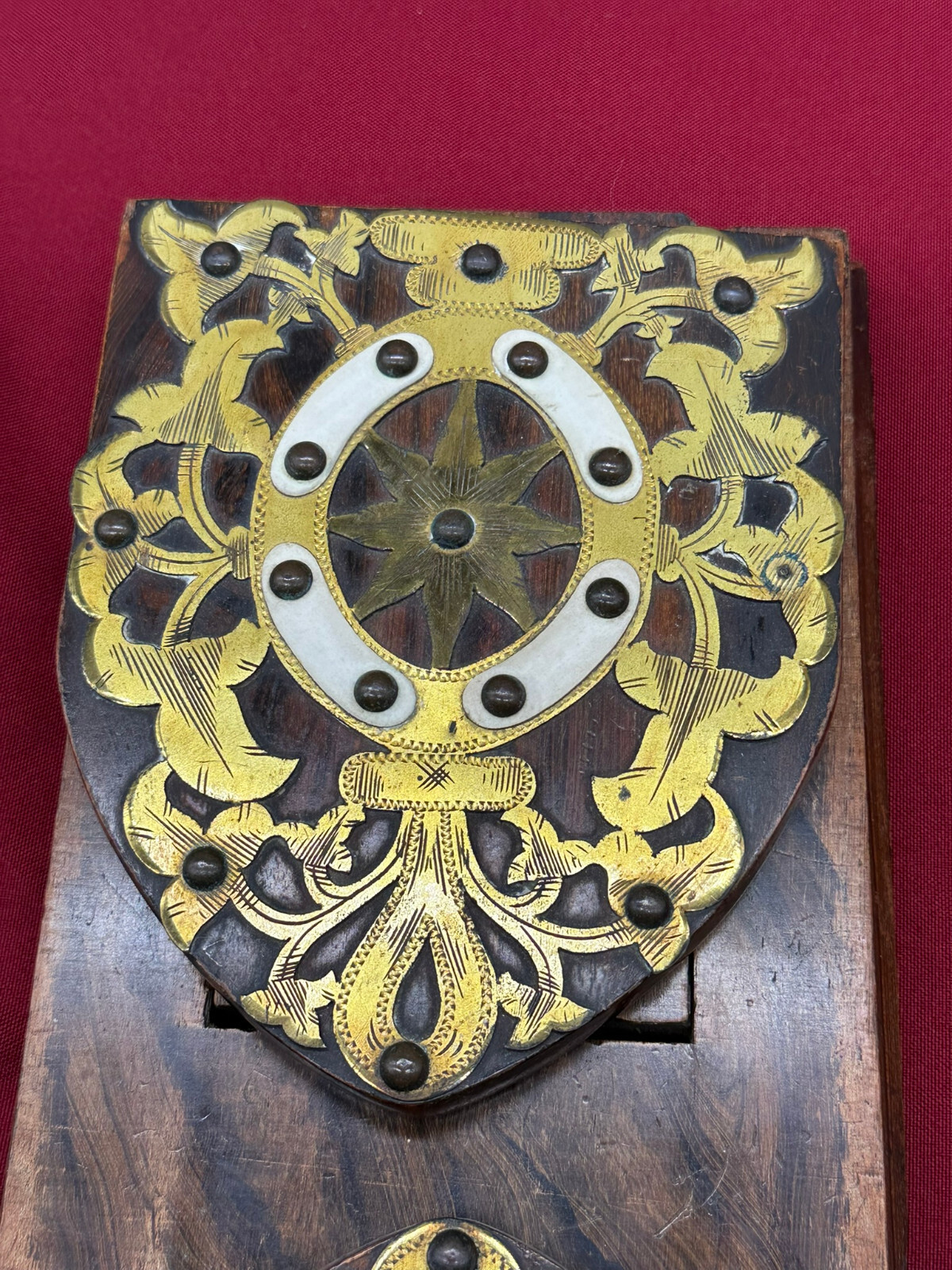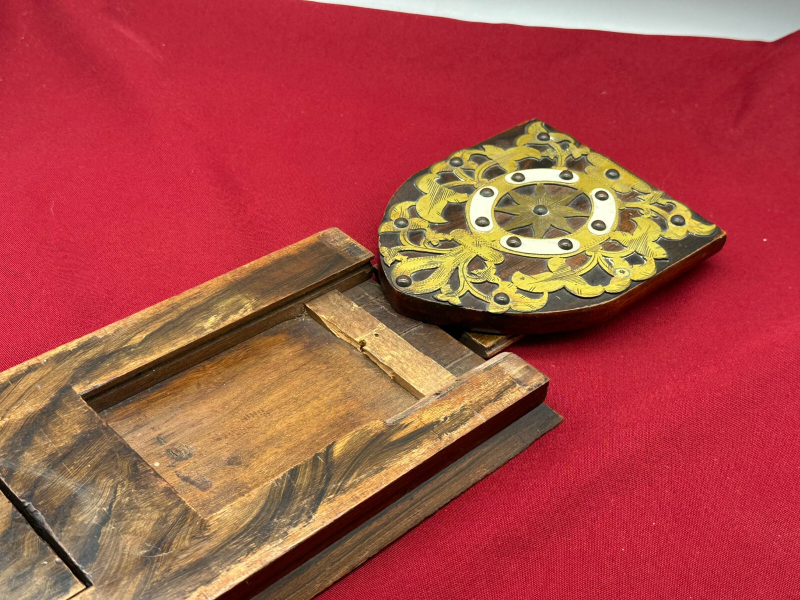 Antike Buchablage mit integrierten Buchstützen. Diese seitlich verstellbar. Eins der beiden Enden an der Schiene unvollständig, stoppt deswegen nicht mehr beim Herausziehen. An der gesamten Oberfläche Abrieb und kleinere Bestossungen. Abmessungen BTH 36/15/18cm.