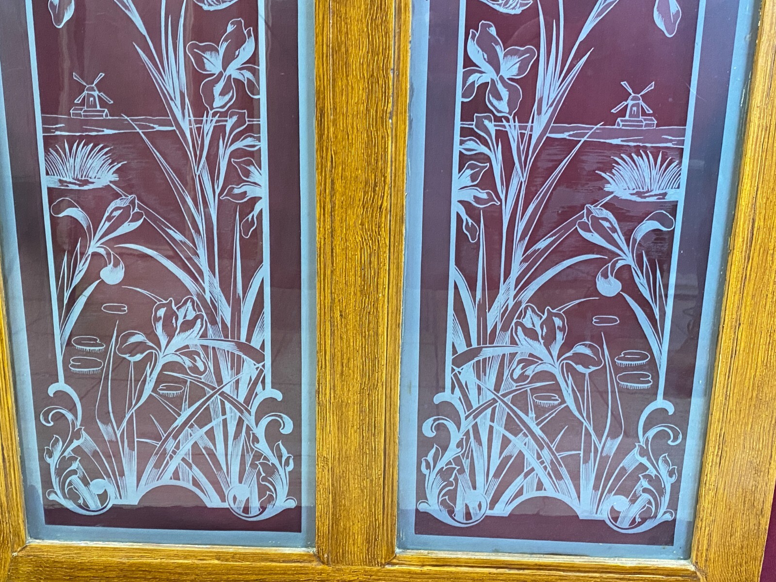 Antike Glasscheibe mit Ätzdekor im Holzrahmen. Die Scheibe wurde zum Schutz im Rahmen belassen, das Holz ist hier teils bemalt und berieben. Im Randbereich der Scheibe Farb- und Verkittungsreste, an der Oberfläche Farbspritzer möglich. Abmessungen Scheiben einzeln: 27x87cm, mit Rahmen: 74x100cm, Die Scheibe ist Original aus der Zeit 1880-1920, wie im Titel angegeben. Beachten Sie bitte die Bilder zum genauen Artikelzustand. Der Holzrahmen ist meist ein Ausschnitt des alten Fensters, dieser kann nicht mehr als Baubestandteil genutzt werden und dienst nur zur Transportsicherung des Glases.