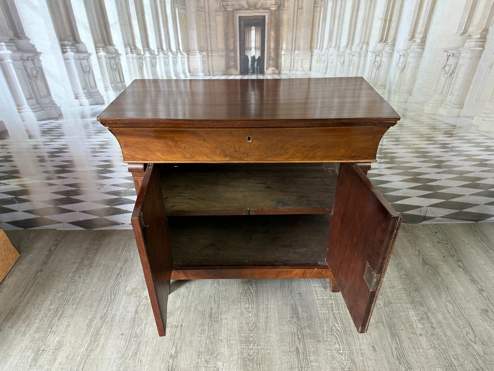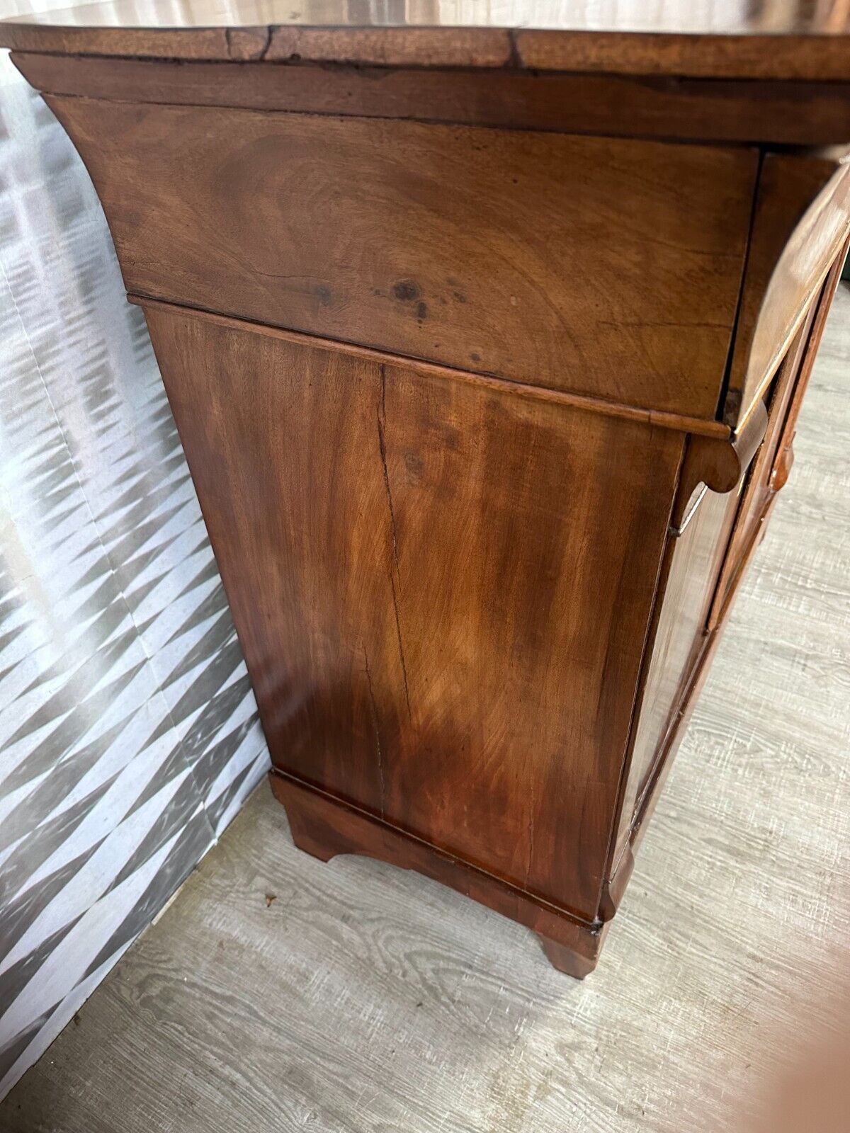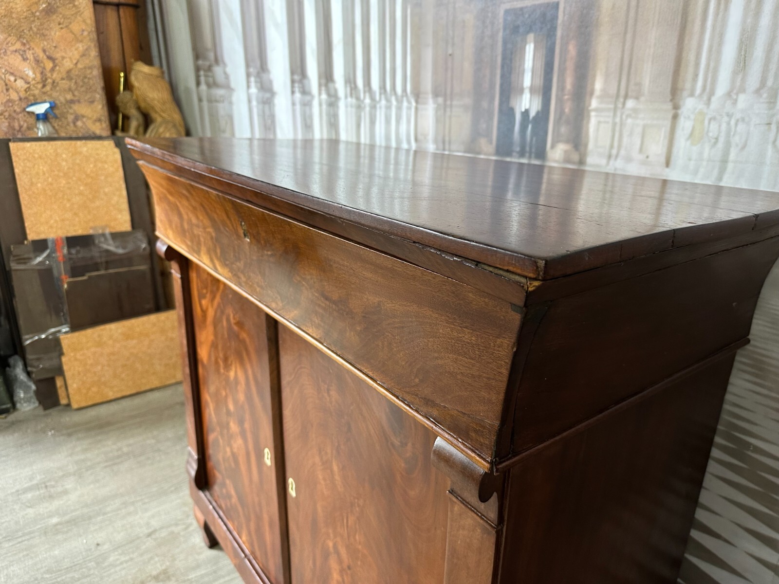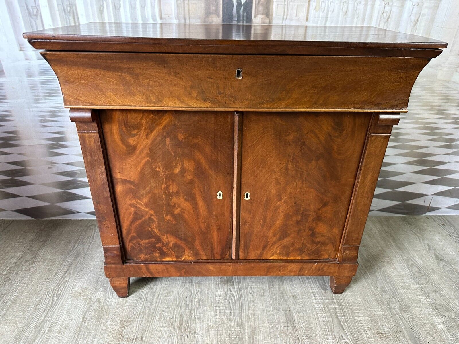 Antike Empire / Biedermeierkommode um 1820, aus Mahagoni. Obere Platte wurde mal komplett ersetzt, Seitenteile mit Dehnungsrissen, diese zum Teil gefüllt. Die unteren Türscharniere korrodiert. Kein Schlüssel vorhanden, Umrandung des oberen Schlüssellochs fehlend. Fußraum und Füße zum Teil berieben und Bestoßen, Innenräume fleckig. Die Kommode wurde mal überarbeitet, kleinere Holzstellen ersetzt, Türen ergänzt. An der gesamten Oberfläche leichter Abrieb und Druckstellen. Stabiler Zustand, Abmessungen BTH: 97x45x91cm.
