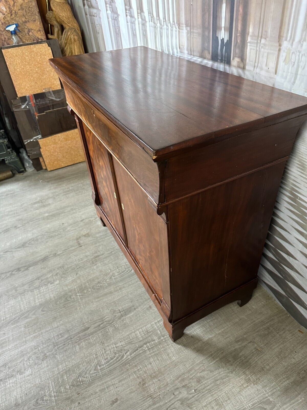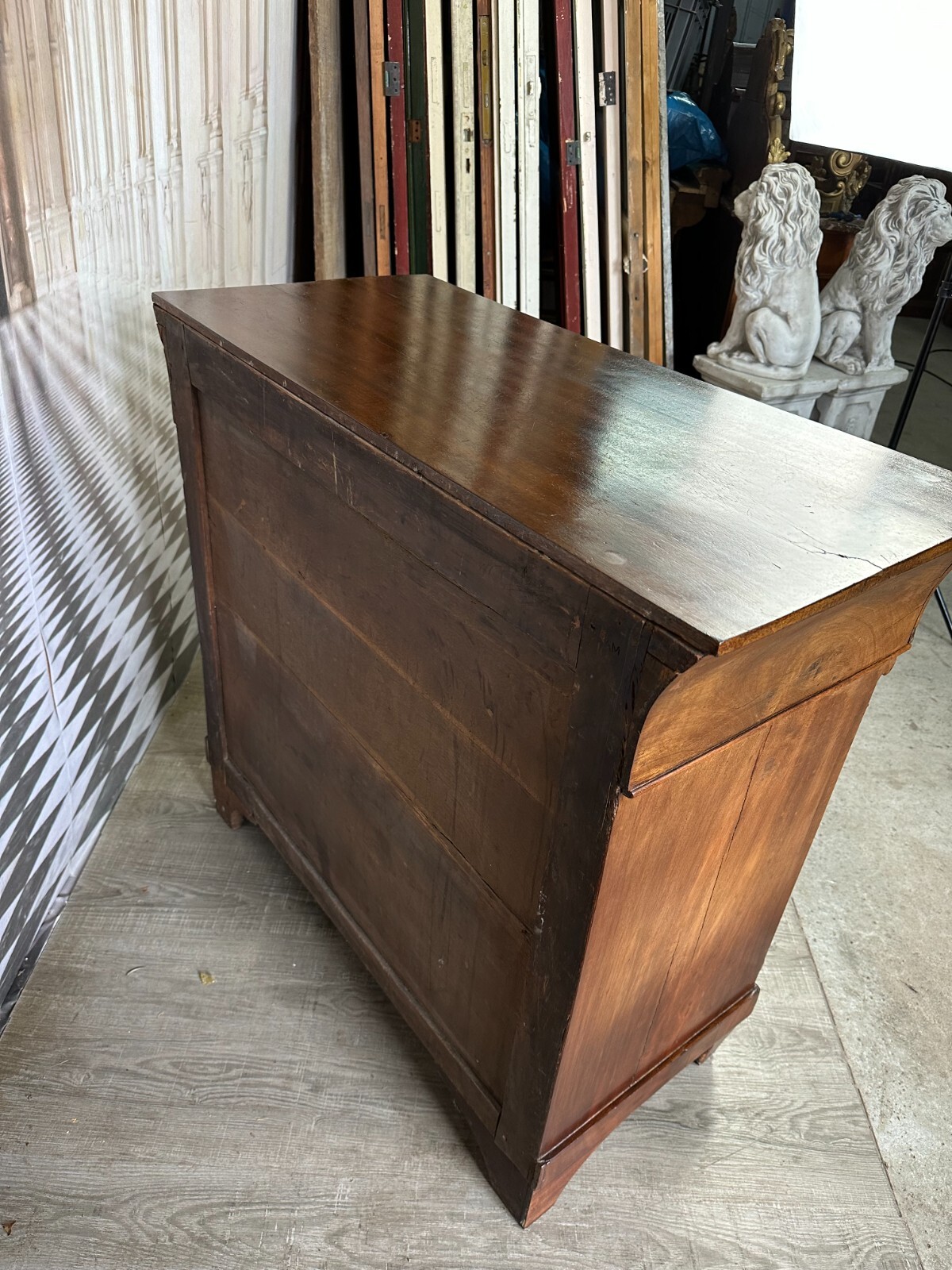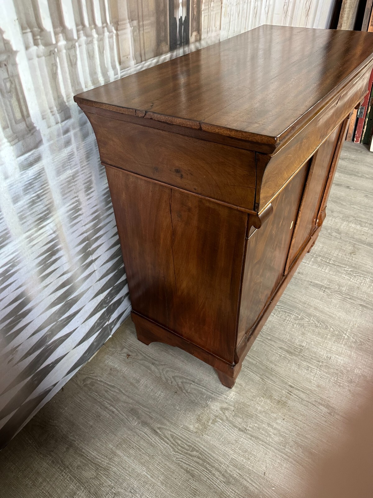 Antike Empire / Biedermeierkommode um 1820, aus Mahagoni. Obere Platte wurde mal komplett ersetzt, Seitenteile mit Dehnungsrissen, diese zum Teil gefüllt. Die unteren Türscharniere korrodiert. Kein Schlüssel vorhanden, Umrandung des oberen Schlüssellochs fehlend. Fußraum und Füße zum Teil berieben und Bestoßen, Innenräume fleckig. Die Kommode wurde mal überarbeitet, kleinere Holzstellen ersetzt, Türen ergänzt. An der gesamten Oberfläche leichter Abrieb und Druckstellen. Stabiler Zustand, Abmessungen BTH: 97x45x91cm.