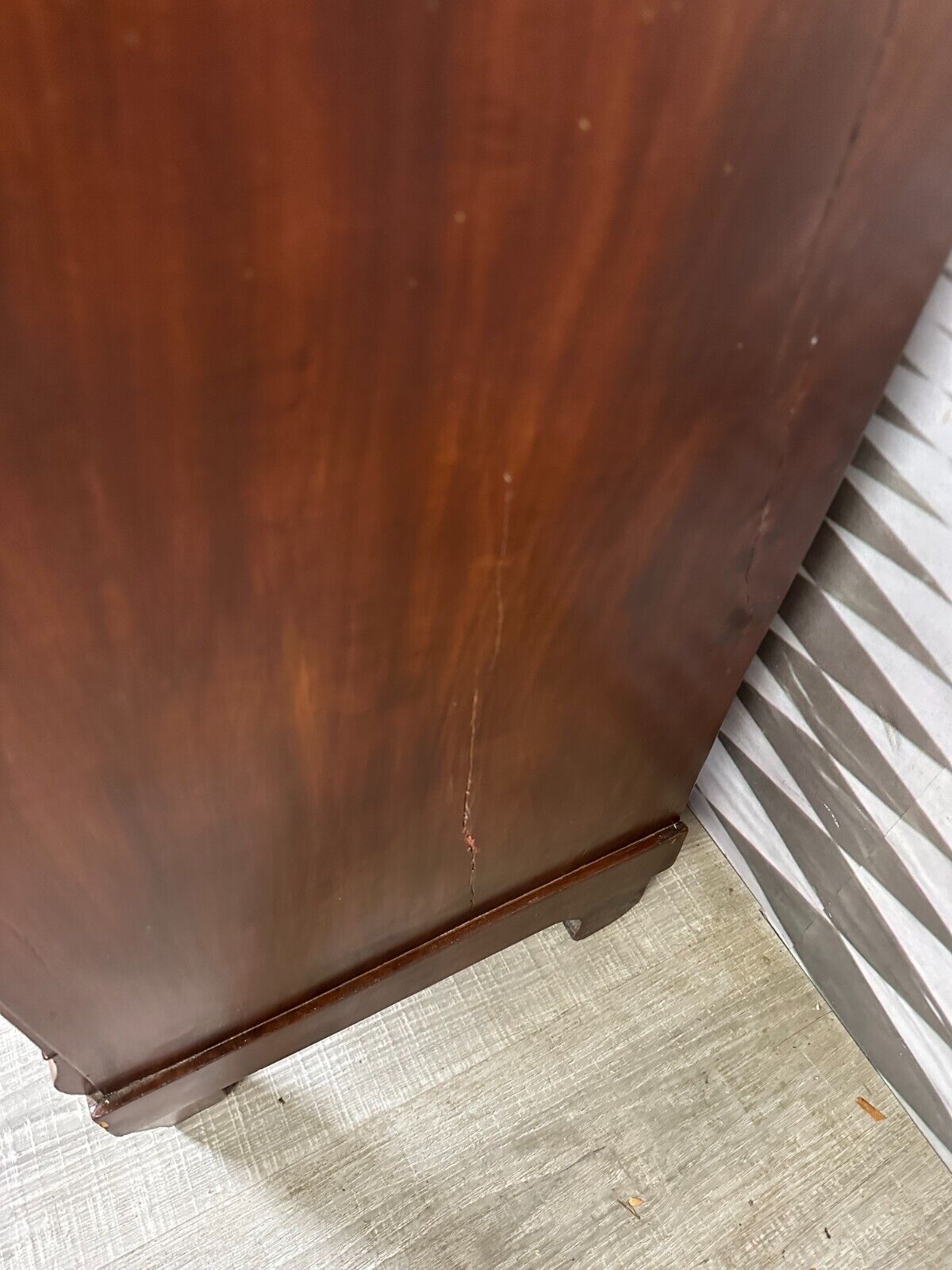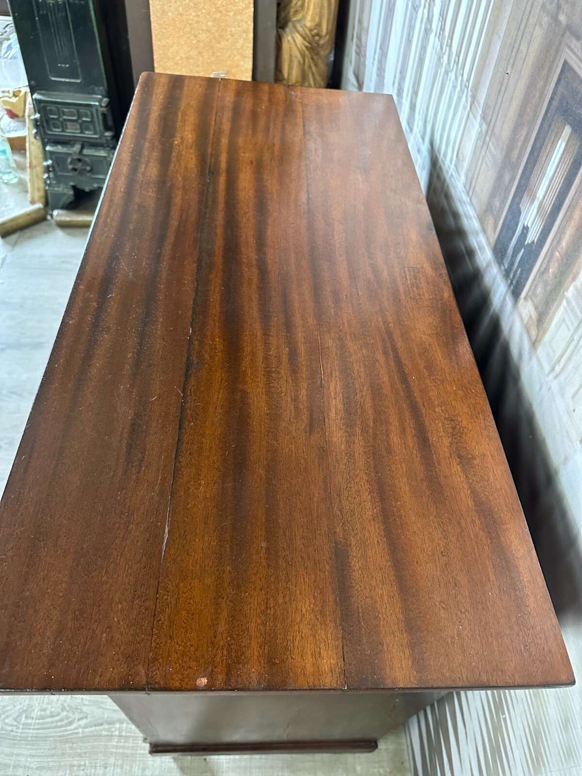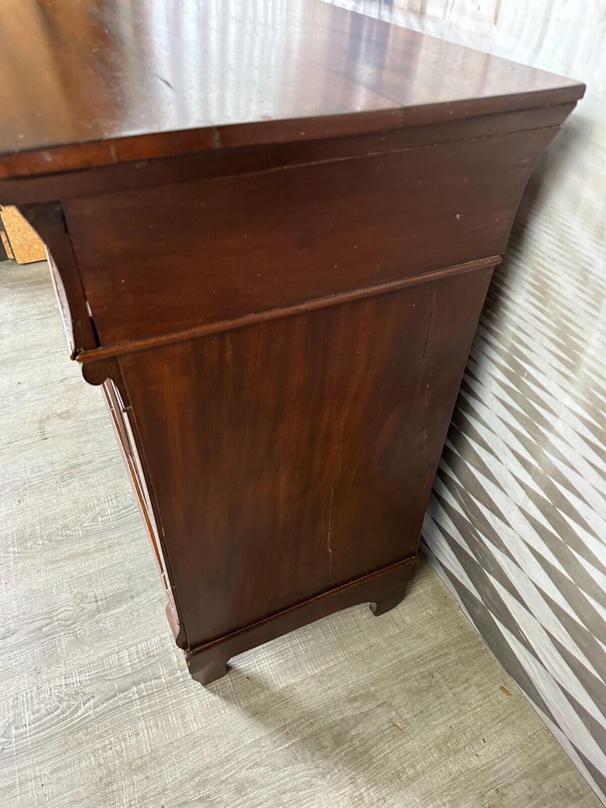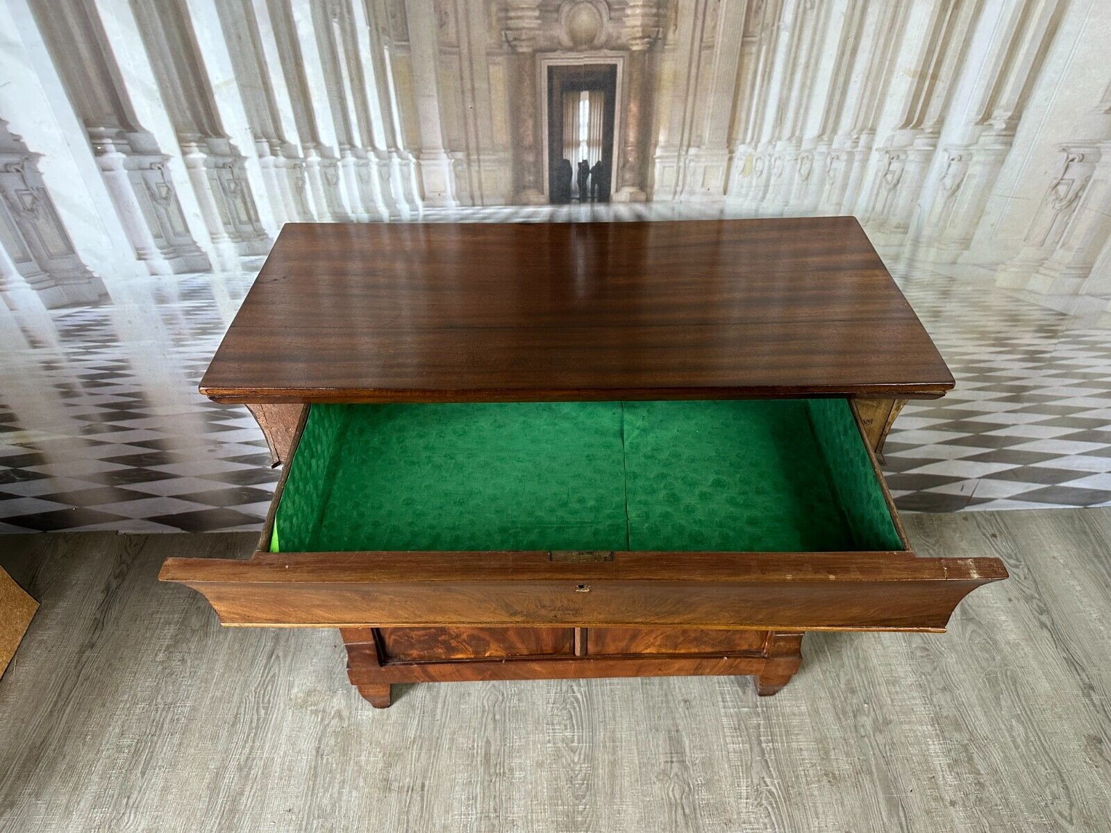Antike Empire / Biedermeierkommode um 1820, aus Mahagoni. Obere Platte wurde mal komplett ersetzt, Seitenteile mit Dehnungsrissen, diese zum Teil gefüllt. Die unteren Türscharniere korrodiert. Kein Schlüssel vorhanden, Umrandung des oberen Schlüssellochs fehlend. Fußraum und Füße zum Teil berieben und Bestoßen, Innenräume fleckig. Die Kommode wurde mal überarbeitet, kleinere Holzstellen ersetzt, Türen ergänzt. An der gesamten Oberfläche leichter Abrieb und Druckstellen. Stabiler Zustand, Abmessungen BTH: 97x45x91cm.