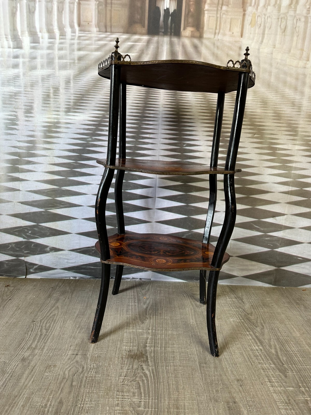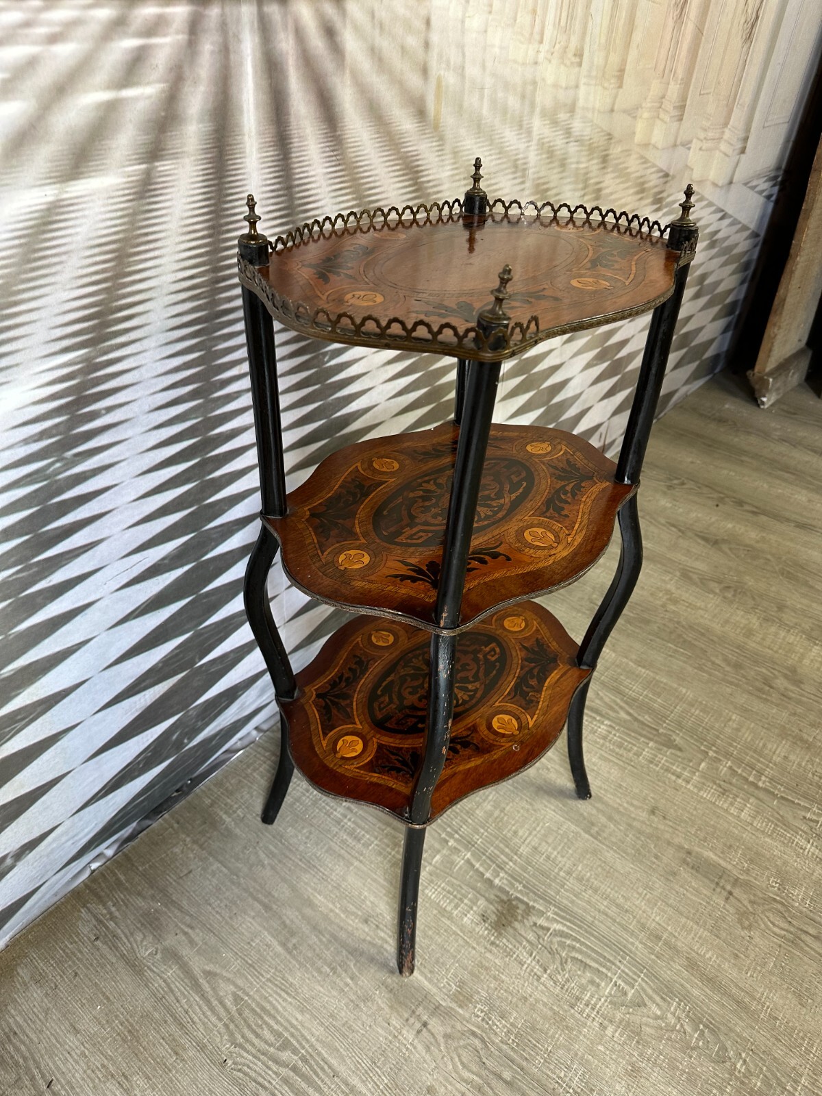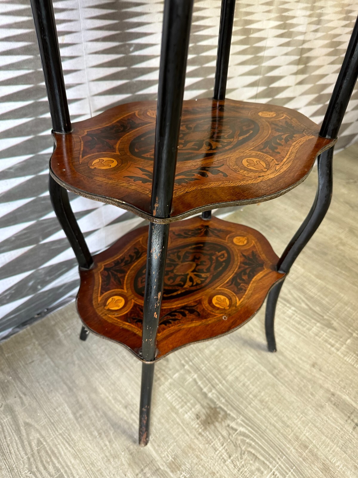 Antike Etagere um 1880, Holz mit Ebonisierung und Intarsien. Oberfläche zum Teil berieben. Die Beine sind durchgängig, die Platten aufgesteckt und insich verzogen. Die Messingappliken stehen zum Teil ab. Der Tisch ist aufgrund des Aufbaus wacklig (nur gesteckt, nicht gezapft). Abmessungen BTH 41/31/78cm. Die oberen Metallzapfen leicht verbogen. Die Ablagen leicht berieben und an der Unteren ein kleiner Fleck.
