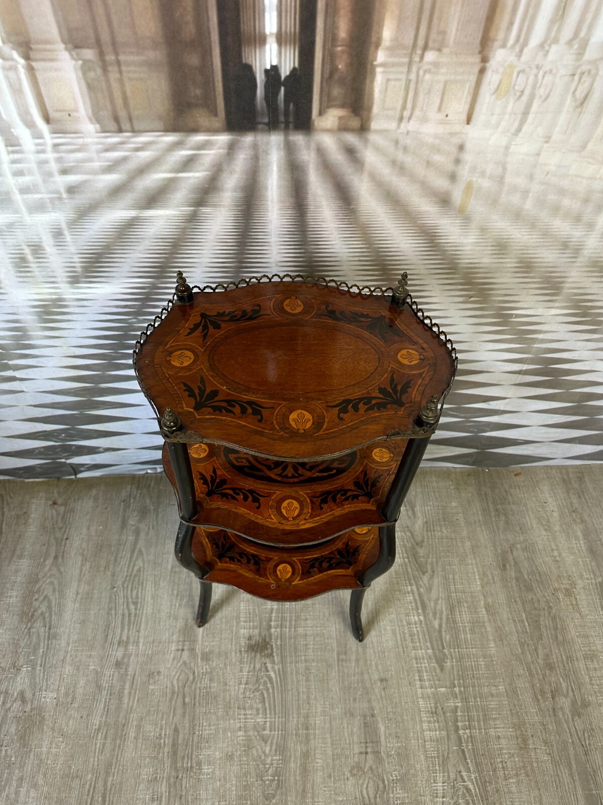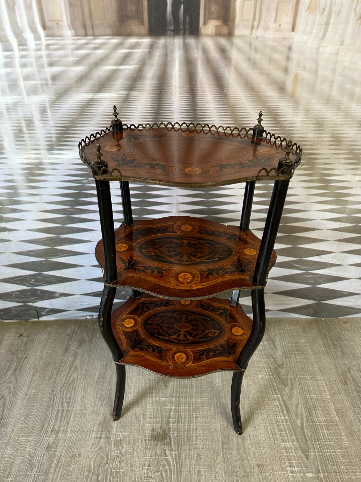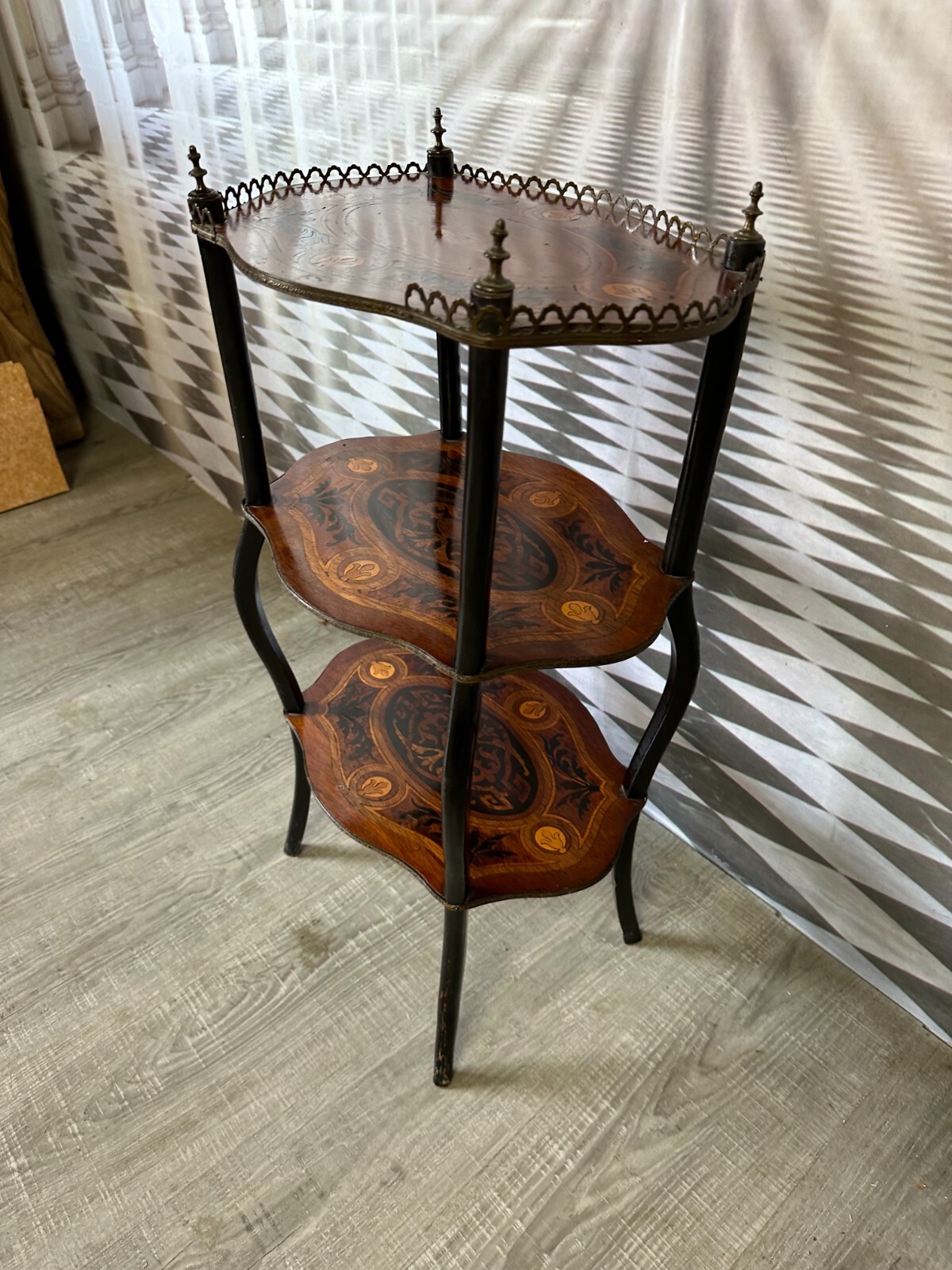 Antike Etagere um 1880, Holz mit Ebonisierung und Intarsien. Oberfläche zum Teil berieben. Die Beine sind durchgängig, die Platten aufgesteckt und insich verzogen. Die Messingappliken stehen zum Teil ab. Der Tisch ist aufgrund des Aufbaus wacklig (nur gesteckt, nicht gezapft). Abmessungen BTH 41/31/78cm. Die oberen Metallzapfen leicht verbogen. Die Ablagen leicht berieben und an der Unteren ein kleiner Fleck.